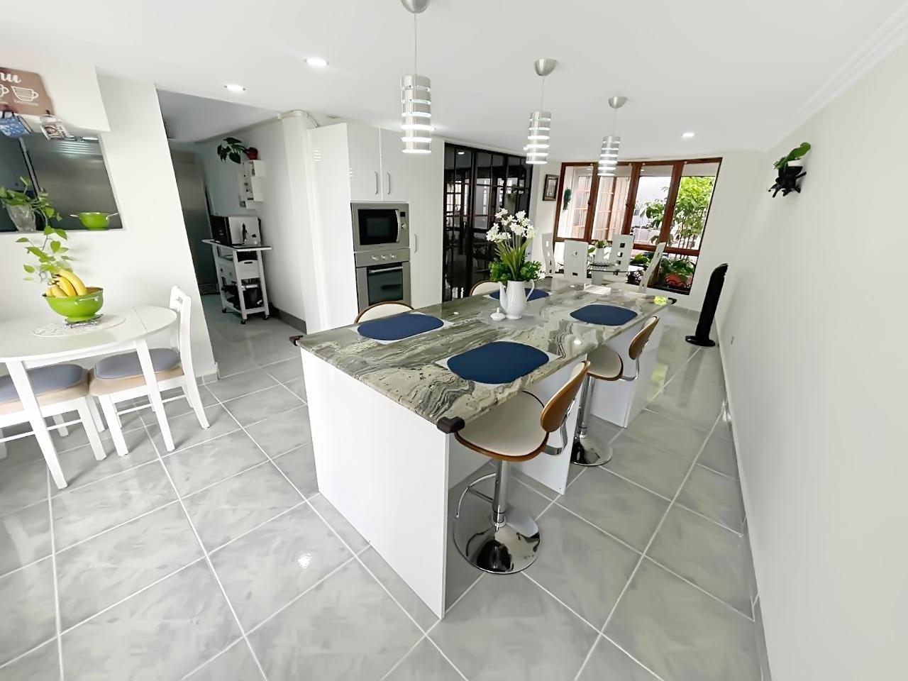 Beautiful and impeccable corner house with parking, portal, terrace, laundry room, storage room and rear patio: -The parking lot has capacity for three (3) cars and maintains, like the portal, a cobblestone floor next to a concrete slab roof with smooth plaster, it has two electric gates made of rolling metal sheets. -The terrace has a tile floor, next to a tongue and groove wood ceiling and a tile roof on a metal structure. -The laundry room has a cobblestone floor next to a concrete slab ceiling with smooth plaster. -The storage room has a rubber-covered concrete floor, next to a concrete slab roof with smooth plaster. -The rear patio and the laundry room have cobblestones, a portion of clay and synthetic grass in the front patio. It also has a block wall around its perimeter. Four bedrooms Three bathrooms Service room and bathroom.