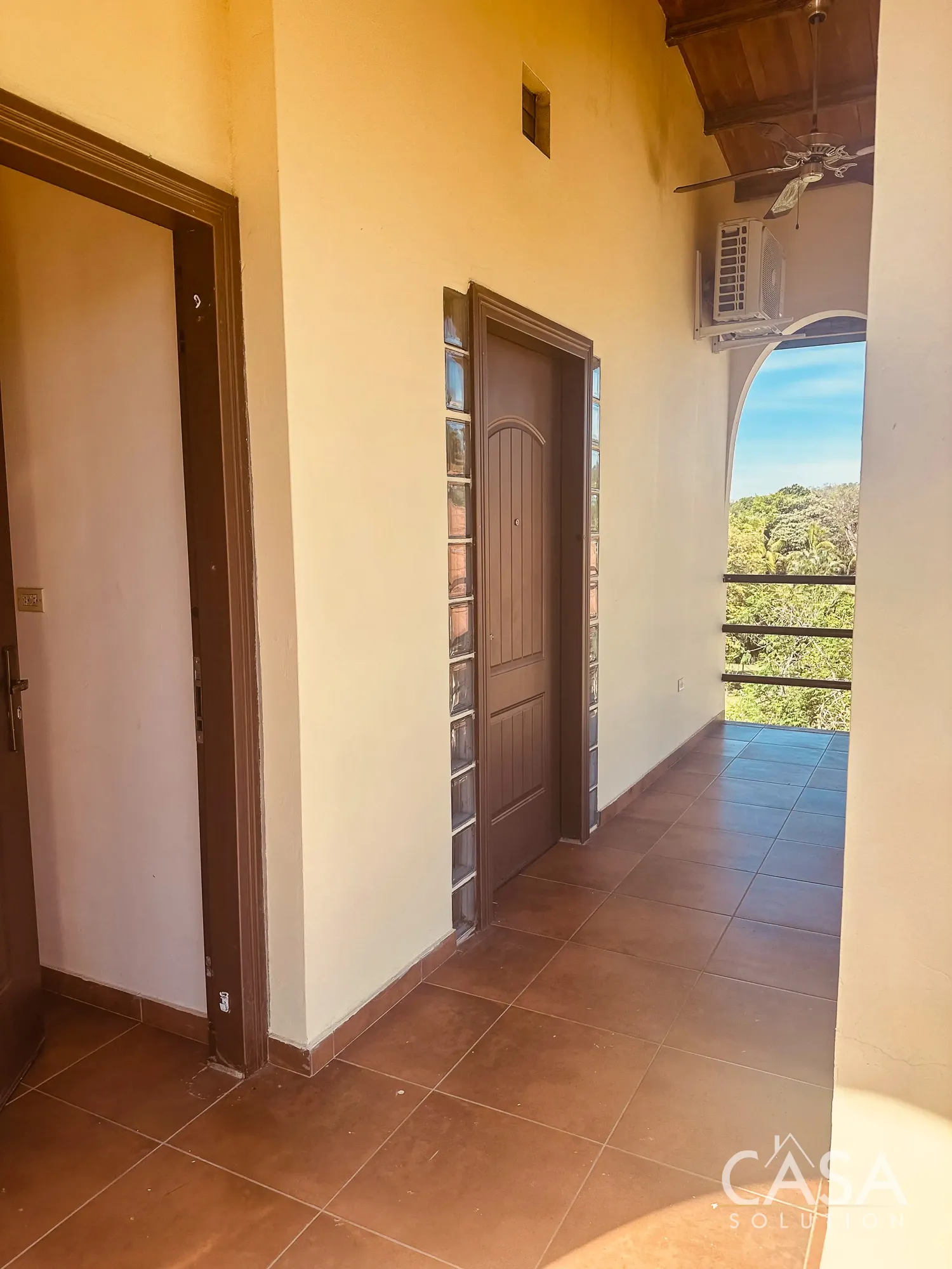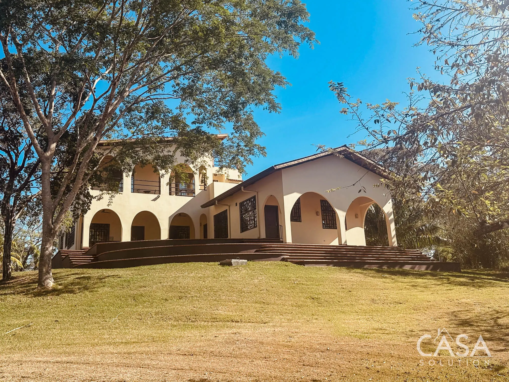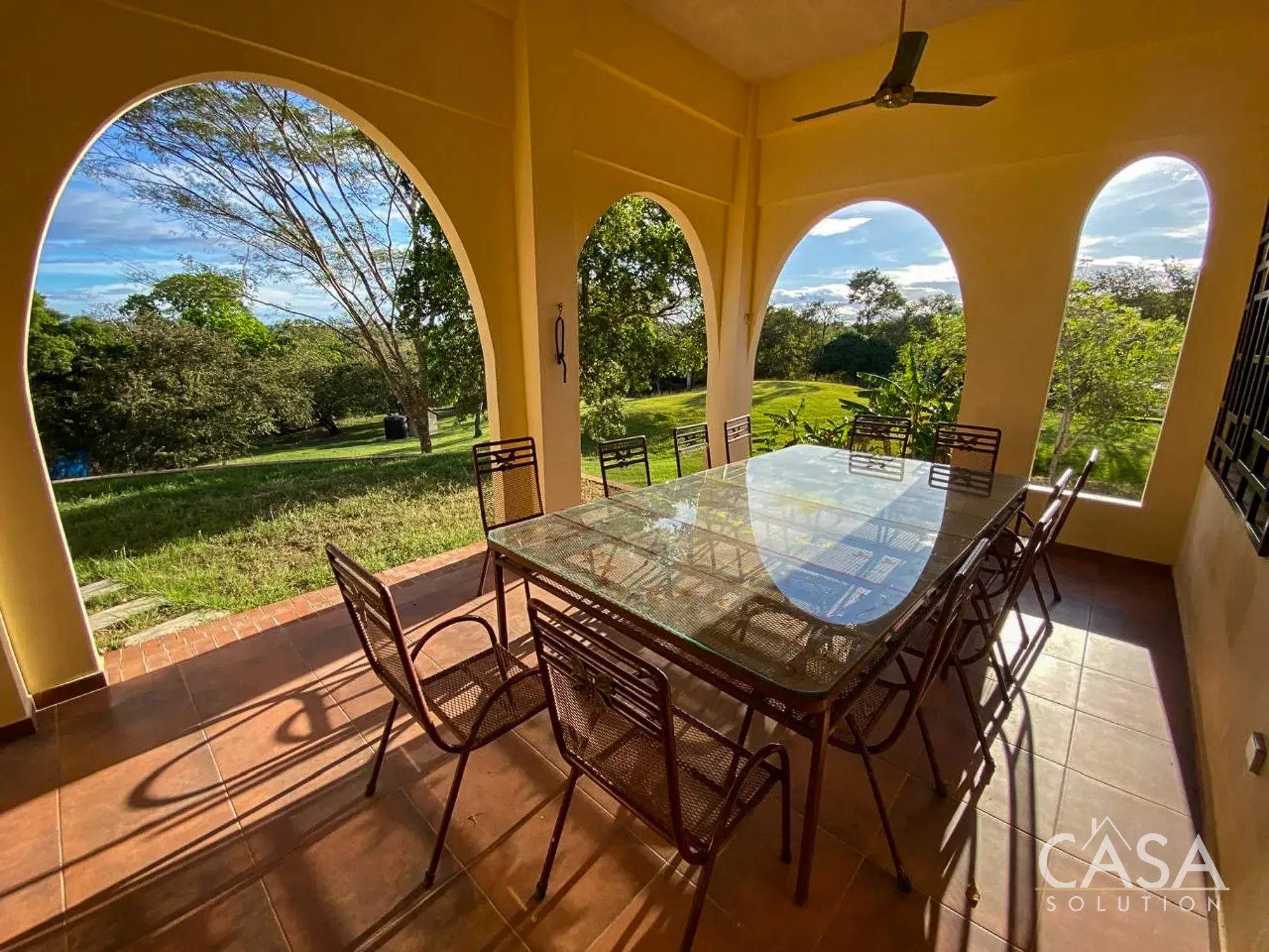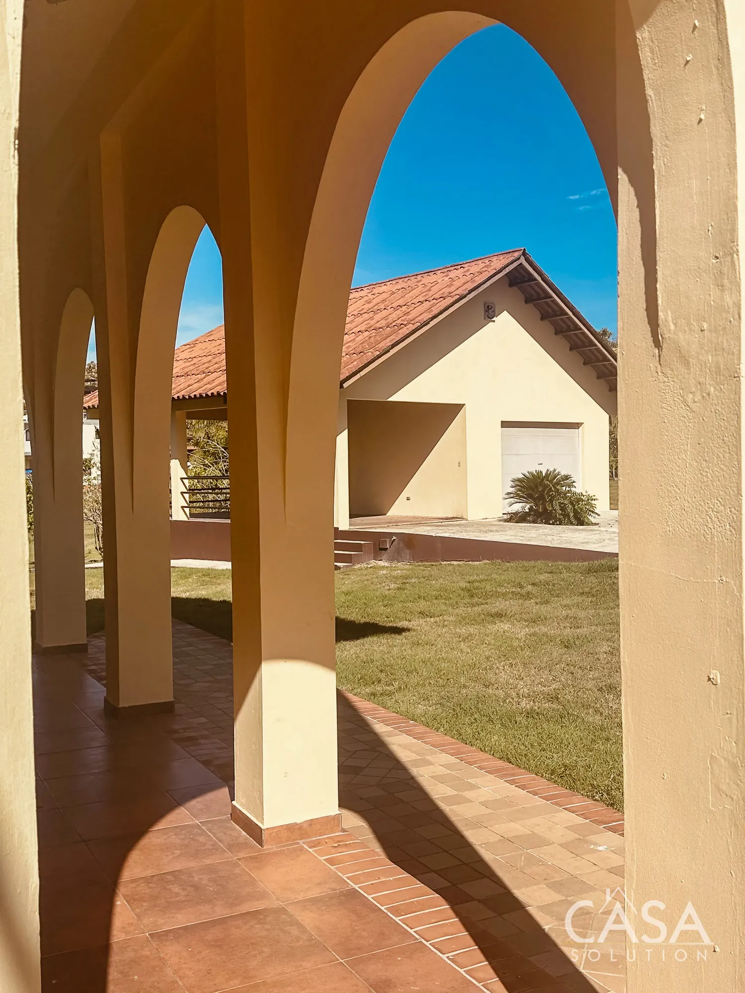 The home features a Mediterranean-inspired design with covered arches, high ceilings, and wide exterior corridors that work well with the local climate. The layout prioritizes airflow, shade, and a natural transition between indoor and outdoor areas.