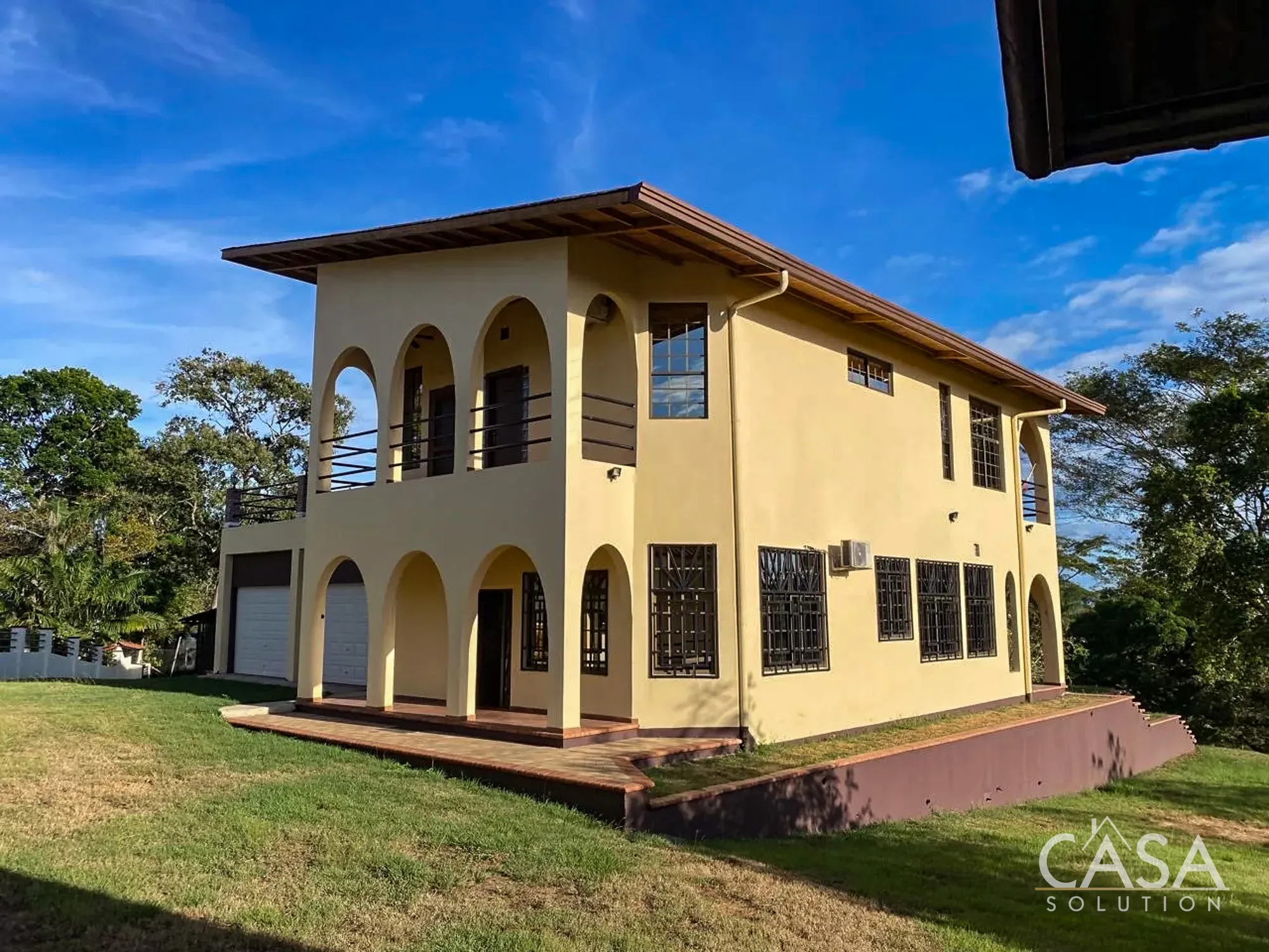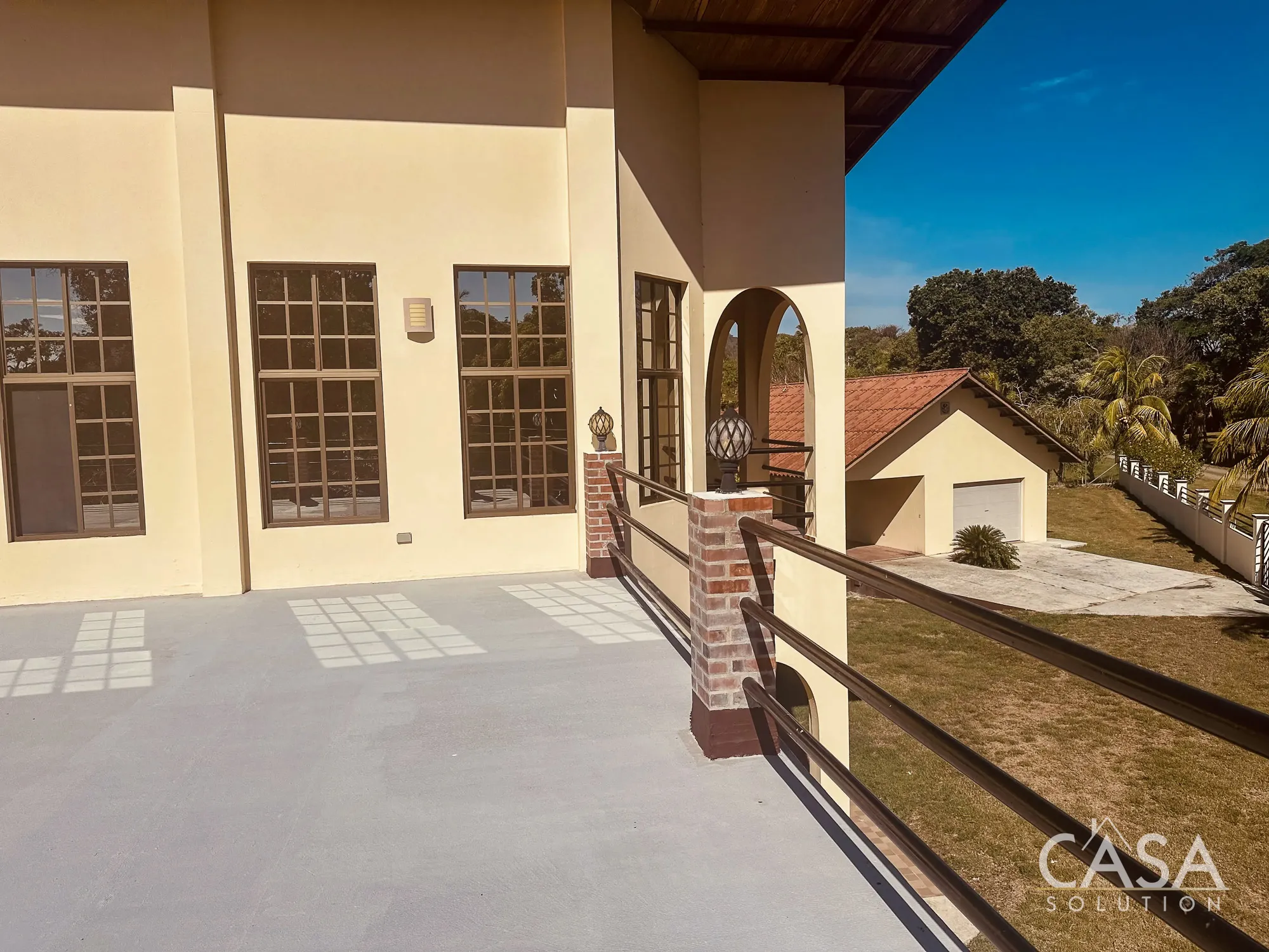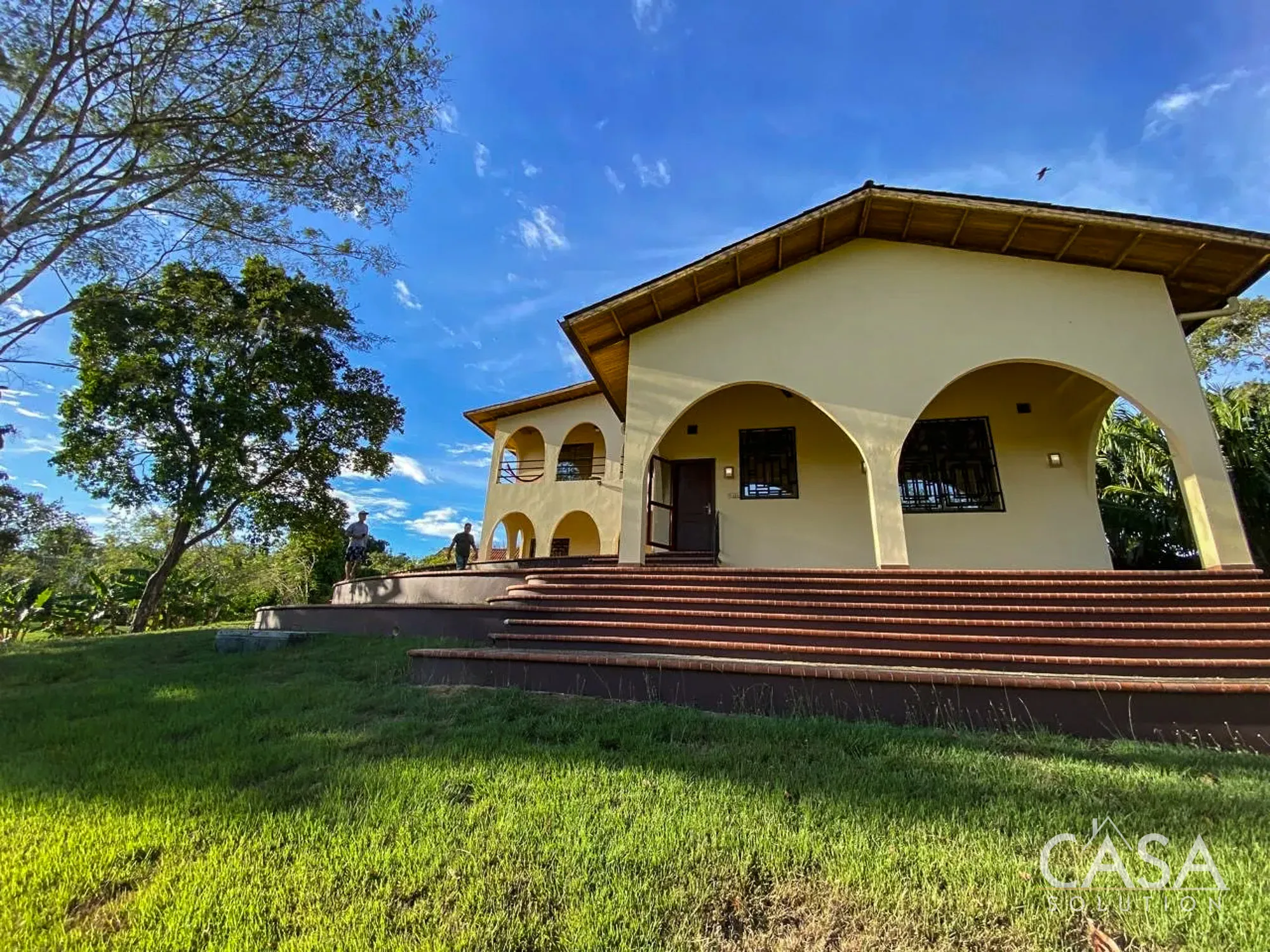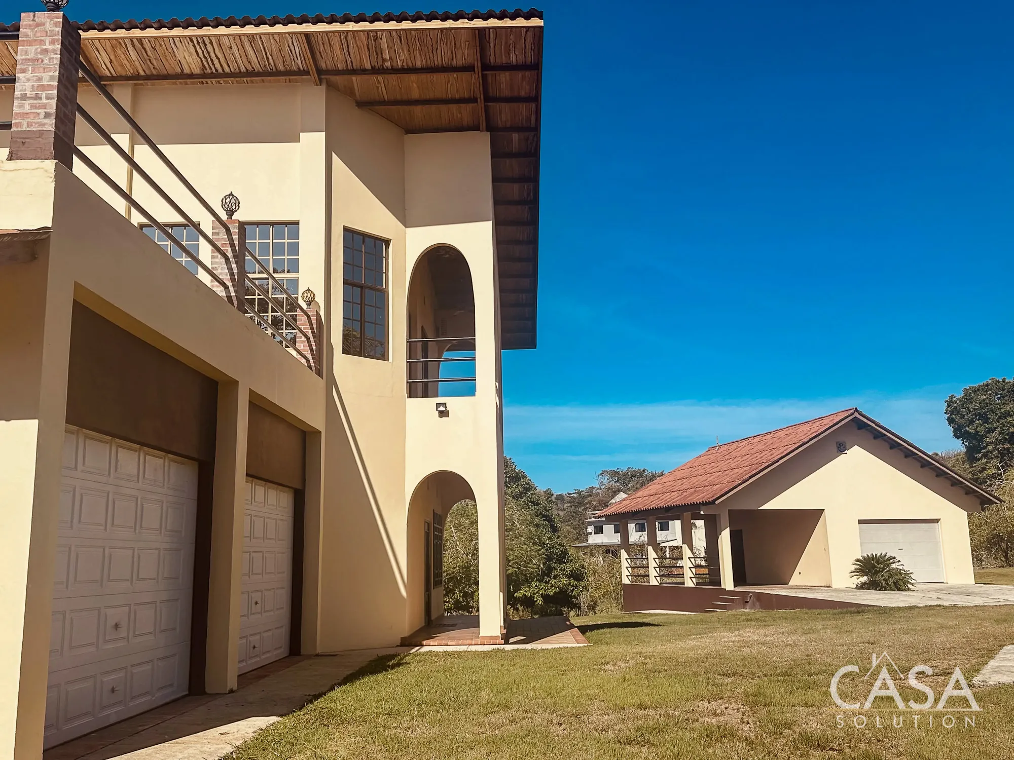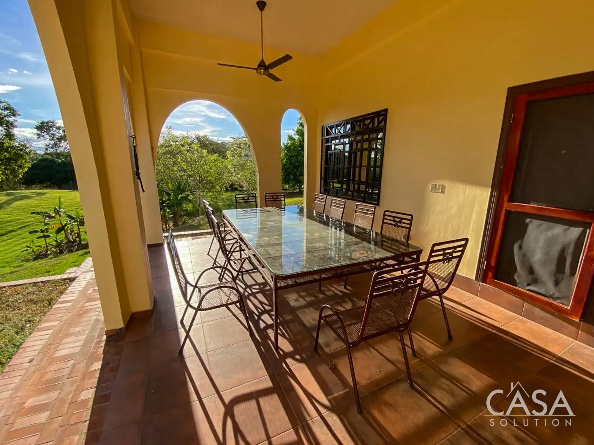 The home features a Mediterranean-inspired design with covered arches, high ceilings, and wide exterior corridors that work well with the local climate. The layout prioritizes airflow, shade, and a natural transition between indoor and outdoor areas.