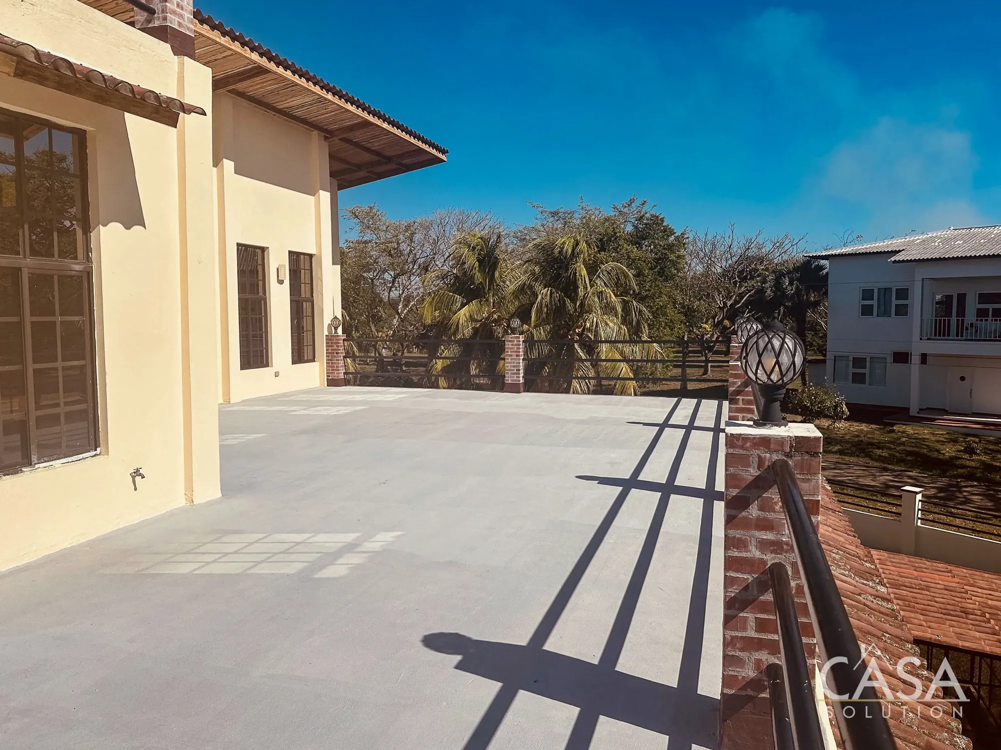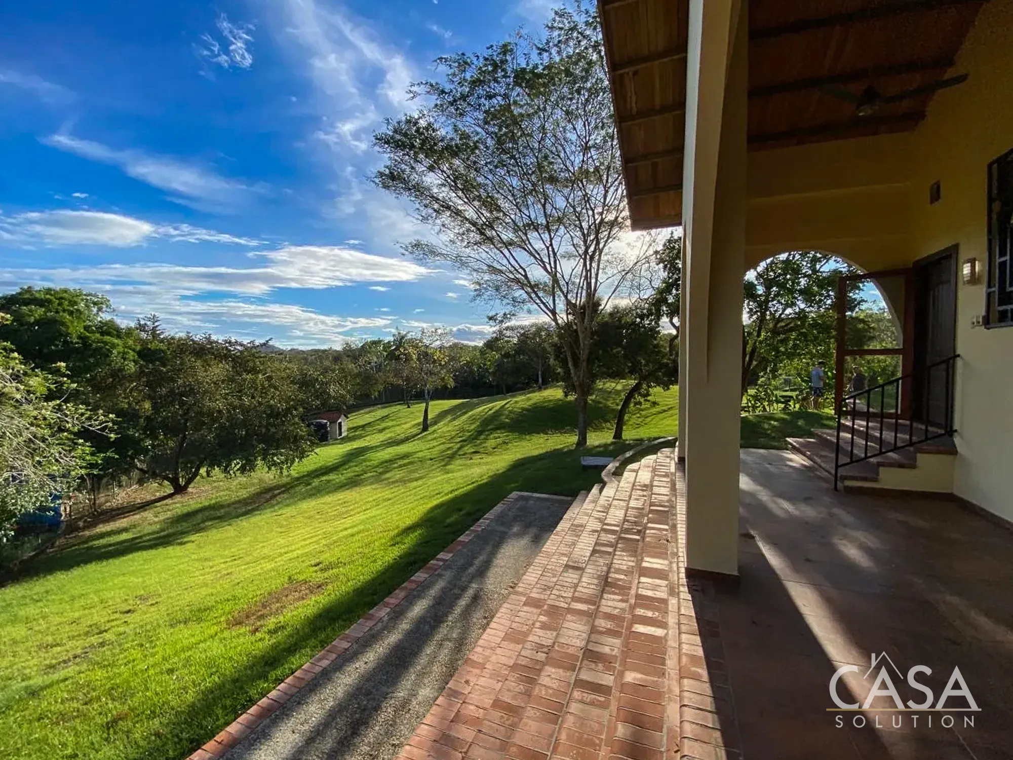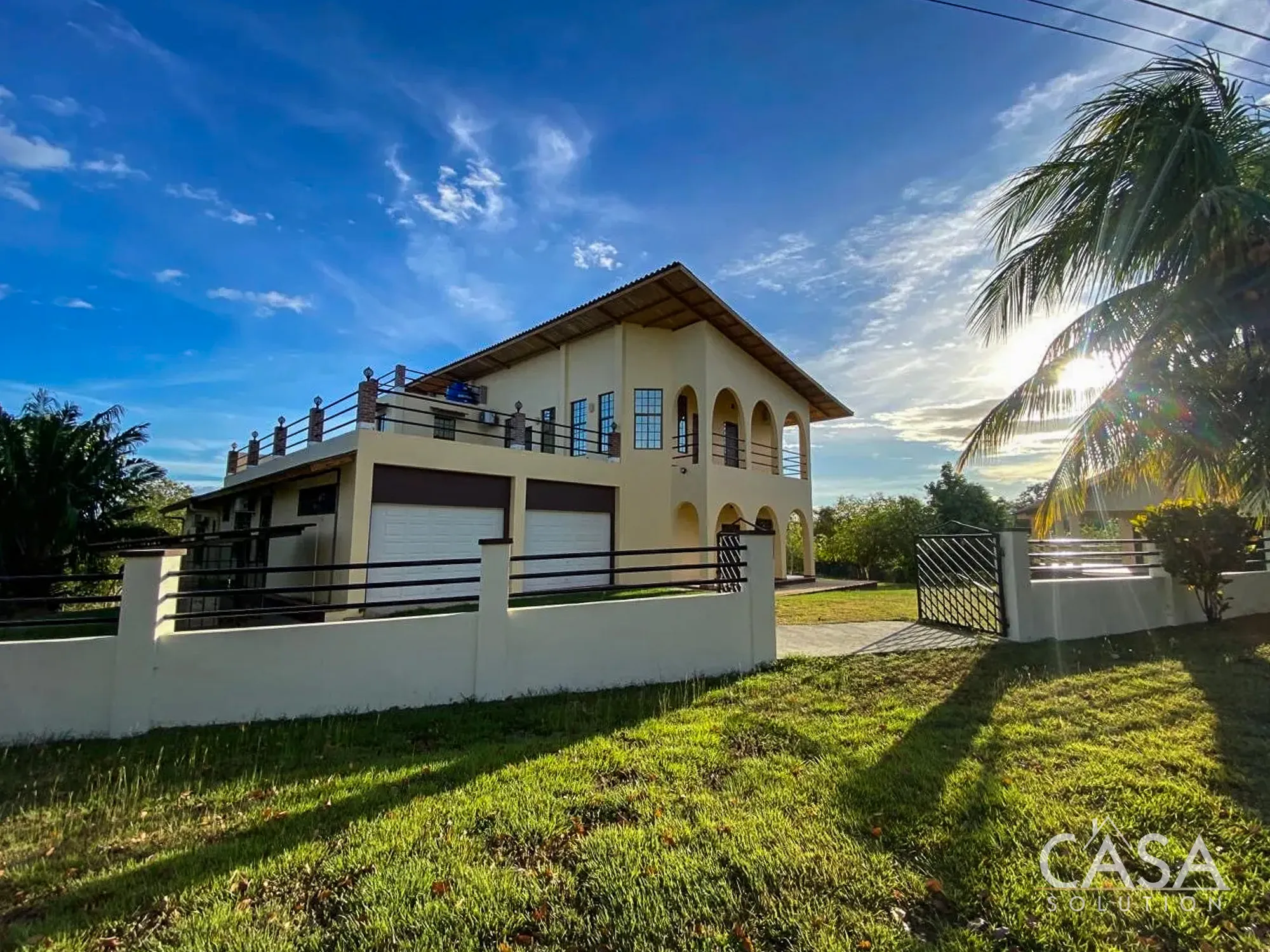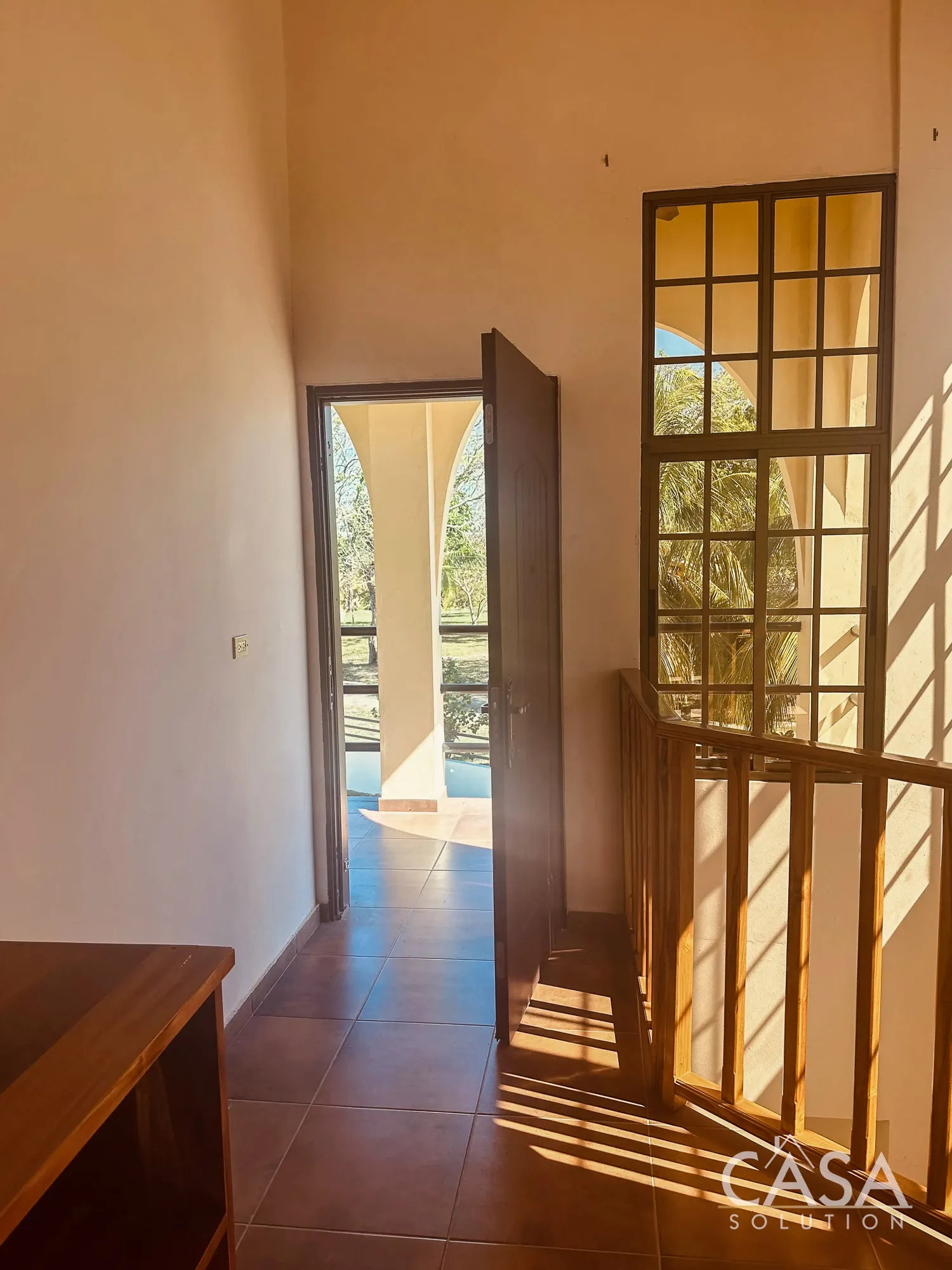 The home features a Mediterranean-inspired design with covered arches, high ceilings, and wide exterior corridors that work well with the local climate. The layout prioritizes airflow, shade, and a natural transition between indoor and outdoor areas.