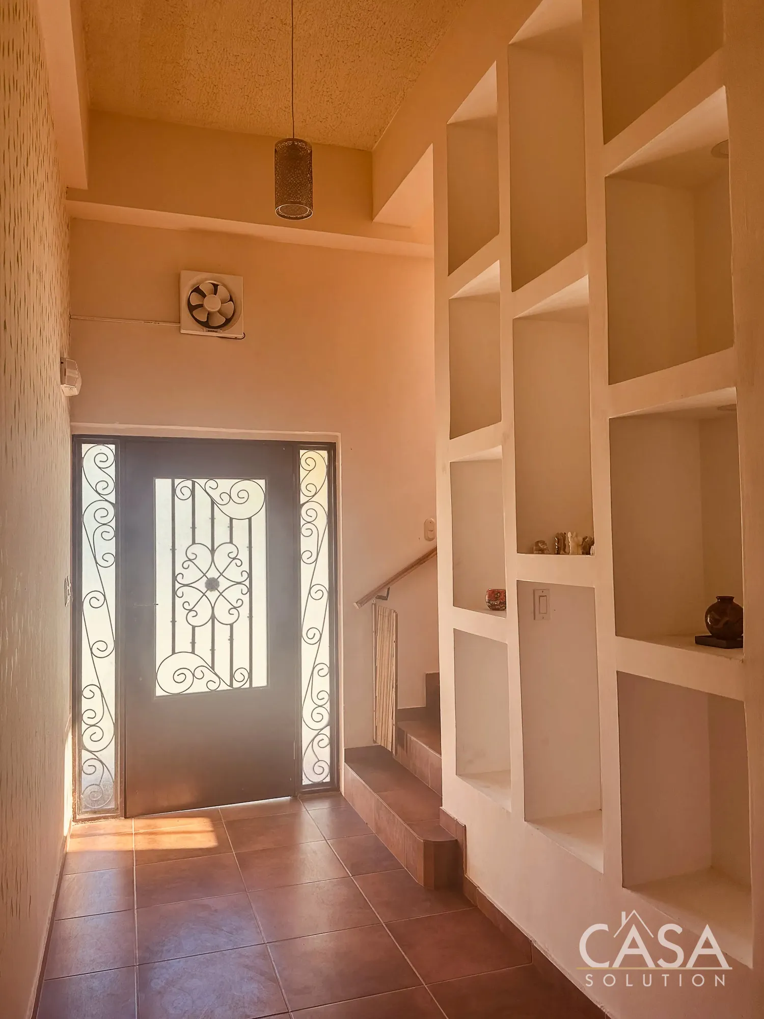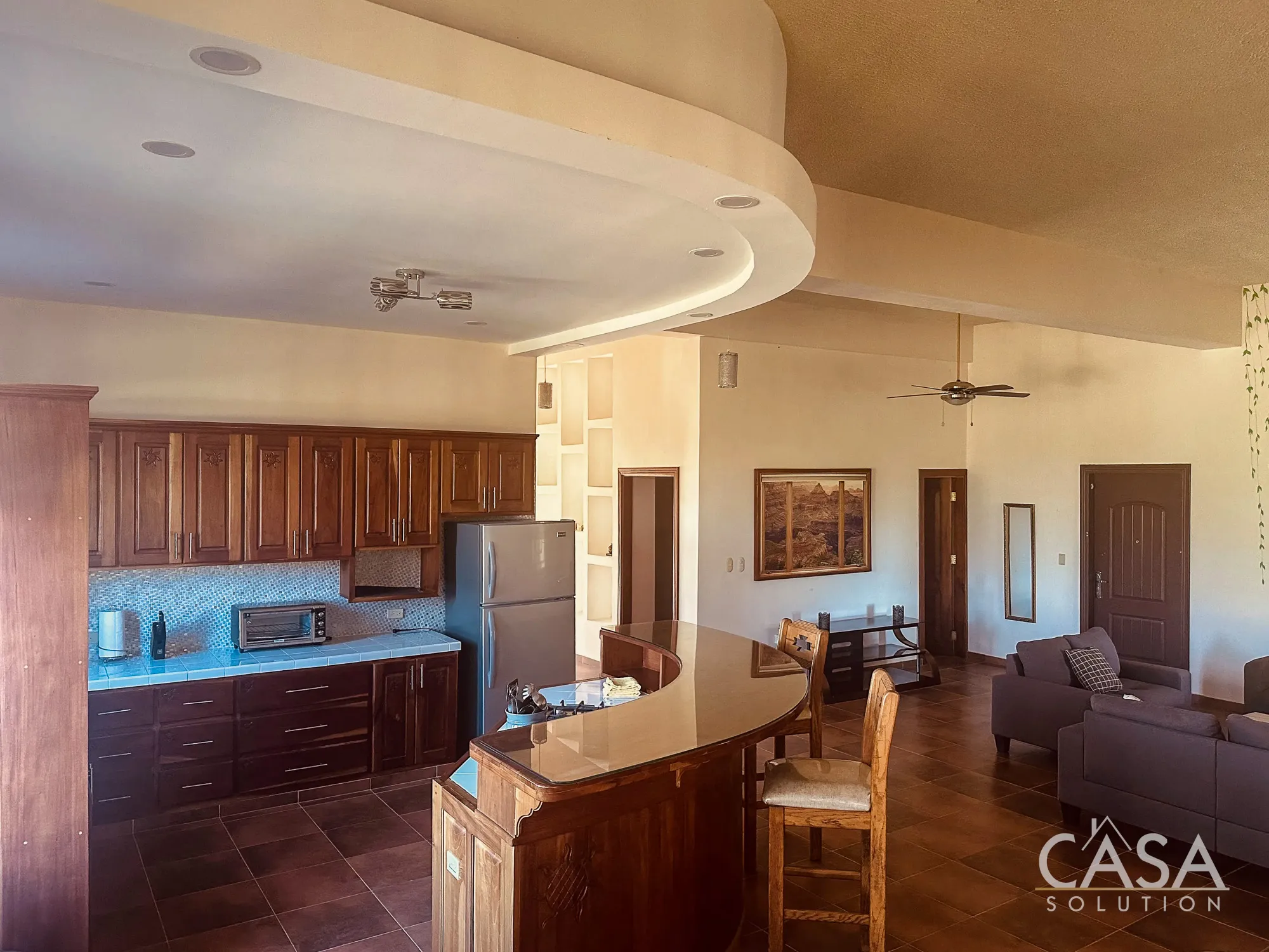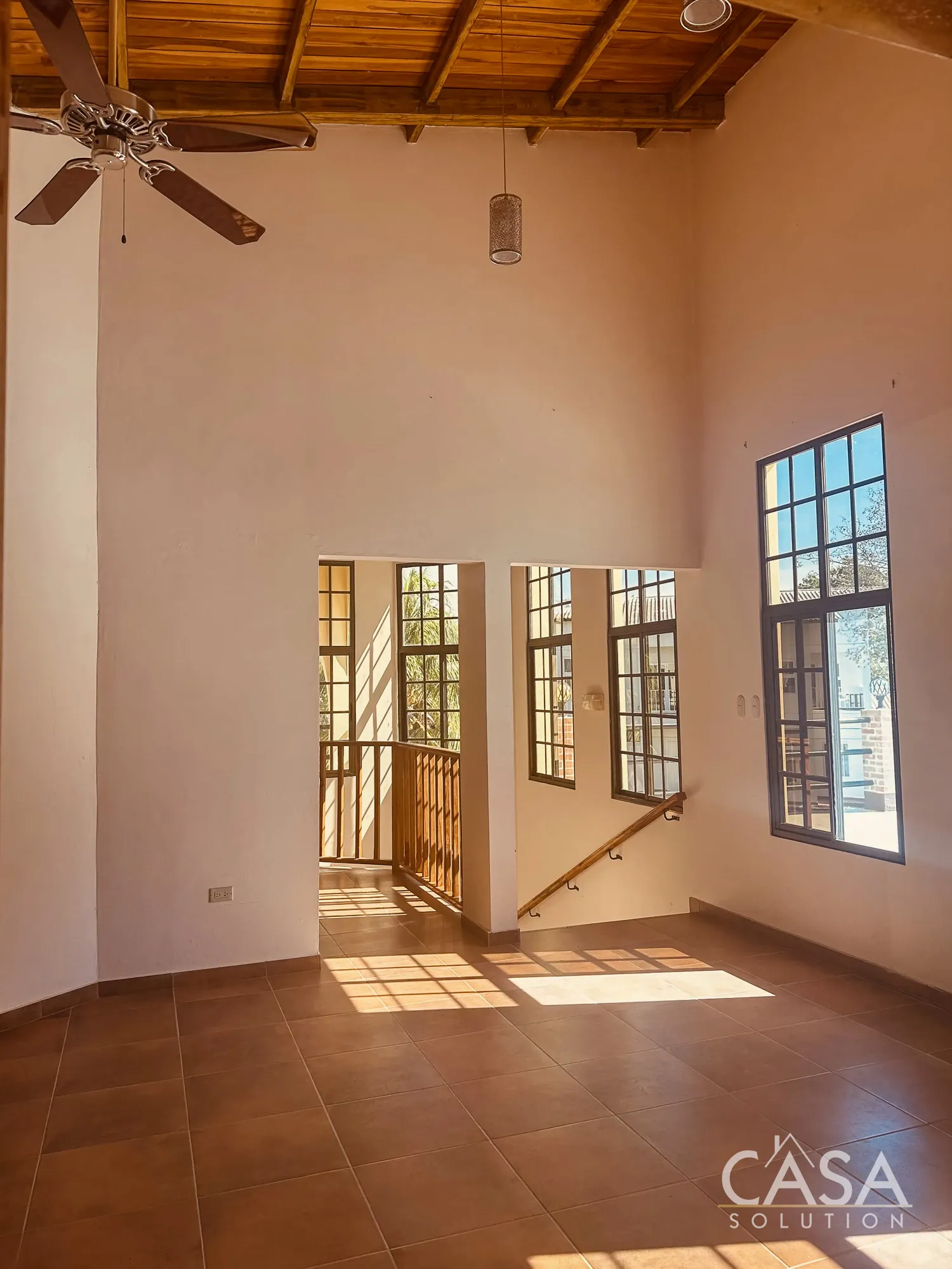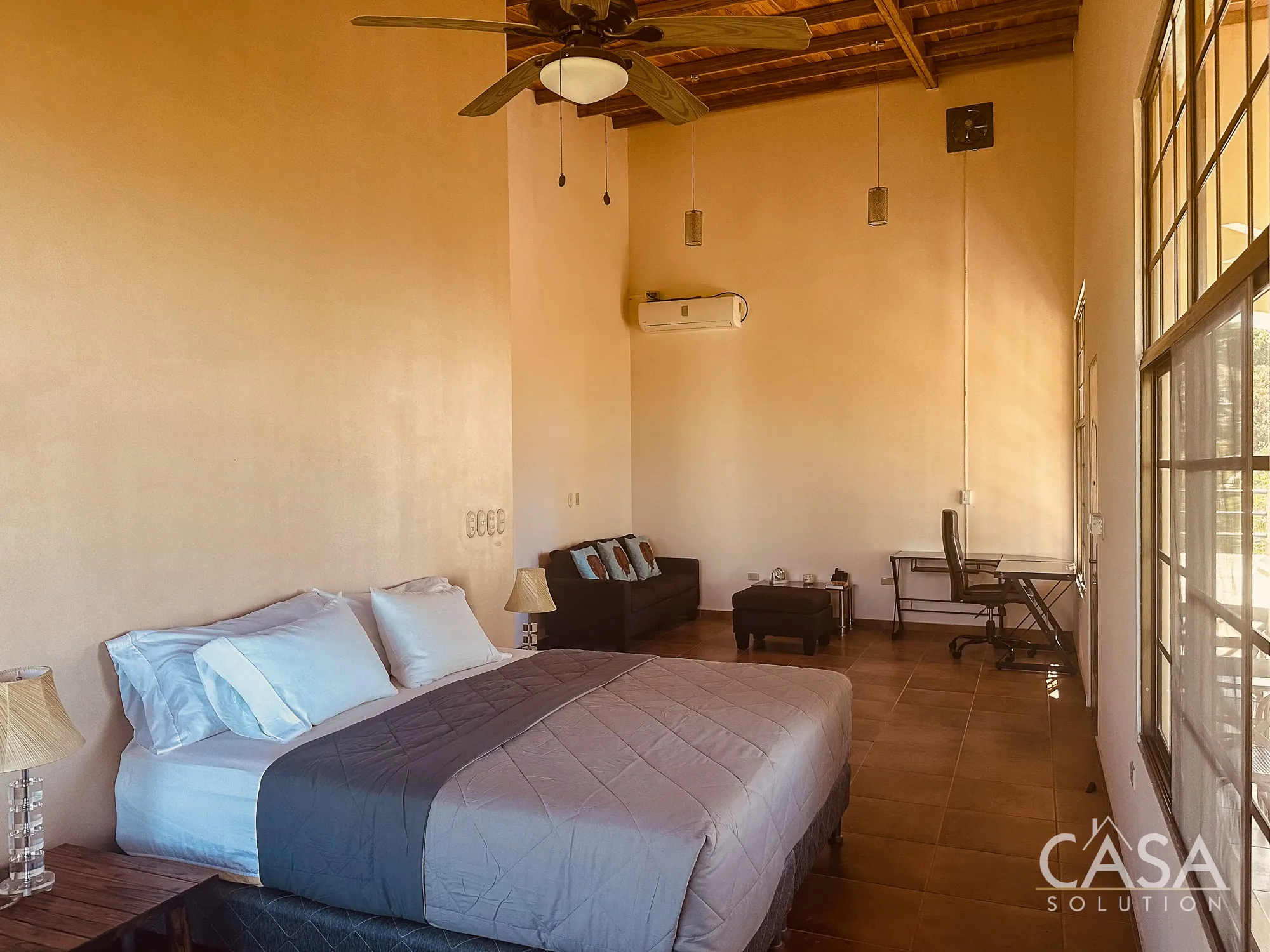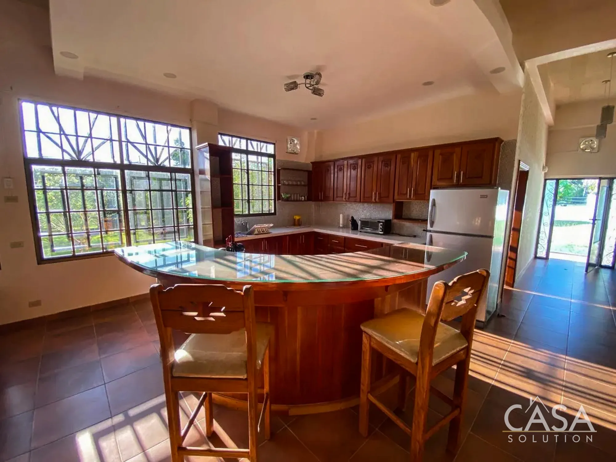 The home features a Mediterranean-inspired design with covered arches, high ceilings, and wide exterior corridors that work well with the local climate. The layout prioritizes airflow, shade, and a natural transition between indoor and outdoor areas.