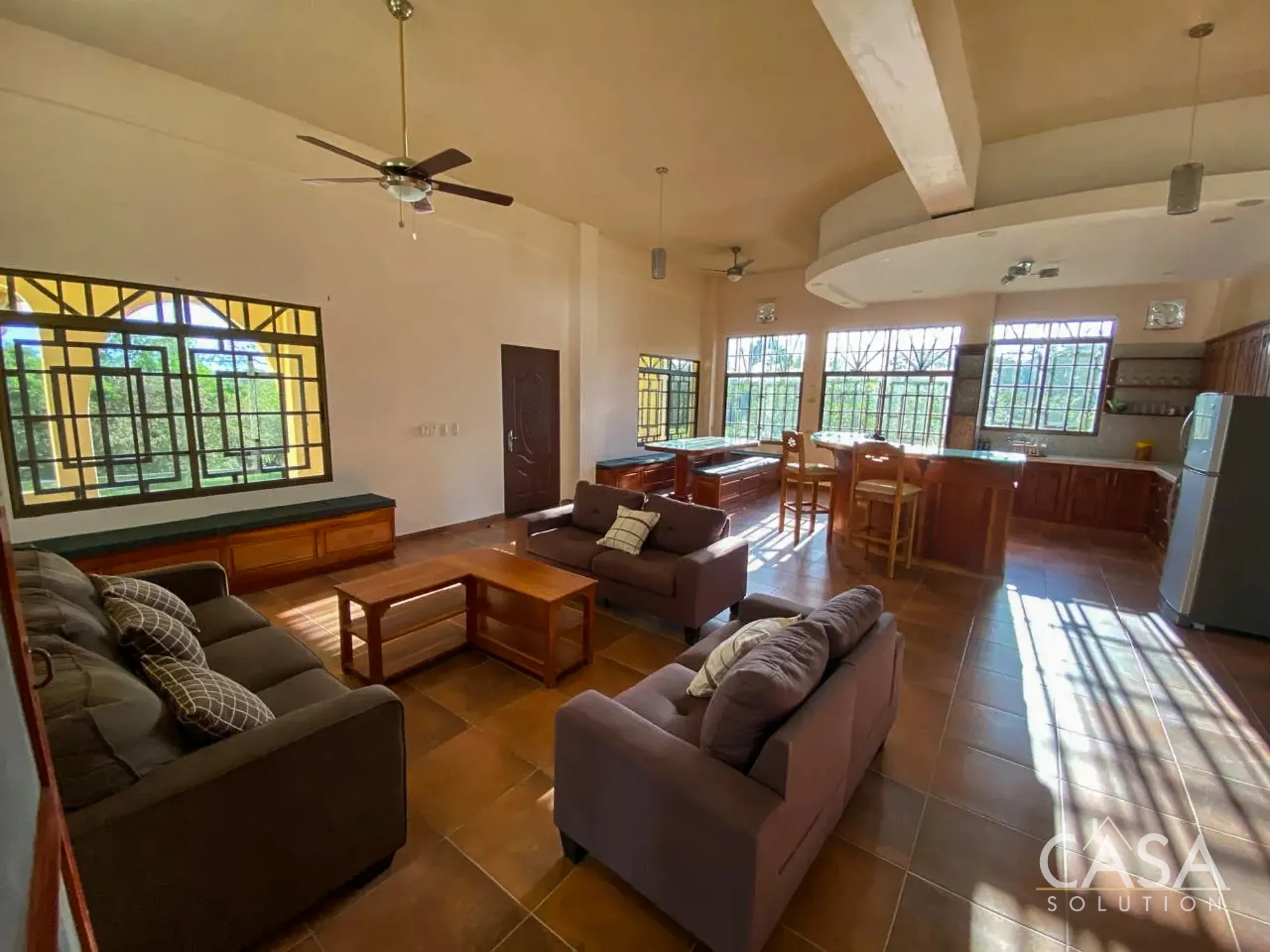 The interior centers around spacious common areas with high ceilings that improve airflow and bring in natural light. The kitchen connects directly to the living and dining areas, creating a central gathering space that works well for daily living and entertaining.