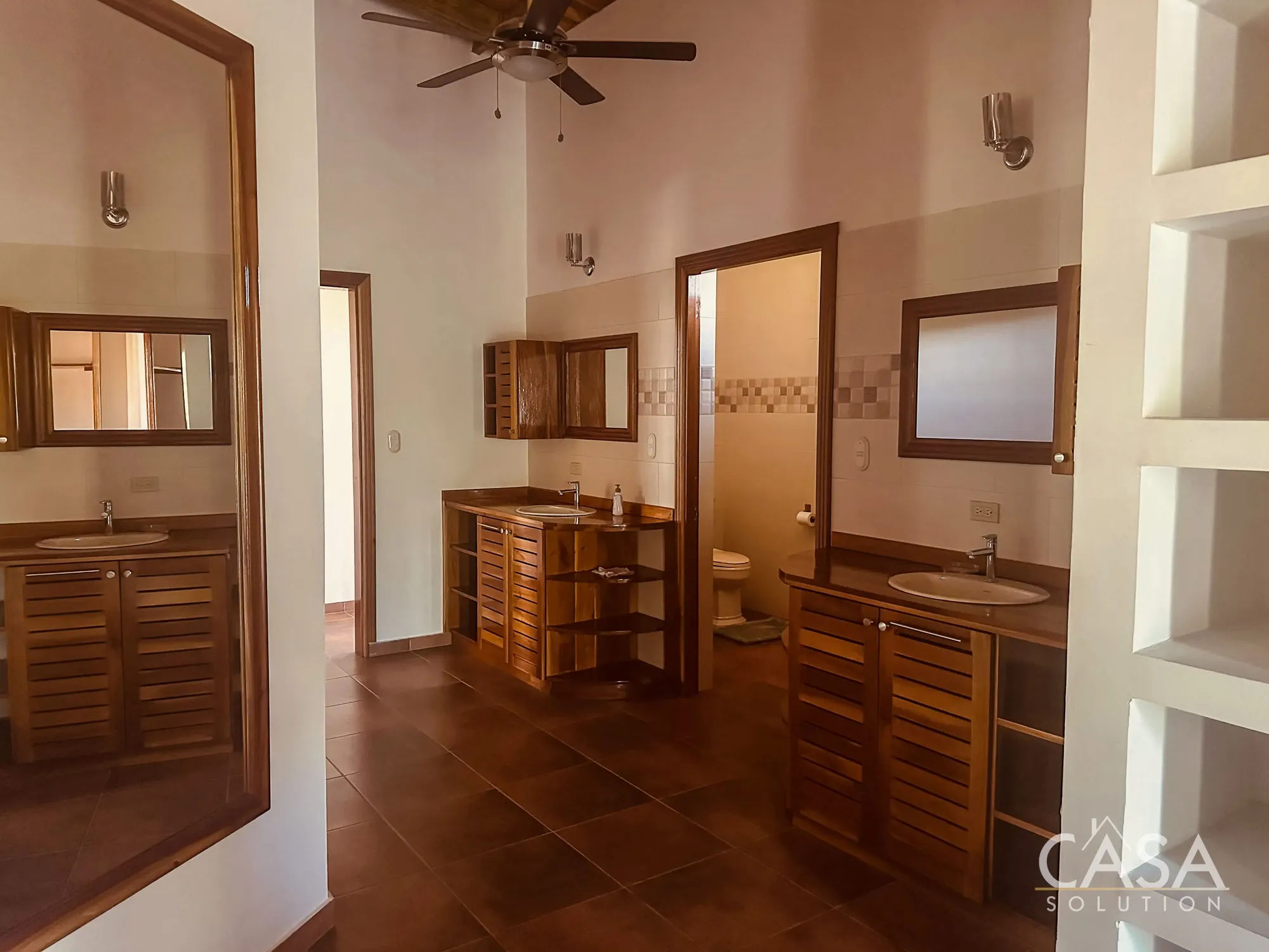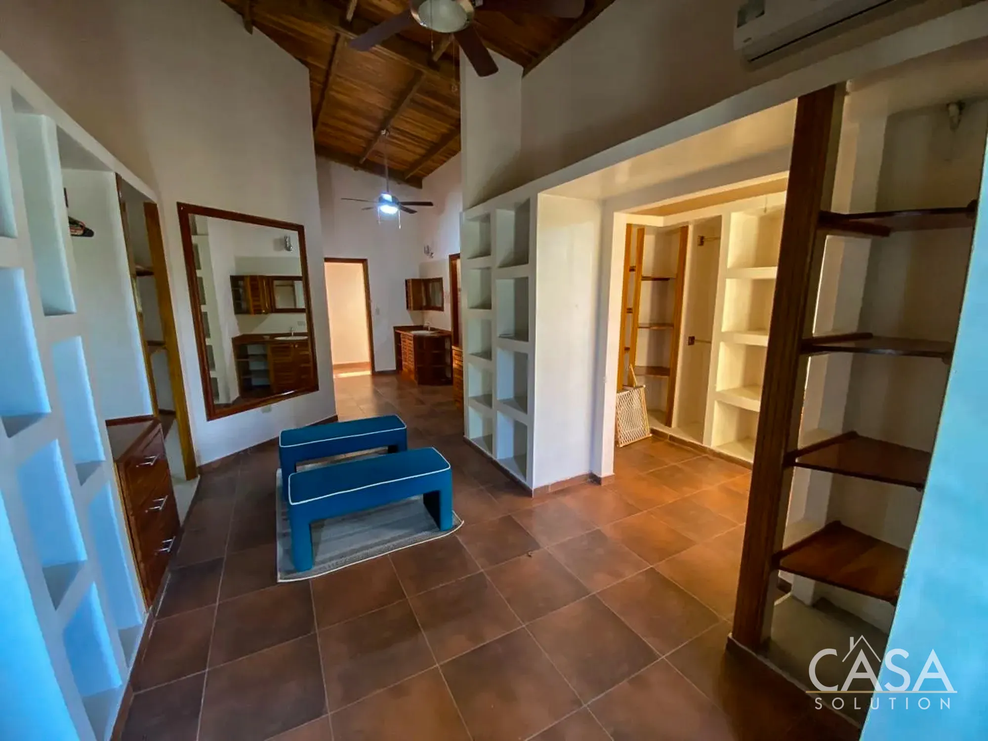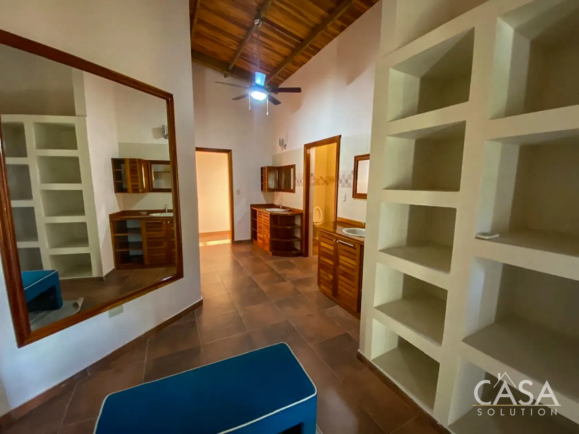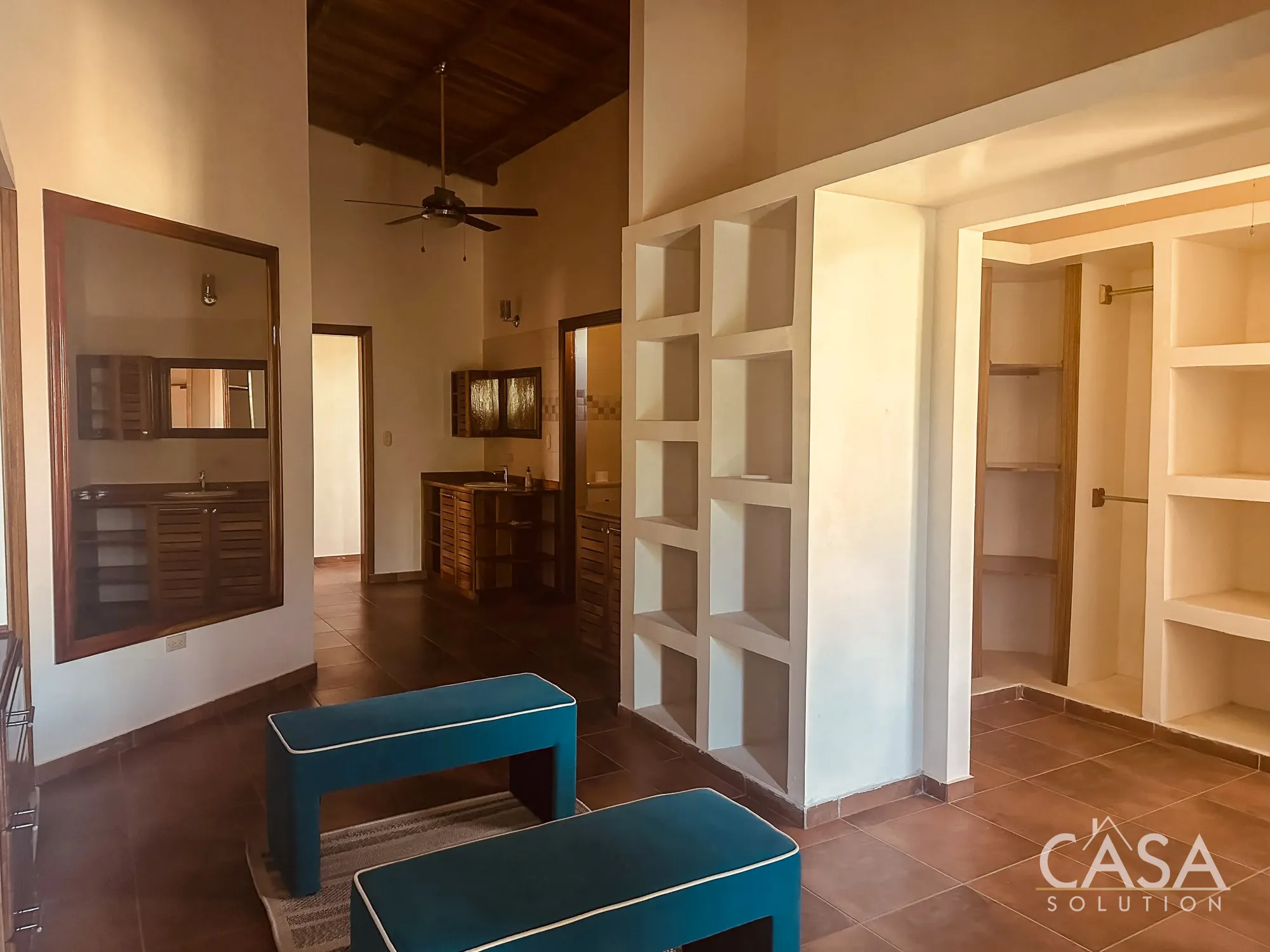 The primary bedroom stands out for its size, ceiling height, and natural light. The bathroom and closet areas offer more space than what is typically found in coastal homes, with multiple vanities and built-in storage.