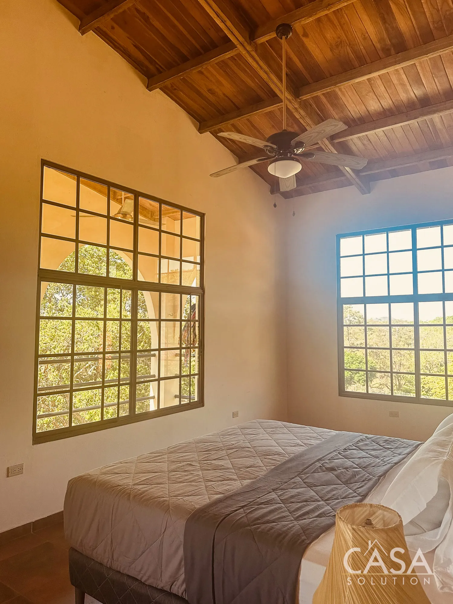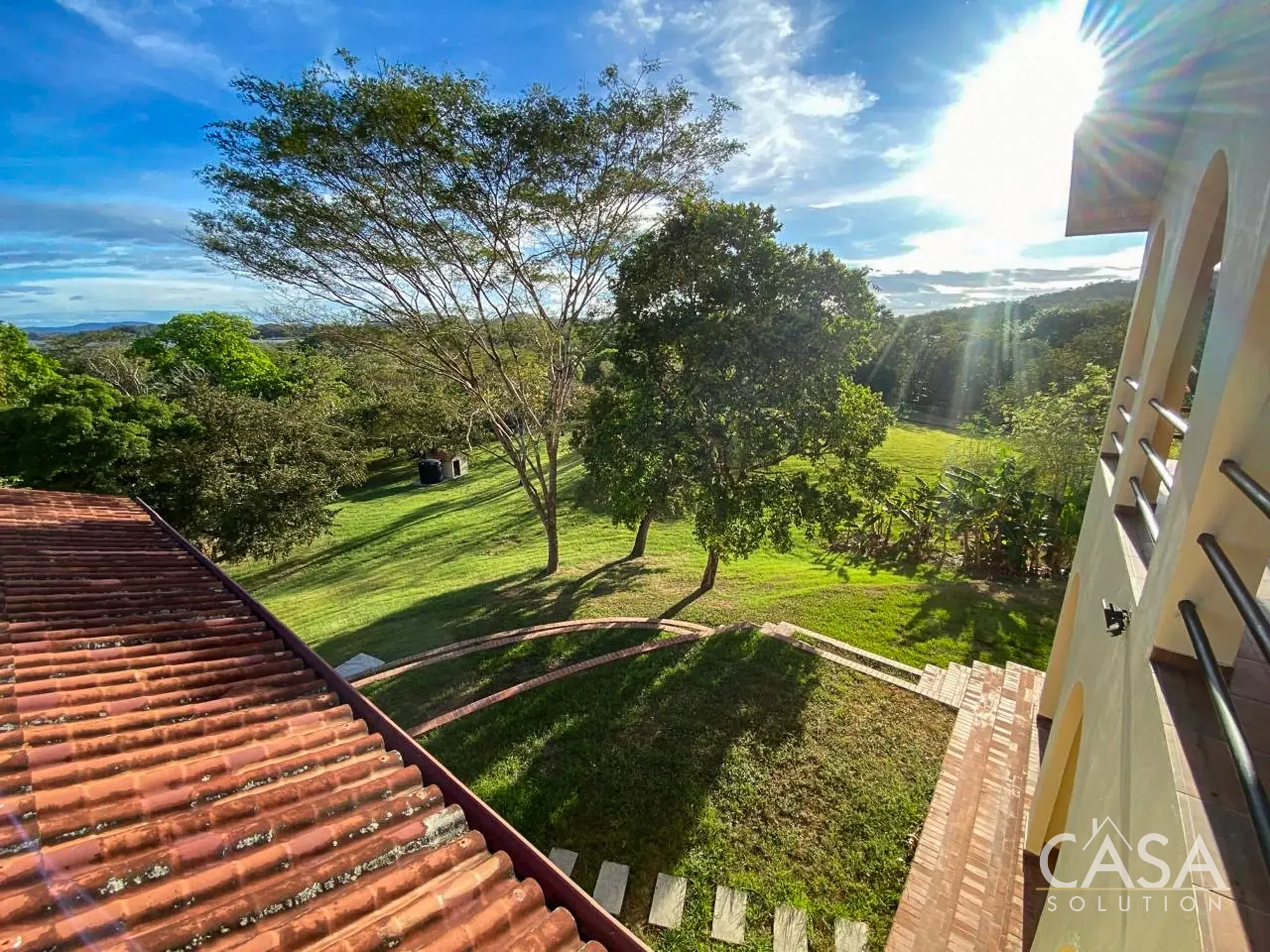 As you approach, the elevated structure and surrounding greenery create an open feel. The property includes a main residence and a separate guest house, giving you flexibility for hosting, extended stays, or a more private owner setup.
