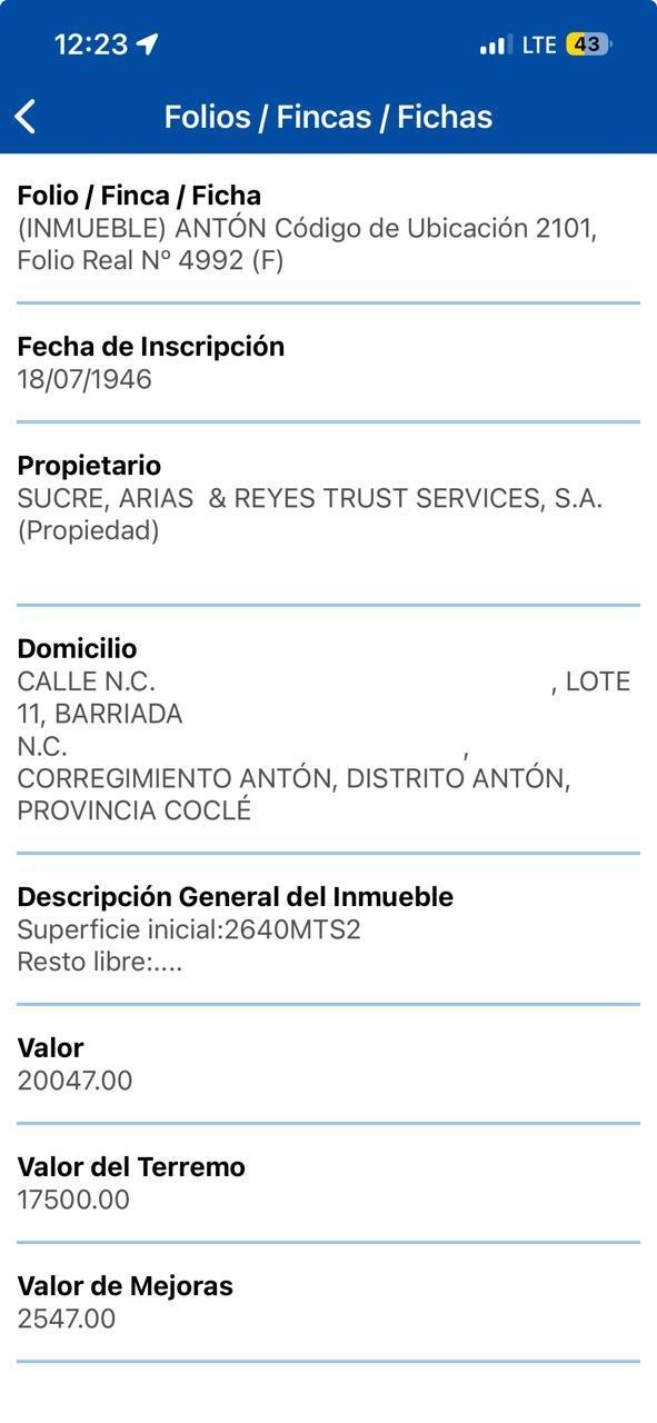 Just an hour and a half from Panama City, and near attractive developments such as Coronad, Punta Barco, and Buenaventura, among others, you'll find an irregularly shaped plot of land with mostly flat topography and easily mechanized slopes. The open areas are covered with natural grass and trees typical of the region, while the rear portion has low-lying undergrowth. The property is partially enclosed with cyclone fencing on steel tubes and/or barbed wire on wooden posts, while the front is enclosed with plastered cement blocks and iron gates for pedestrian and vehicular access. According to the Public Registry, the property has a registered area of 2,640.00 m² and includes a single-family home built in 1947.
