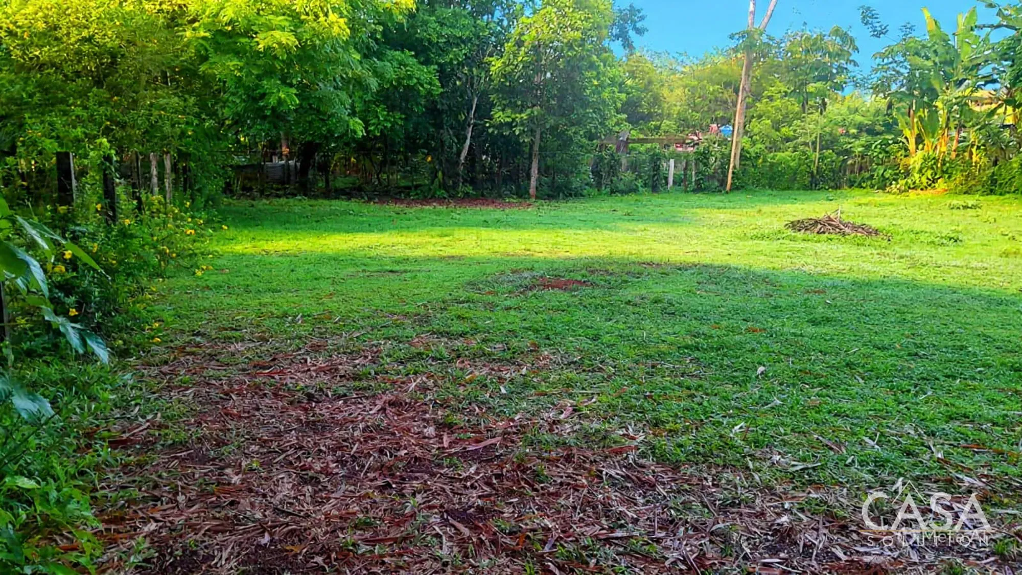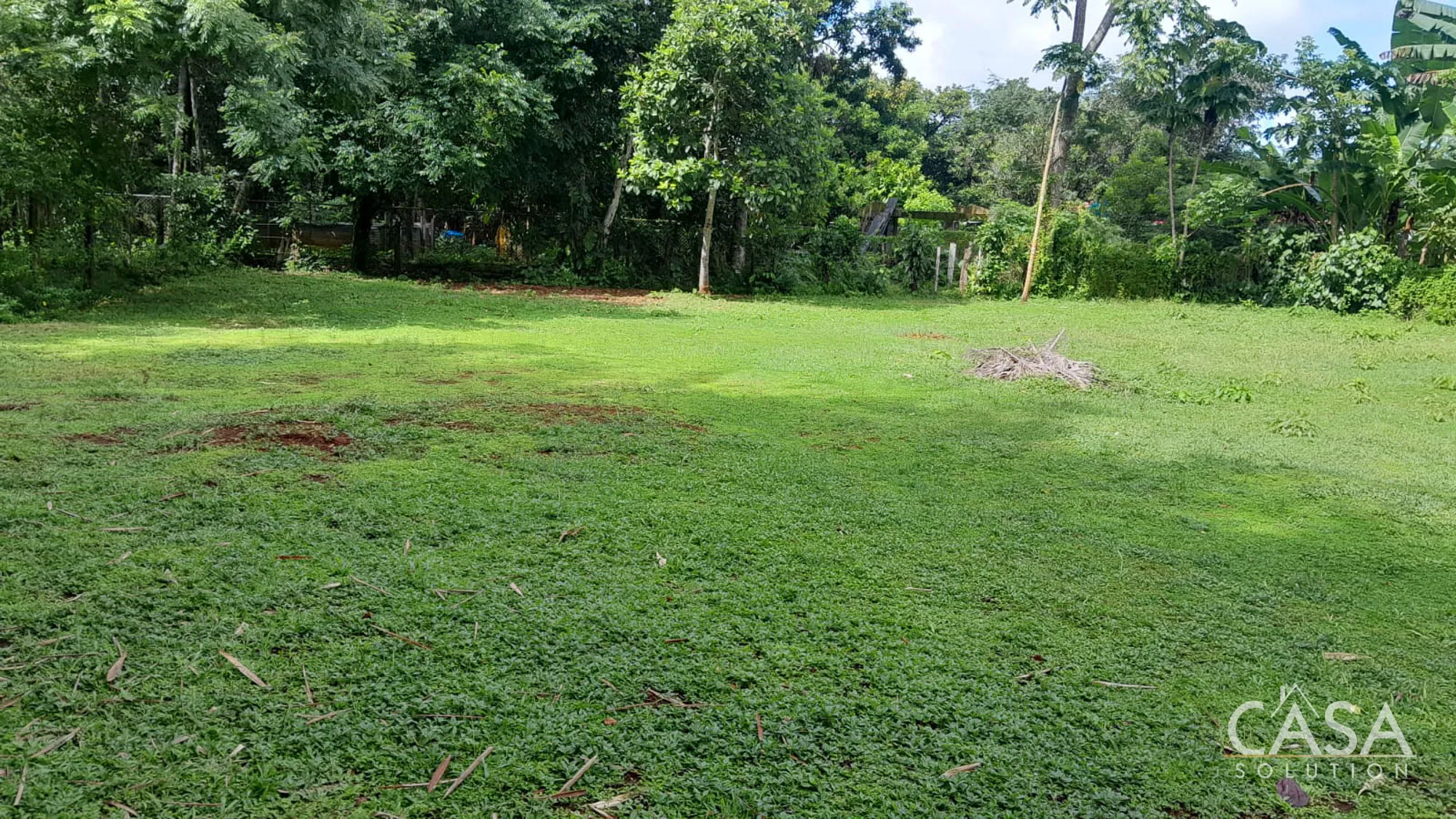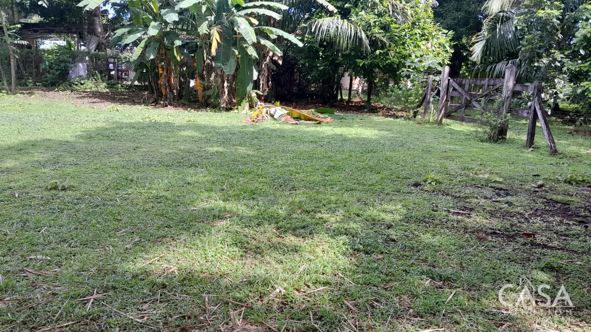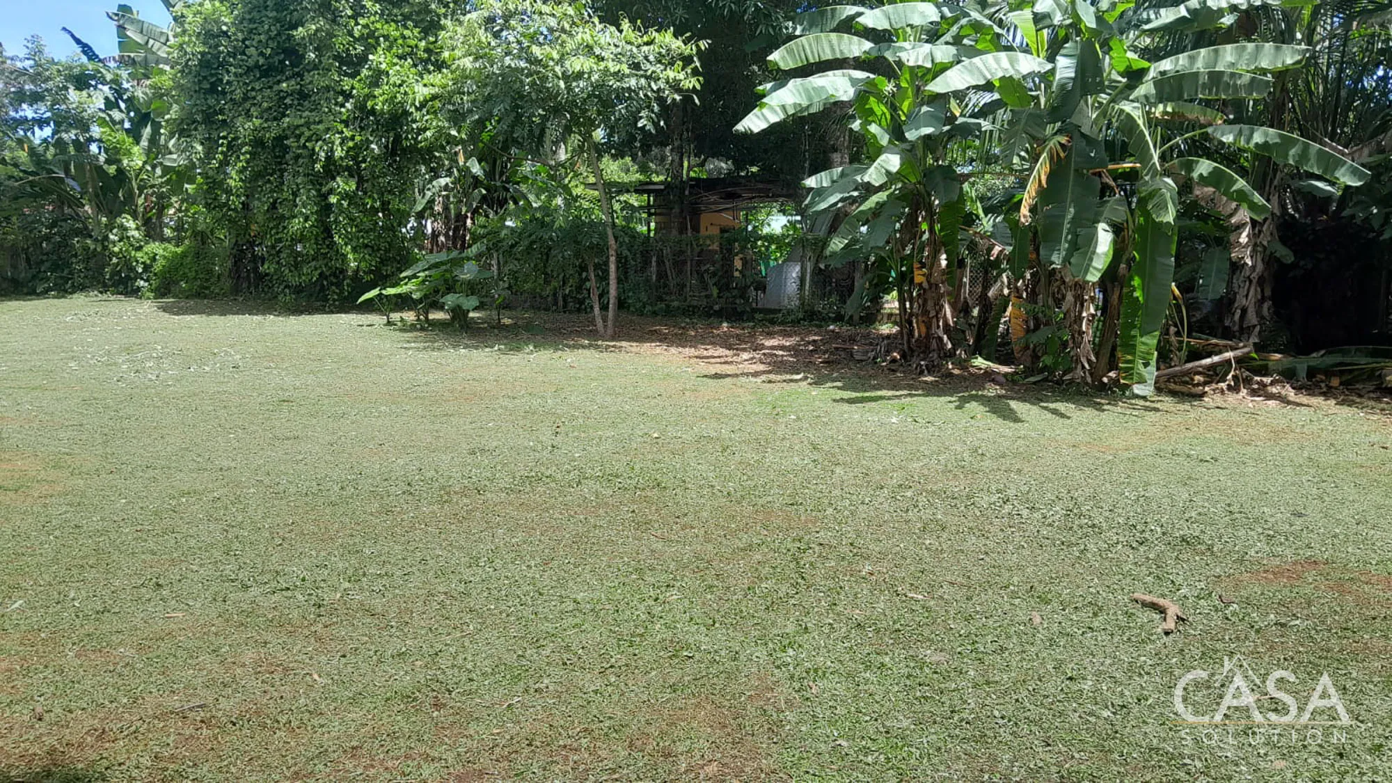 Banana and plantain trees grow on the property, while most of the land remains open and easy to manage.