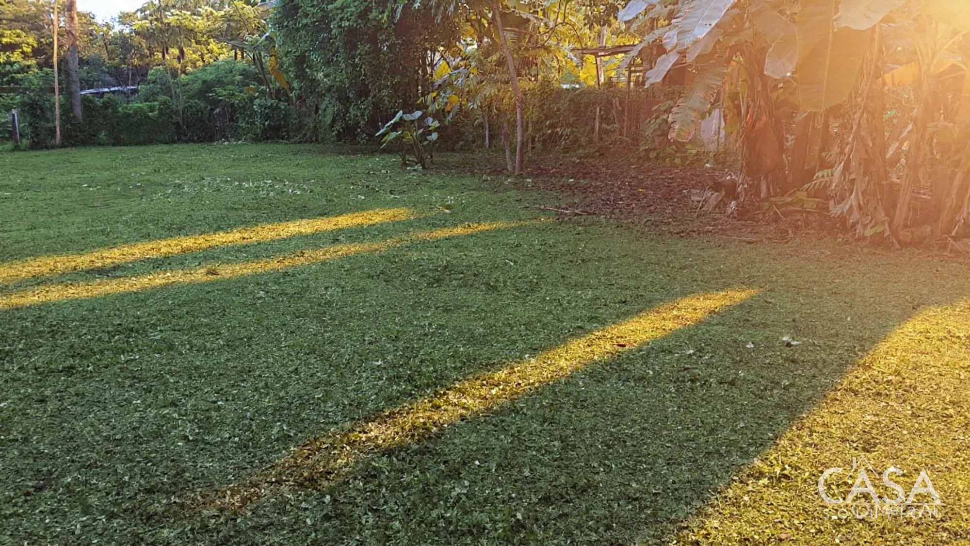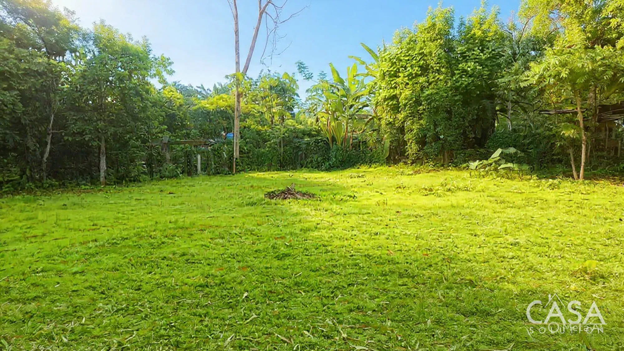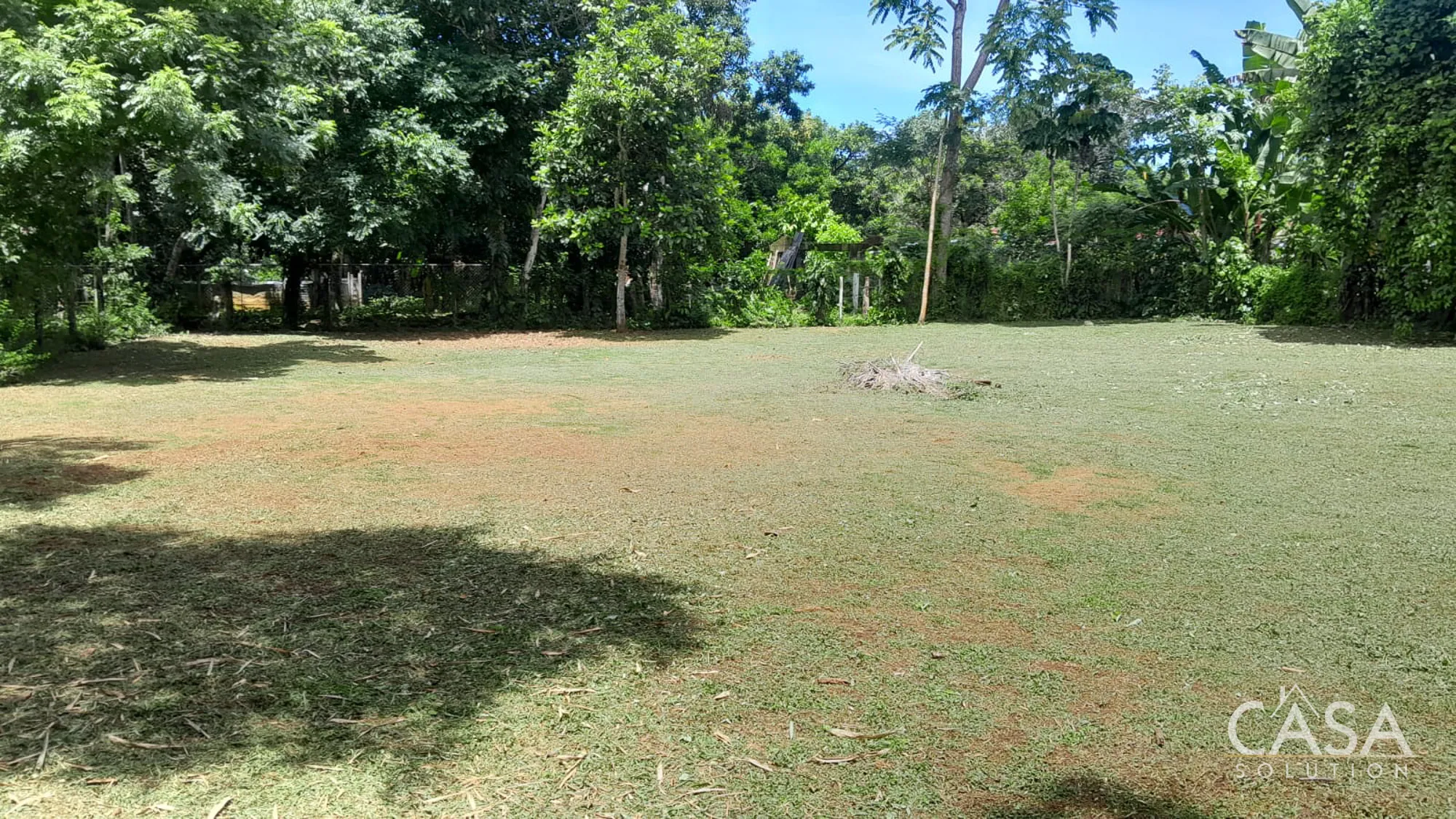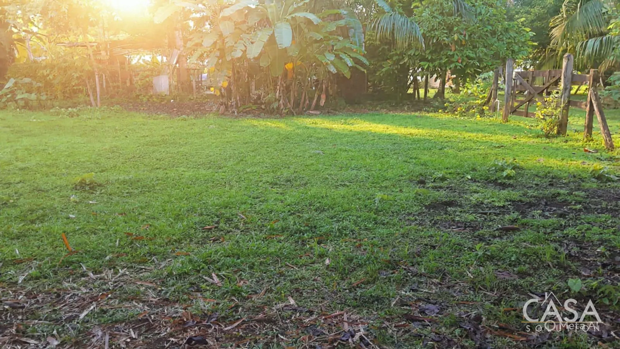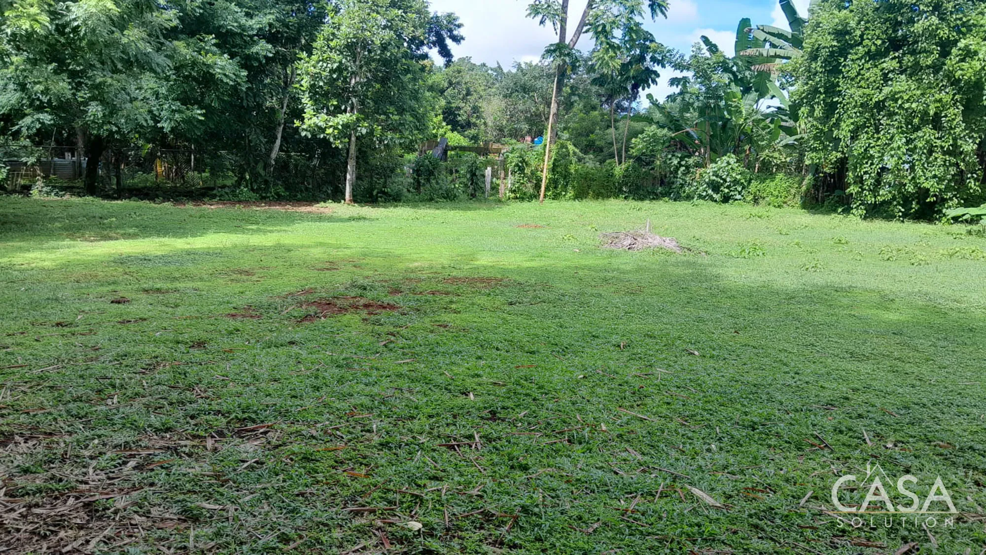 Banana and plantain trees grow on the property, while most of the land remains open and easy to manage.
