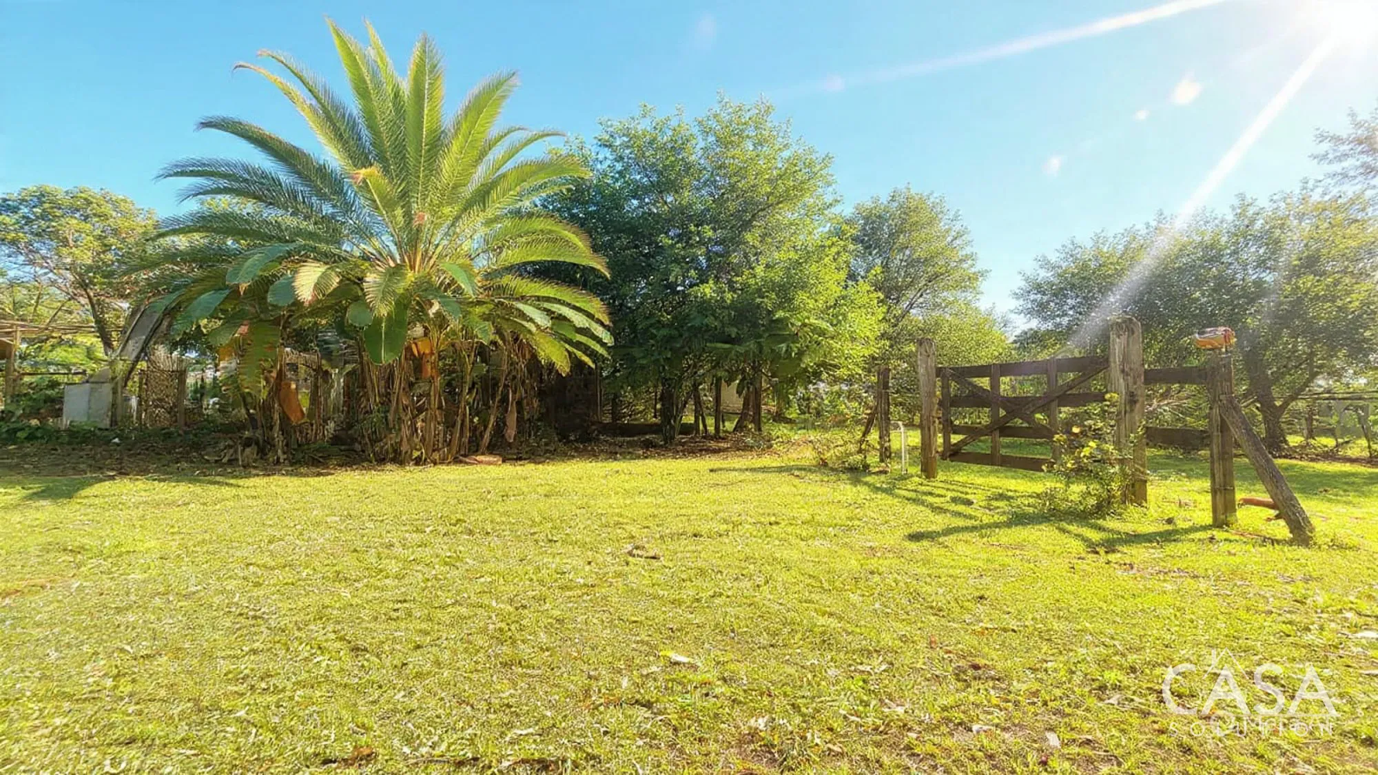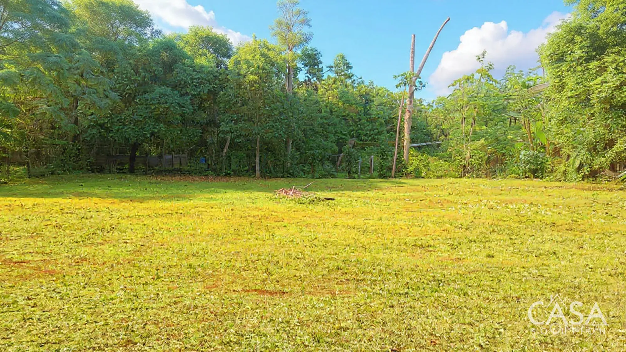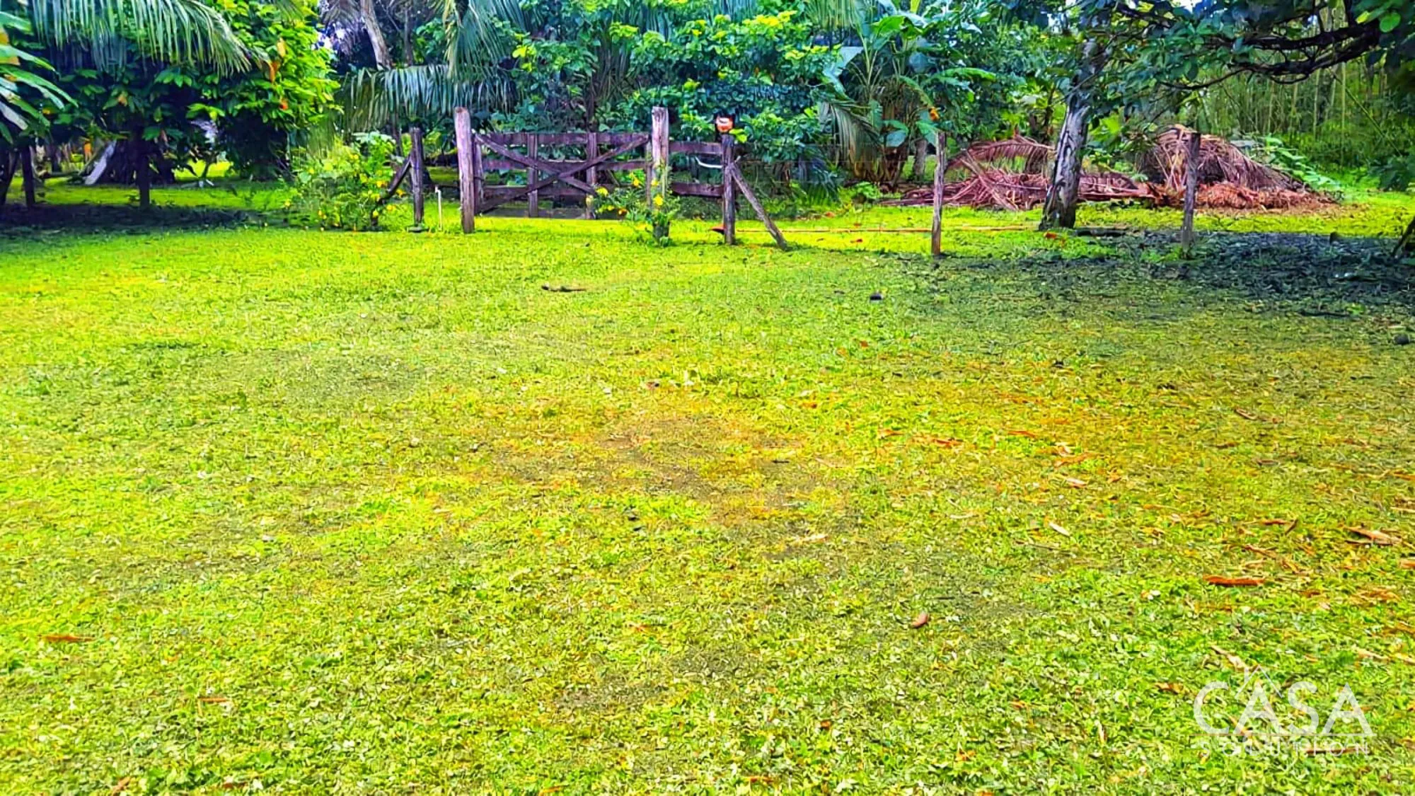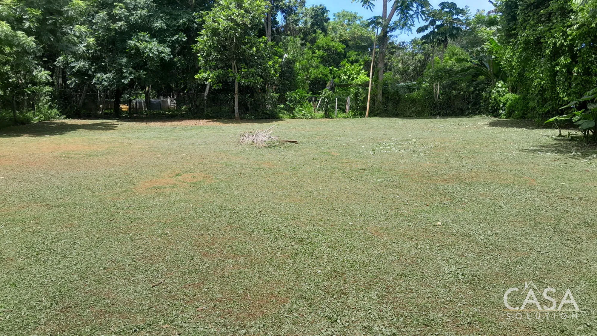 Banana and plantain trees grow on the property, while most of the land remains open and easy to manage.