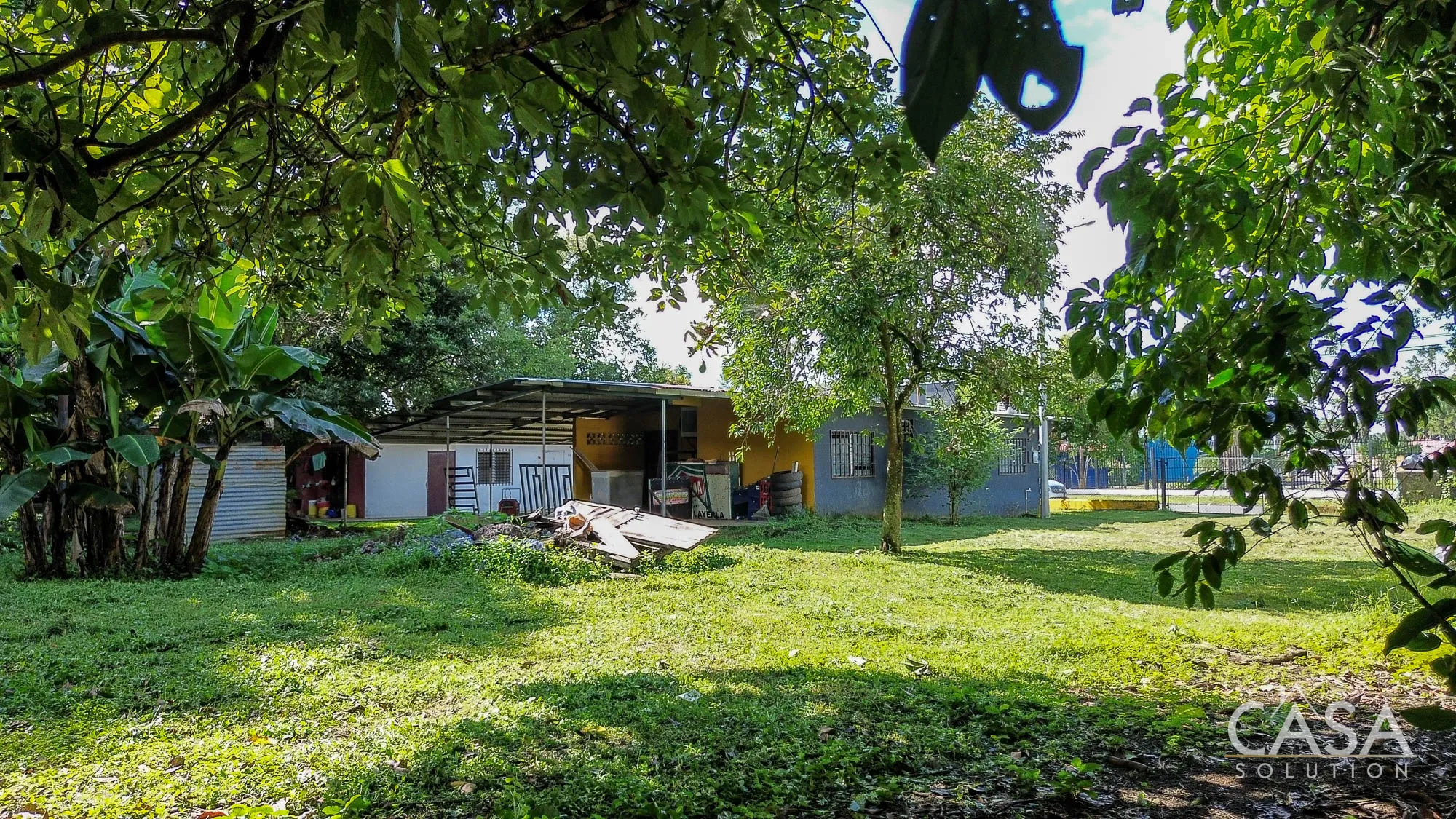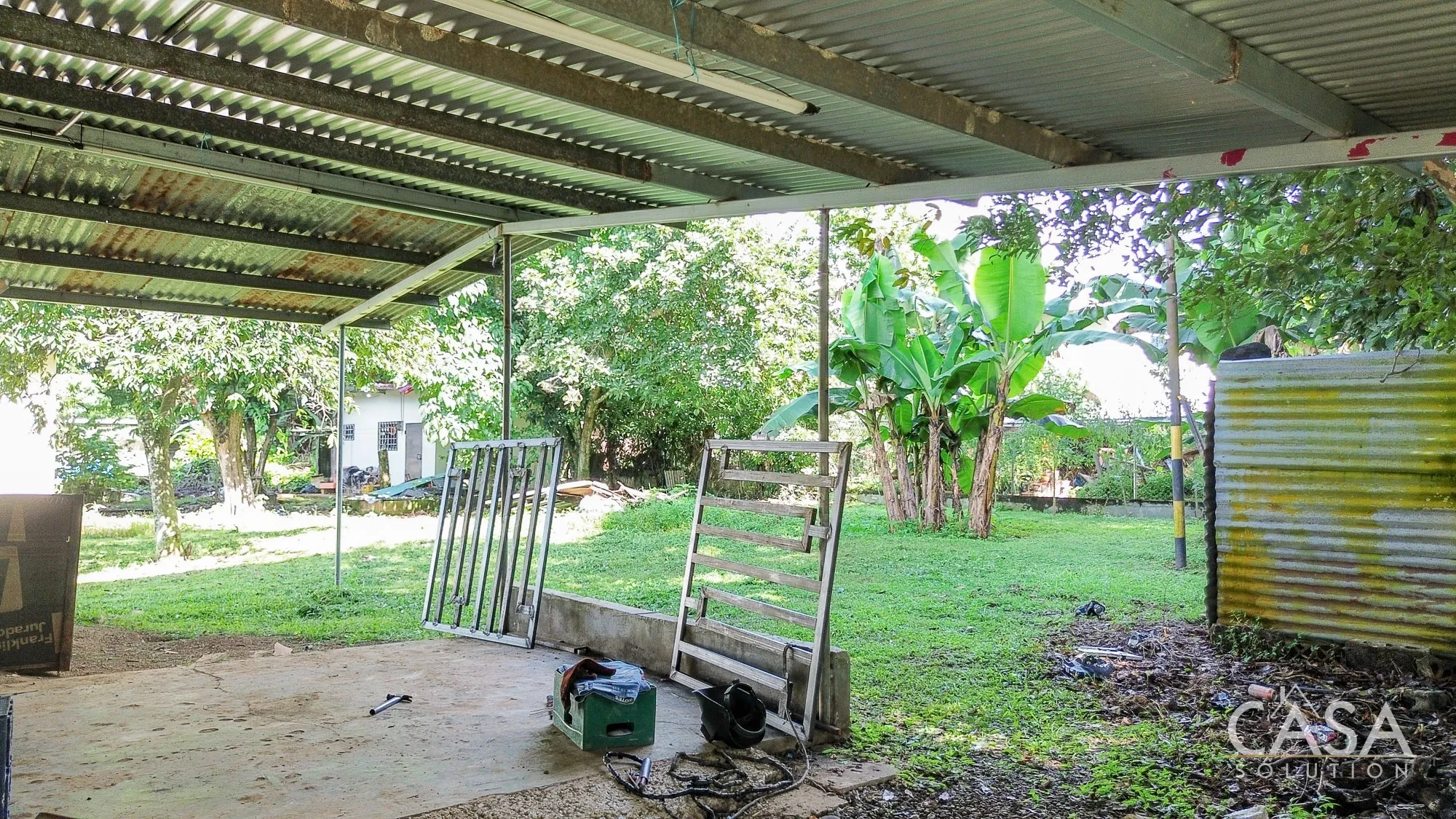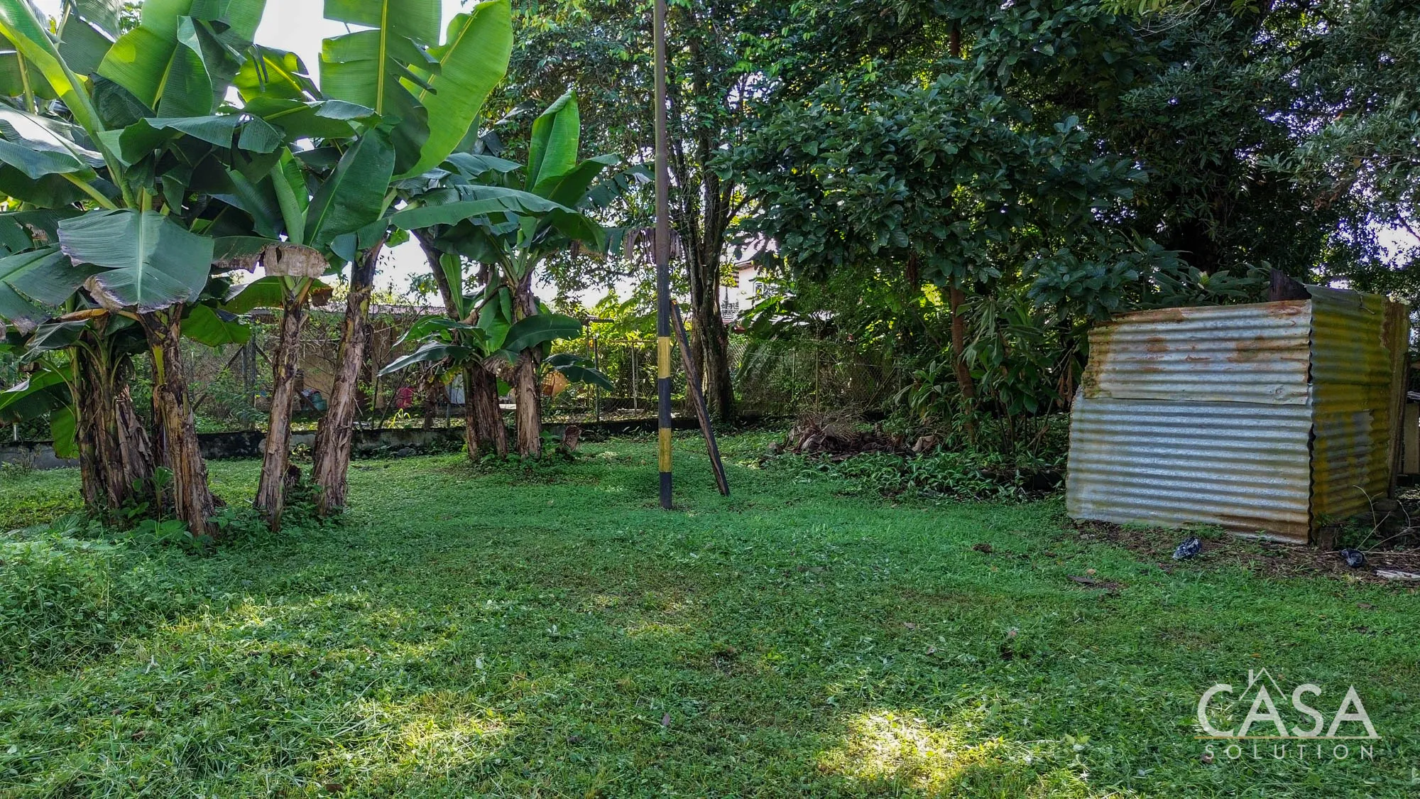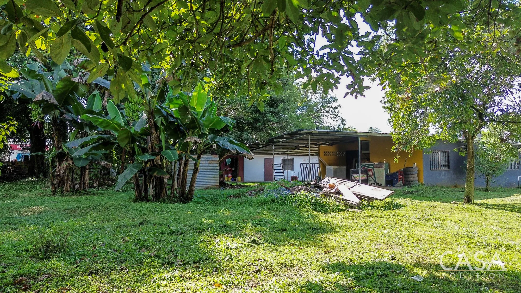 The land is completely flat and has a mix of open yard and mature fruit trees, including mango, banana, and soursop. The topography and layout make the property easy to navigate and suitable for different types of future use. A terrace, garden/patio area, and a water reserve tank are also present on-site.