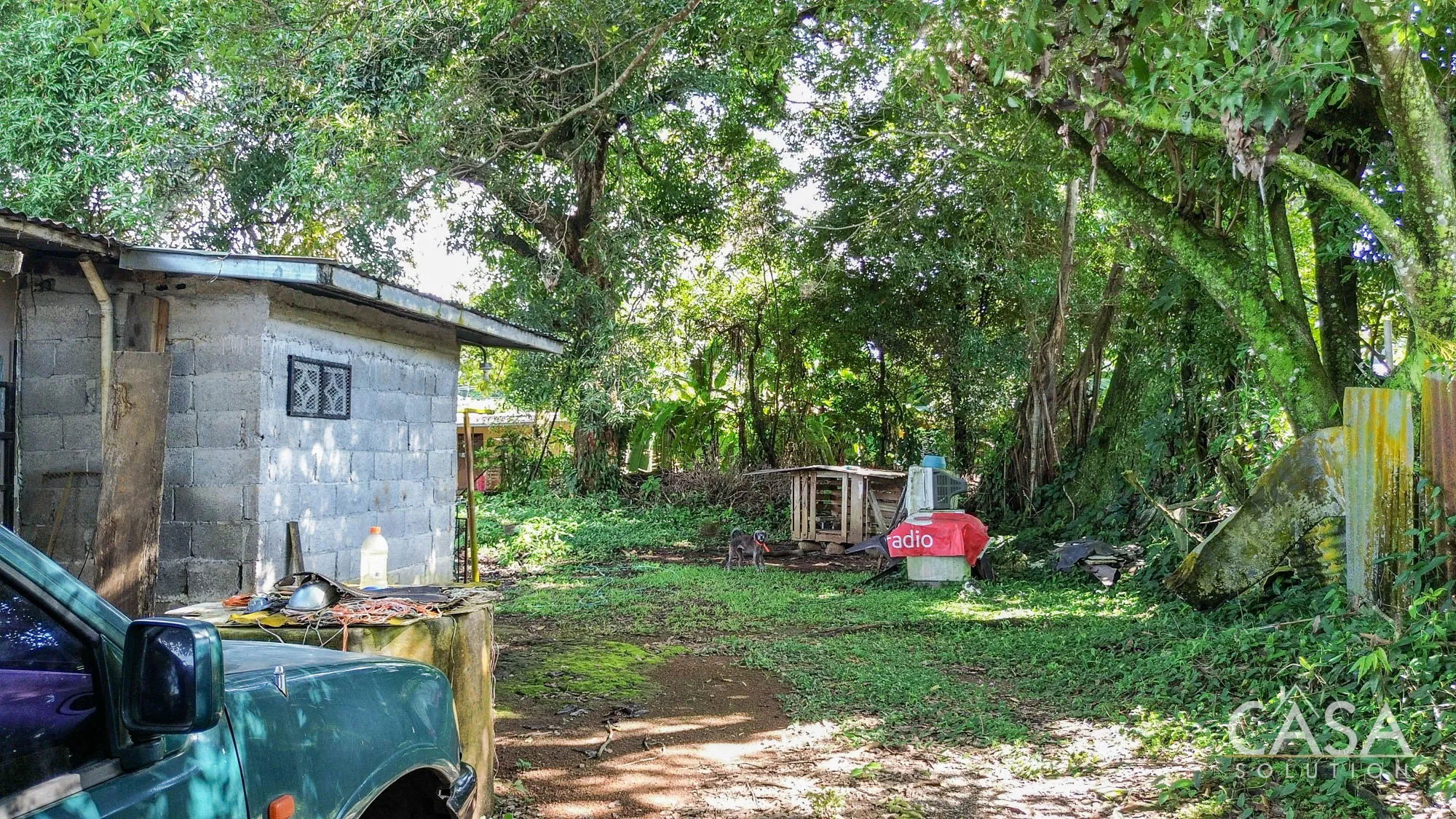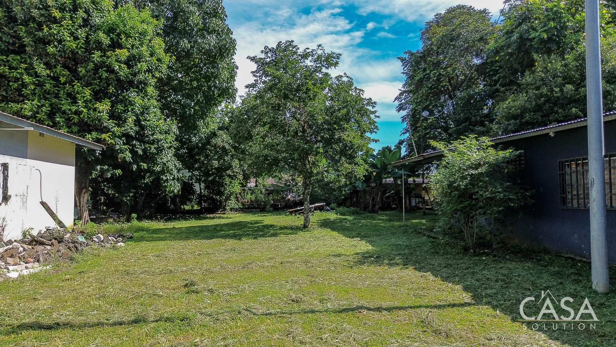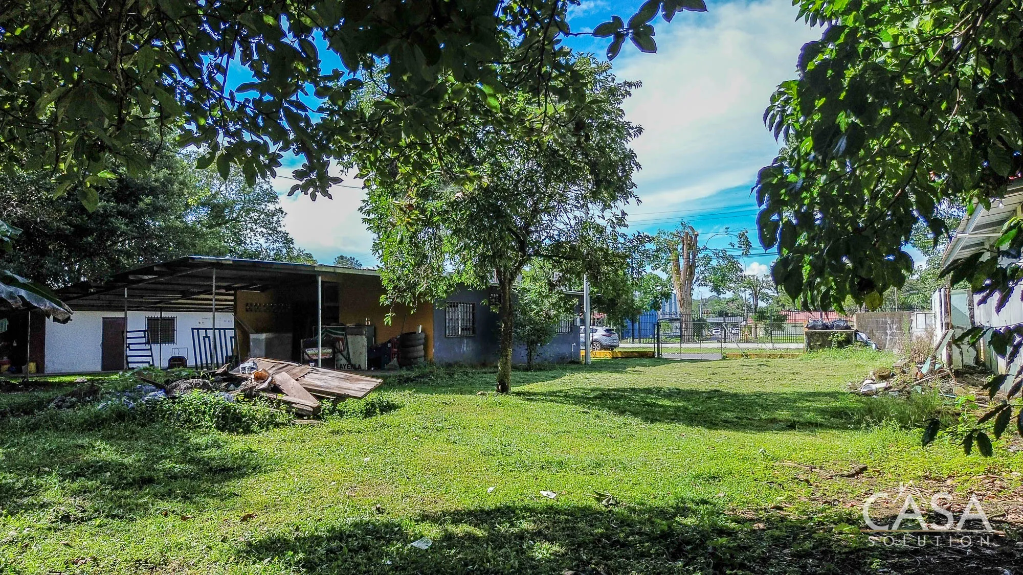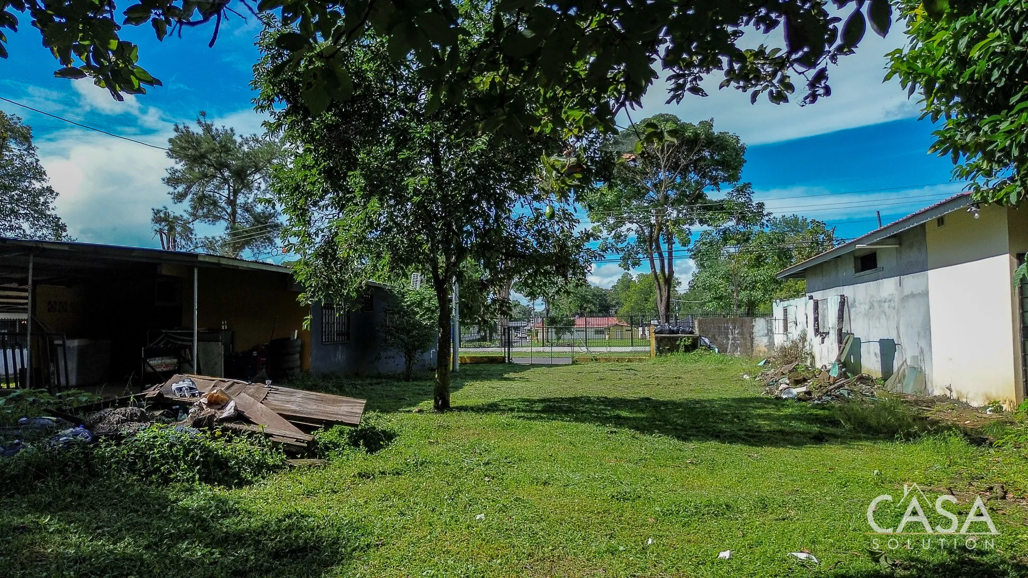 The land is completely flat and has a mix of open yard and mature fruit trees, including mango, banana, and soursop. The topography and layout make the property easy to navigate and suitable for different types of future use. A terrace, garden/patio area, and a water reserve tank are also present on-site.