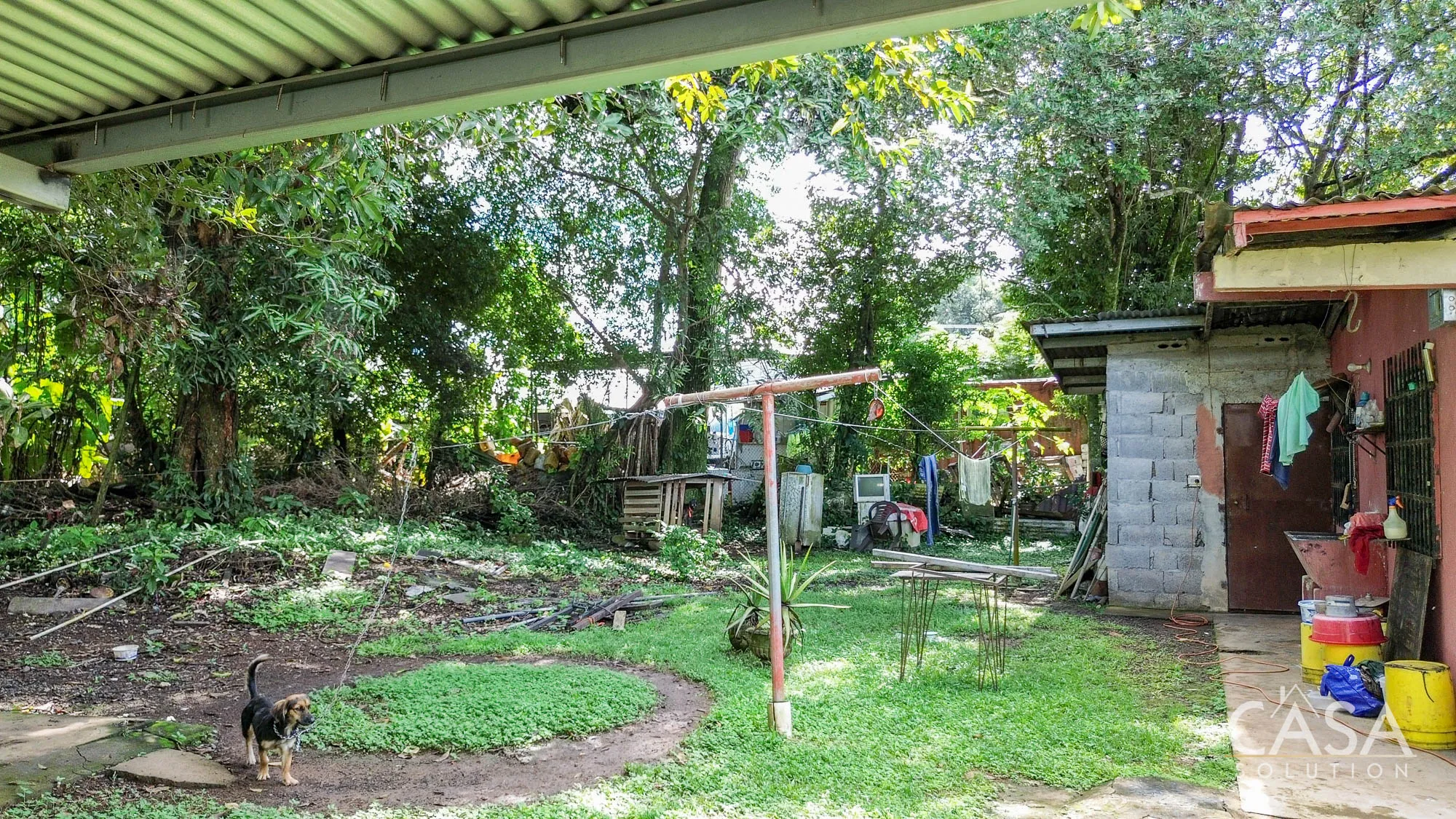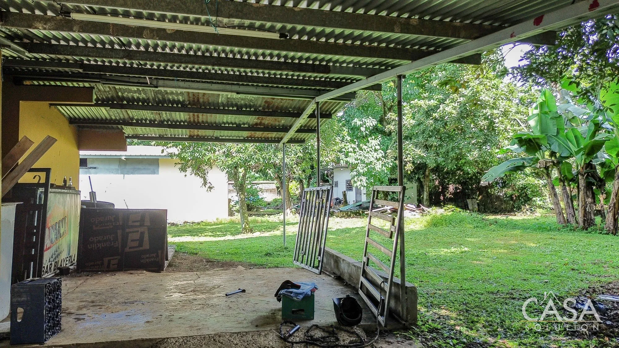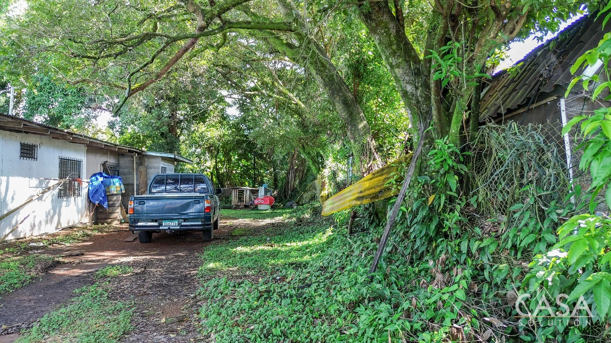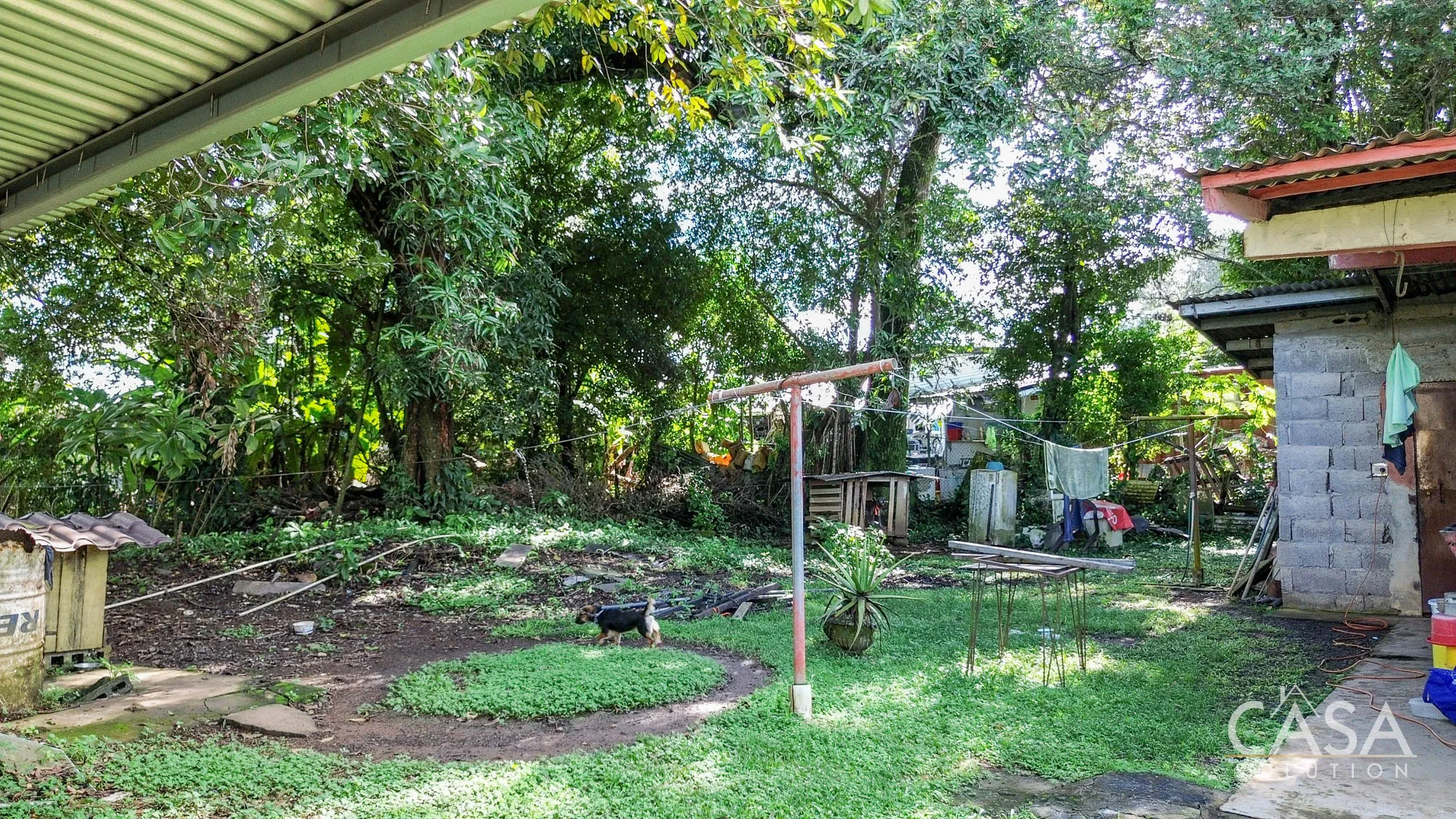 The land is completely flat and has a mix of open yard and mature fruit trees, including mango, banana, and soursop. The topography and layout make the property easy to navigate and suitable for different types of future use. A terrace, garden/patio area, and a water reserve tank are also present on-site.