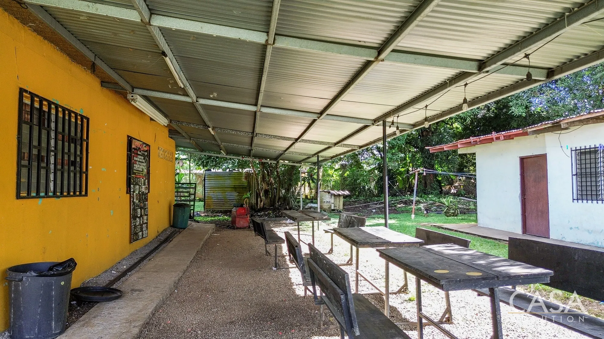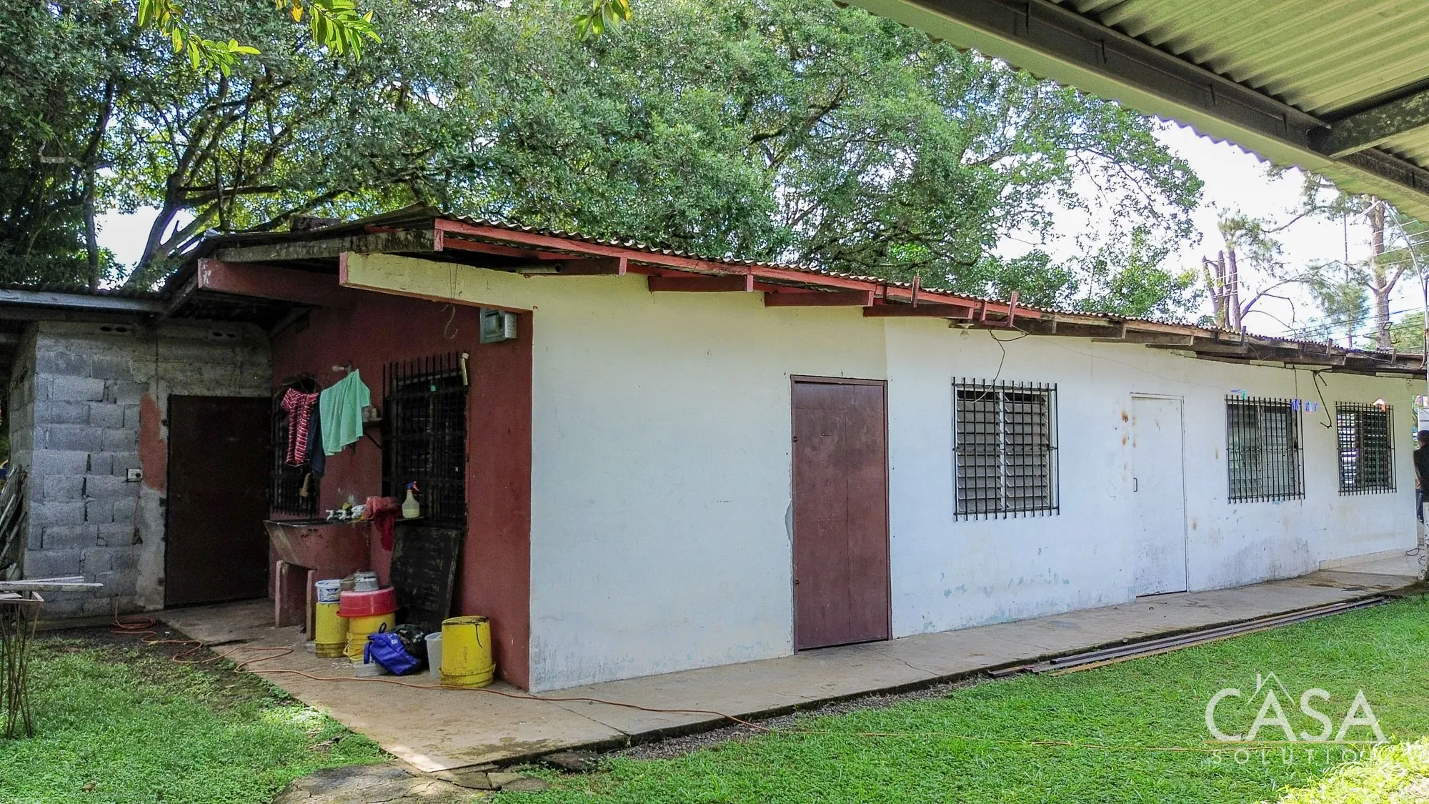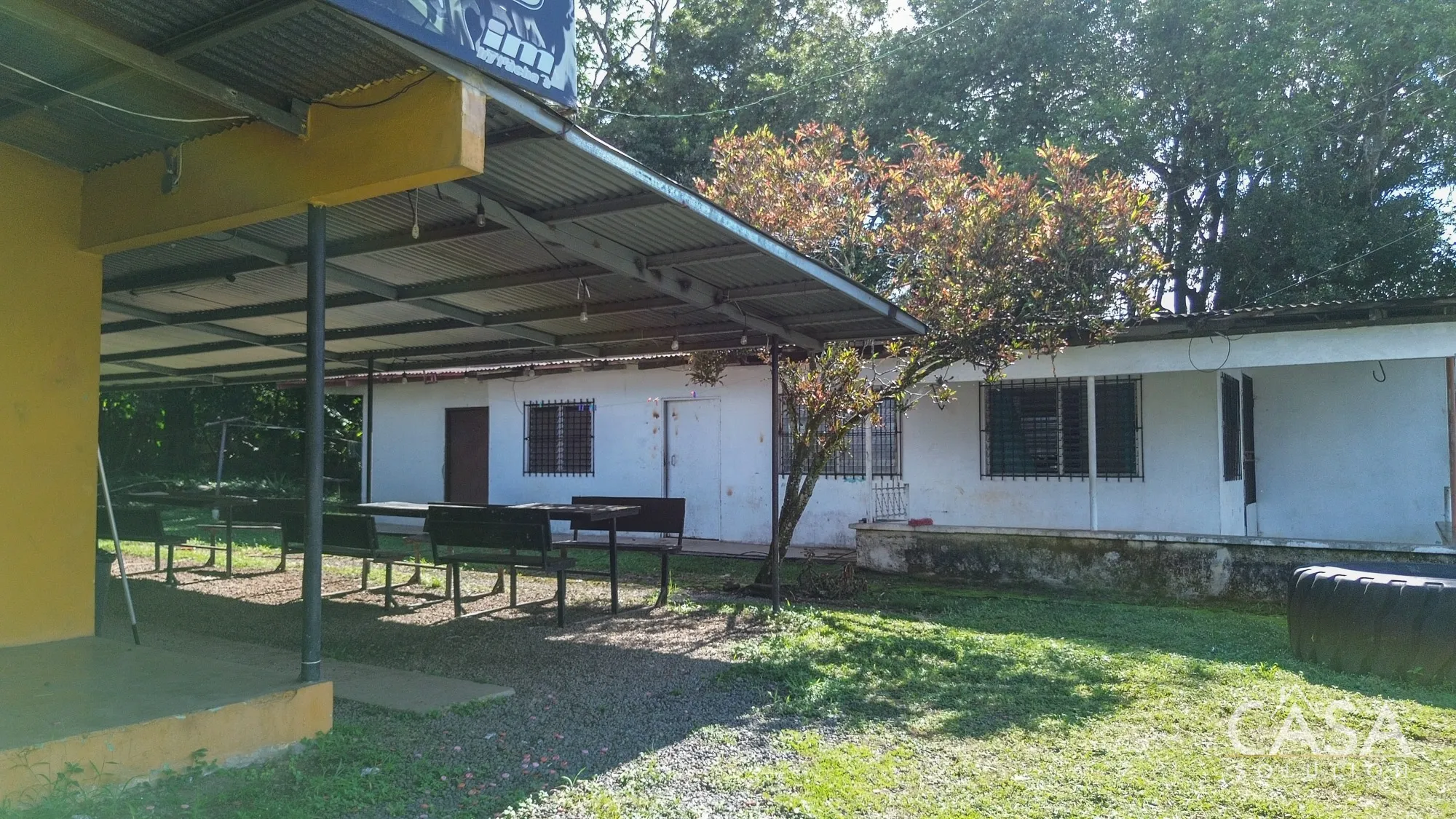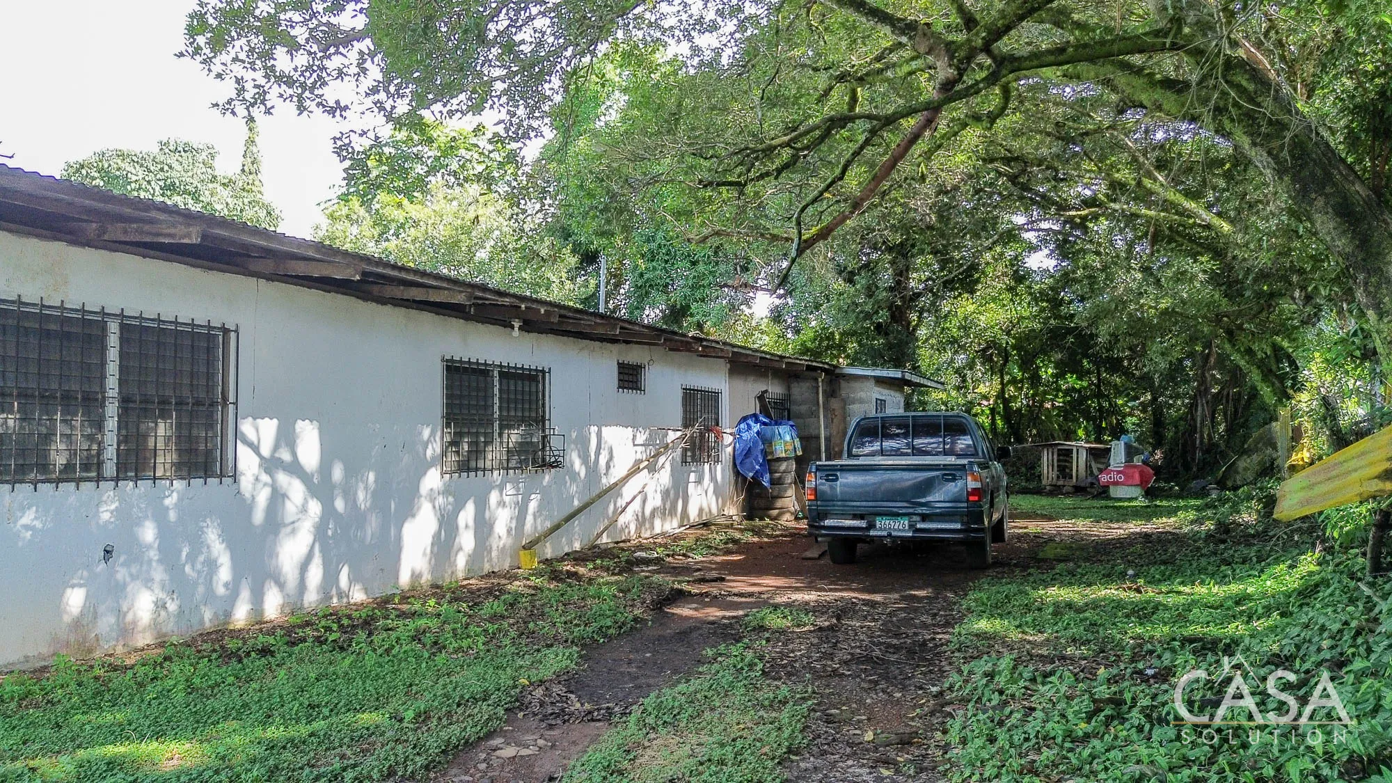 The land is completely flat and has a mix of open yard and mature fruit trees, including mango, banana, and soursop. The topography and layout make the property easy to navigate and suitable for different types of future use. A terrace, garden/patio area, and a water reserve tank are also present on-site.