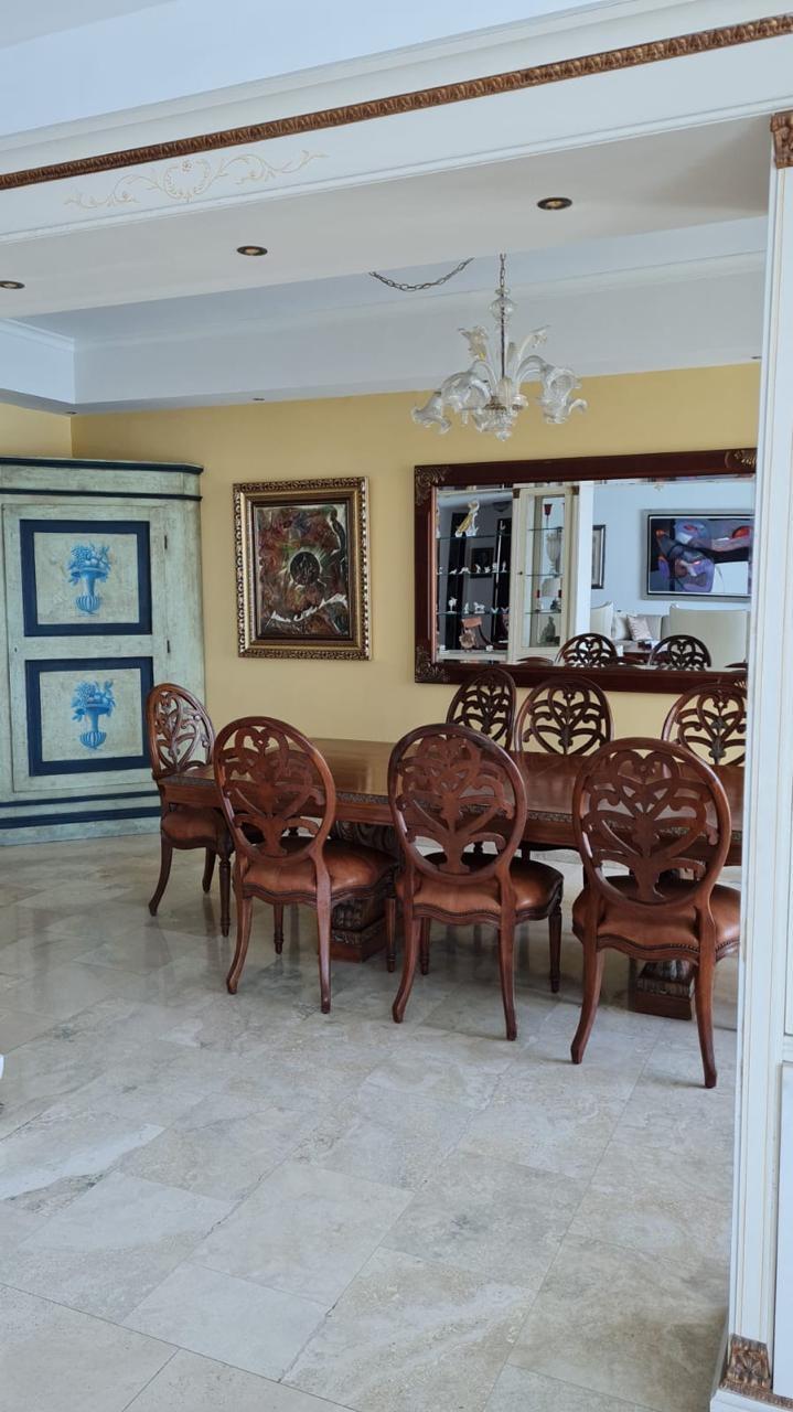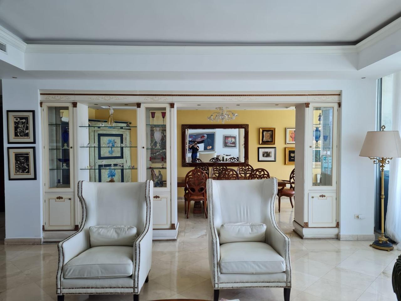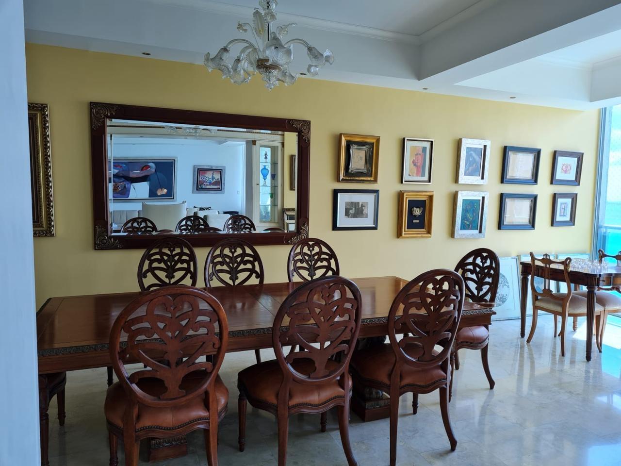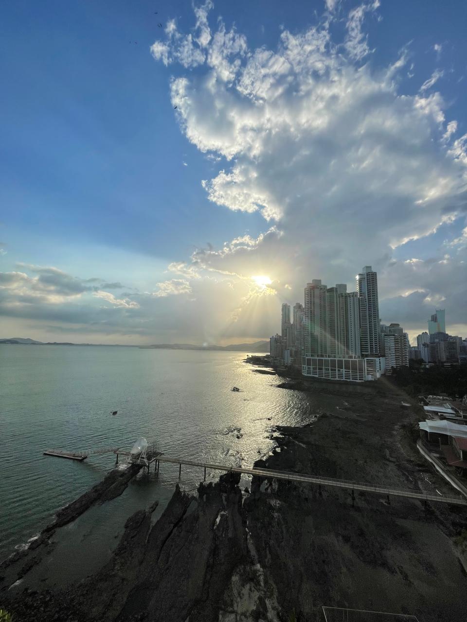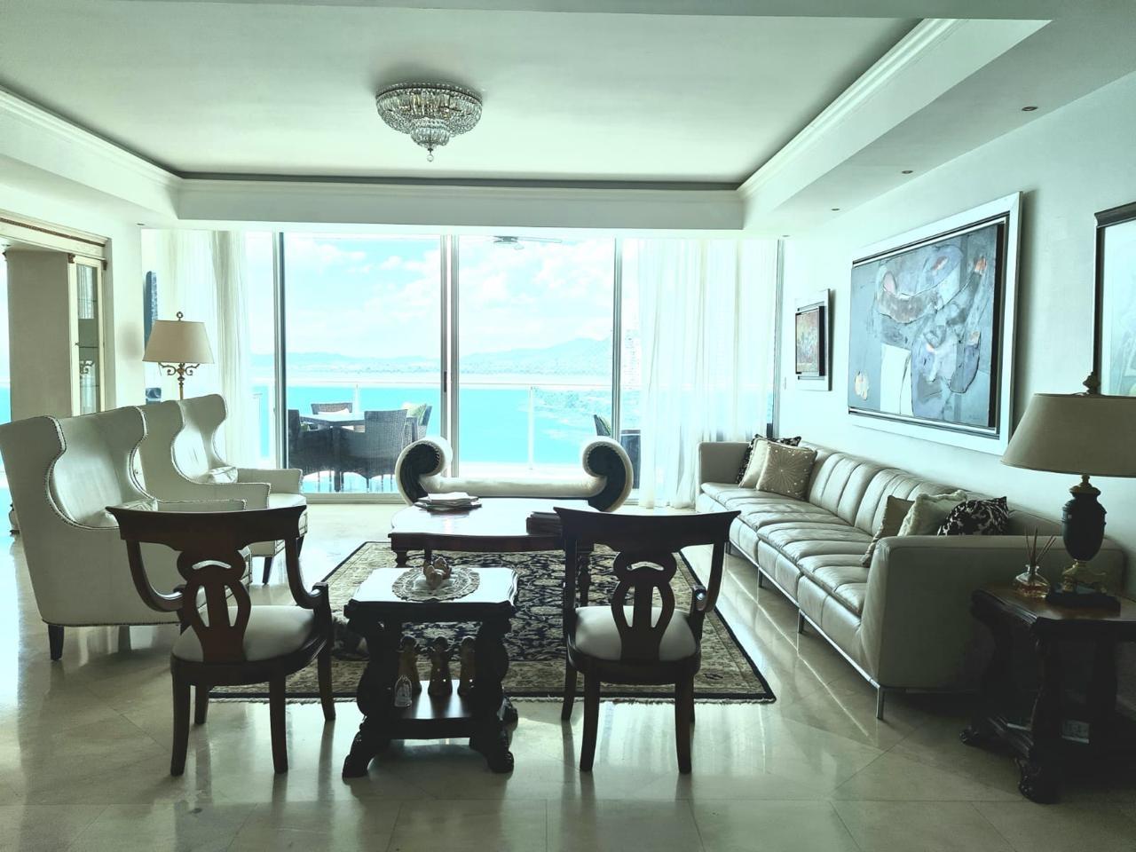 PH AQUAMARE, a luxurious 3-bedroom property with spacious rooms and a terrace offering magnificent views of Panama Bay and the city. This 356 m2 apartment features: 3 bedrooms, 3.5 bathrooms, a den, a large kitchen, a service entrance, a laundry room, a maid's quarters with bathroom, and 5 parking spaces. The building offers an elegant lobby, concierge service, an oceanfront infinity pool, a gym, a sauna, and a children's play area. The surrounding area is conveniently located near hospitals, hotels, pharmacies, a shopping mall, and other amenities.