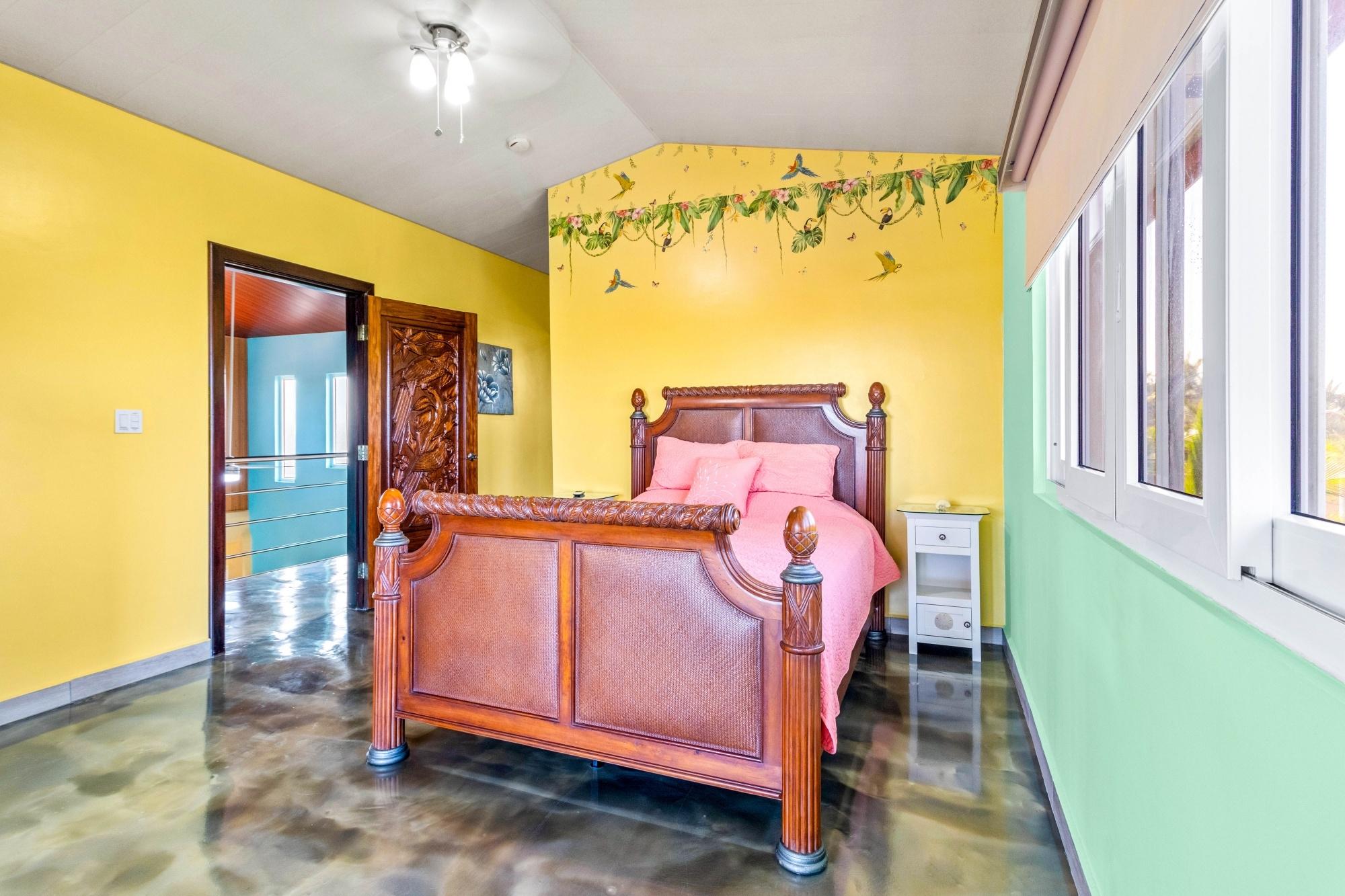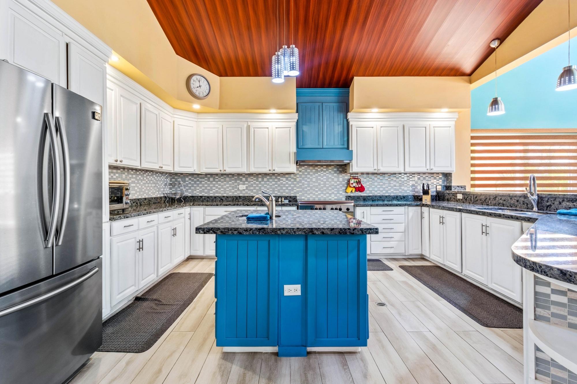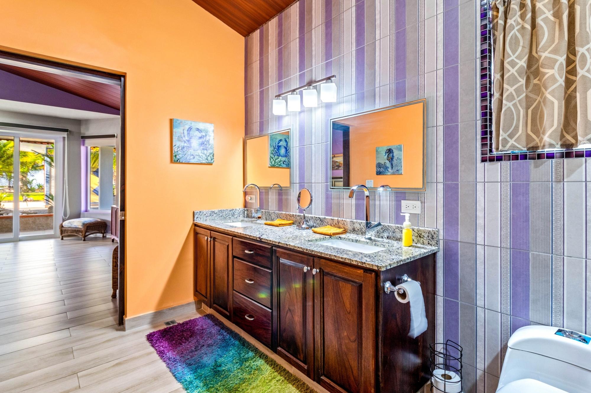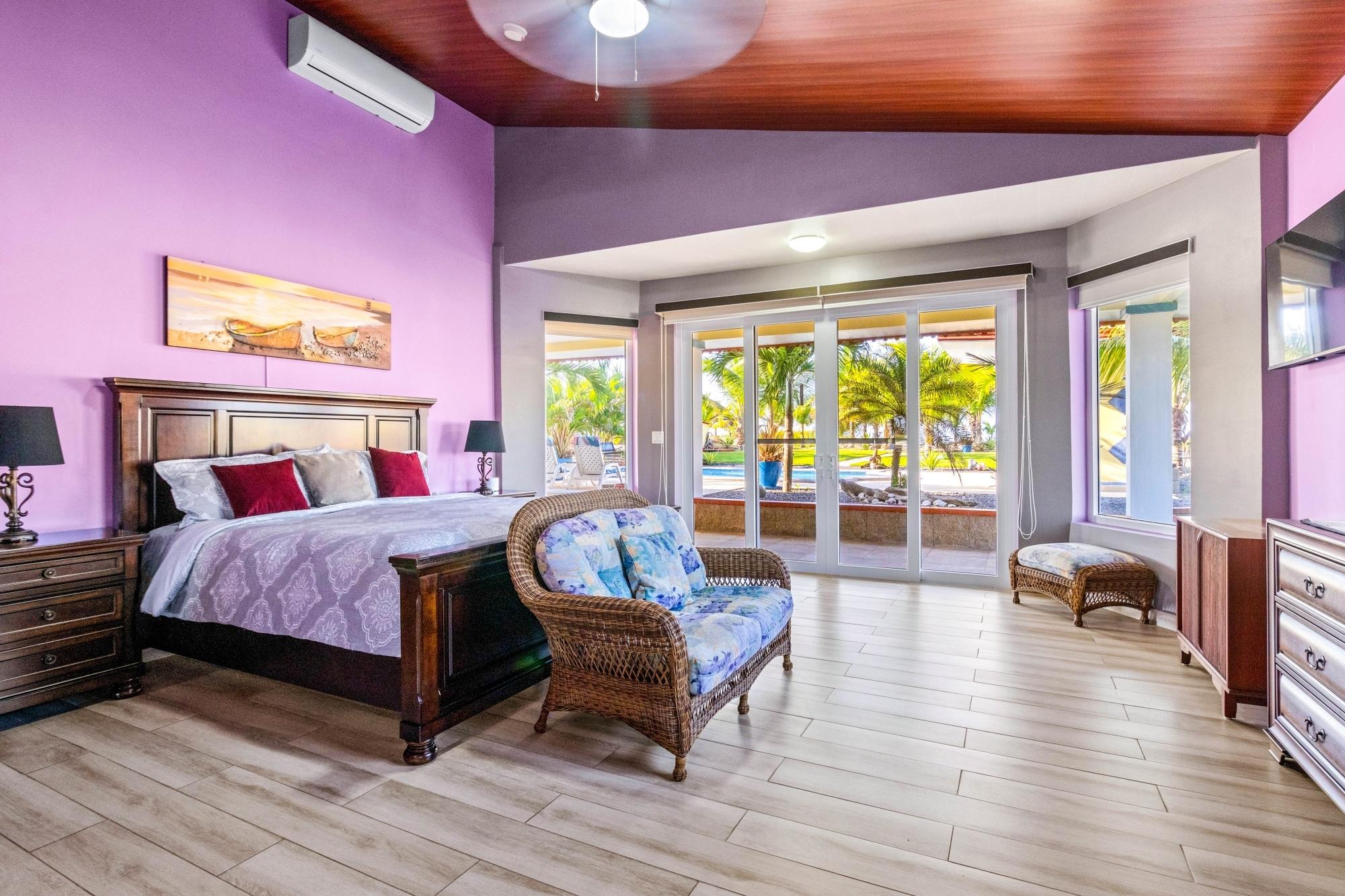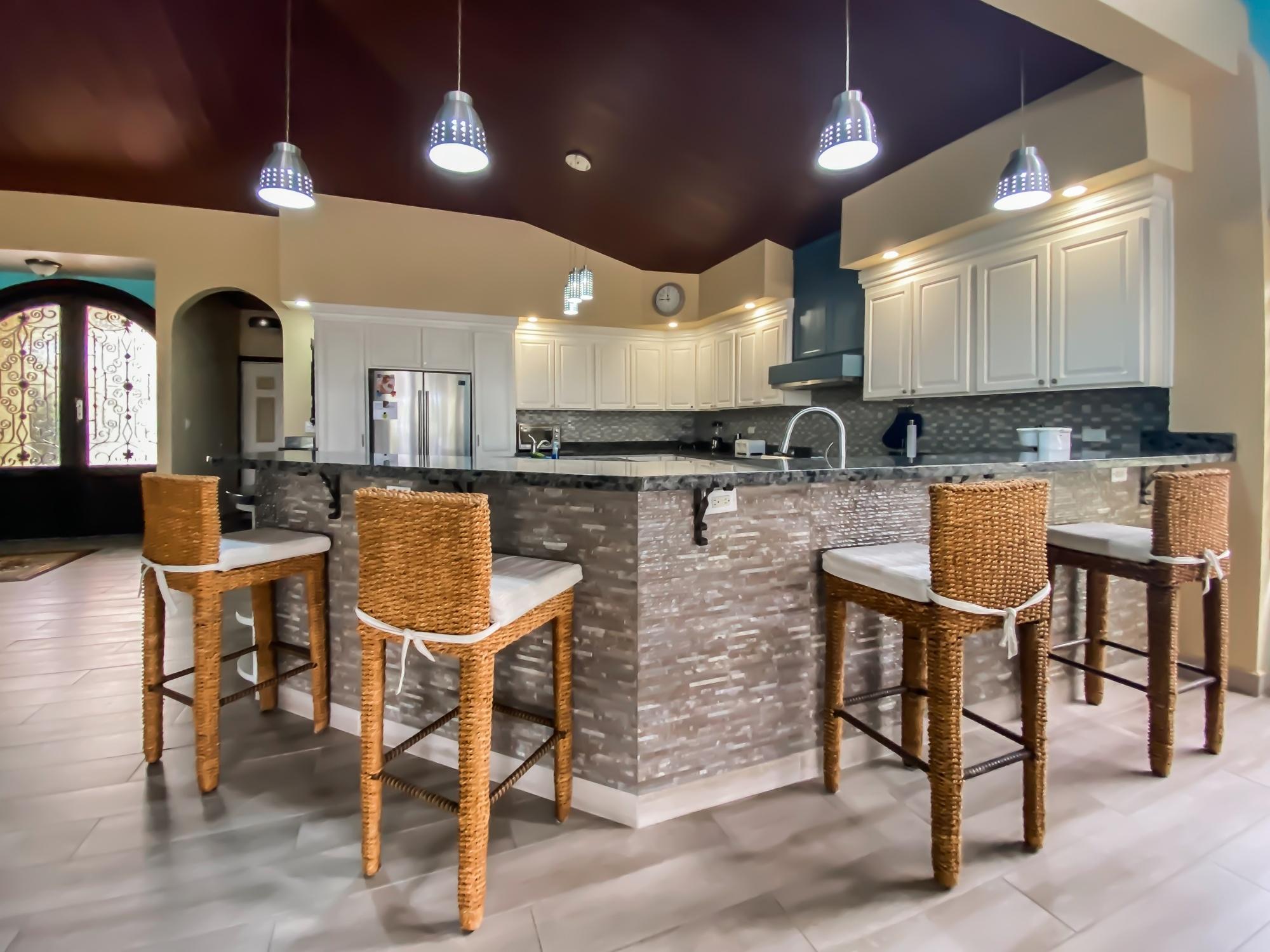 This incredible beach home is on the market for sale. From the minute you see it you know how extraordinary and impressive it is. Right on the Pacific beach of Playa la Barqueta, with a stunning view of both the ocean and the mountain range with Volcan Baru. This home was built in 2017 under the supervision of the owner who made sure everything was done to perfection. No detail over looked. And all top of the line materials, furnishings and appliances. It is a 3 bedroom, 4 bathroom house with open concept kitchen and living area opening to a fantastic patio and pool area taking you down to the beach. This home has Porcelain tiles throughout, arched hand carved cedar and mahogany doors, german hardware on the window for smooth operation. PVC ceilings and plenty of electrical outlets and very well lite. When you walk through the secure decorative front door you are in awe of this tastefully designed and decorated home. It is modern and comfortable. The kitchen is large with plenty of storage, all made out of cedar, granite counter tops, a centre island with a sink and a large walk in pantry. This home is open concept and perfect for entertaining, with a wet bar and entertainment area. Also on the main floor you will find the sizeable primary bedroom with an ensuite bathroom and walk in closet. The view from this room is amazing and it has sliding doors that allow you to walk out to the patio and pool area. The ensuite bathroom has double sink and granite counters. All the shower stall partitions in this home have cute underwater motifs and installed with massage showers.