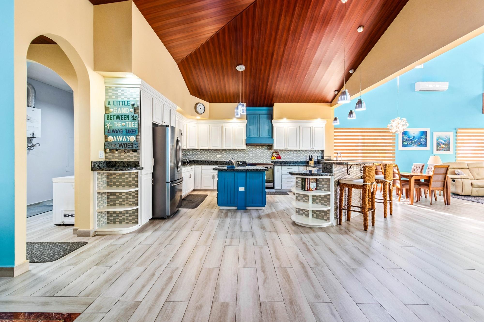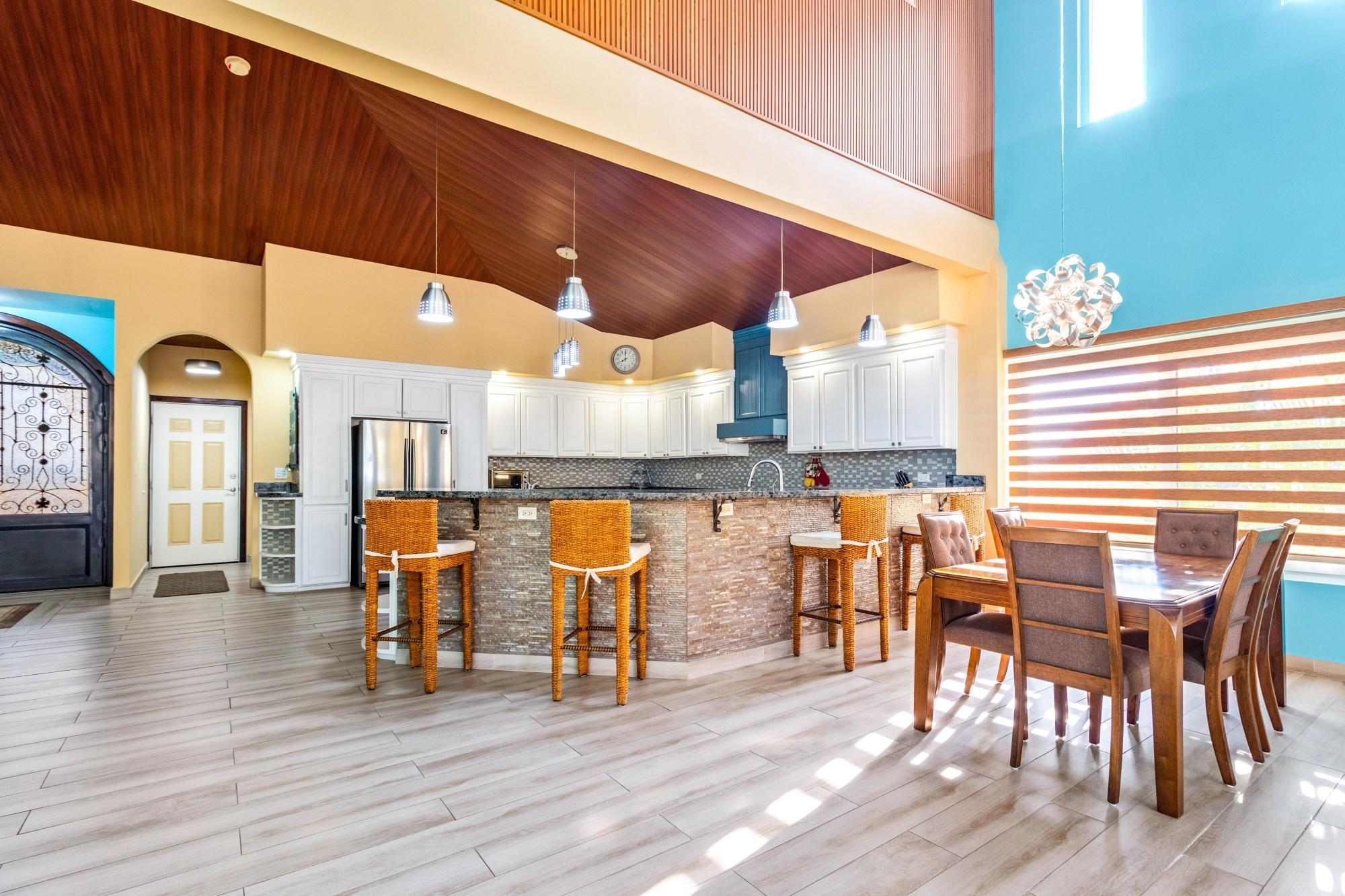 This incredible beach home is on the market for sale. From the minute you see it you know how extraordinary and impressive it is. Right on the Pacific beach of Playa la Barqueta, with a stunning view of both the ocean and the mountain range with Volcan Baru. This home was built in 2017 under the supervision of the owner who made sure everything was done to perfection. No detail over looked. And all top of the line materials, furnishings and appliances. It is a 3 bedroom, 4 bathroom house with open concept kitchen and living area opening to a fantastic patio and pool area taking you down to the beach. This home has Porcelain tiles throughout, arched hand carved cedar and mahogany doors, german hardware on the window for smooth operation. PVC ceilings and plenty of electrical outlets and very well lite. When you walk through the secure decorative front door you are in awe of this tastefully designed and decorated home. It is modern and comfortable. The kitchen is large with plenty of storage, all made out of cedar, granite counter tops, a centre island with a sink and a large walk in pantry. This home is open concept and perfect for entertaining, with a wet bar and entertainment area. Also on the main floor you will find the sizeable primary bedroom with an ensuite bathroom and walk in closet. The view from this room is amazing and it has sliding doors that allow you to walk out to the patio and pool area. The ensuite bathroom has double sink and granite counters. All the shower stall partitions in this home have cute underwater motifs and installed with massage showers.