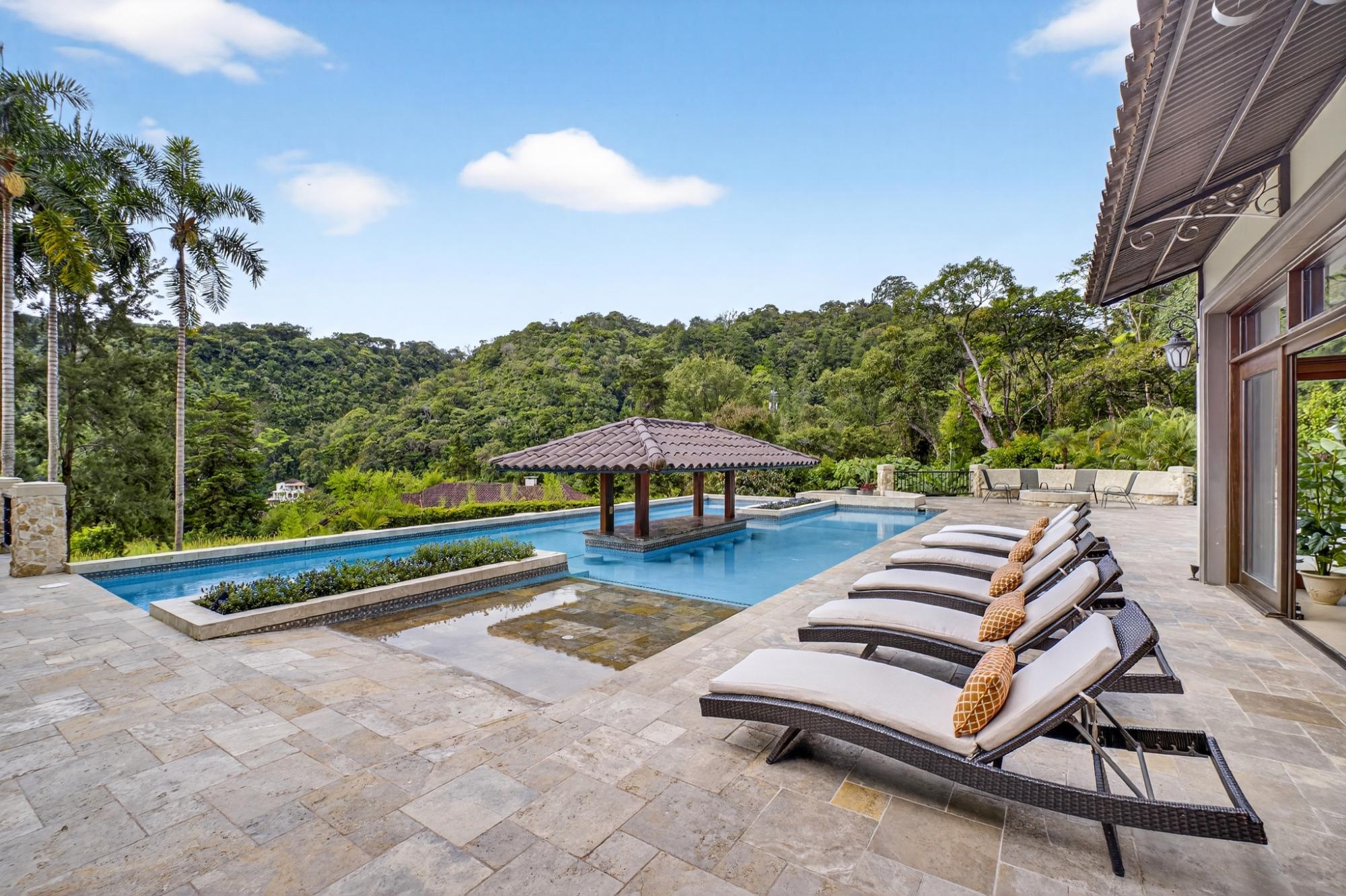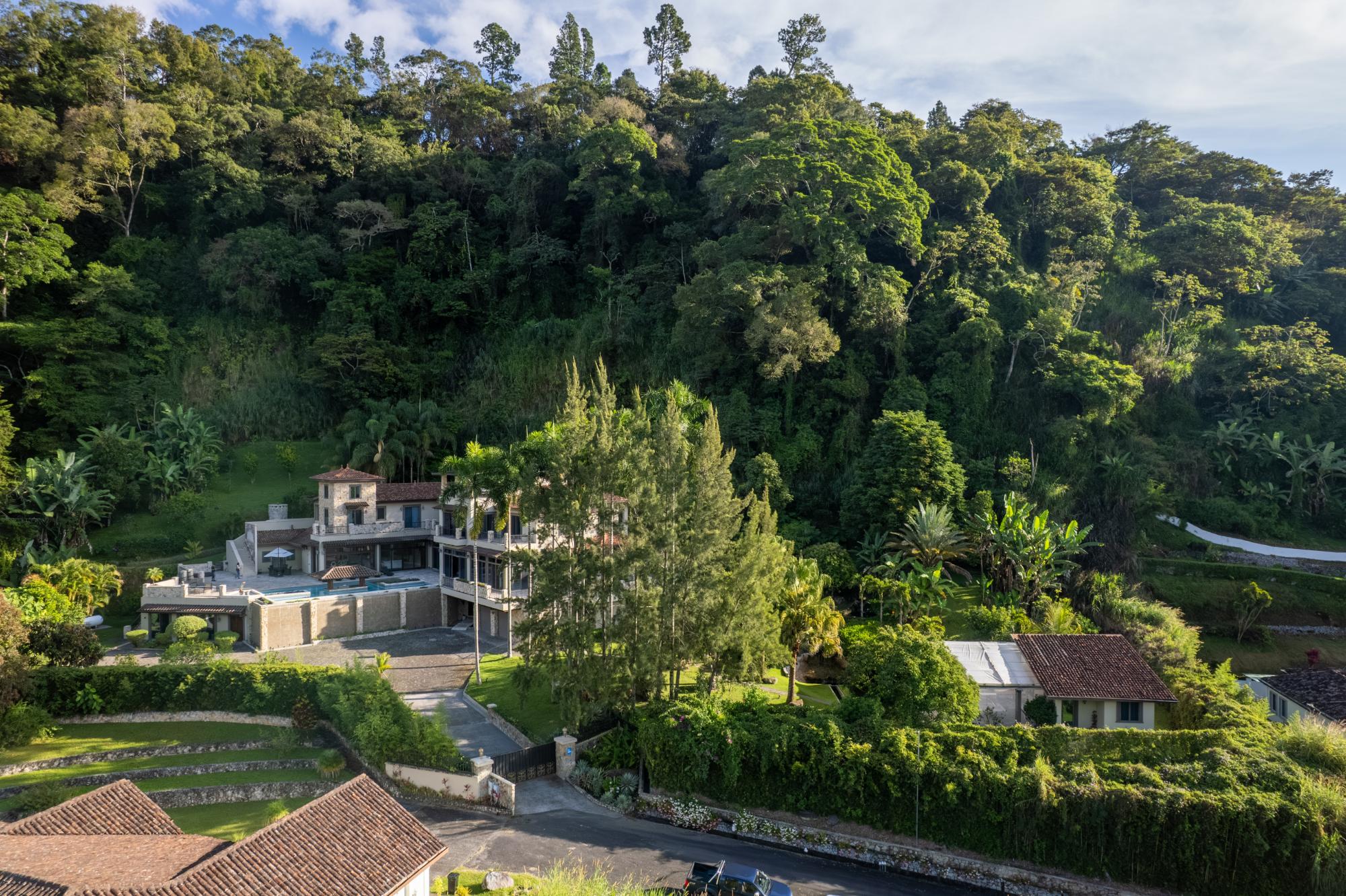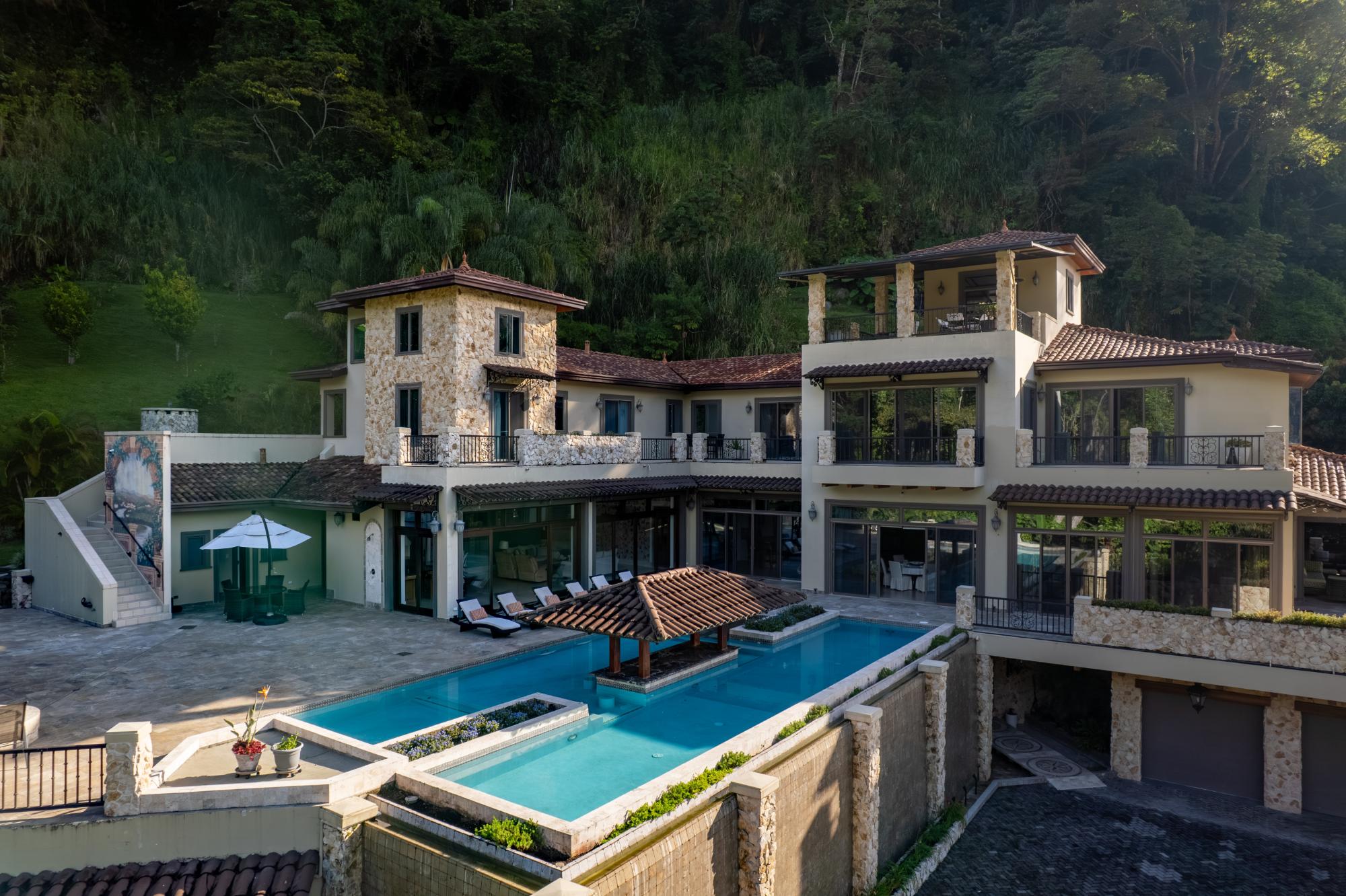 One of a kind luxurious mansion in Valle Escondido Boquete is positioned at the highest point of the valley set against mountainside. This private Estate home offers the perfect luxury and comfortable single family or corporate retreat experience with plenty of space for privacy. Enjoy comfortable year round temperatures in this unique mansion while viewing the sunset from a private balcony of the 4th level terrace and during summer time feel free to swim in it's amazing private infinity swimming pool. This unique Estate comes fully furnished with 7 bedrooms, of which 3 are Master Suites accompanied by 9 full bathrooms & 2 half-baths. A built in elevator provides easy access to all 4 stories. Host your guests in any of the 3 on site guest houses.The estate is equipped with full time, triple gate security and camera system that will provide high end security. Step out onto one of the many endless balconies and view the lush forest and enjoy the tranquility with your friends and family while admiring its luxurious architecture design and enjoy one of the 2 outdoor fireplaces while taking in the panoramic mountain scenery. Within Valle Escondido, you can experience all there is to offer including amenities such as a golf course, tennis courts and mini golf, a hair salon, spa & wellness center, country