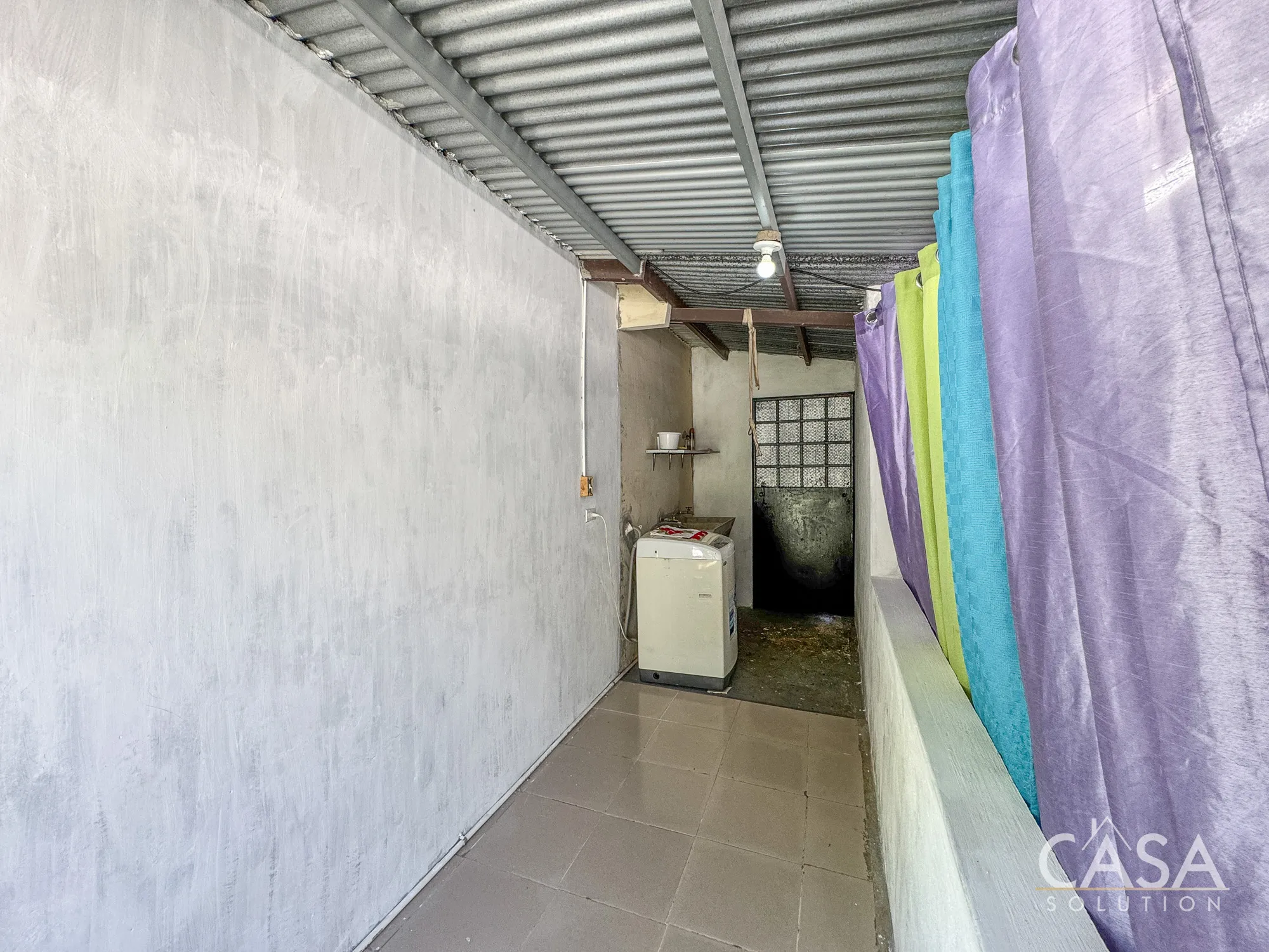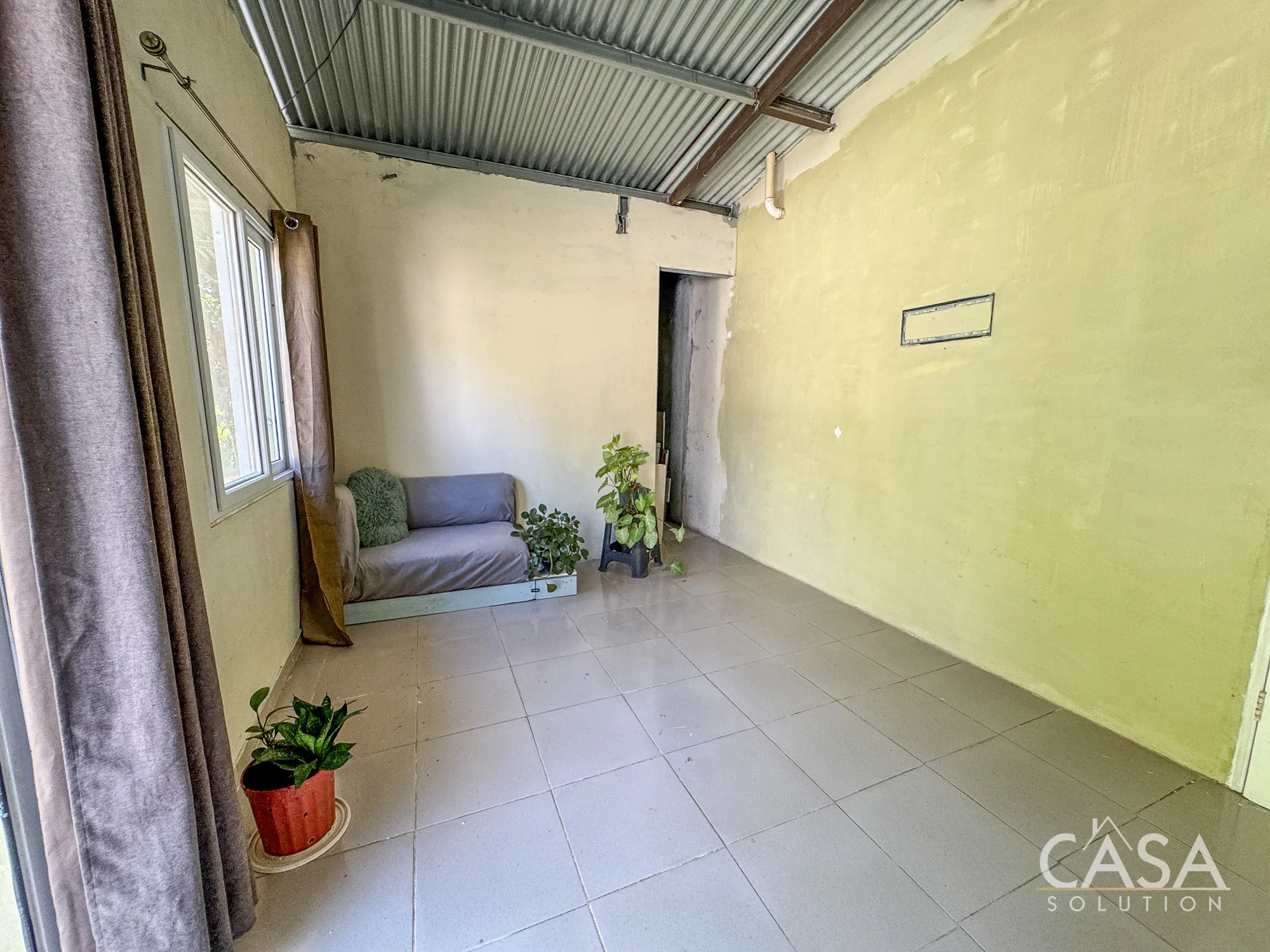 At the front, there is a section that has been adapted for commercial use, with a counter opening and wall décor. This setup could serve as a small shop, snack area, or service business, while maintaining the rest of the house for residential purposes.