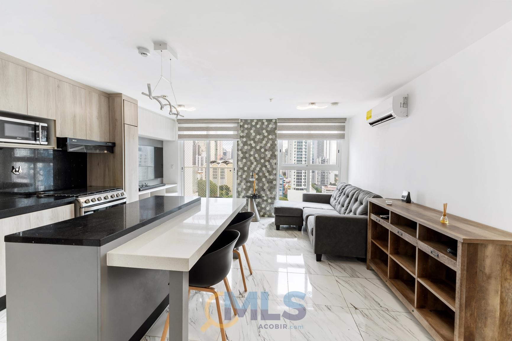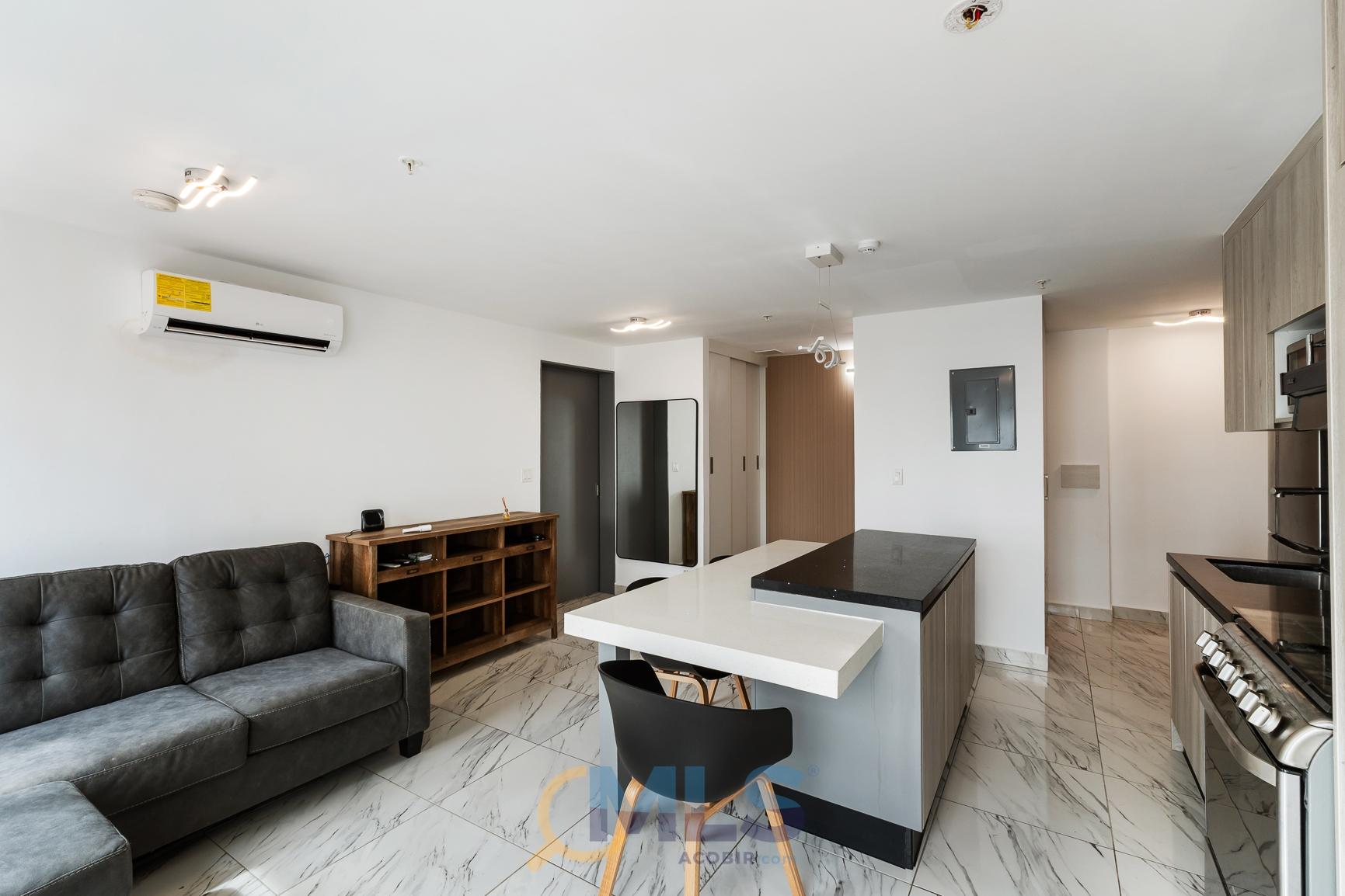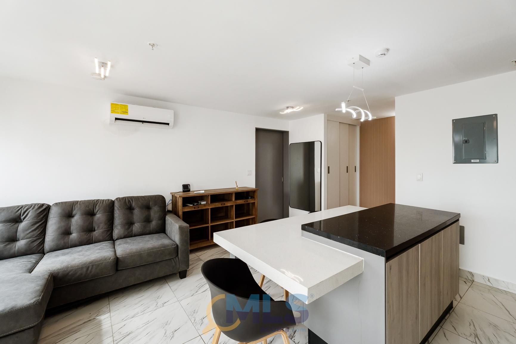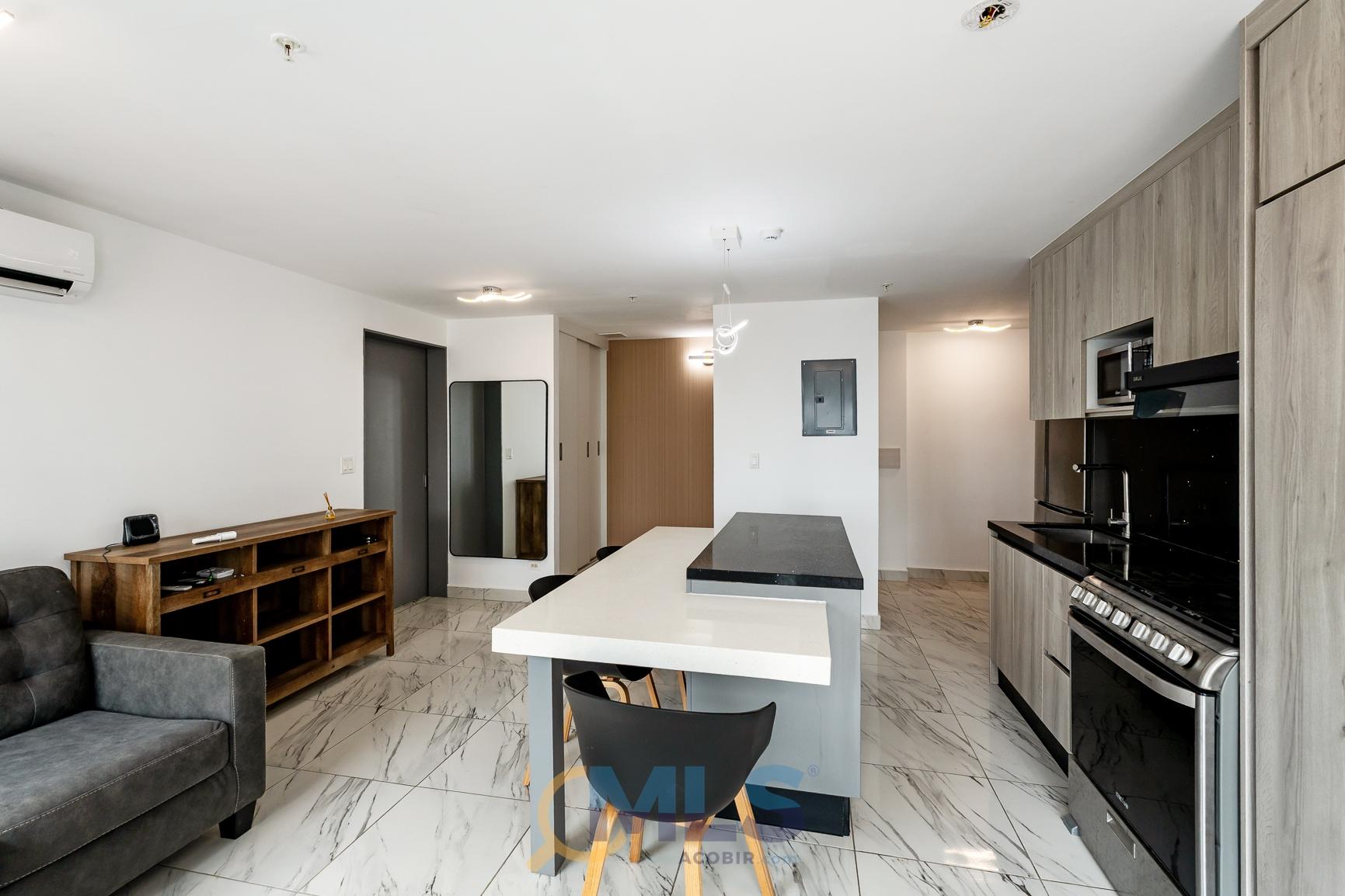 1-bedroom apartment, fully furnished and remodeled, strategically located in Bella Vista, close to metro stations, hospitals, and with easy access to major avenues and point of interest. It features 59 m2 of living space, with one bedroom with two closets and a private bathroom. The living/dining room has a balcony, and the kitchen is integrated with an island that doubles as a dining area. There is also a linen closet, a small office space, and a laundry closet. One parking space is included in the shared pool (not assigned). The PH El Botánico building in Bella Vista, built in 2022, offers a social area with a swimming pool, a co-working space, a children's playground, a BBQ area, and an indoor pet area.