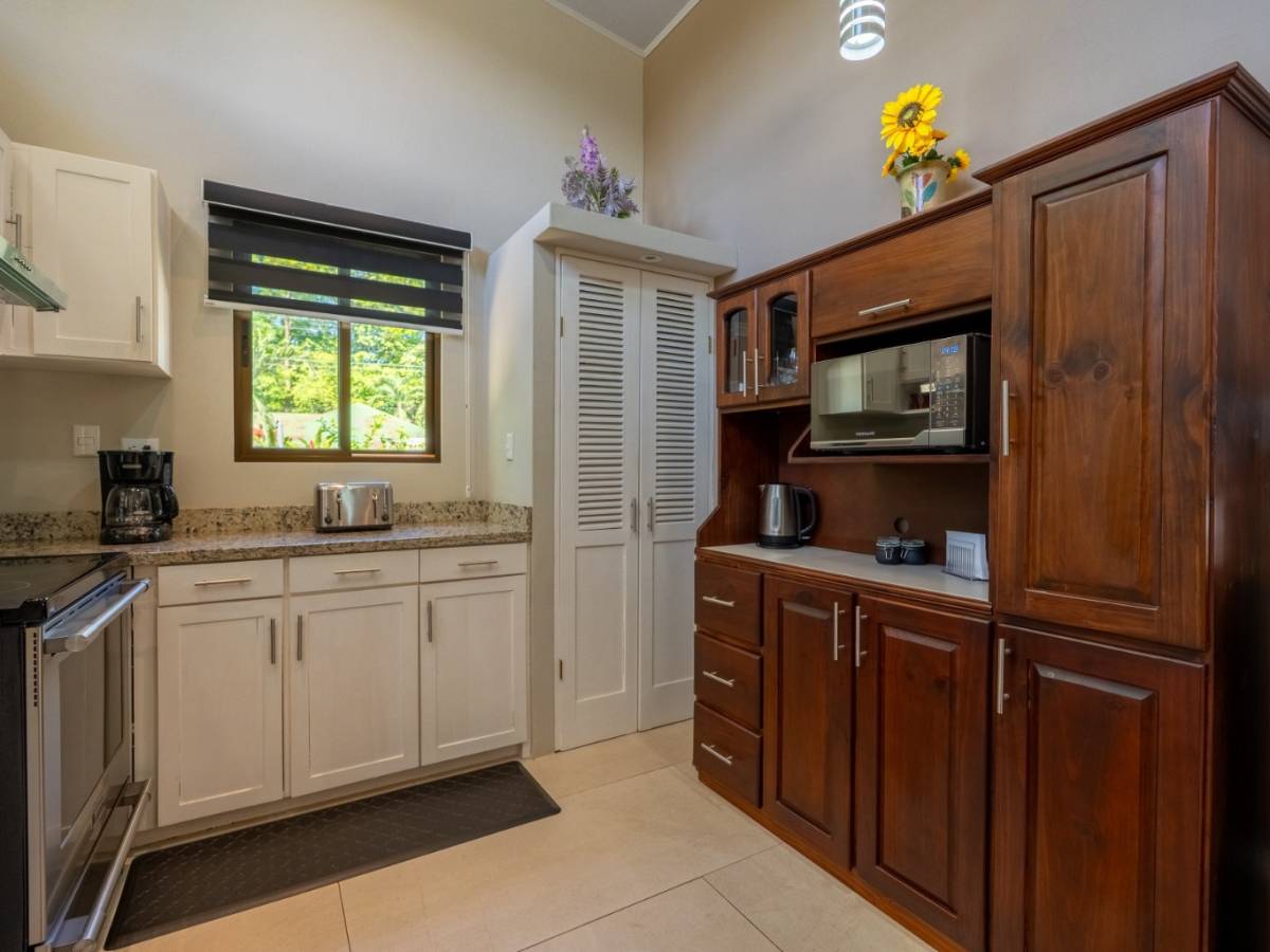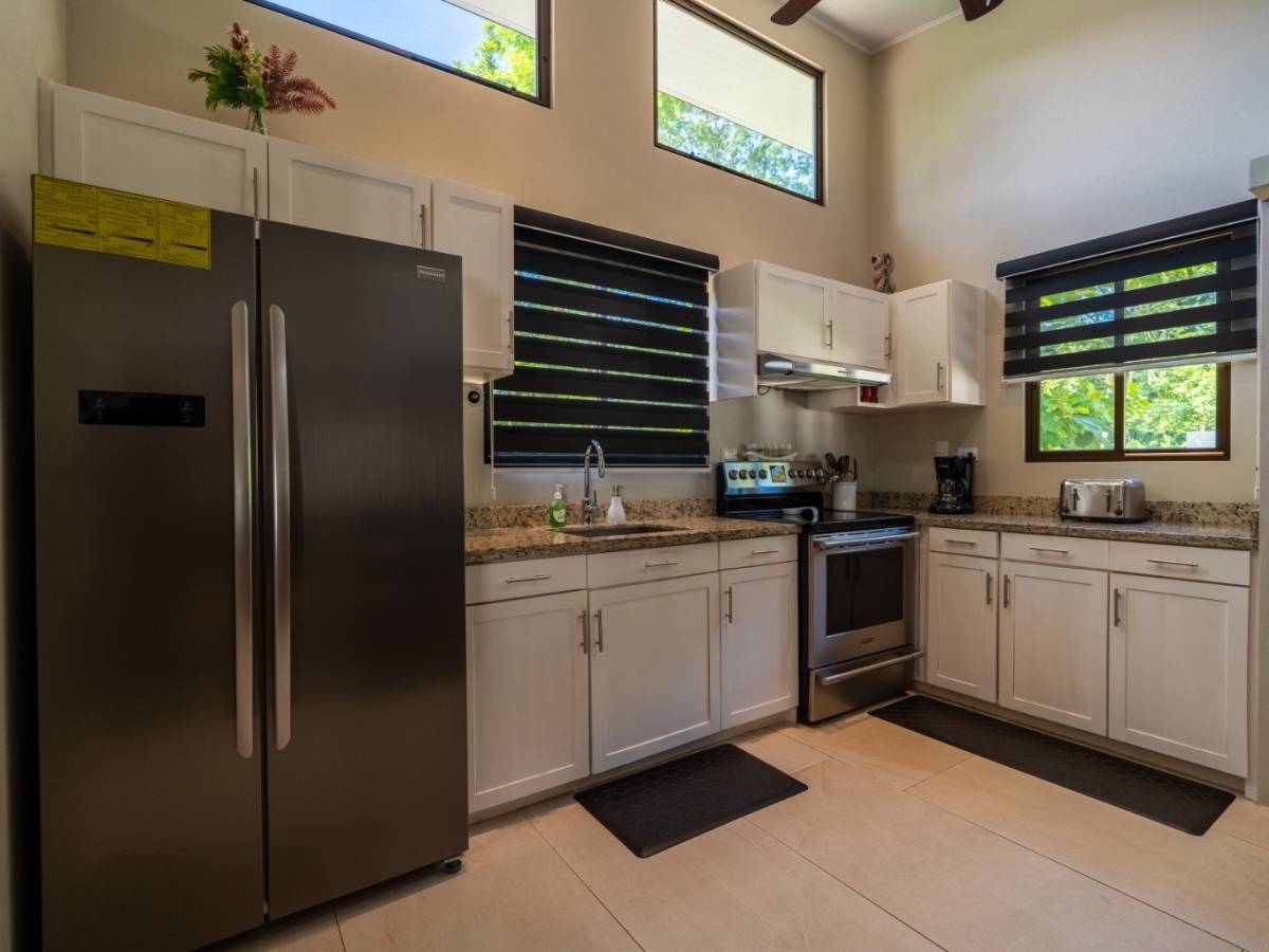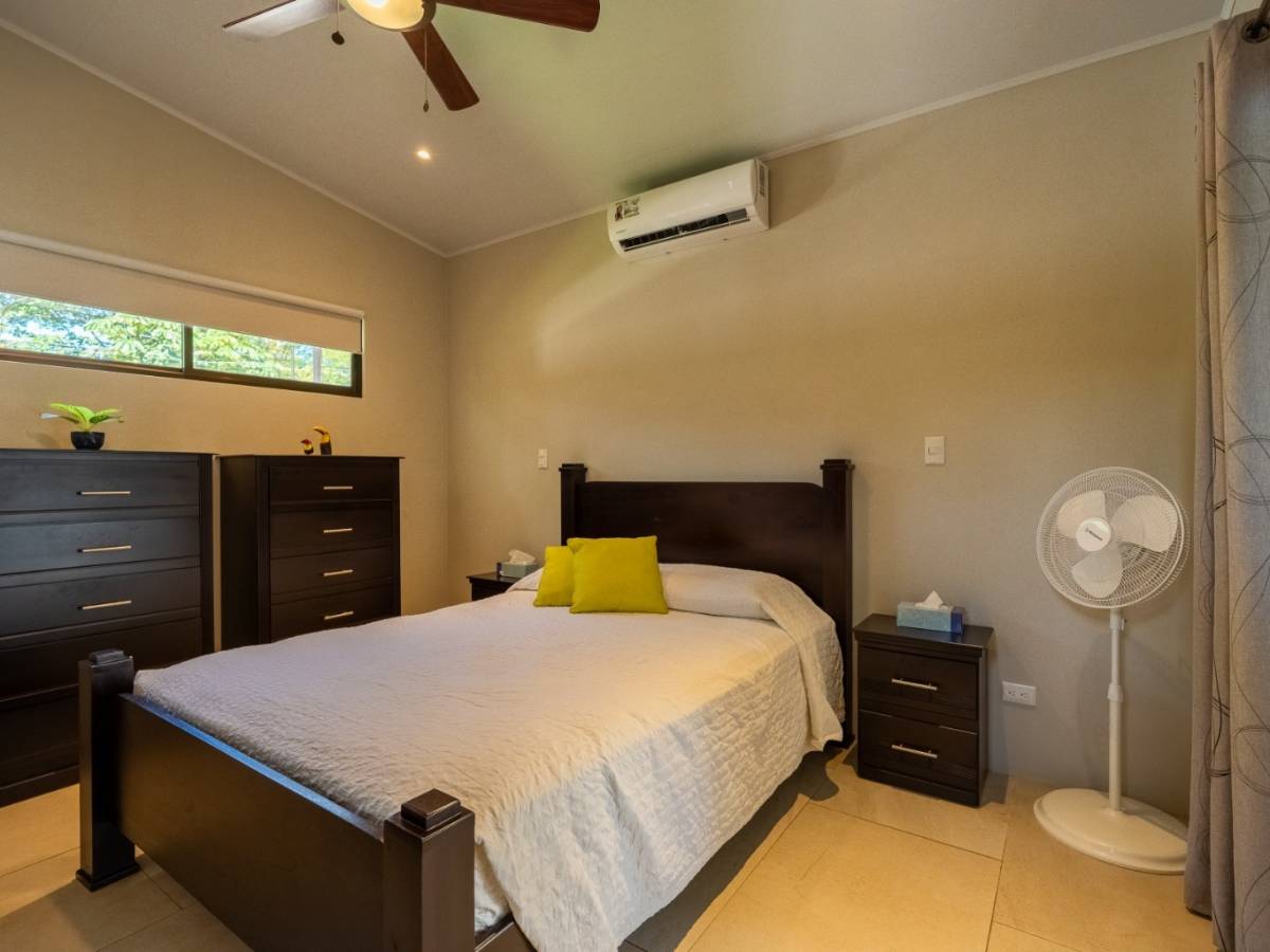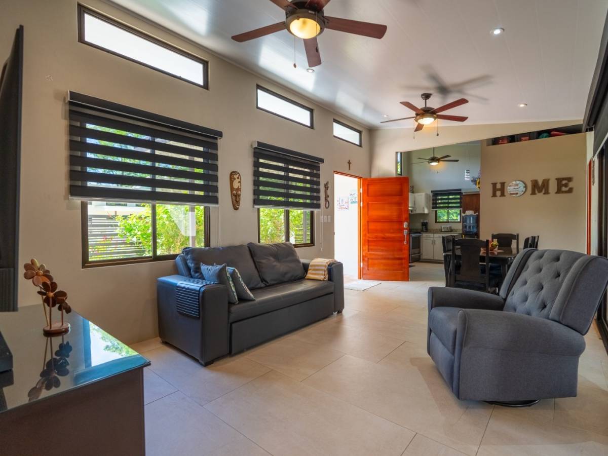 The home features 2 bedrooms, 2 full bathrooms, a spacious modern kitchen, a bright and open living area, a private swimming pool, and a well-kept front garden and ample on-site parking space for up to four vehicles. Large windows ensure excellent natural lighting and airflow. There is also space available to build a guest house, adding significant value for those seeking a real estate investment in Uvita.