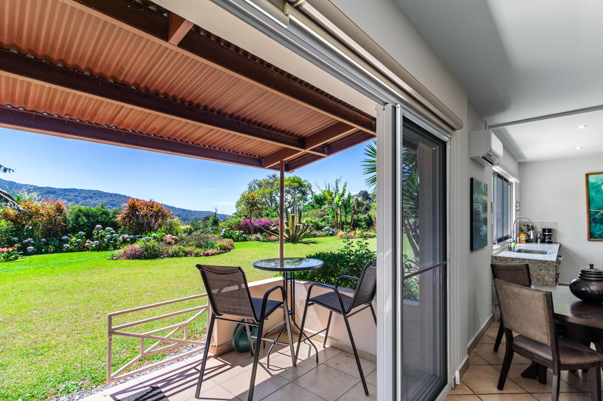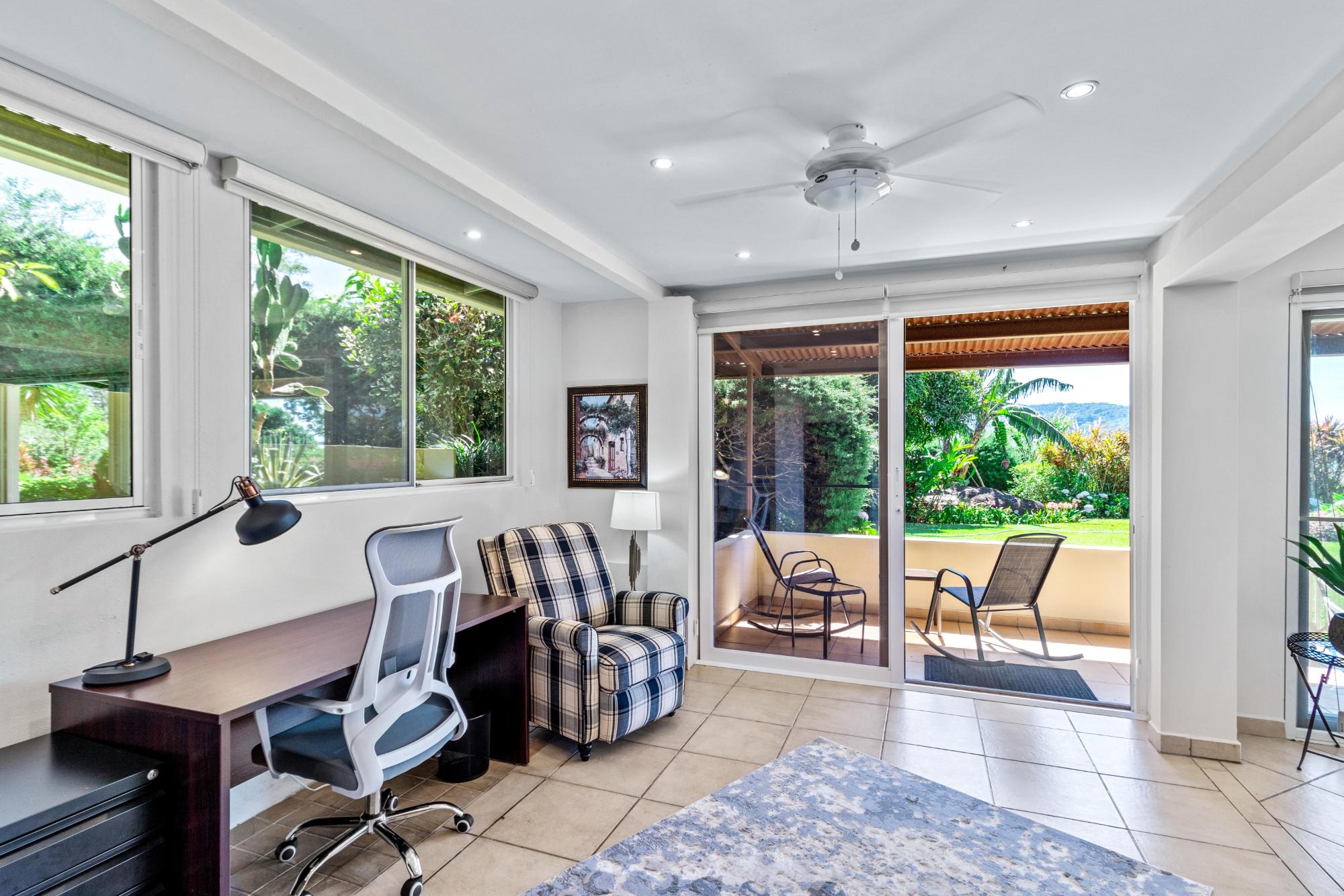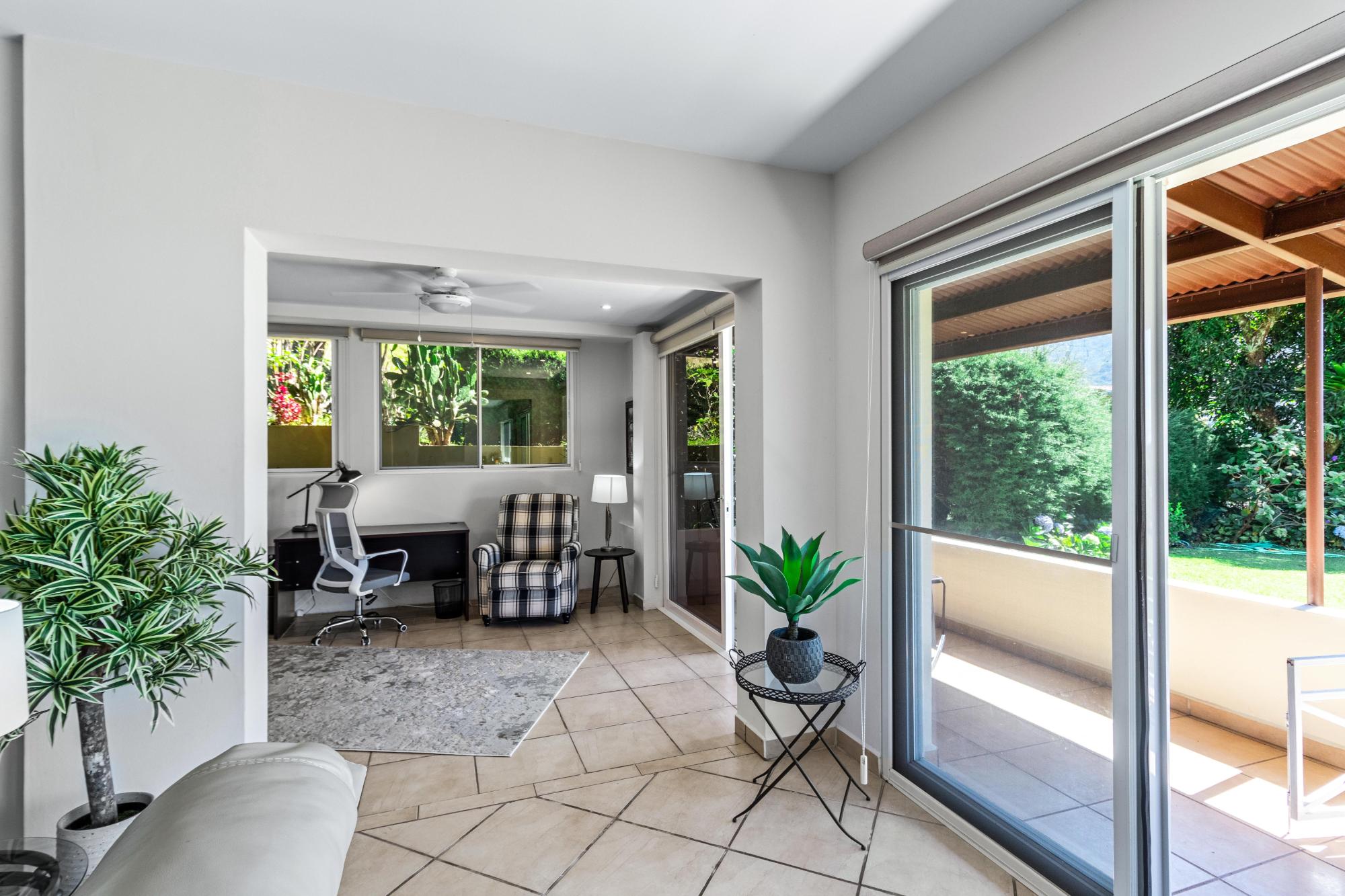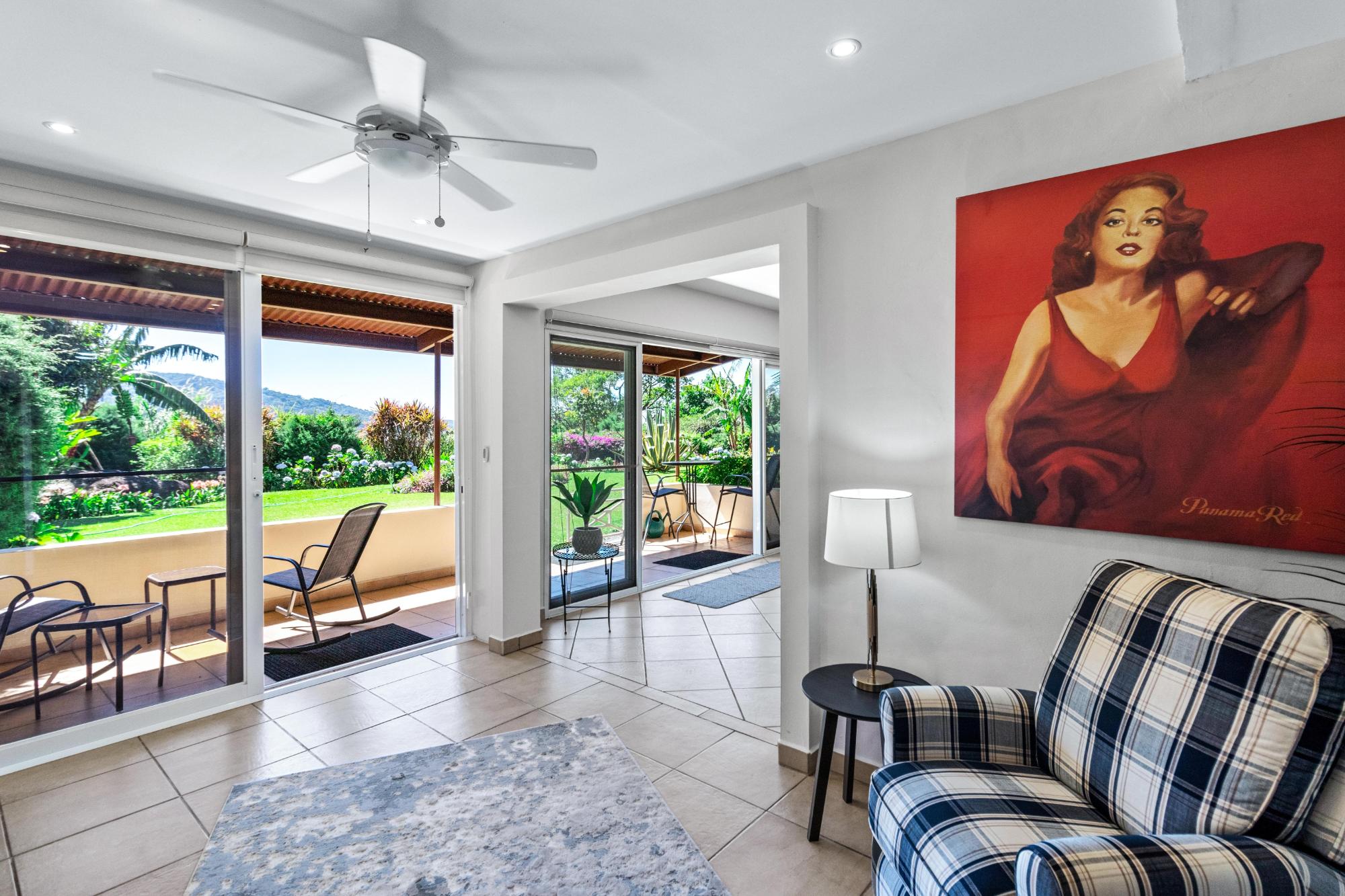 Discover your dream home in the peaceful and highly sought-after neighborhood of Alto Lino, located just 3.5 km from the vibrant Restaurant Row of downtown Boquete. This fully furnished 2-bedroom, 2-bath condo includes a spacious bonus room and a large bodega inside. Another feature unique to this home is the covered terrace that runs the entire width of the condo, offering breathtaking views of the mountains. What also sets this condo apart from all the others is its complete renovation completed just last year, with all appliances and furnishings newly purchased. The building is home to only six condos, but this one is truly unique—it’s the only unit that includes a bonus room and bodega, a covered terrace, and it’s larger and more distinctive than all the others. Upon entering, you’ll be welcomed by an open-concept floor plan bathed in natural light. The spacious living area is perfect for relaxing or entertaining, with a 75" Samsung TV providing a theater-like experience, while the master suite features its own TV for private viewing. Both TVs are equipped with new 4K Amazon FireSticks for endless streaming. The climate is always under control with a cutting-edge Carrier system providing air conditioning, heating, dehumidifying, and air-purifying options for your comfort year-round. The master bedroom is a retreat of its own, furnished with a king-size bed and an en-suite bathroom complete with ample cabinet space, ensuring everything has its place. The second bedroom is also generously sized and provides plenty of storage for all your belongings.