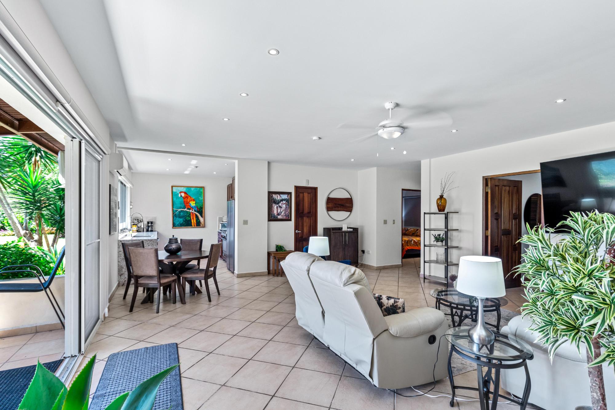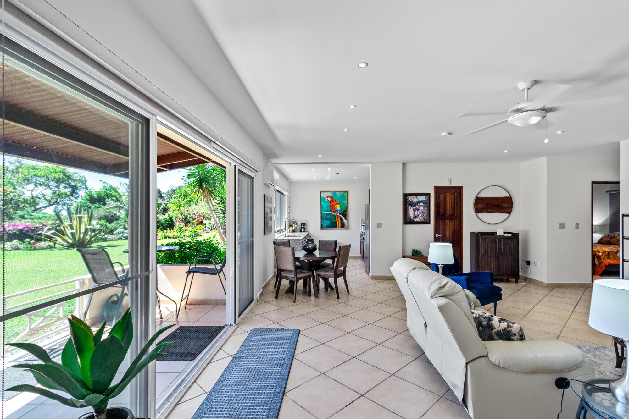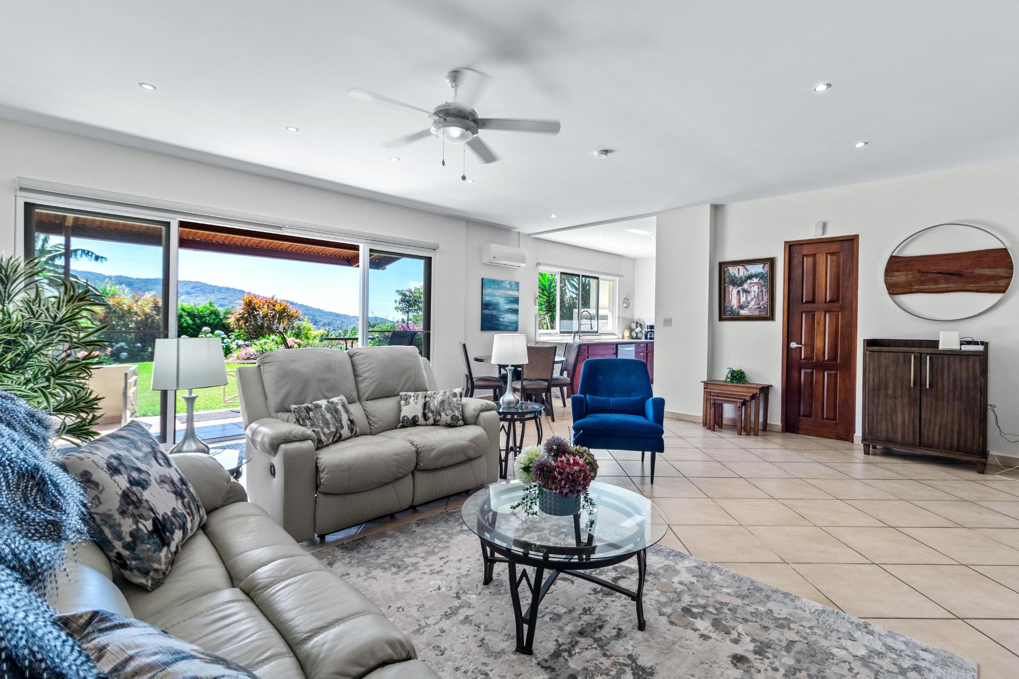 Discover your dream home in the peaceful and highly sought-after neighborhood of Alto Lino, located just 3.5 km from the vibrant Restaurant Row of downtown Boquete. This fully furnished 2-bedroom, 2-bath condo includes a spacious bonus room and a large bodega inside. Another feature unique to this home is the covered terrace that runs the entire width of the condo, offering breathtaking views of the mountains. What also sets this condo apart from all the others is its complete renovation completed just last year, with all appliances and furnishings newly purchased. The building is home to only six condos, but this one is truly unique—it’s the only unit that includes a bonus room and bodega, a covered terrace, and it’s larger and more distinctive than all the others. Upon entering, you’ll be welcomed by an open-concept floor plan bathed in natural light. The spacious living area is perfect for relaxing or entertaining, with a 75" Samsung TV providing a theater-like experience, while the master suite features its own TV for private viewing. Both TVs are equipped with new 4K Amazon FireSticks for endless streaming. The climate is always under control with a cutting-edge Carrier system providing air conditioning, heating, dehumidifying, and air-purifying options for your comfort year-round. The master bedroom is a retreat of its own, furnished with a king-size bed and an en-suite bathroom complete with ample cabinet space, ensuring everything has its place. The second bedroom is also generously sized and provides plenty of storage for all your belongings.
