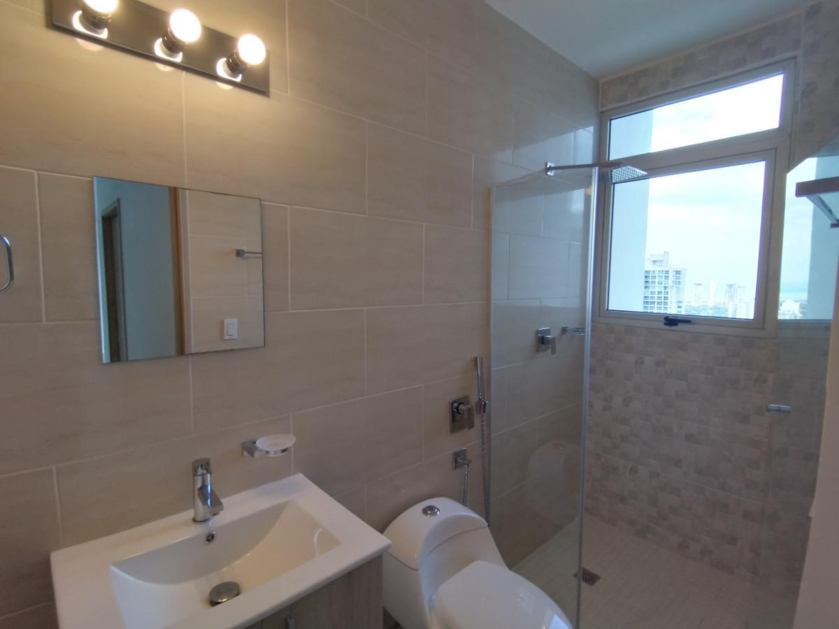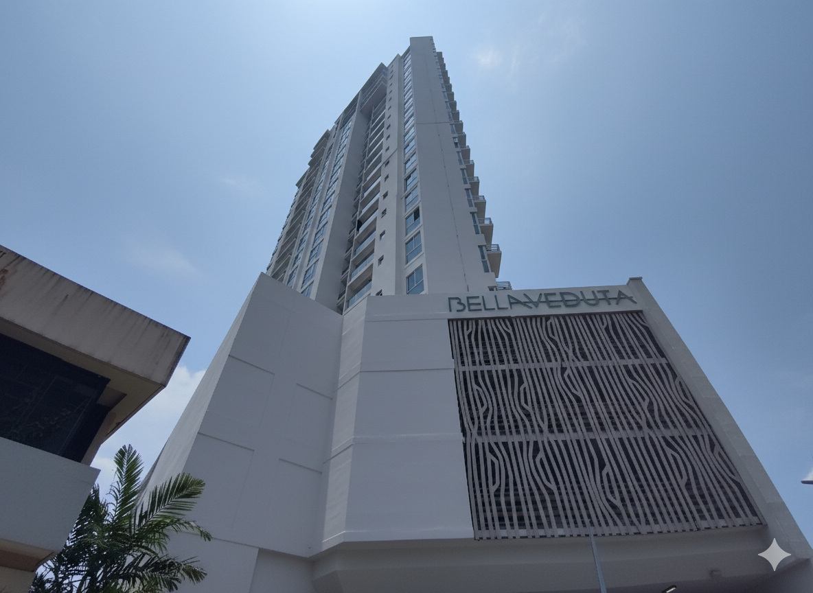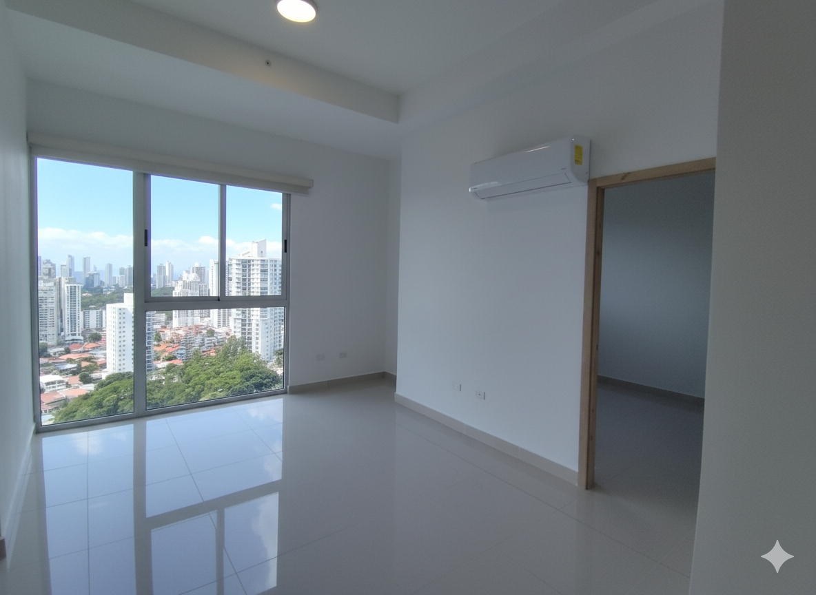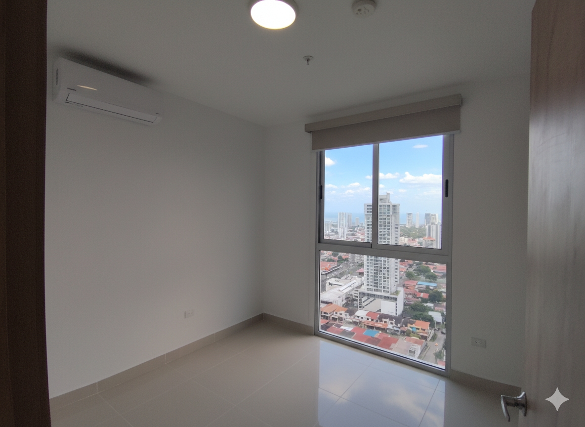 New apartment in the 19th floor located in Hato Pintado in the PH Bella Veduta in the city center on a cul-de-sac, a few meters from 12 de Octubre Street, the Metro station, and numerous businesses such as Do It Center, Banco General, Arrocha, Smart Fit, and Supermercado El Rey. The project features visitor parking, a luxurious lobby, a gym, a party room, a children's play area, a pet park, and a beautiful pool with city views. The apartment features an open kitchen, high ceilings, living/dining room, laundry room, two bedrooms, two full bathrooms, lamps, roller shades, appliances, Panasonic inverter air conditioners, and one parking space on level E300 - No. 13. It is ready for immediate occupancy with its electricity installed.