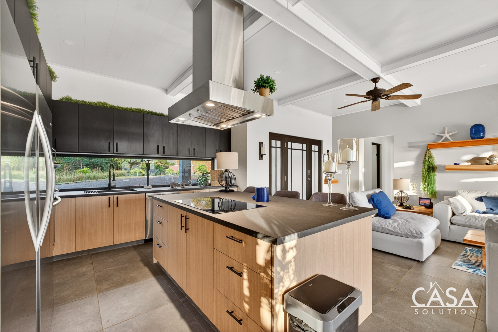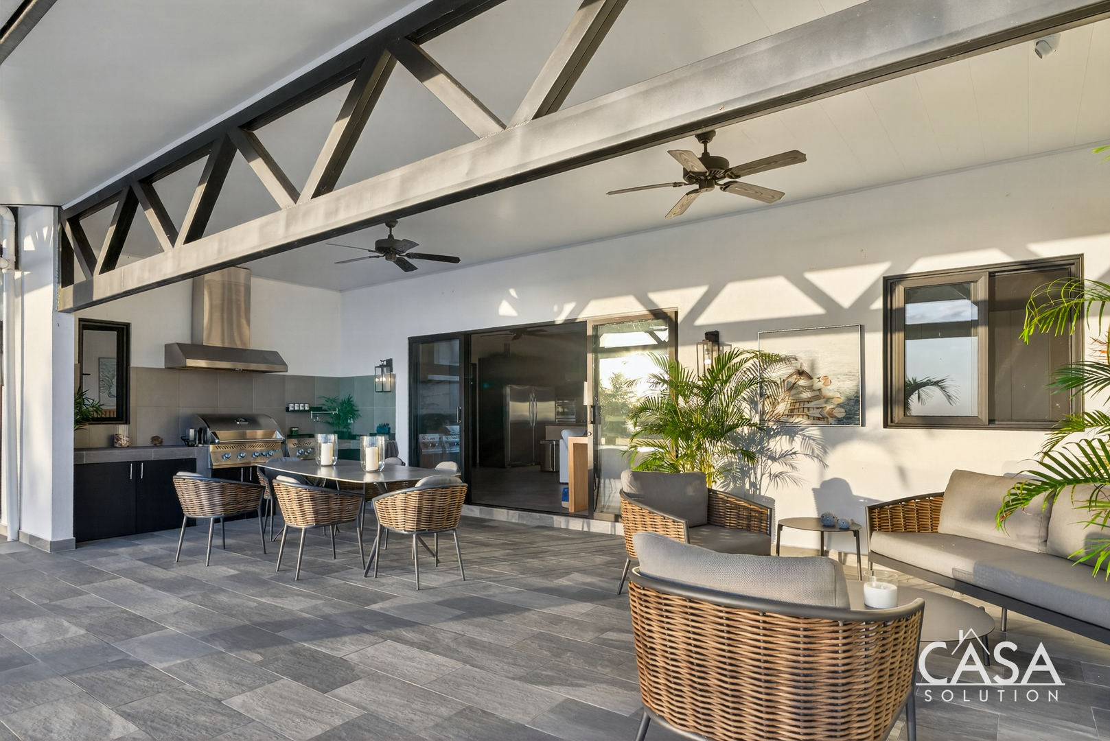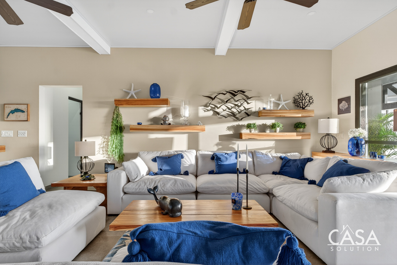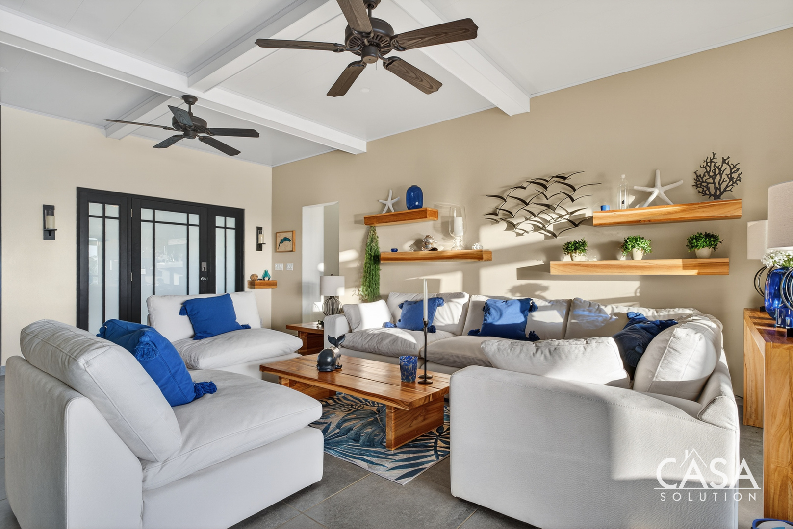 The living areas open seamlessly toward the outdoors, drawing your attention to the ocean beyond. Large openings connect the interior to a spacious front terrace that faces the views and sunsets. This is where the home truly comes alive, whether for quiet mornings, afternoon shade, or evenings watching the sky change color over the water.