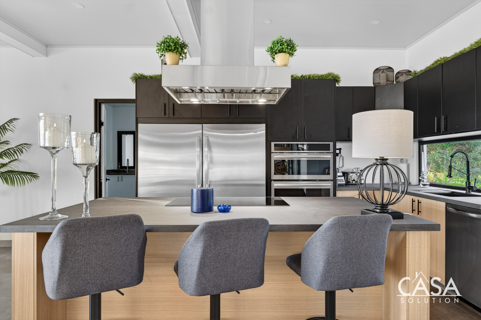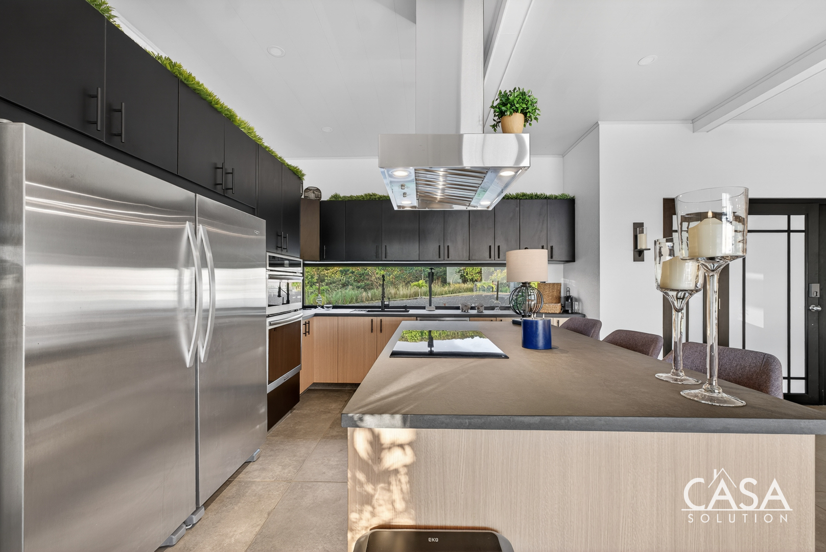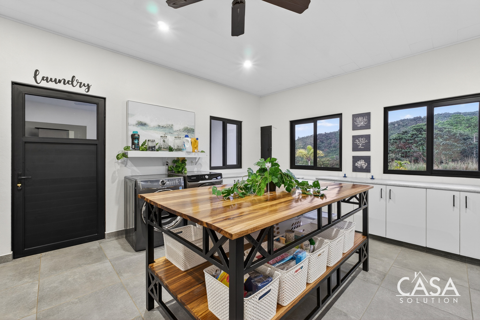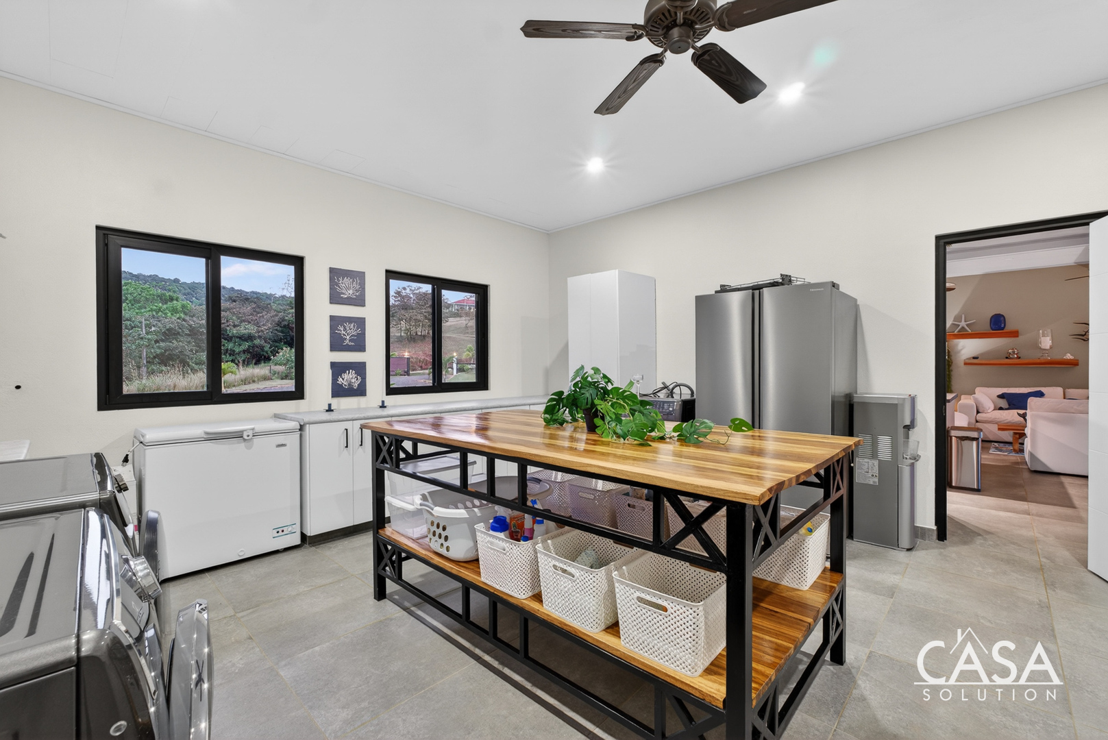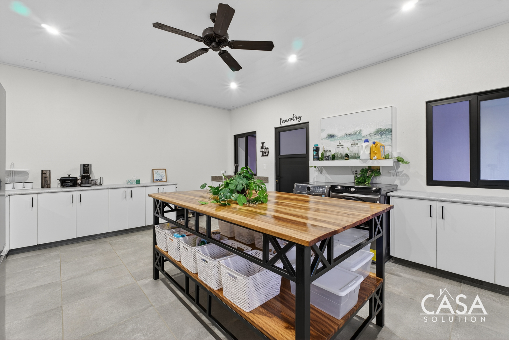 Inside, the home blends modern functionality with warmth and character. The kitchen is a central feature, designed with high-quality finishes and a strong visual identity. Dark-toned countertops contrast beautifully with pine-colored cabinetry, creating a balance between modern design and natural warmth. This is a kitchen meant to be used, not just admired. Adjacent to it is an expansive den area that functions as a true utility hub, providing space for laundry, storage, kitchenware, and additional refrigerators or freezers. It is practical, well-organized, and discreetly integrated into the home.