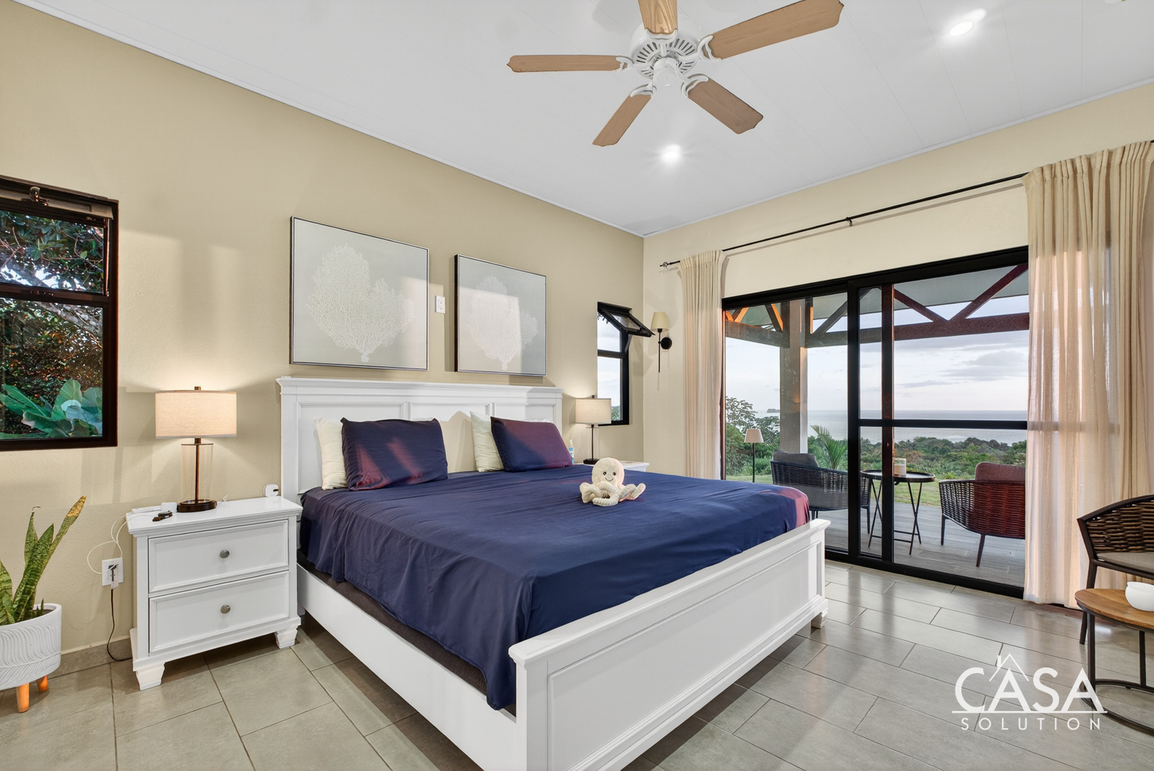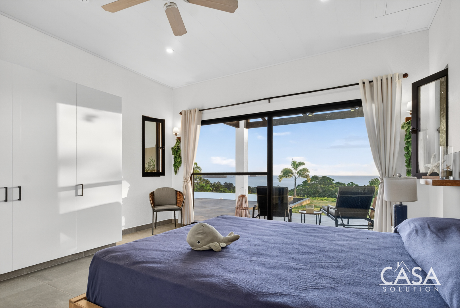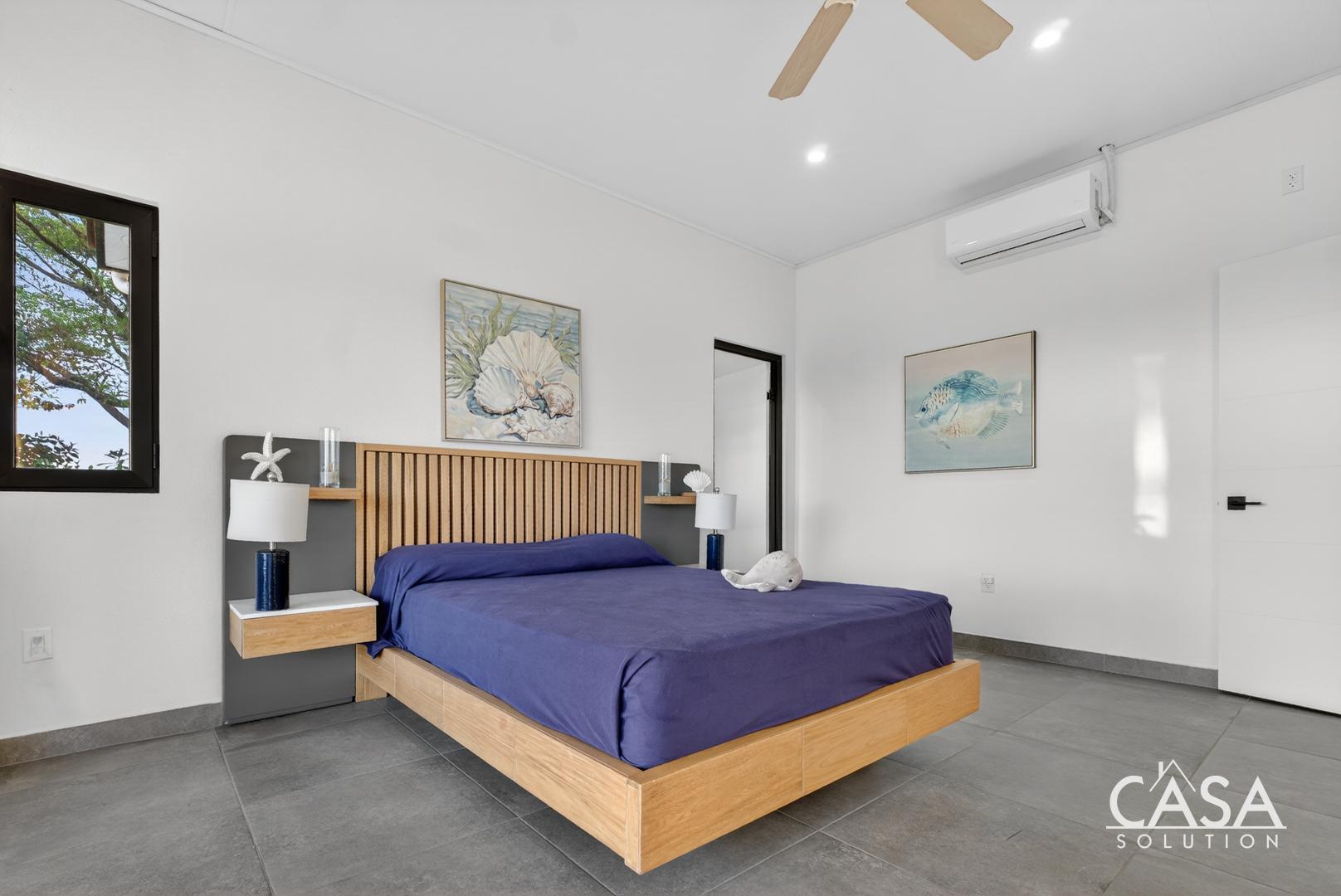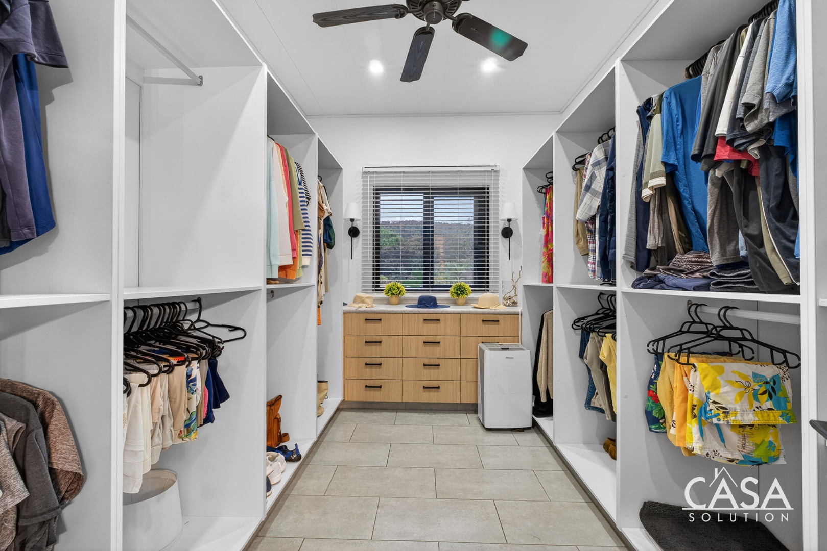 The primary bedroom enjoys exceptional ocean views and direct visual connection to the outdoors. It is complemented by a spacious bathroom designed with comfort in mind, featuring generous proportions, quality finishes, and an outdoor shower that adds a tropical, resort-like touch. The walk-in closet is equally impressive, with custom-made cabinetry that provides both function and refined detail.