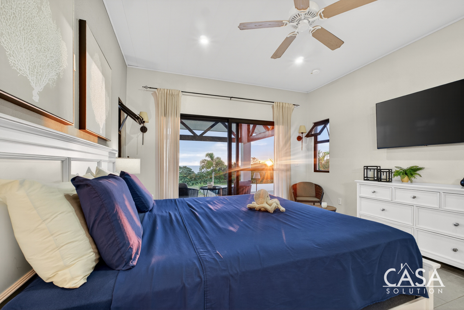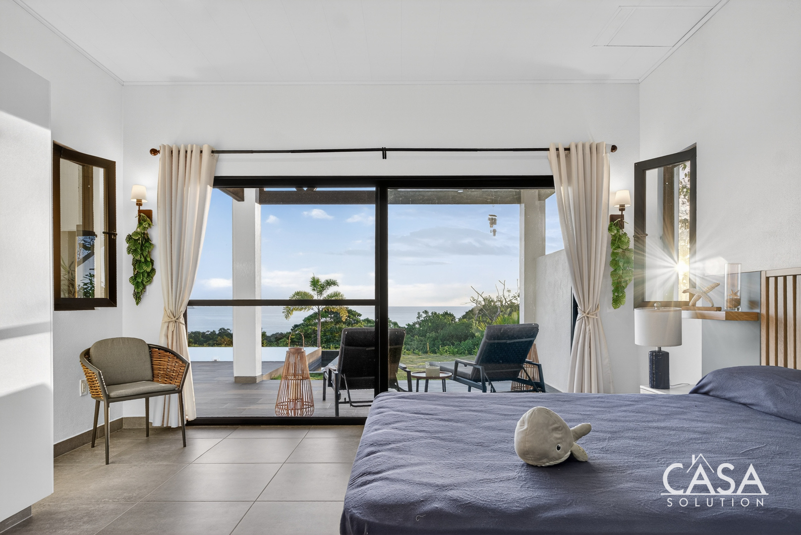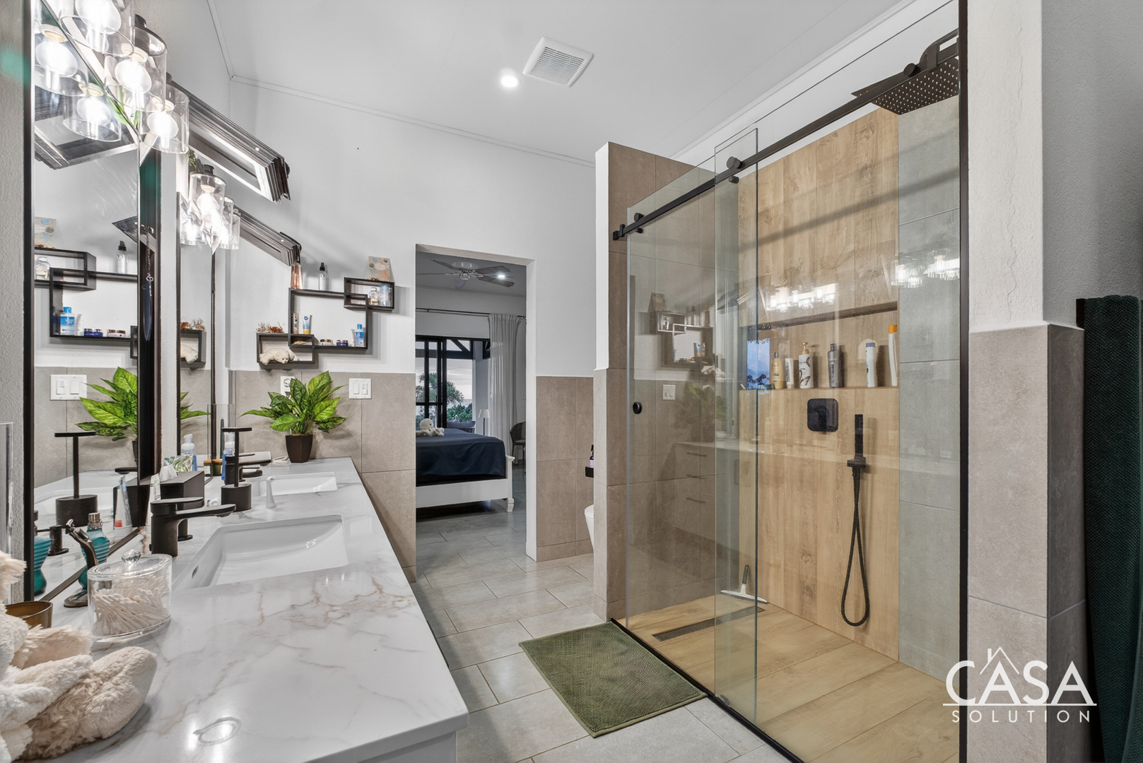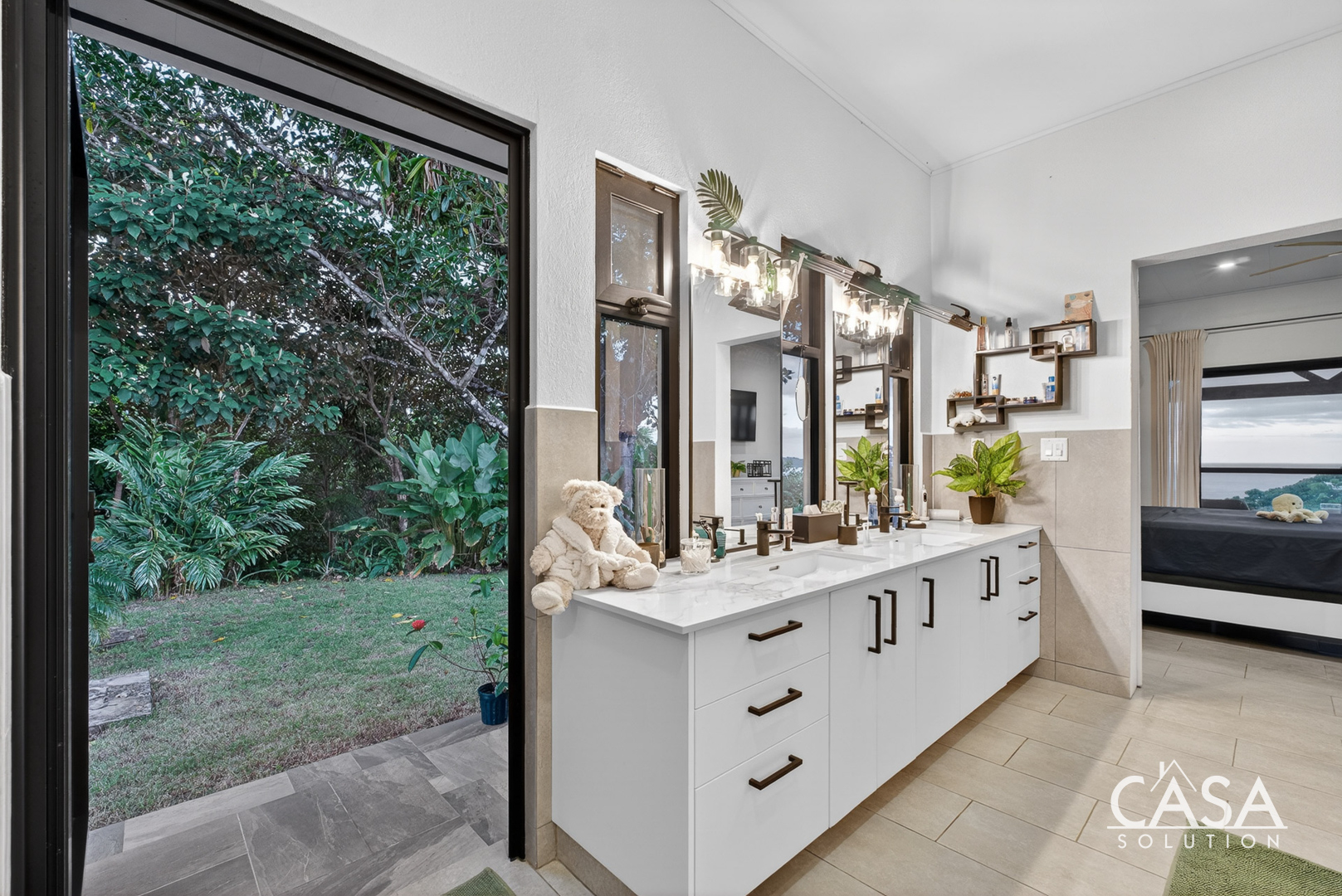 The primary bedroom enjoys exceptional ocean views and direct visual connection to the outdoors. It is complemented by a spacious bathroom designed with comfort in mind, featuring generous proportions, quality finishes, and an outdoor shower that adds a tropical, resort-like touch. The walk-in closet is equally impressive, with custom-made cabinetry that provides both function and refined detail.