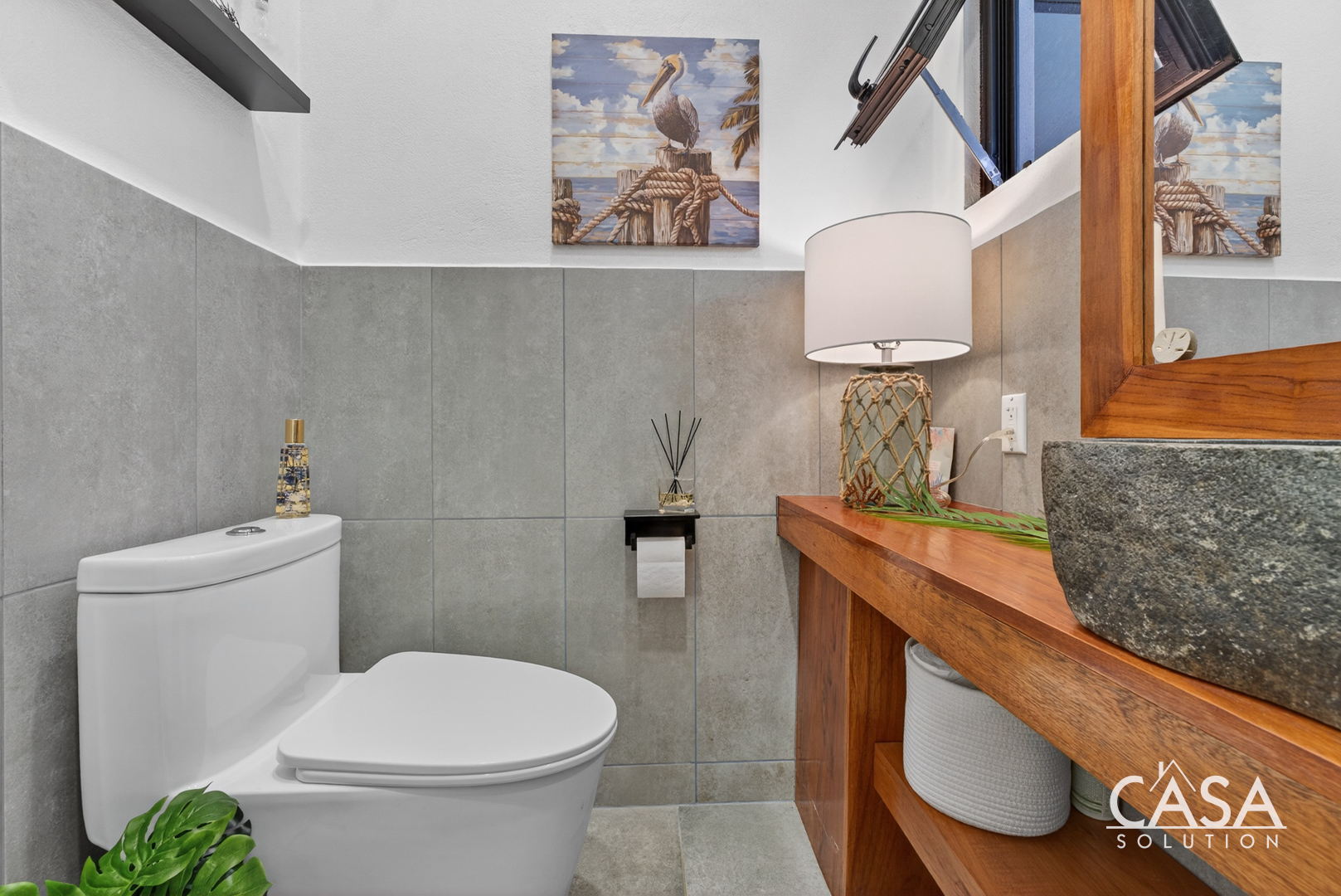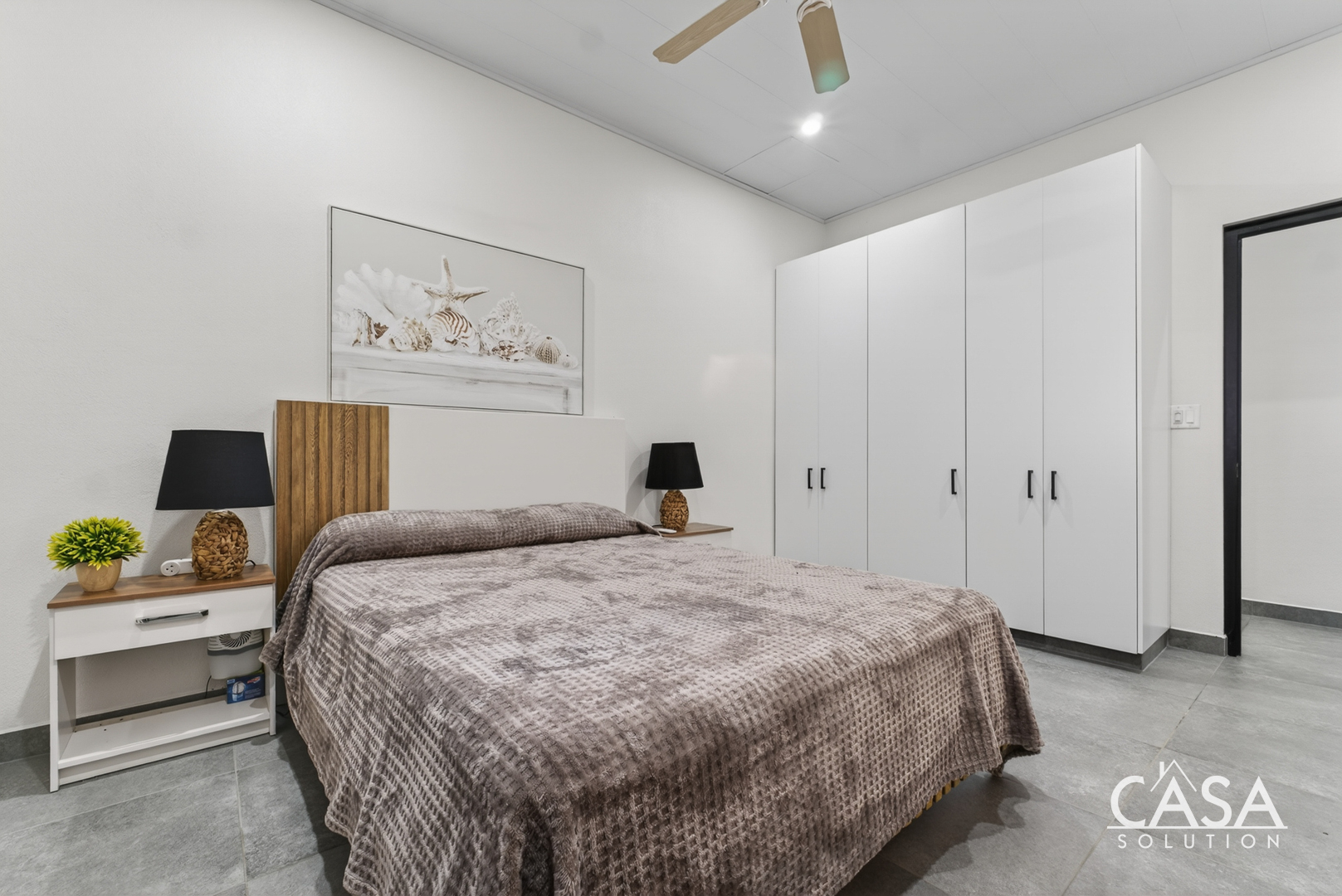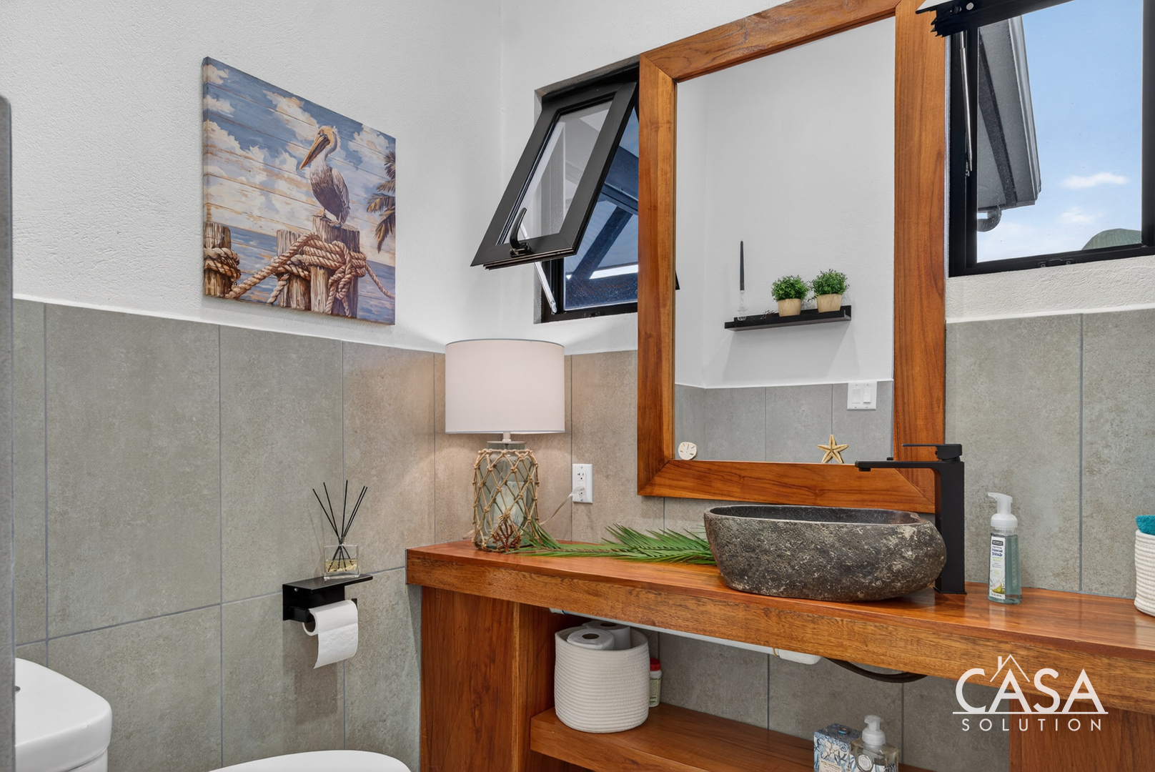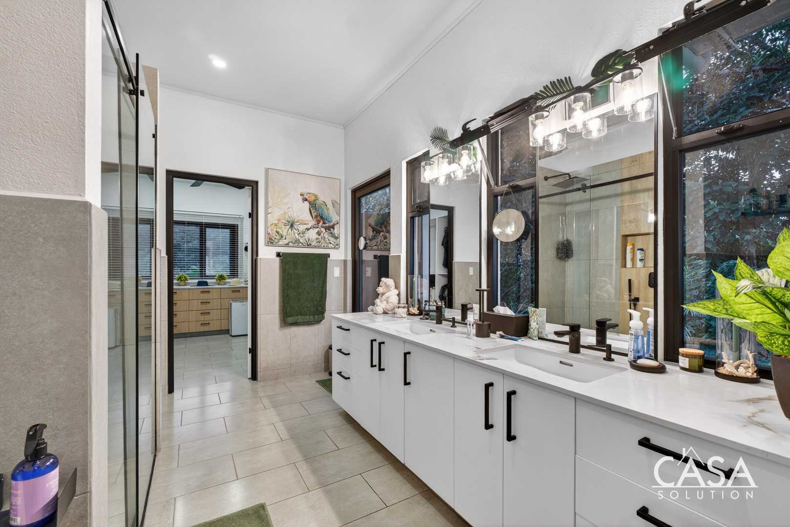 The primary bedroom enjoys exceptional ocean views and direct visual connection to the outdoors. It is complemented by a spacious bathroom designed with comfort in mind, featuring generous proportions, quality finishes, and an outdoor shower that adds a tropical, resort-like touch. The walk-in closet is equally impressive, with custom-made cabinetry that provides both function and refined detail.