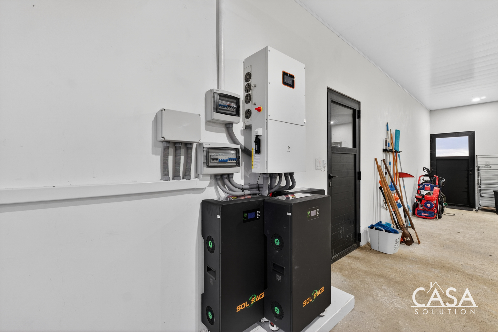 The home is equipped with solar panels and battery storage, offering energy independence and efficiency. Smart home features allow lighting and systems to be controlled directly from your smartphone, adding a layer of convenience that fits naturally into modern living. The property is connected to a reliable water supply, ensuring comfort without compromise.