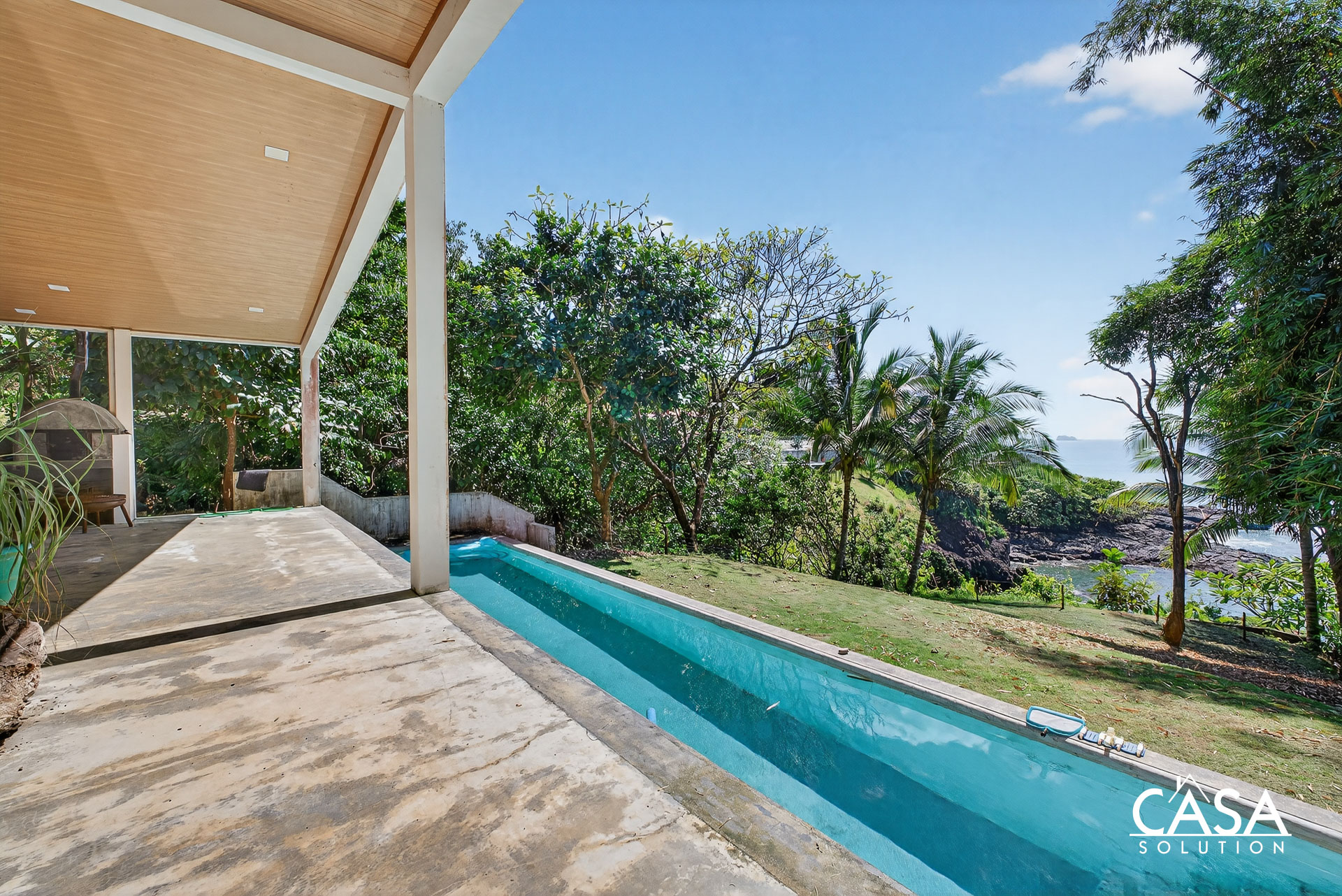 Outdoor living is a key feature of this property. A covered terrace extends from the main living area and overlooks a long lap-style swimming pool positioned to take advantage of the ocean view. The pool area feels private and protected, with mature trees and vegetation surrounding the property, while still maintaining visual connection to the coastline below. The proximity to the surf makes this home especially appealing for those who want easy access to the ocean without sacrificing privacy or elevation.