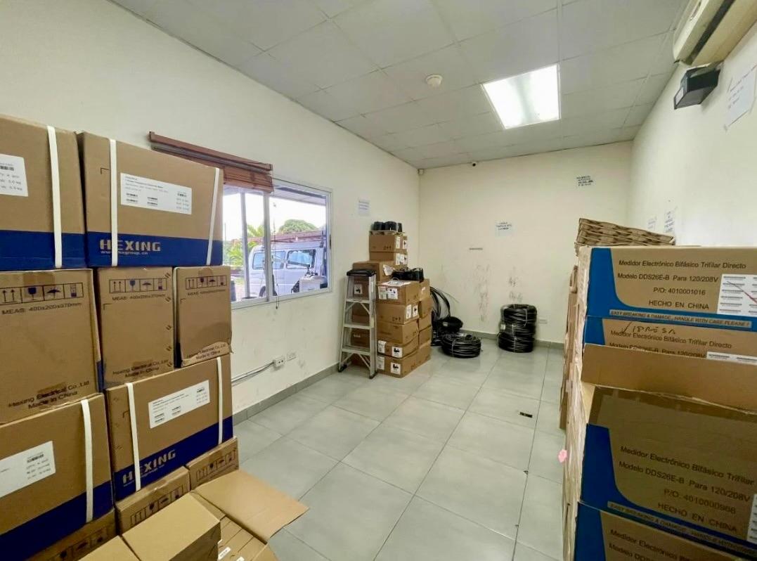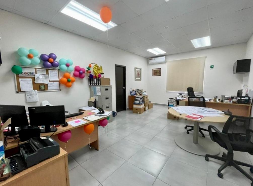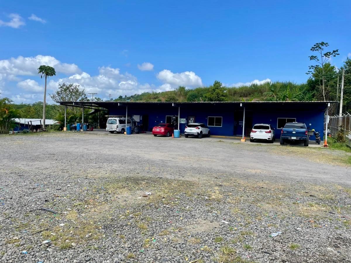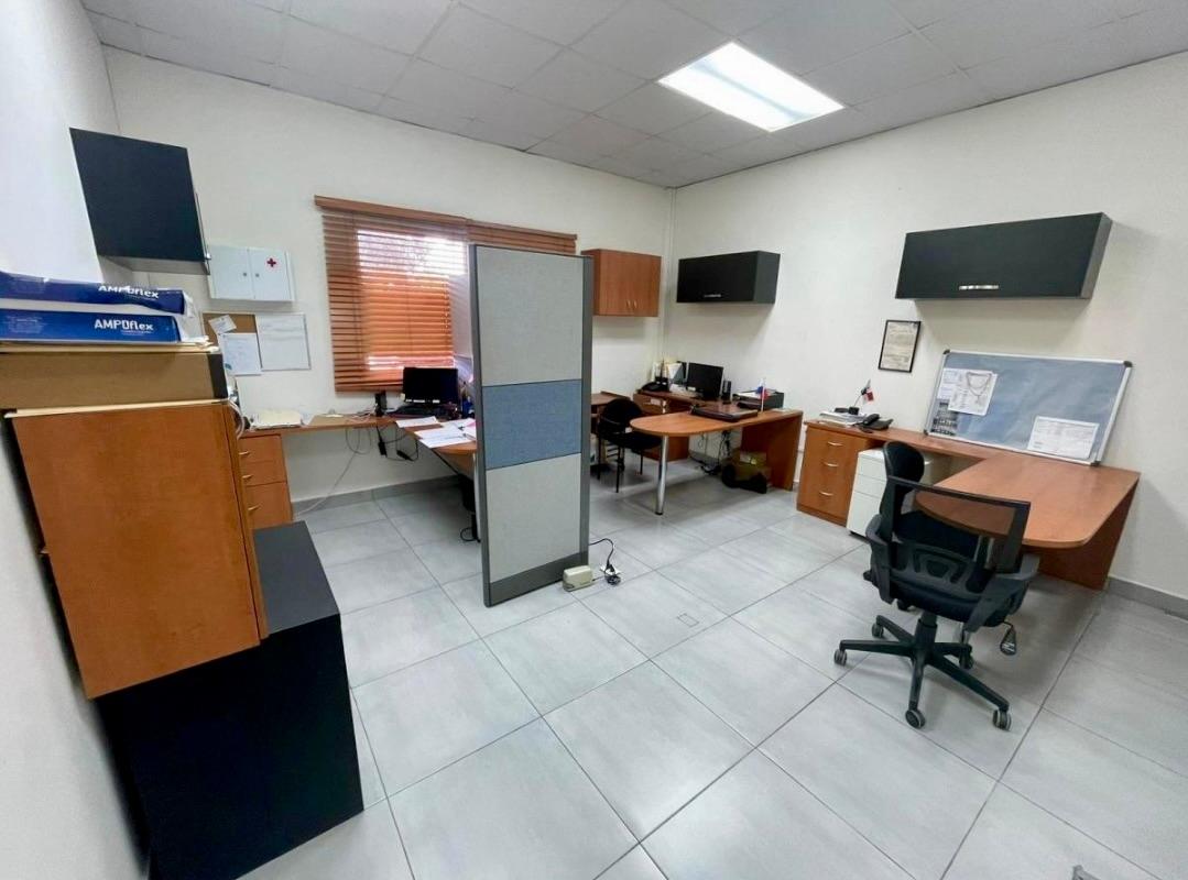 The property features a main building at street level, with office areas, covered parking, storage, a cafeteria, a staff dining room, restrooms, and an employee area. There is also an annex with offices accessed via a covered concrete staircase. Facilities include full restrooms (with showers and ceramic and tile finishes), a fully equipped cafeteria, storage, and staff support spaces. The main entrance is through a 5-meter-high sliding metal gate. The entire perimeter is fenced with blocks and cyclone mesh, with retaining walls at the rear and left side.