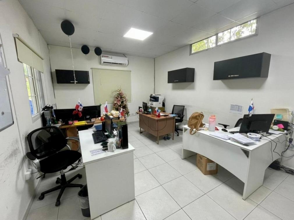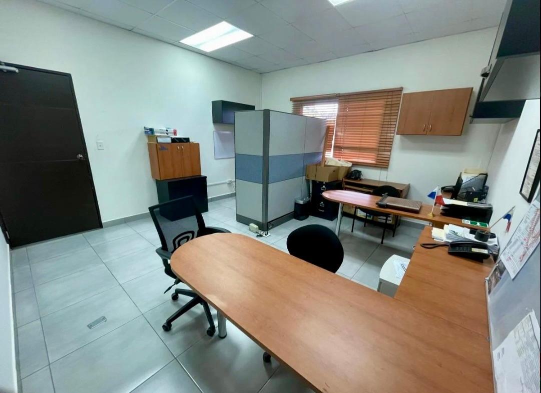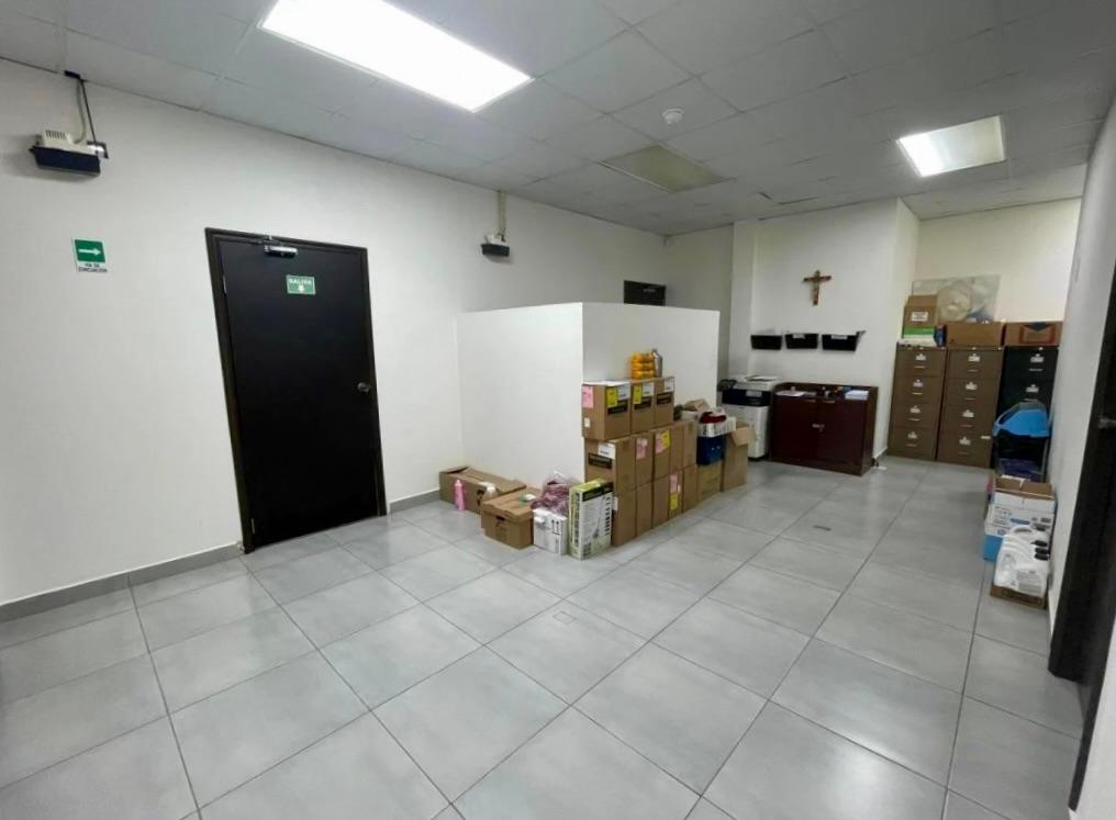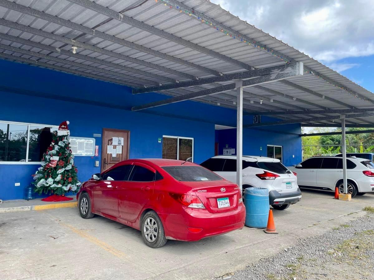 The property features a main building at street level, with office areas, covered parking, storage, a cafeteria, a staff dining room, restrooms, and an employee area. There is also an annex with offices accessed via a covered concrete staircase. Facilities include full restrooms (with showers and ceramic and tile finishes), a fully equipped cafeteria, storage, and staff support spaces. The main entrance is through a 5-meter-high sliding metal gate. The entire perimeter is fenced with blocks and cyclone mesh, with retaining walls at the rear and left side.