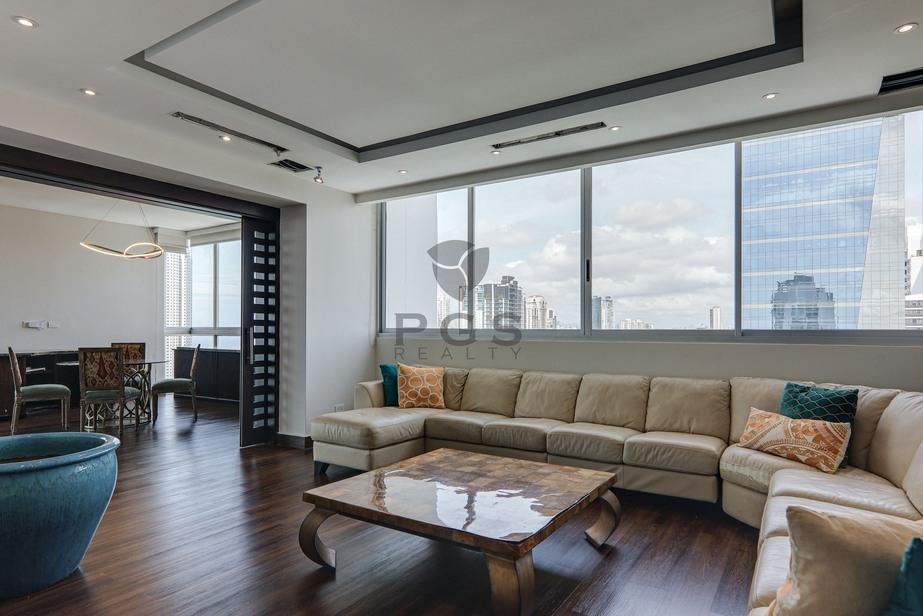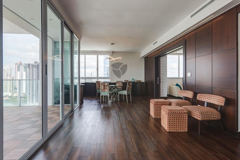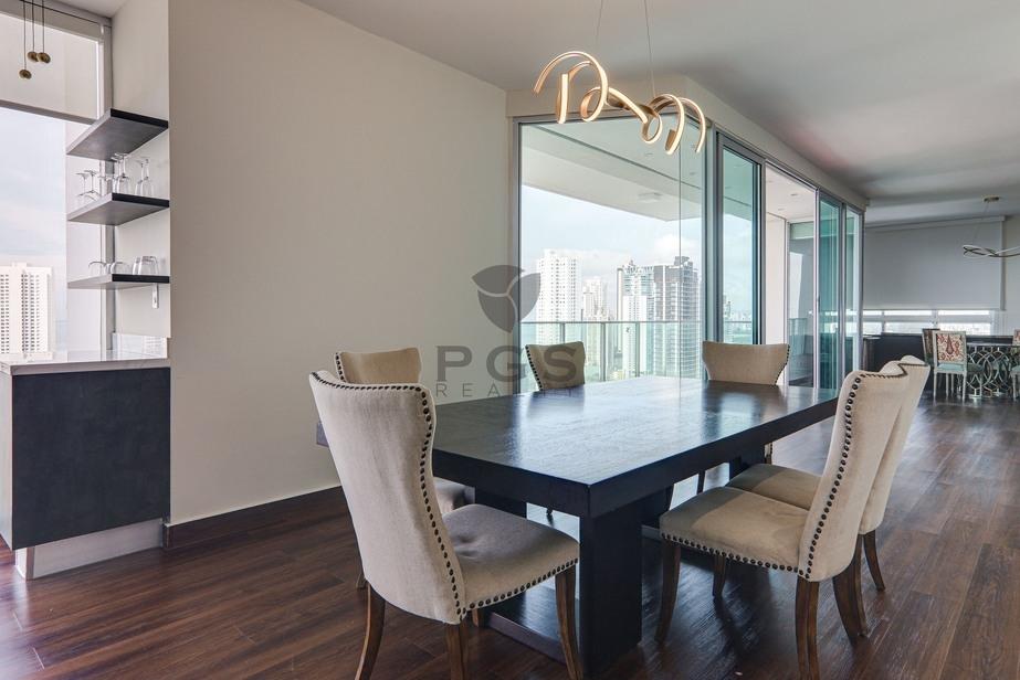 Features of this stunning property include: Large balcony and floor-to-ceiling windows with panoramic views of the Costa del Este skyline and the Pacific Ocean beyond Open-concept living-dining-kitchen area with energy-efficient central A/C system Family room/den that can be enclosed with sliding doors Gourmet kitchen with top-quality stainless steel appliances and quartz stone countertop Separate bar area with wine fridge and custom wine display rack Master suite with luxurious walk-in closet, additional closet and remodeled in-suite bathroom Two additional bedrooms with walk-in closets and private bathrooms Maid's quarters equipped with A/C Large laundry room with natural ventilation Three assigned parking spots on a low floor Large storage unit