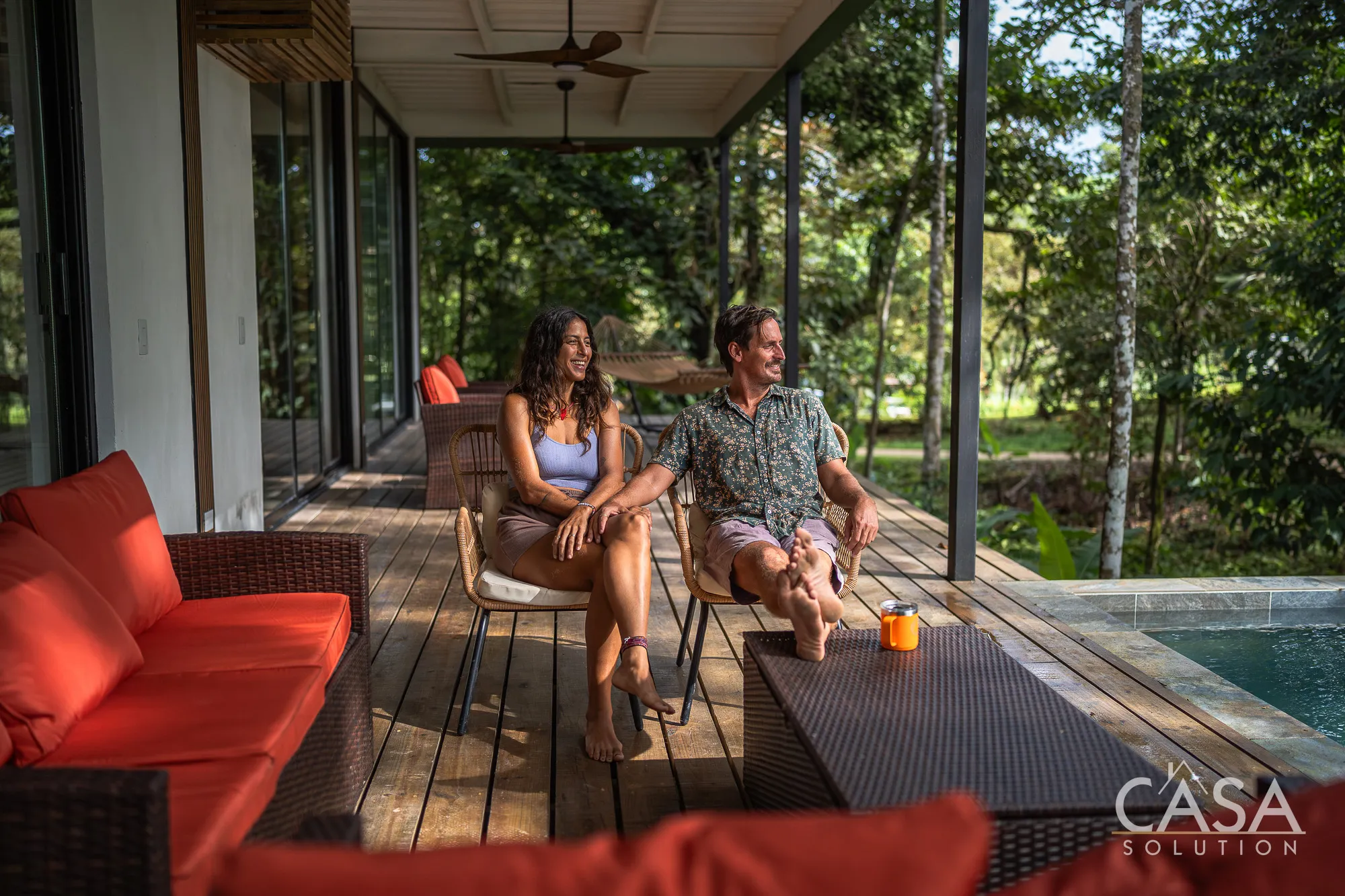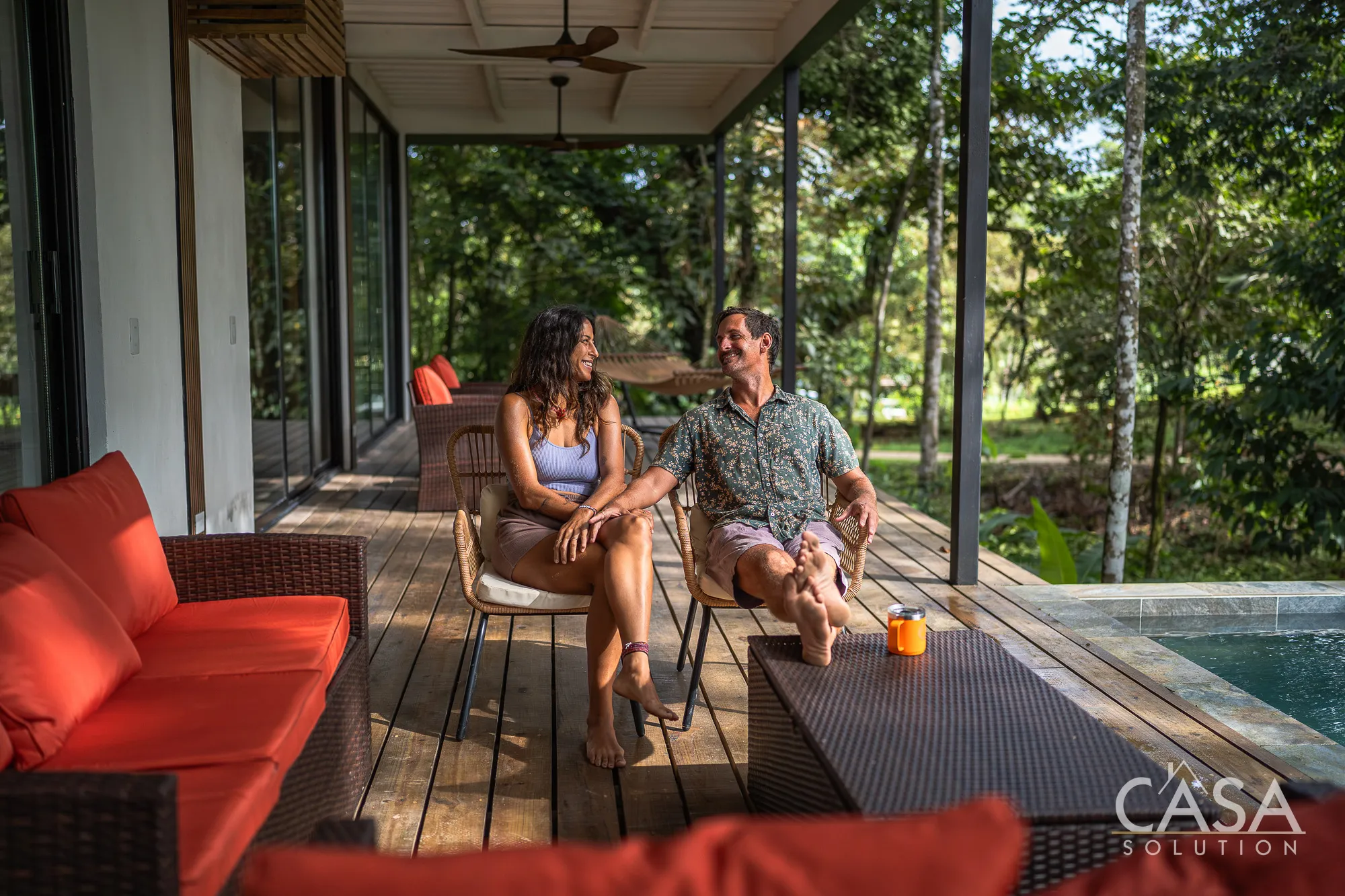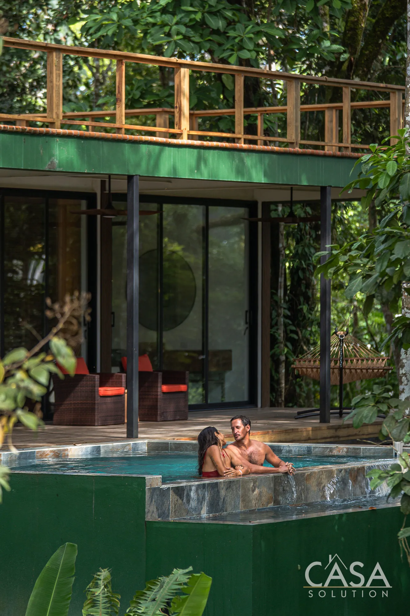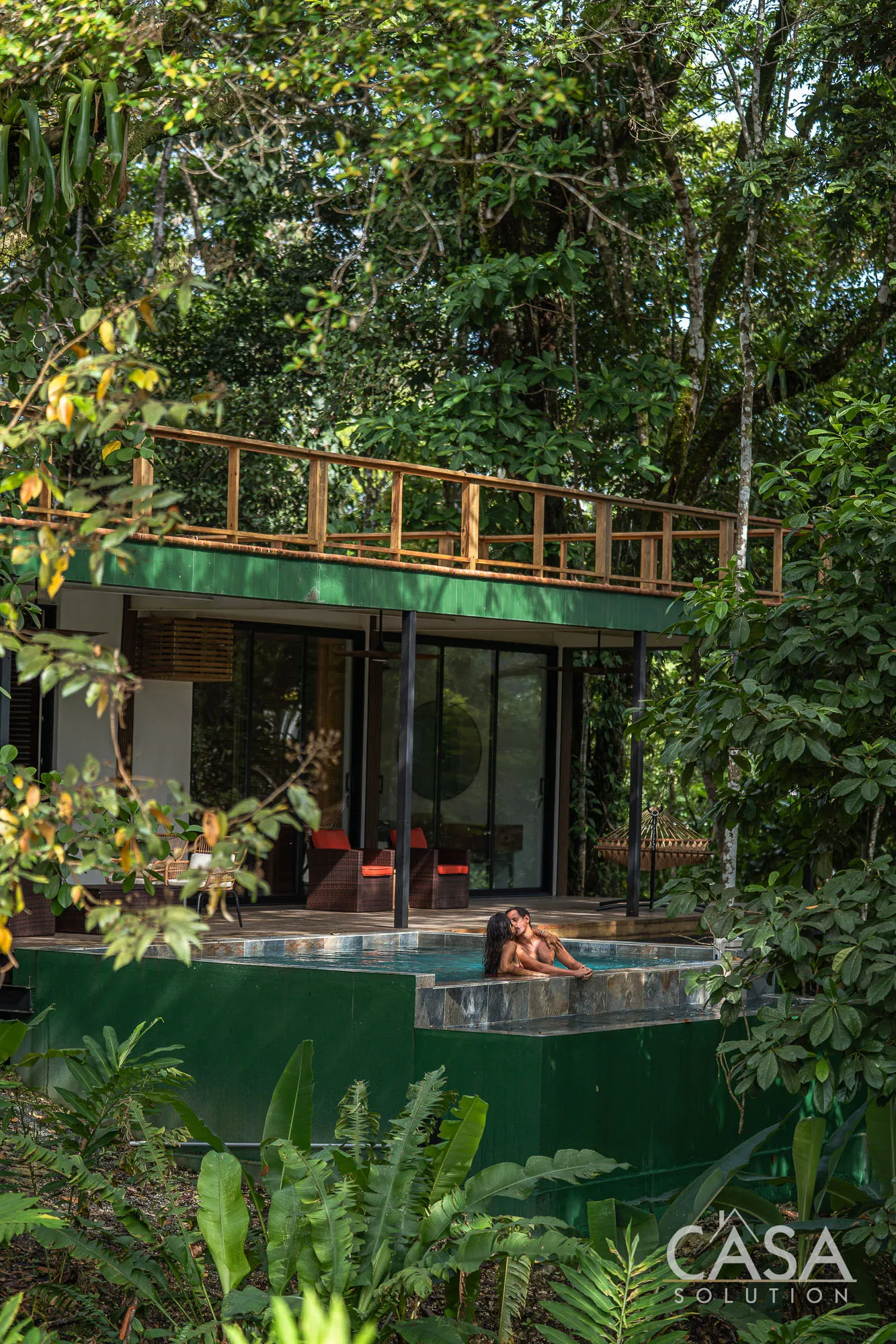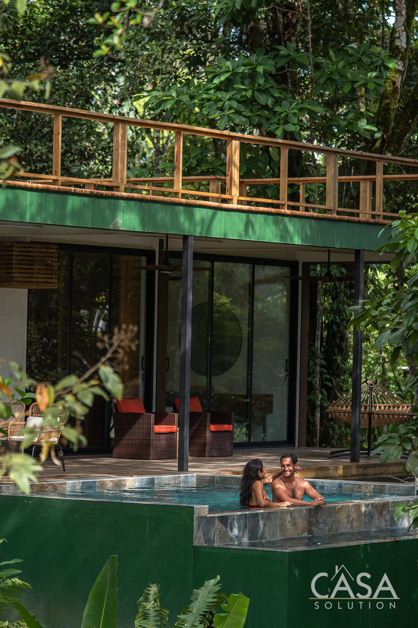 The layout integrates the living space with the exterior deck from the beginning. Covered terraces support year-round use, and private pools face the jungle rather than neighboring structures.