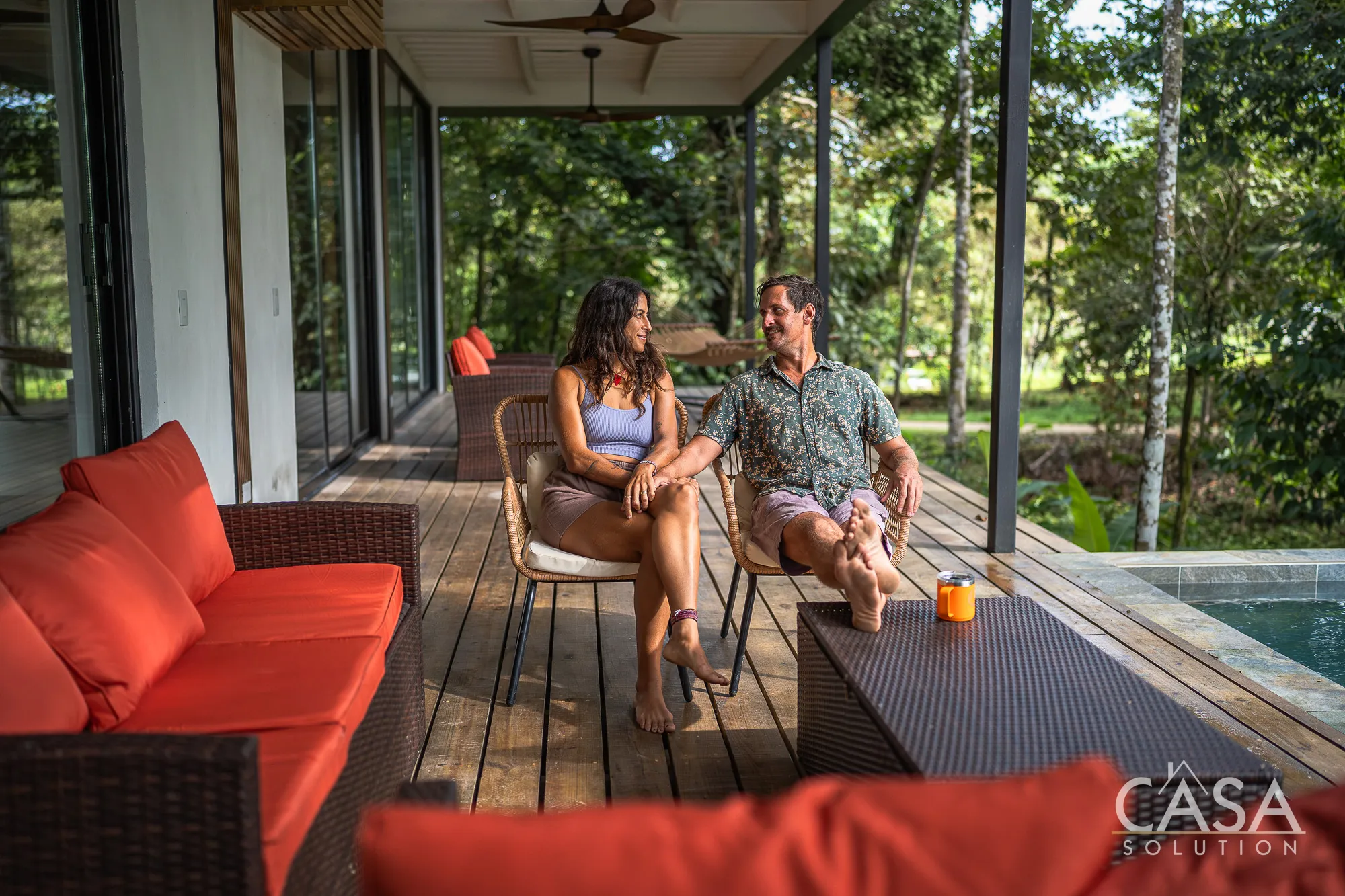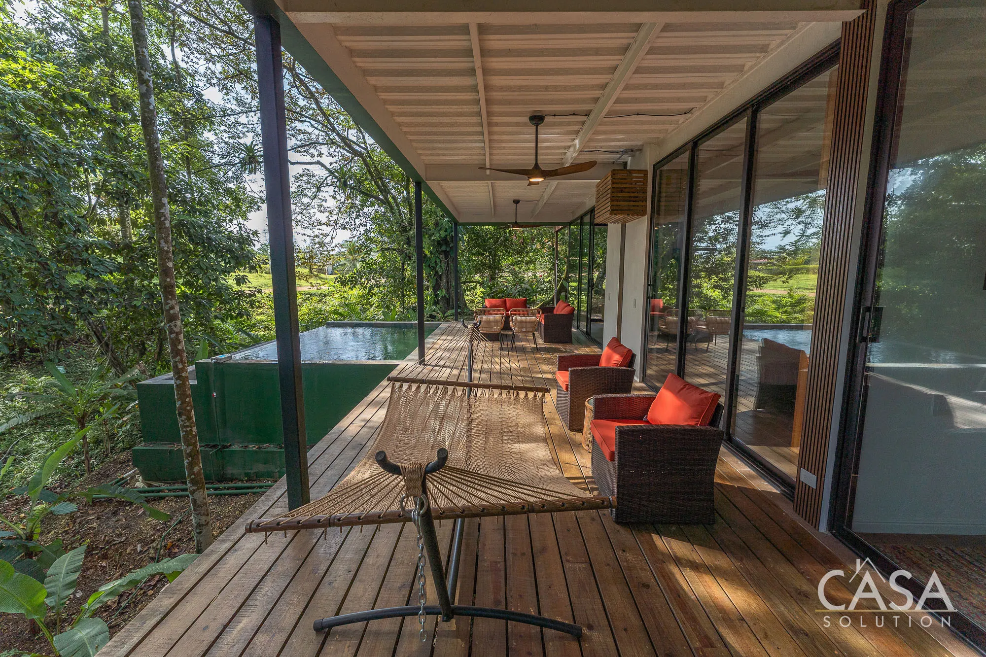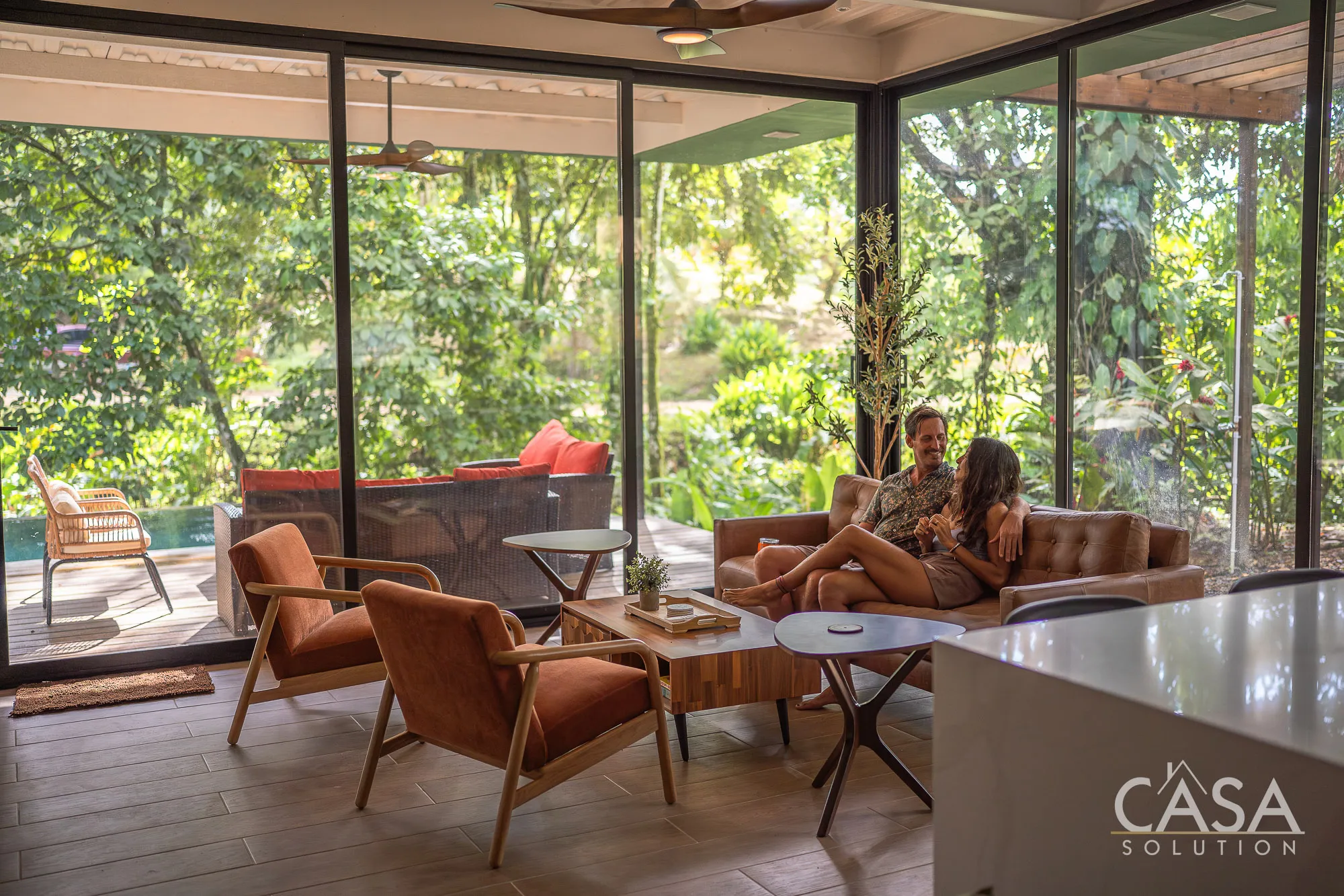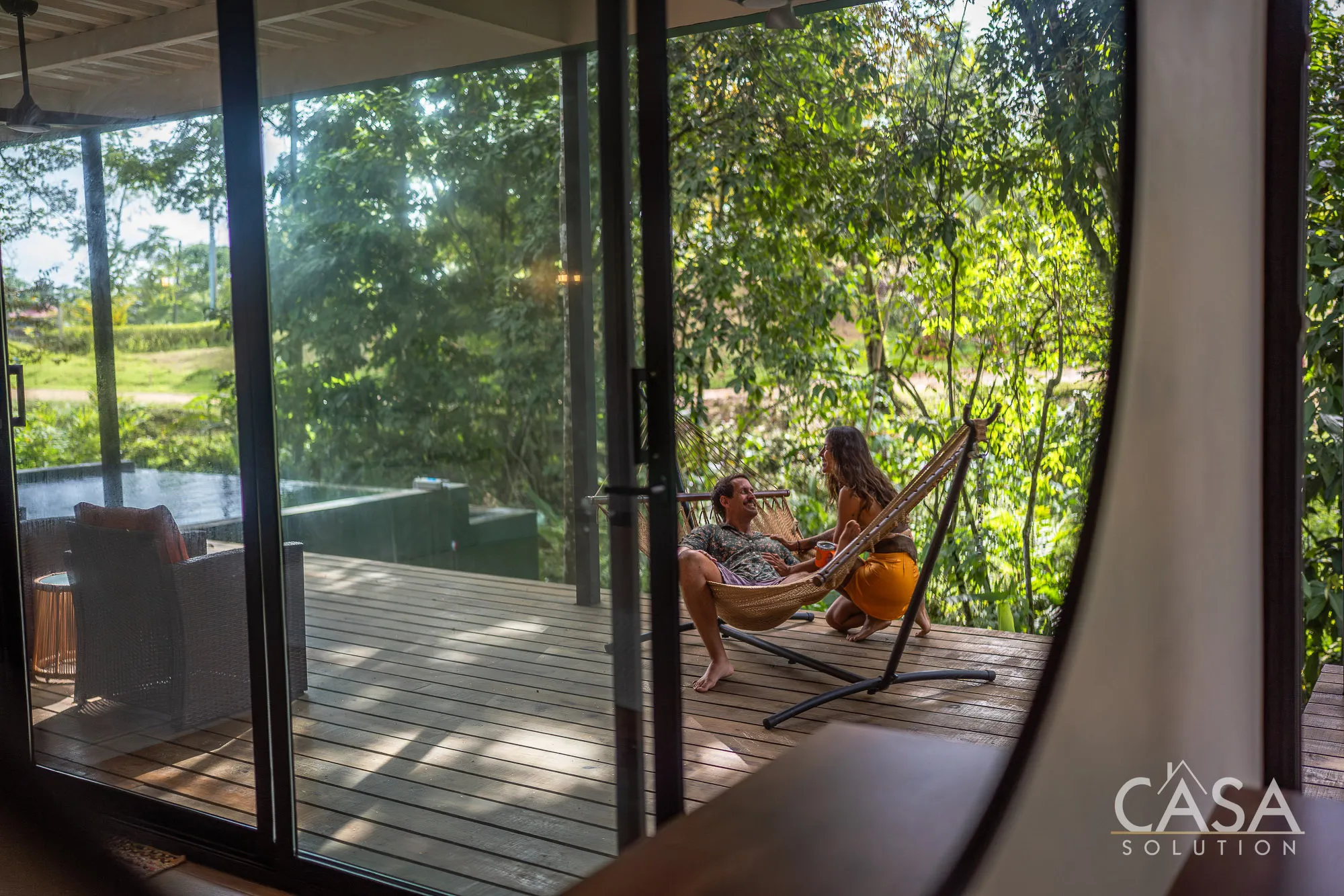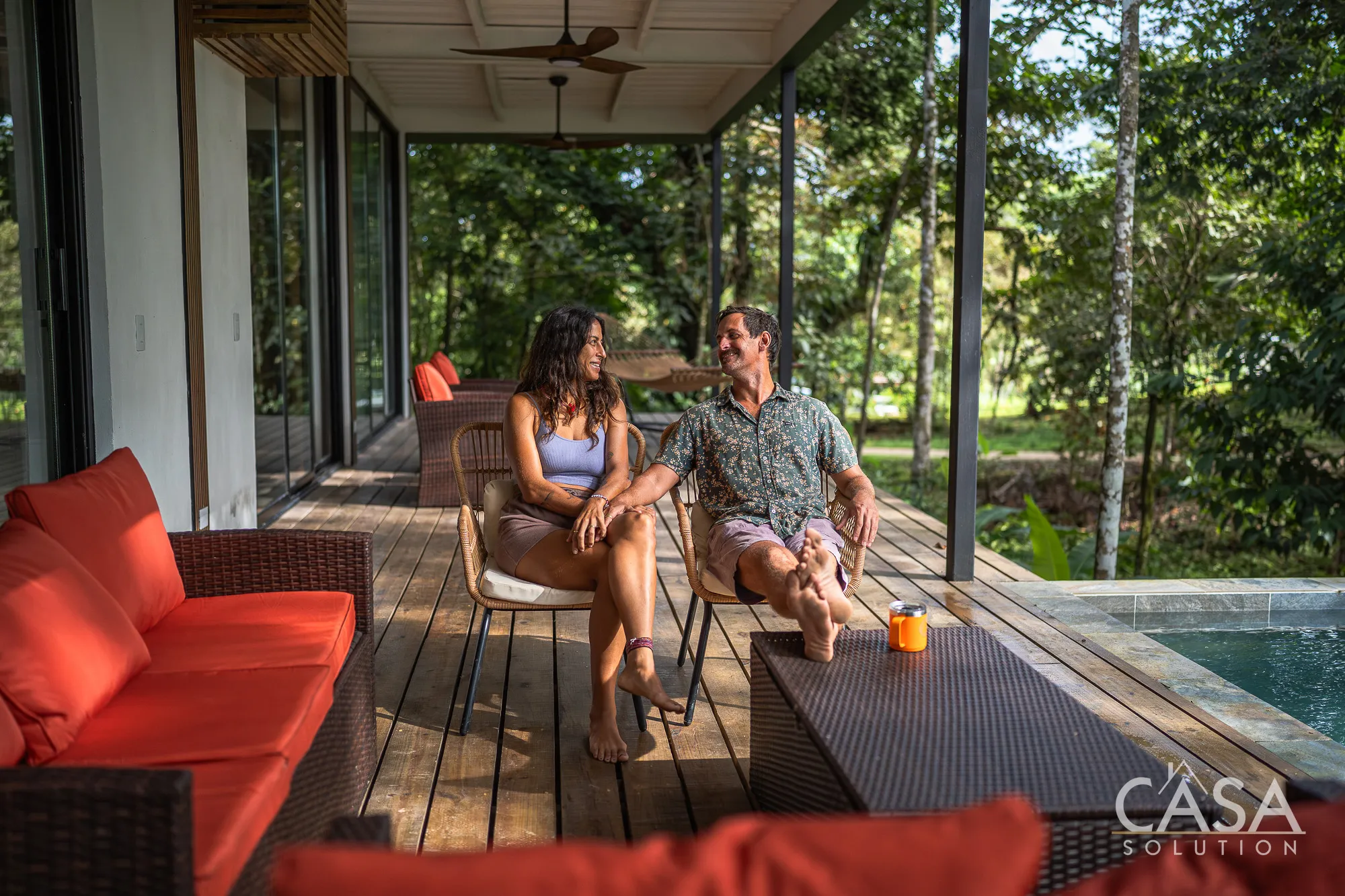The layout integrates the living space with the exterior deck from the beginning. Covered terraces support year-round use, and private pools face the jungle rather than neighboring structures.