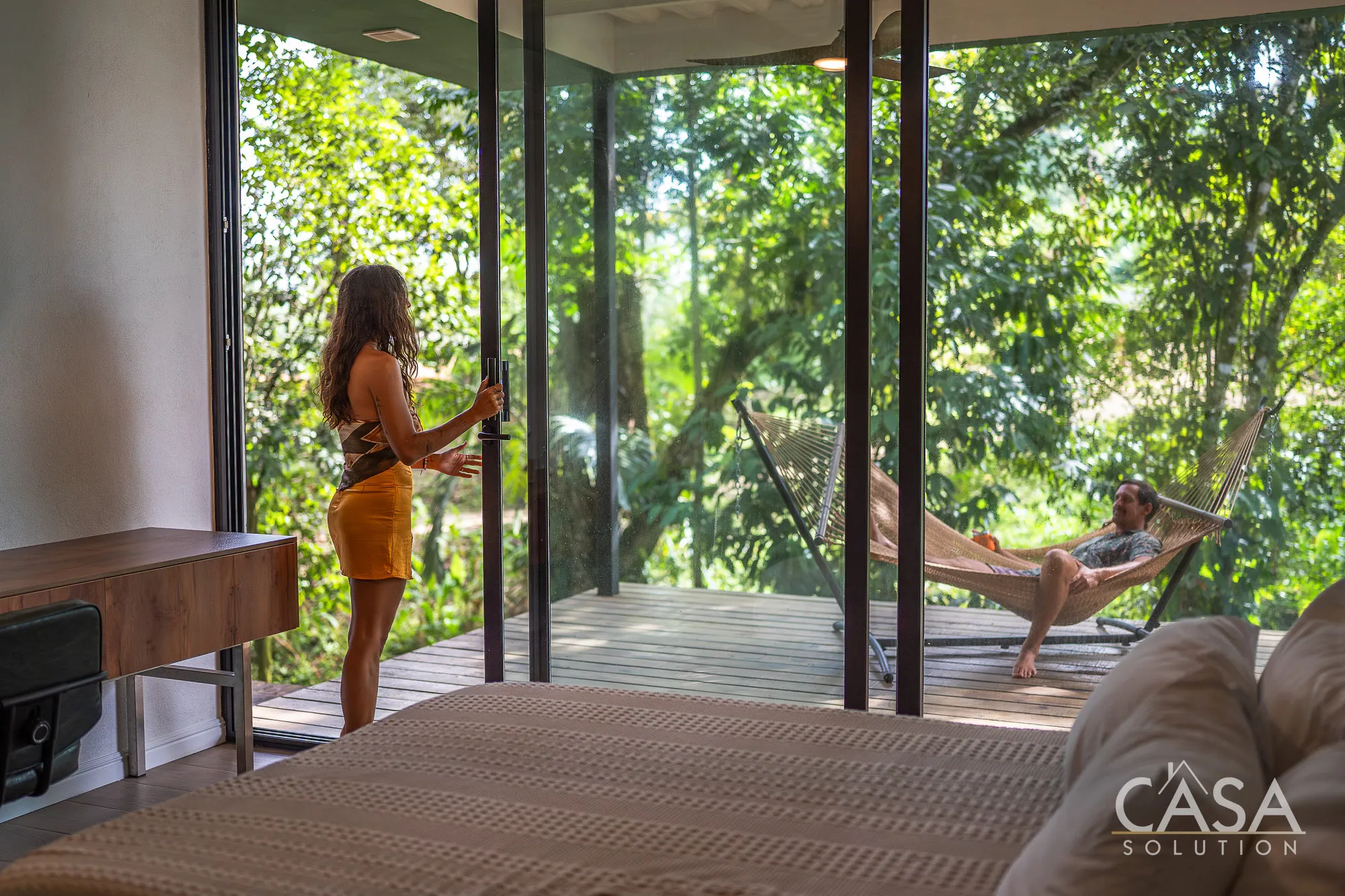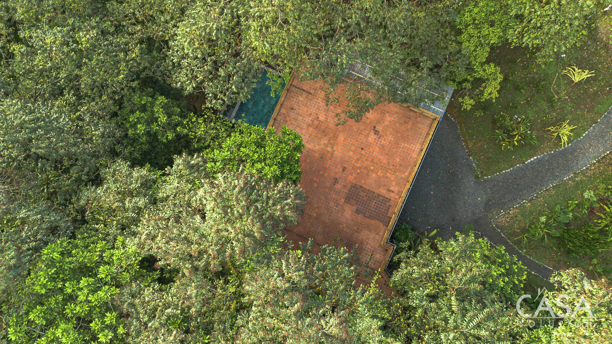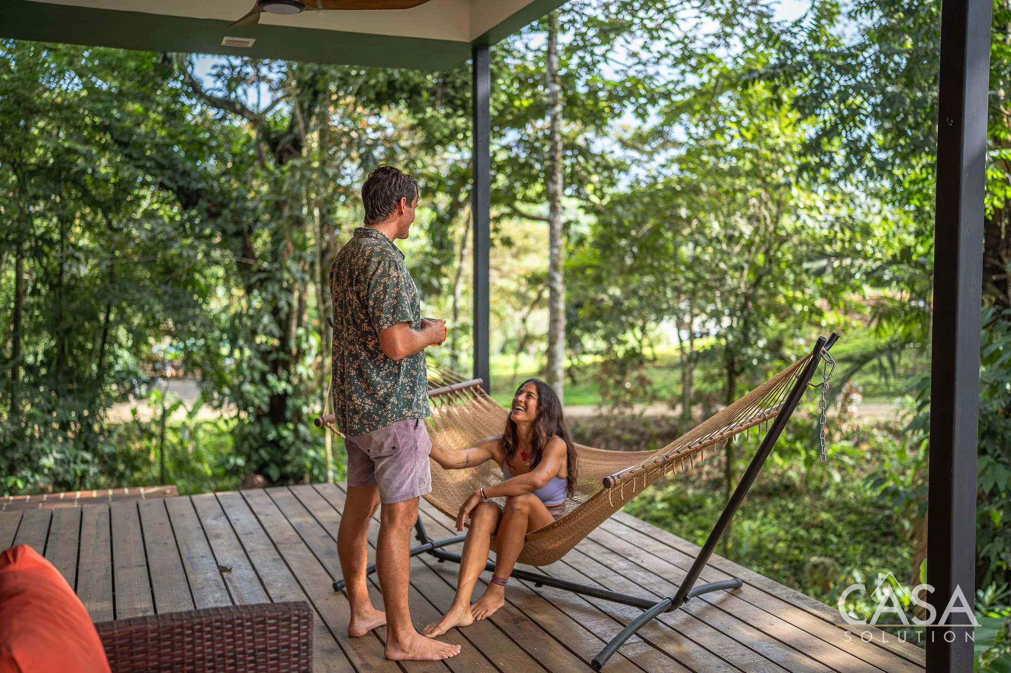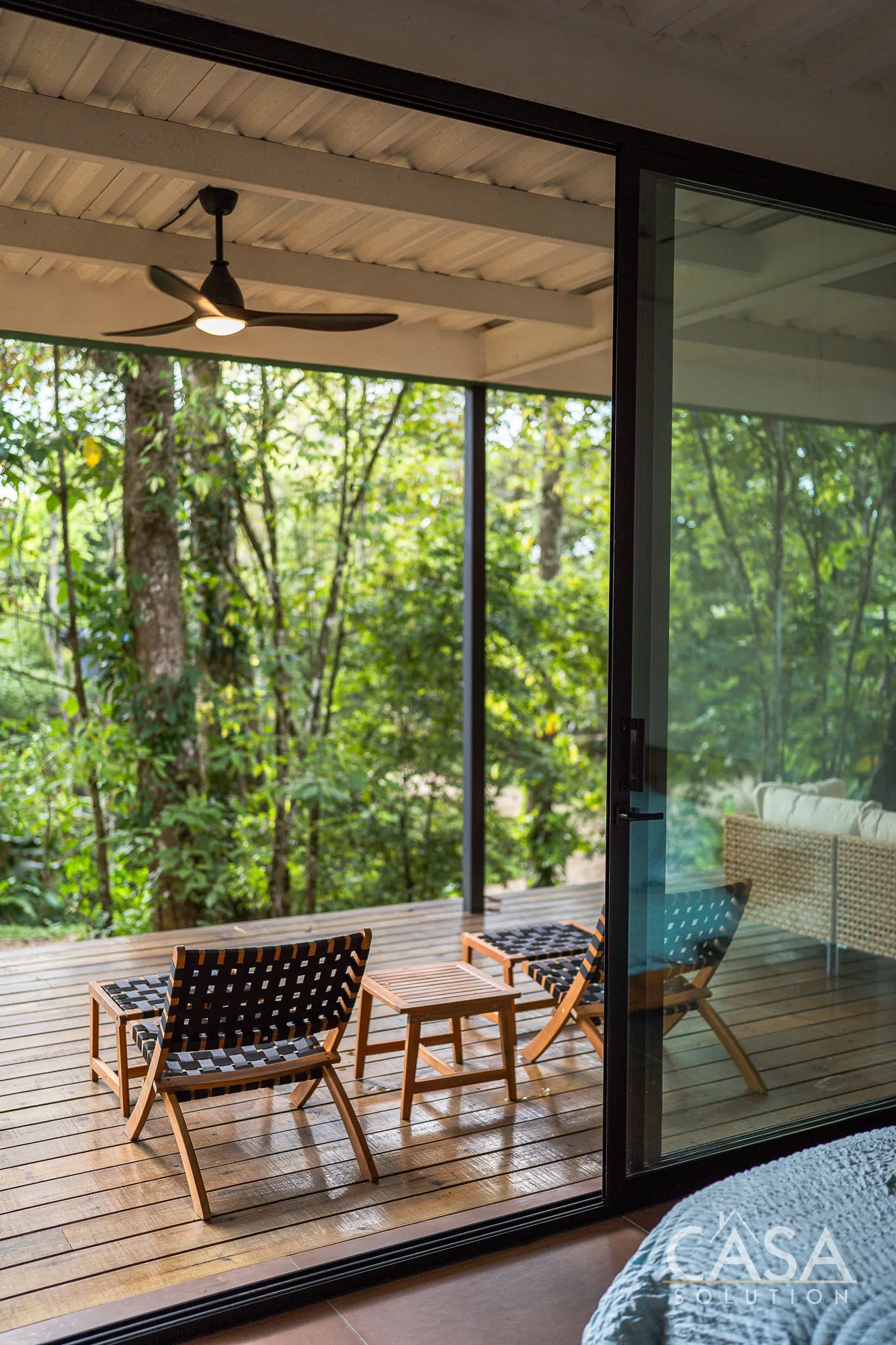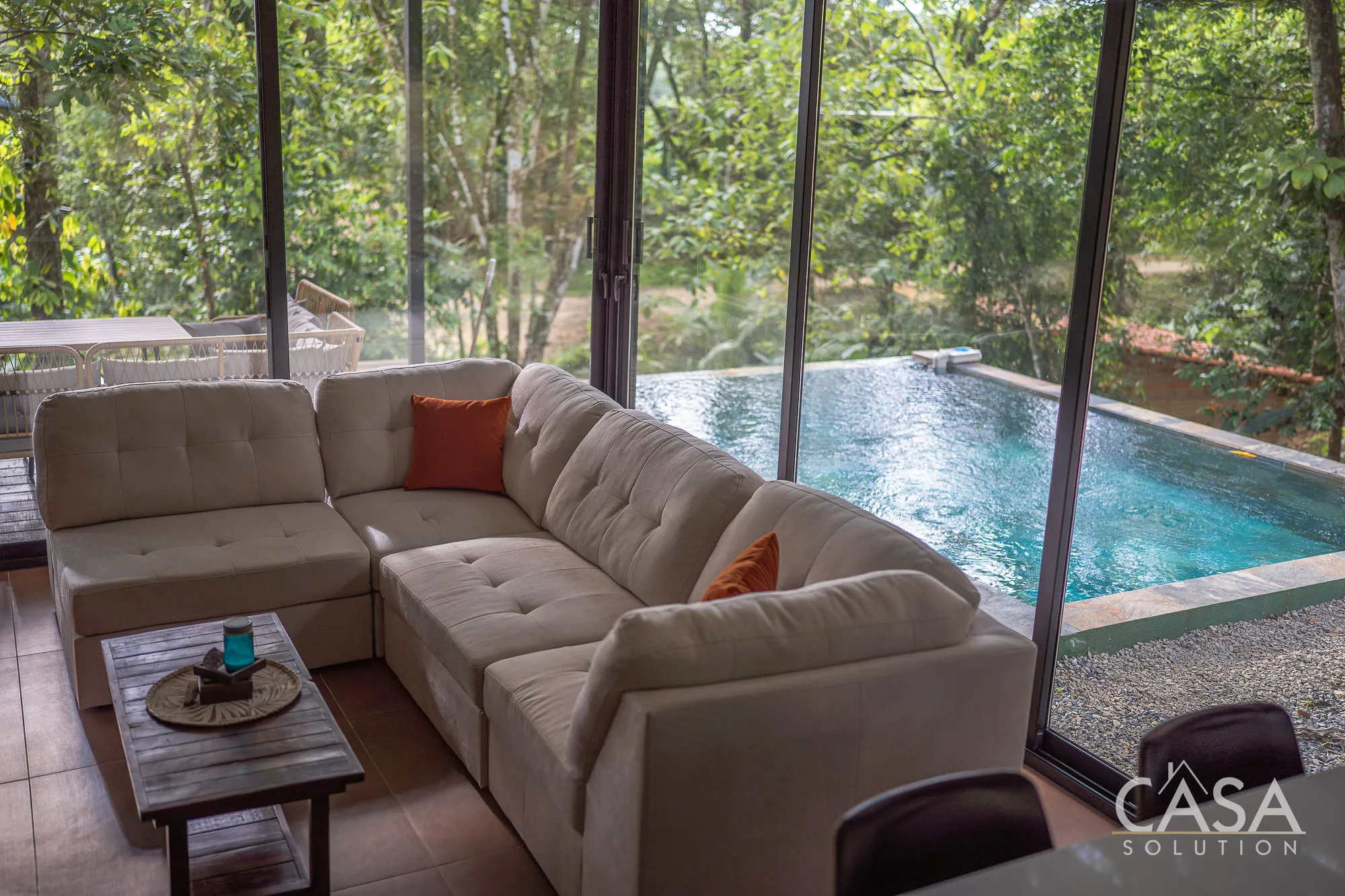 The layout integrates the living space with the exterior deck from the beginning. Covered terraces support year-round use, and private pools face the jungle rather than neighboring structures.