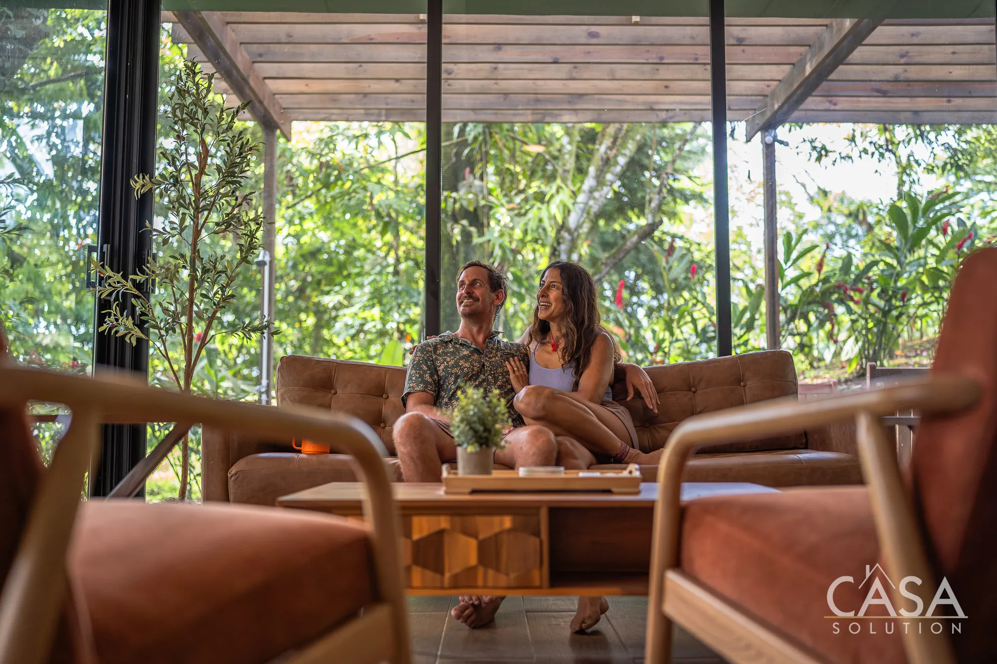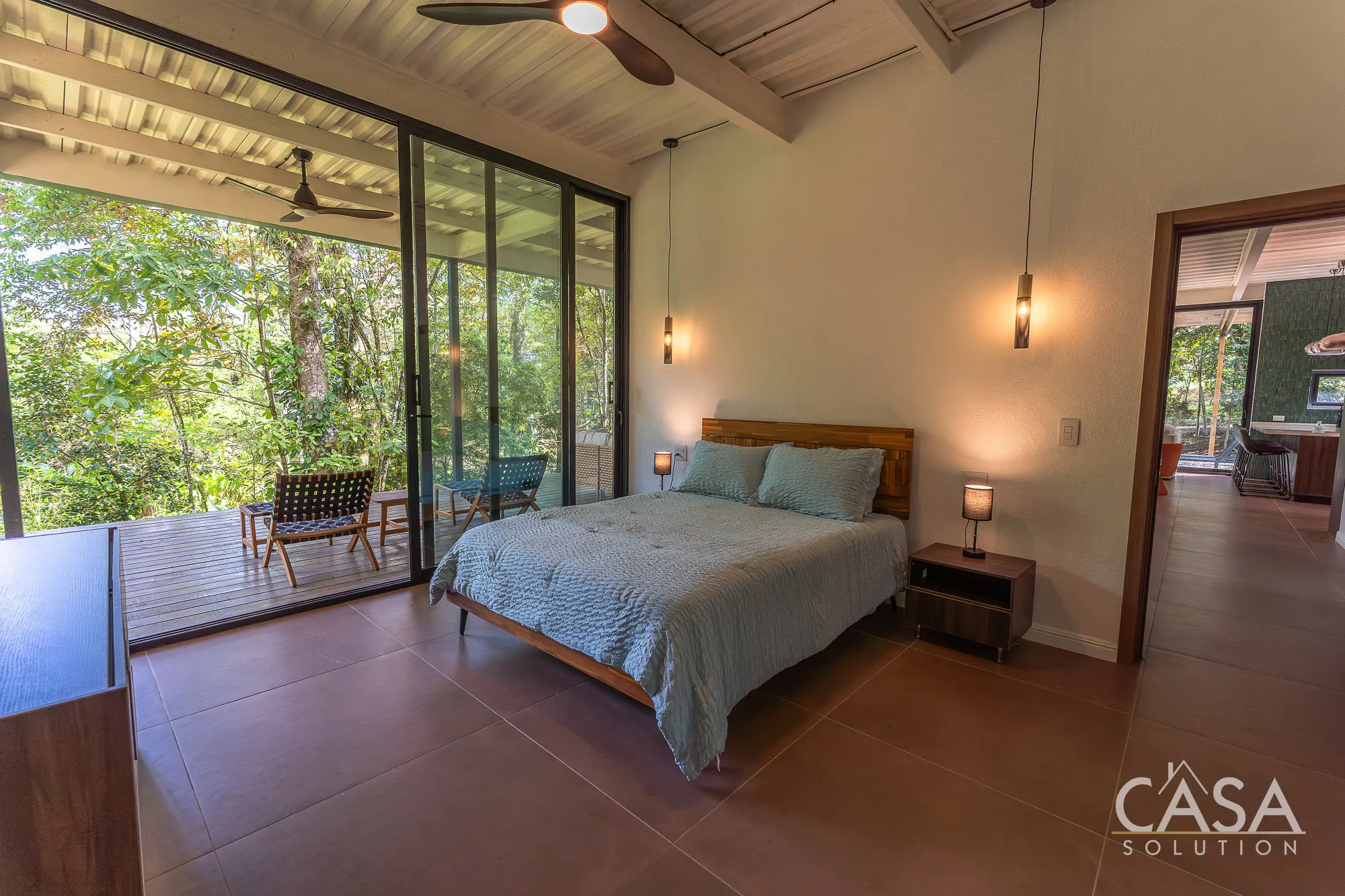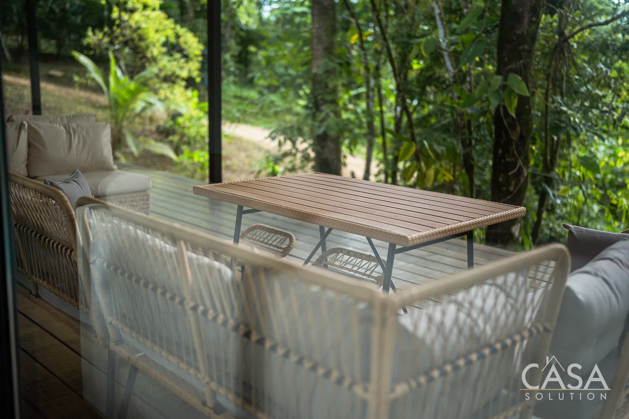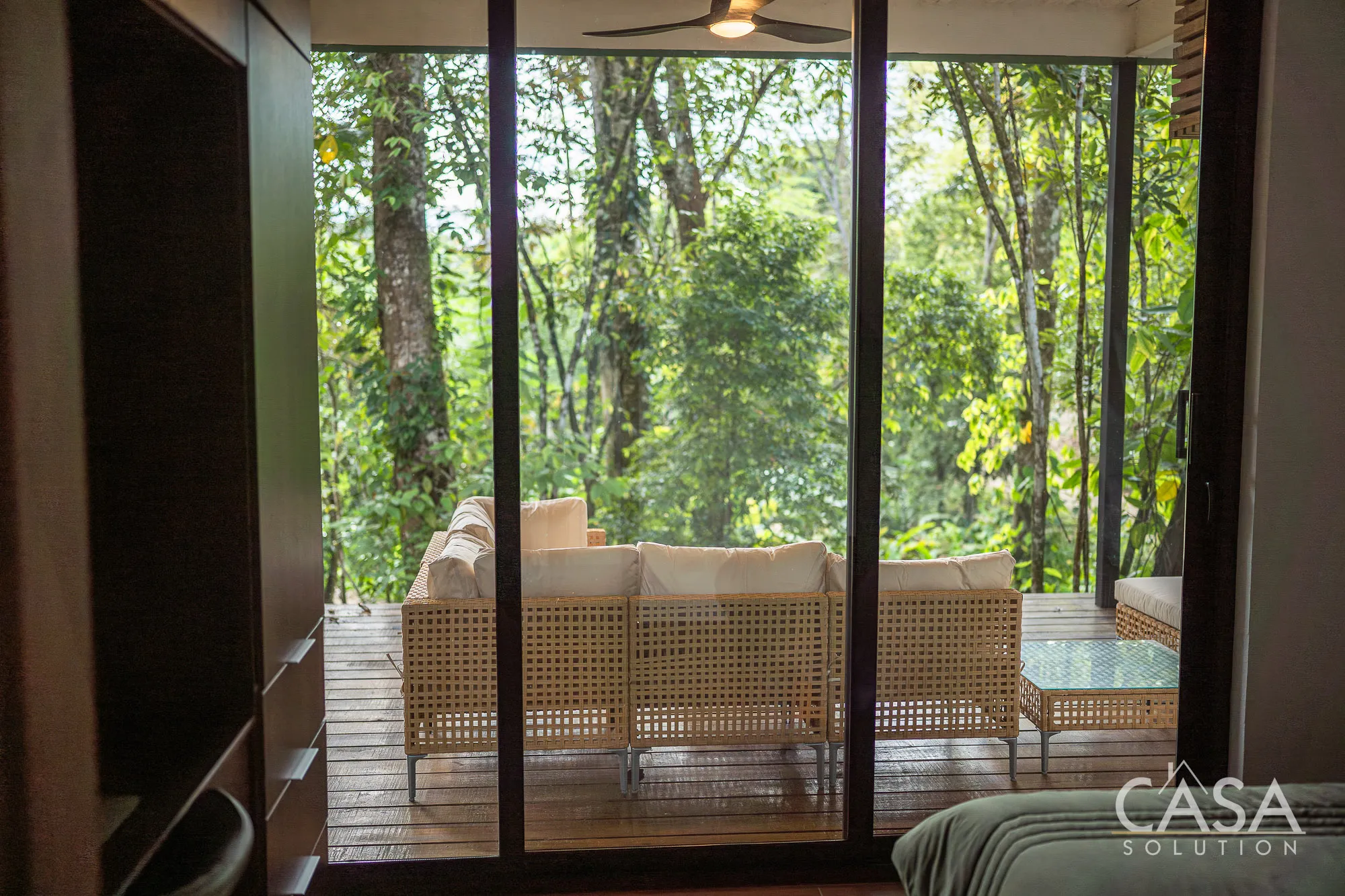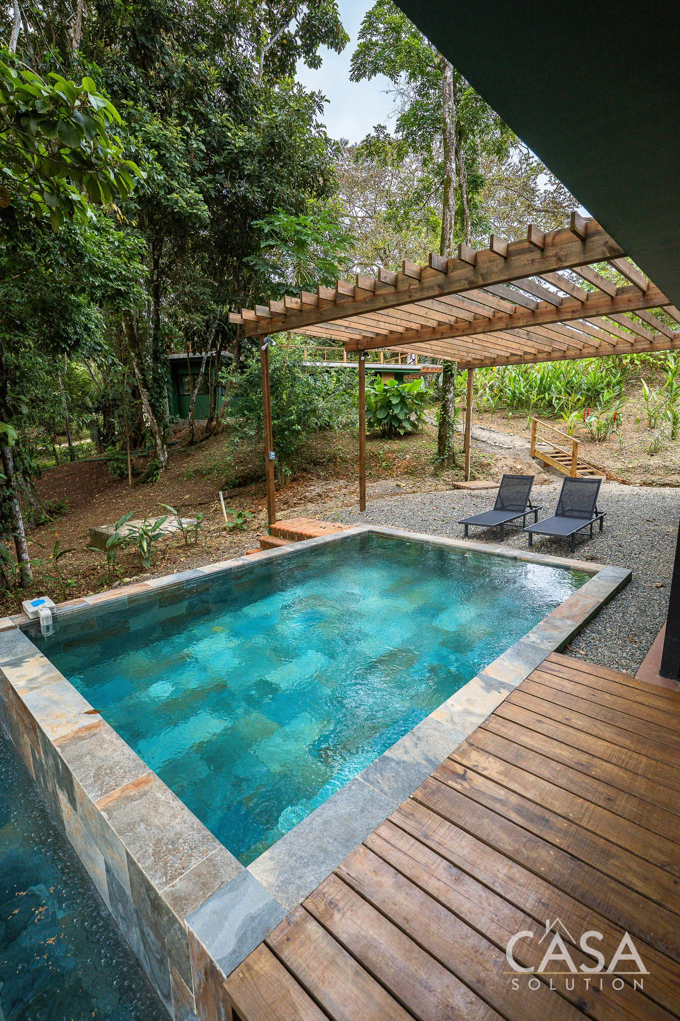 The layout integrates the living space with the exterior deck from the beginning. Covered terraces support year-round use, and private pools face the jungle rather than neighboring structures.