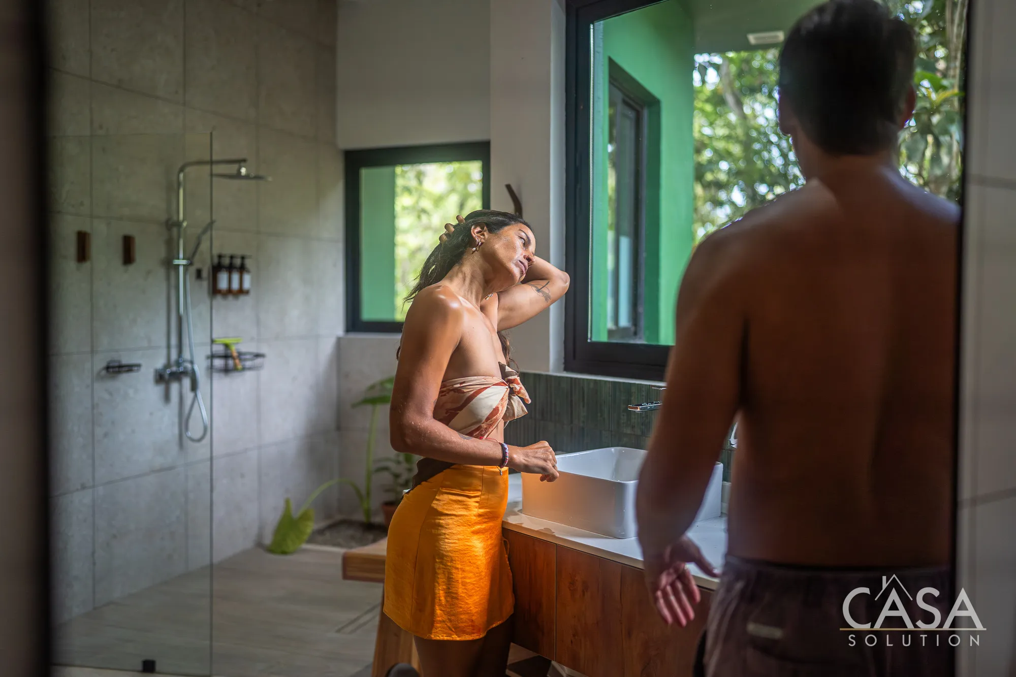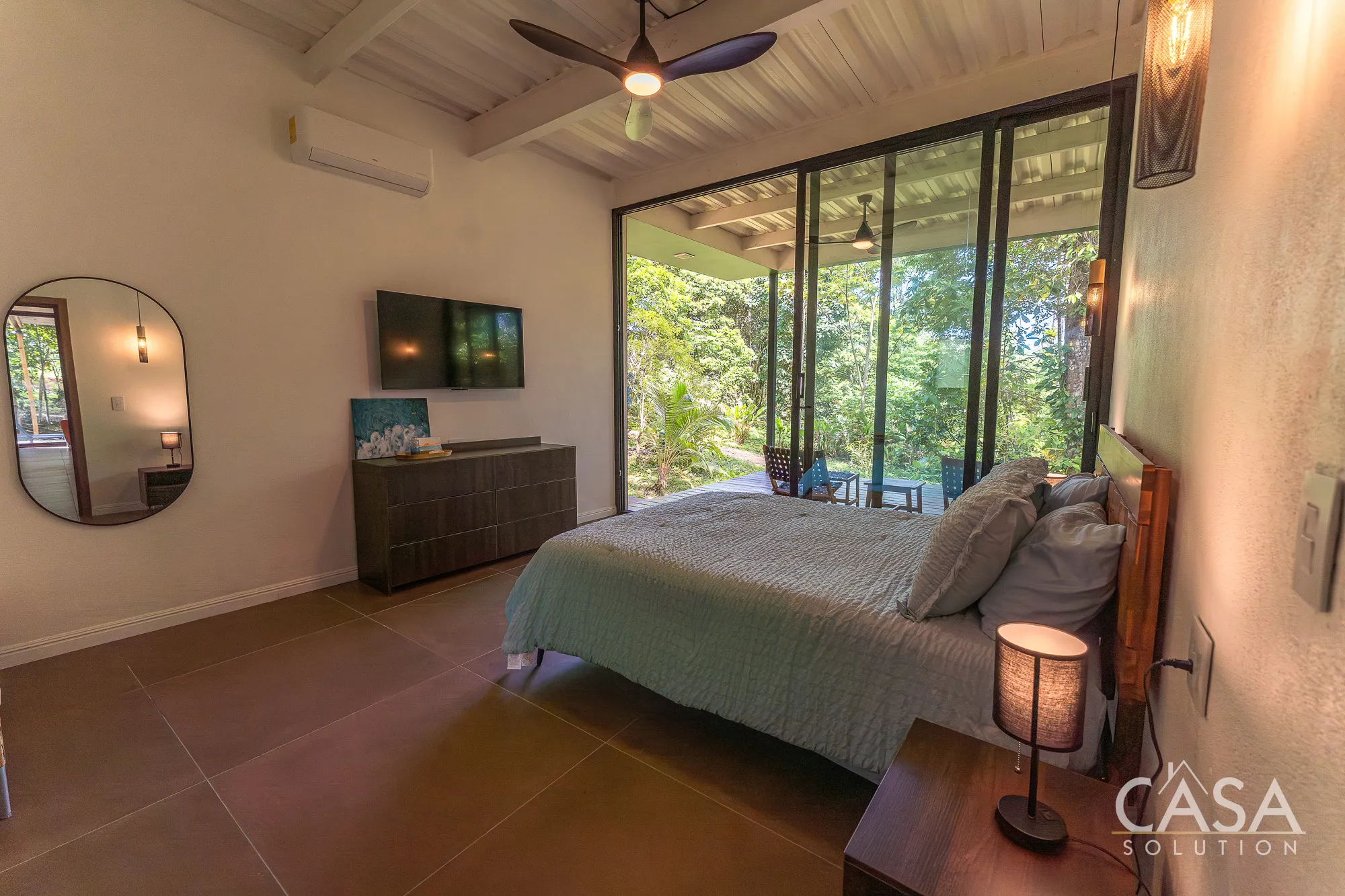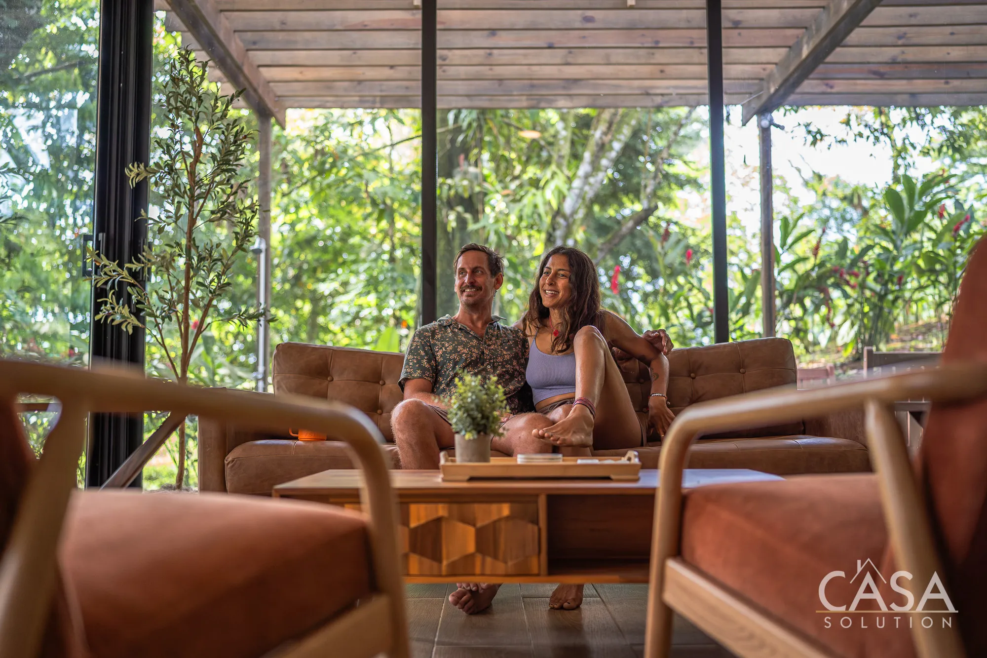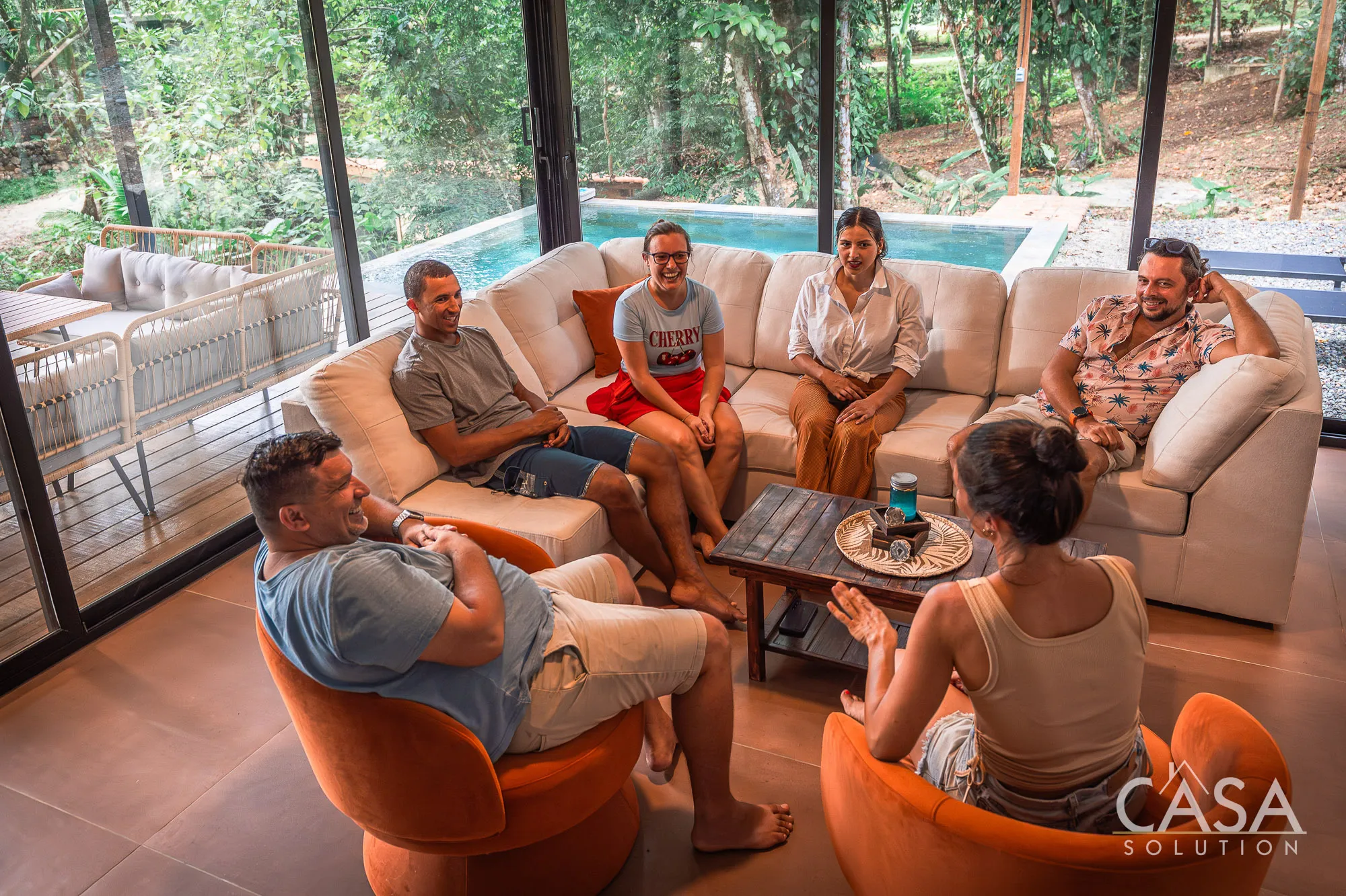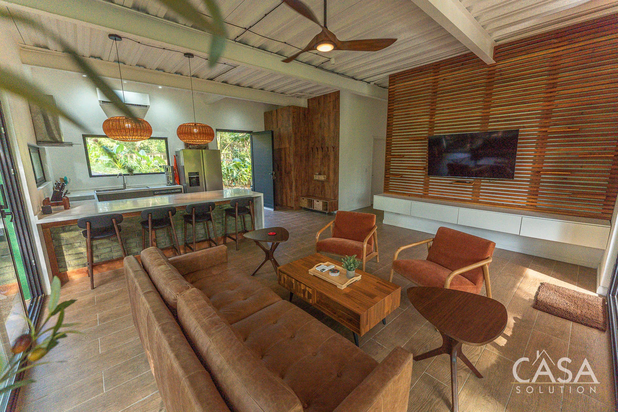The layout integrates the living space with the exterior deck from the beginning. Covered terraces support year-round use, and private pools face the jungle rather than neighboring structures.