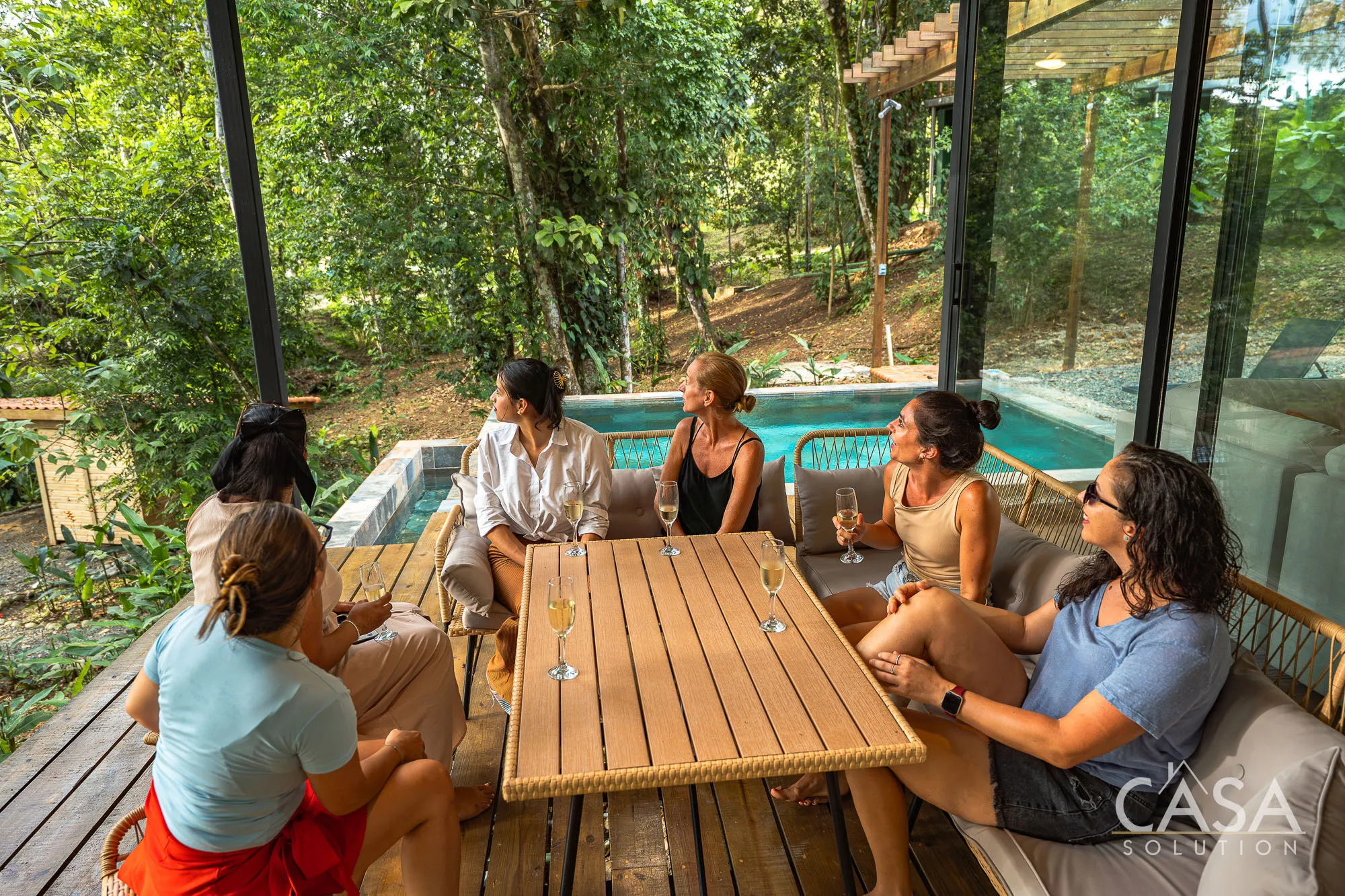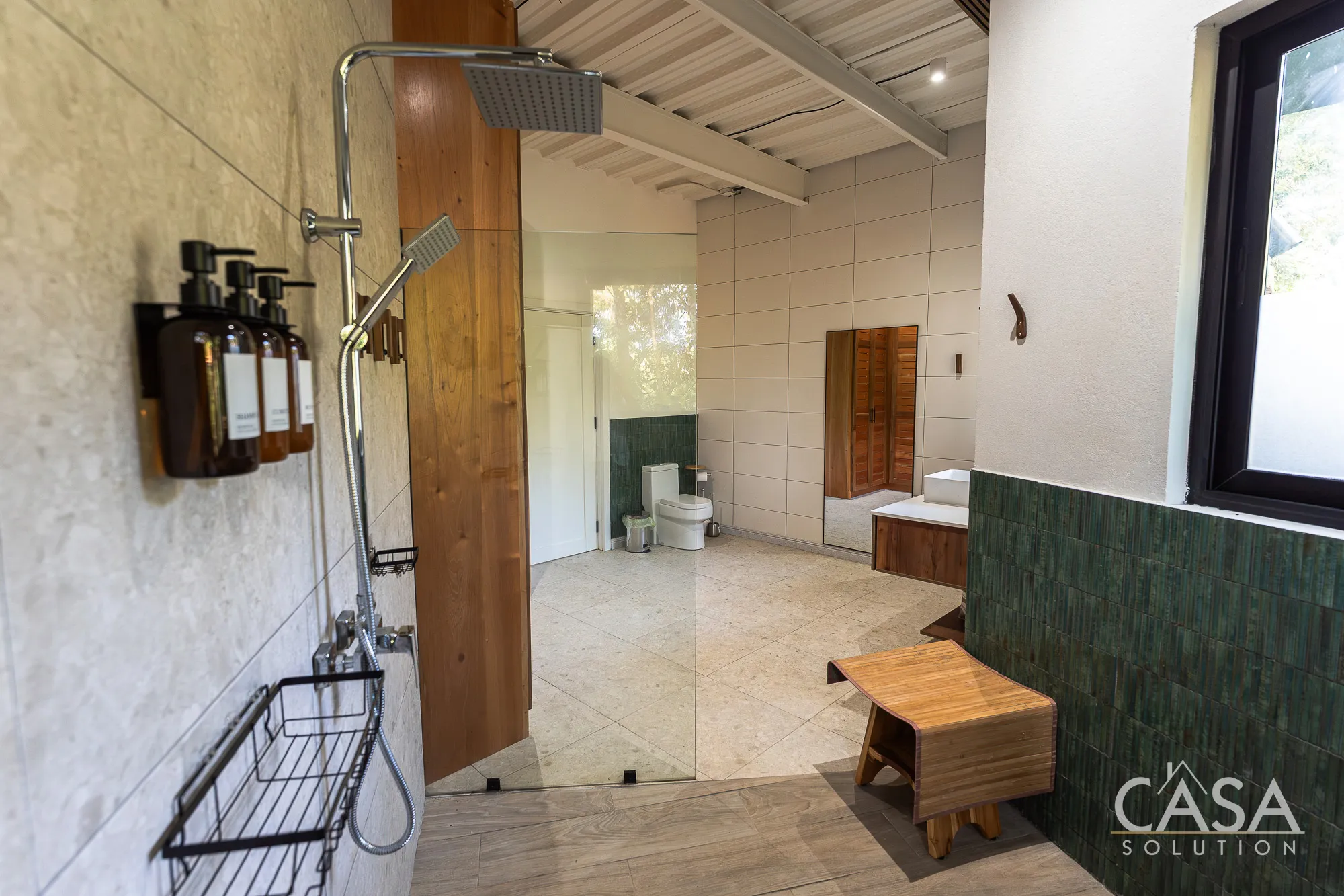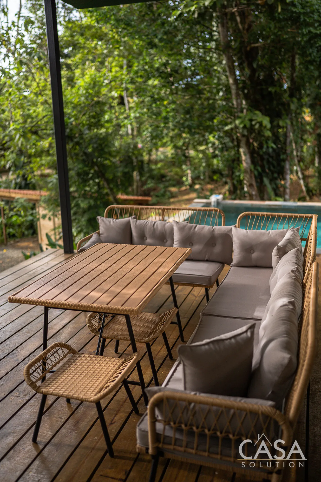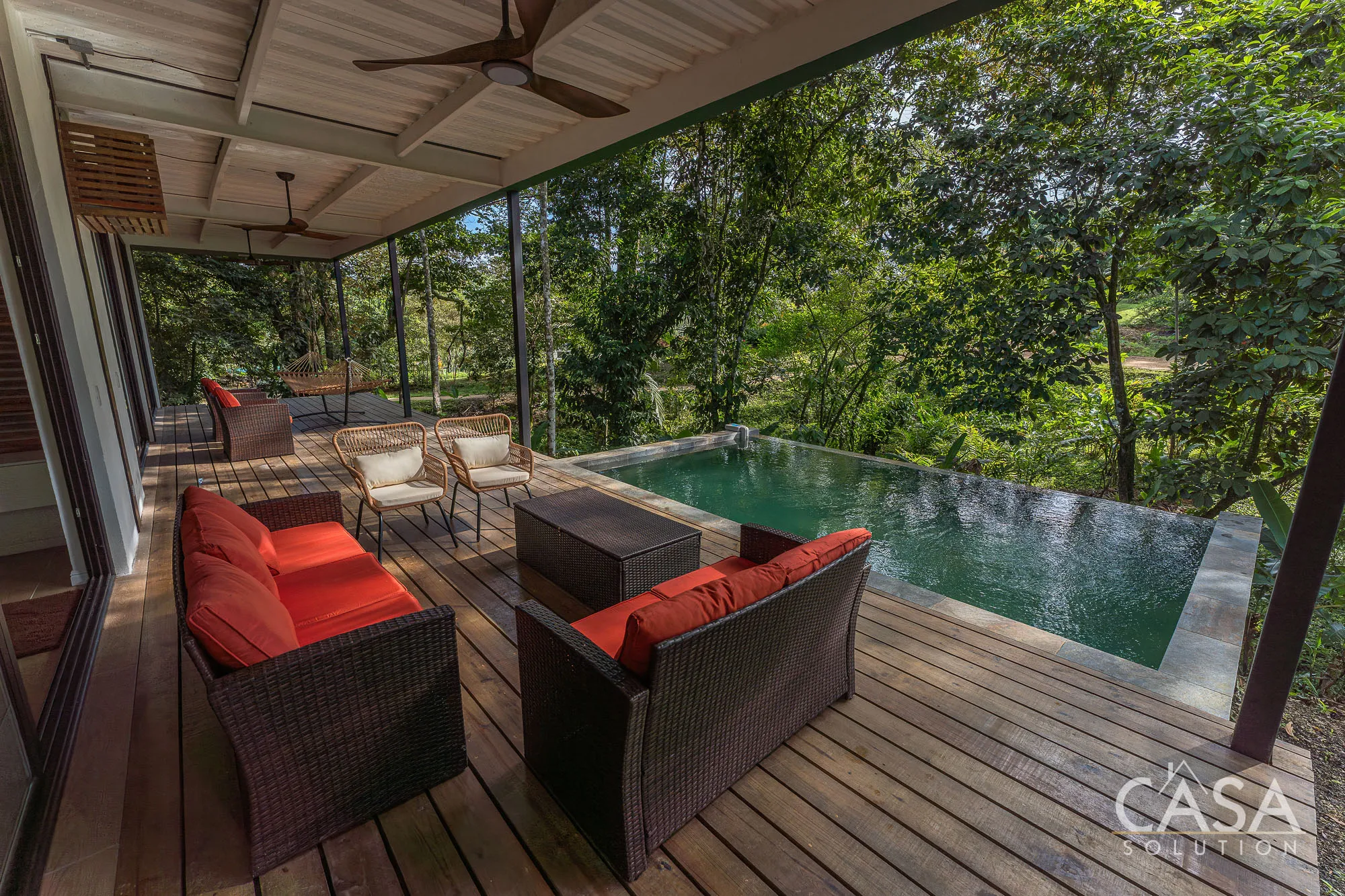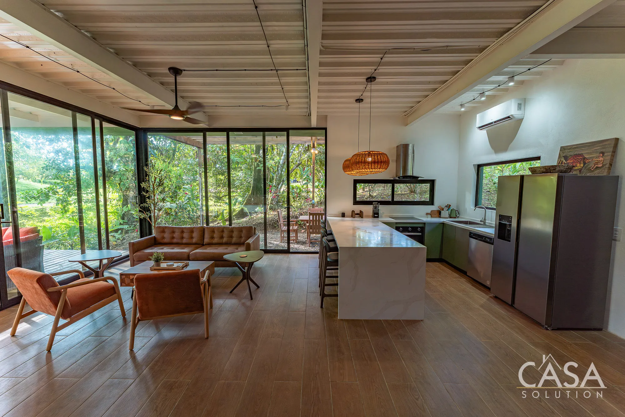 The layout integrates the living space with the exterior deck from the beginning. Covered terraces support year-round use, and private pools face the jungle rather than neighboring structures.