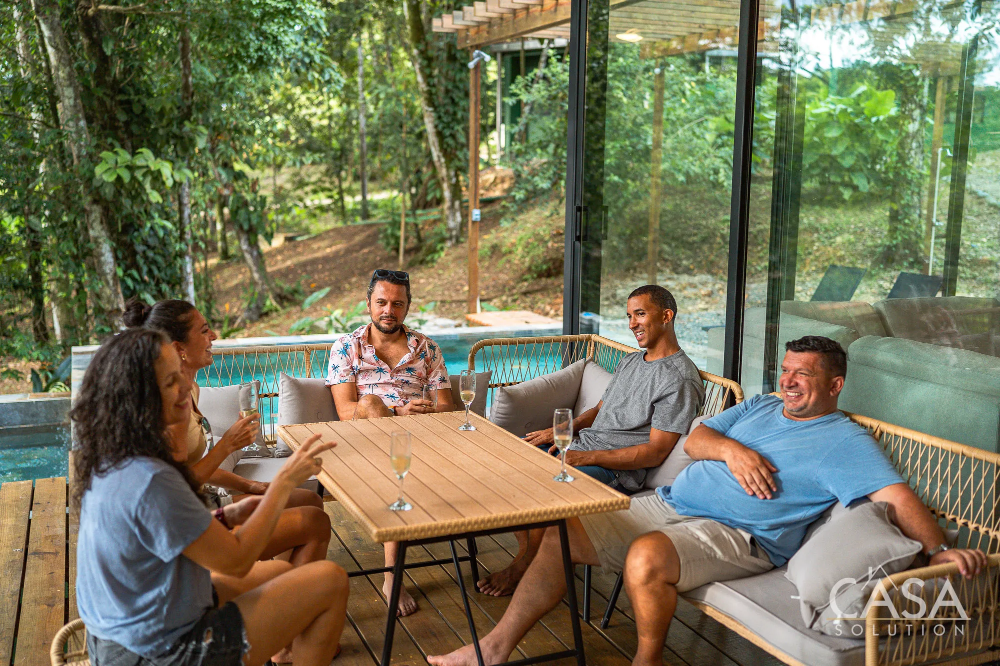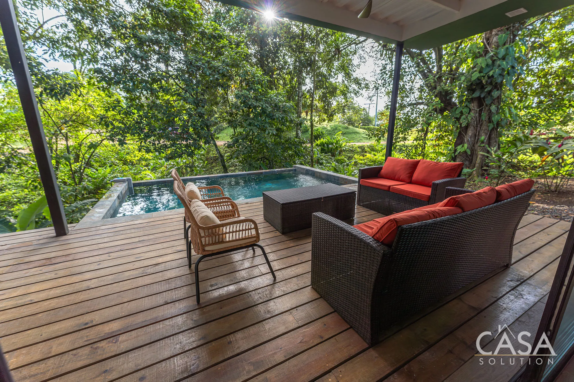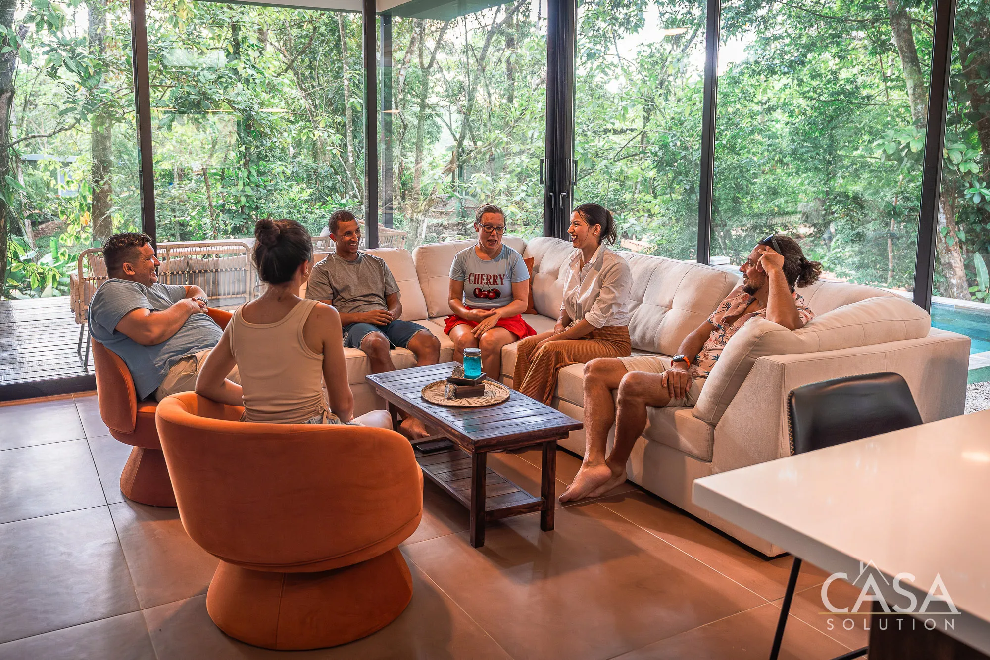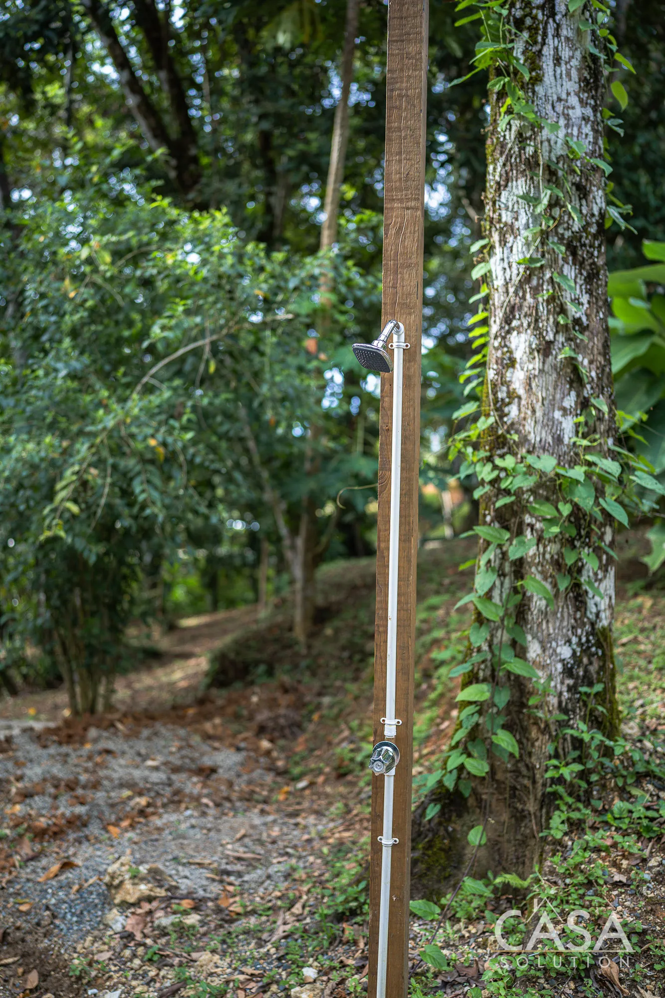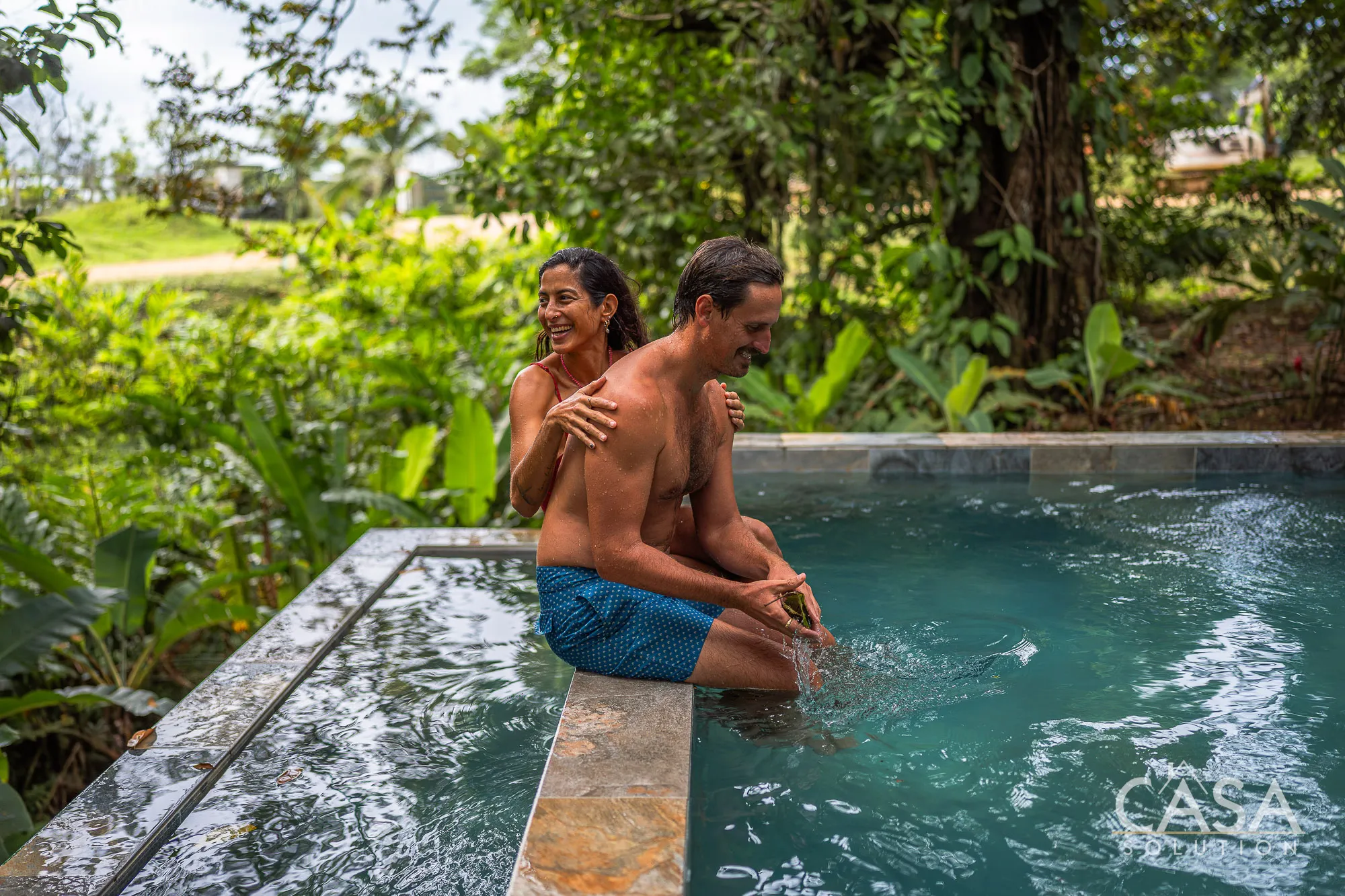 The layout integrates the living space with the exterior deck from the beginning. Covered terraces support year-round use, and private pools face the jungle rather than neighboring structures.