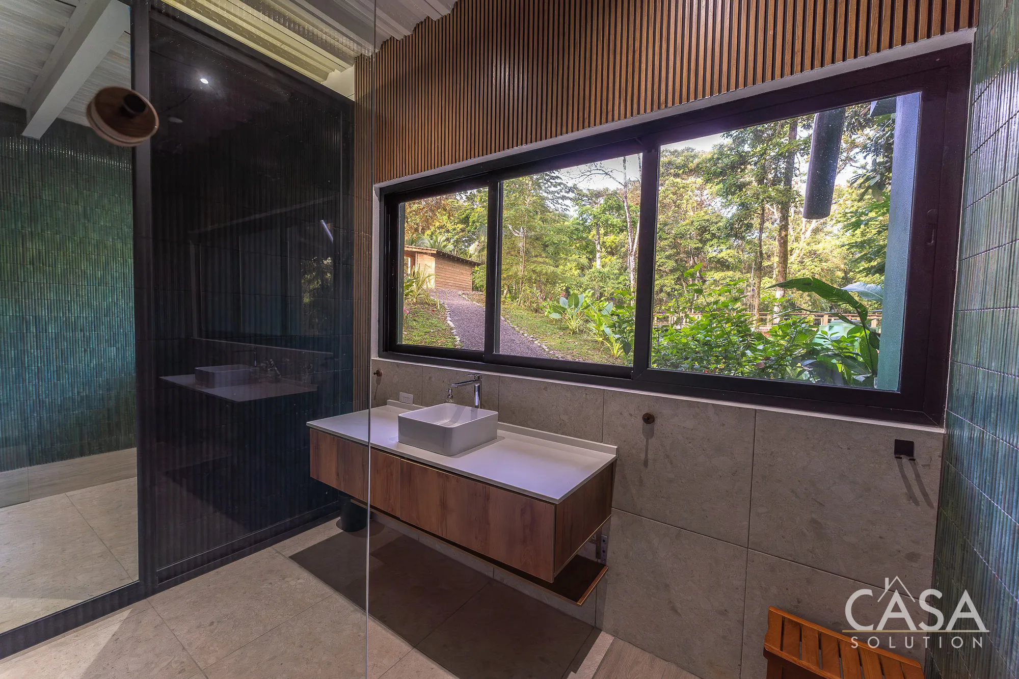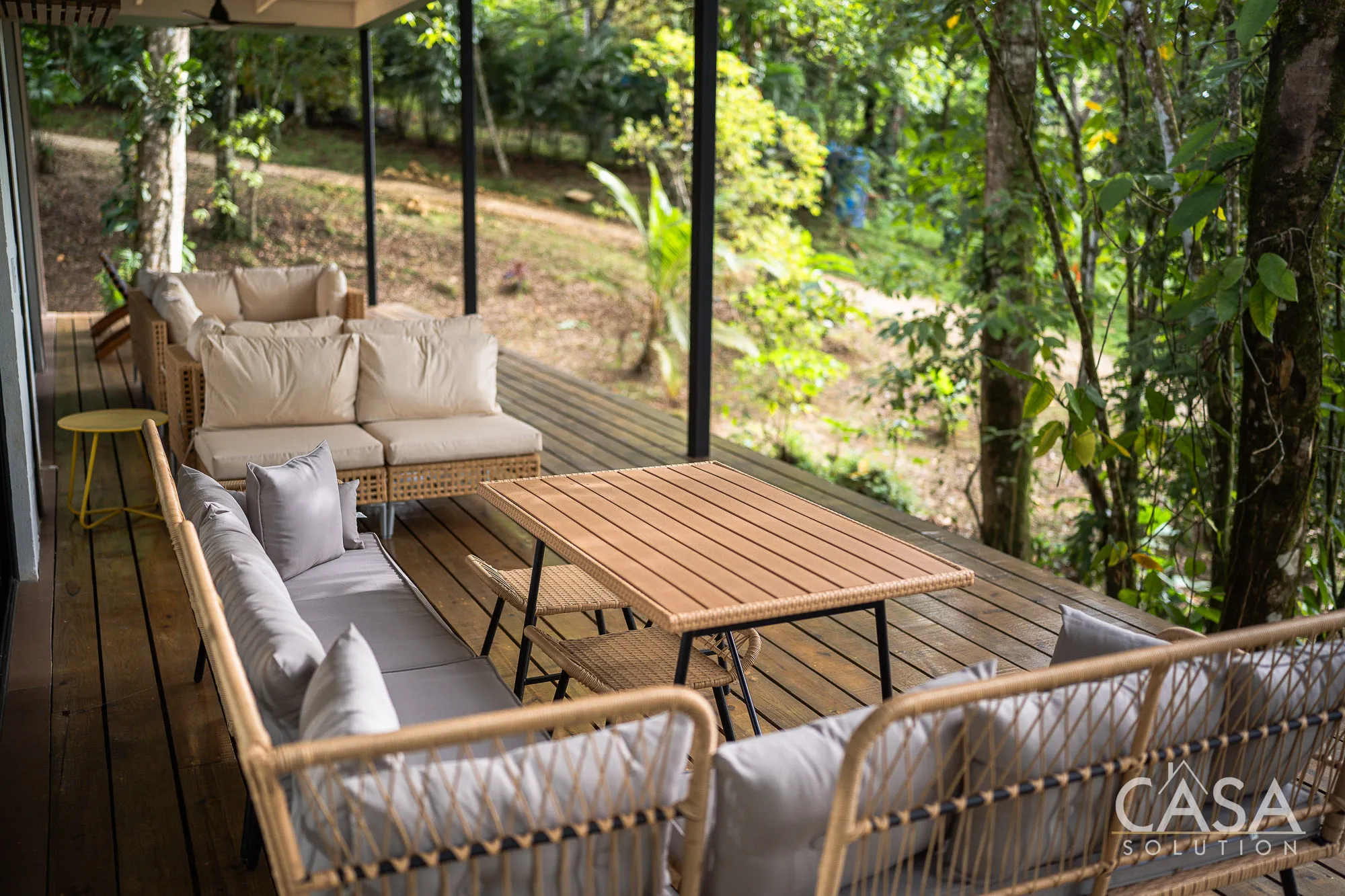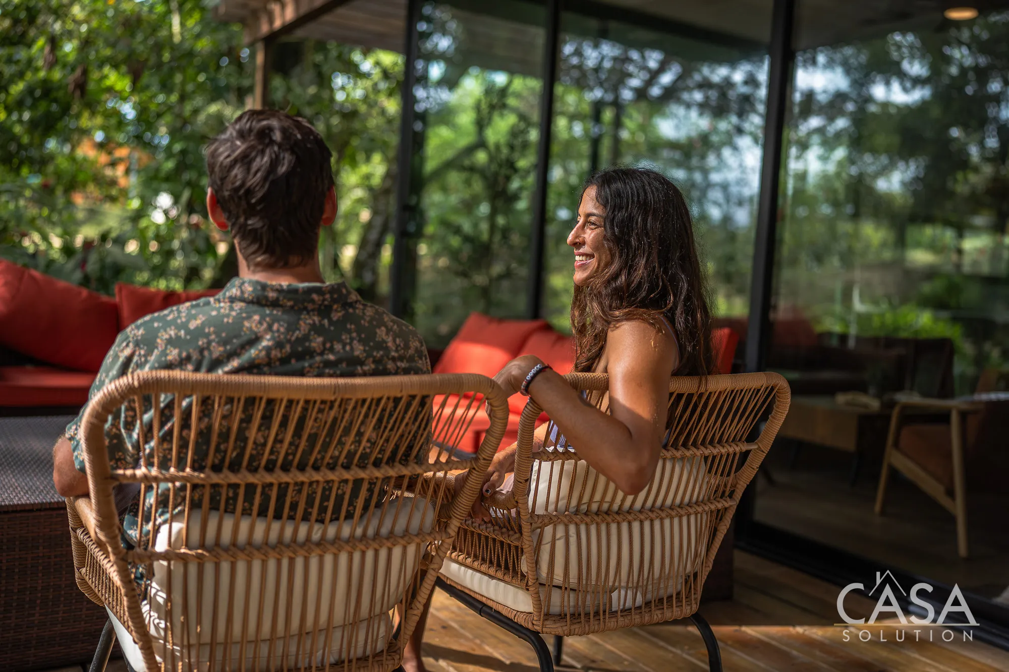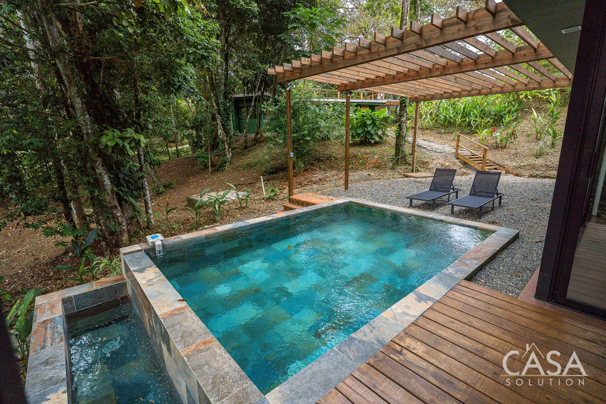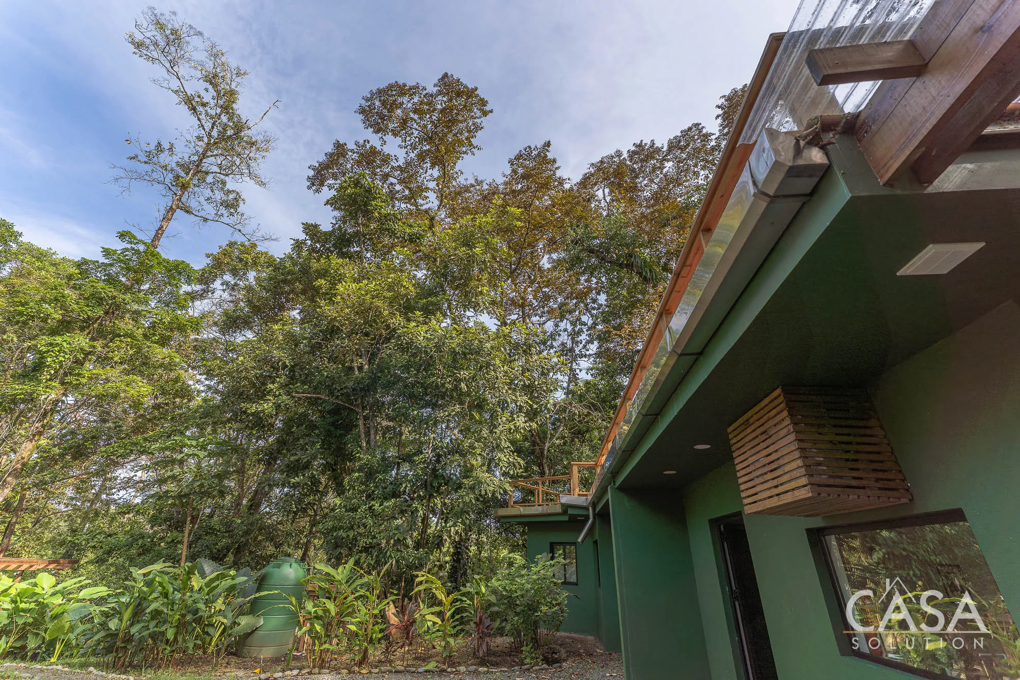 The layout integrates the living space with the exterior deck from the beginning. Covered terraces support year-round use, and private pools face the jungle rather than neighboring structures.