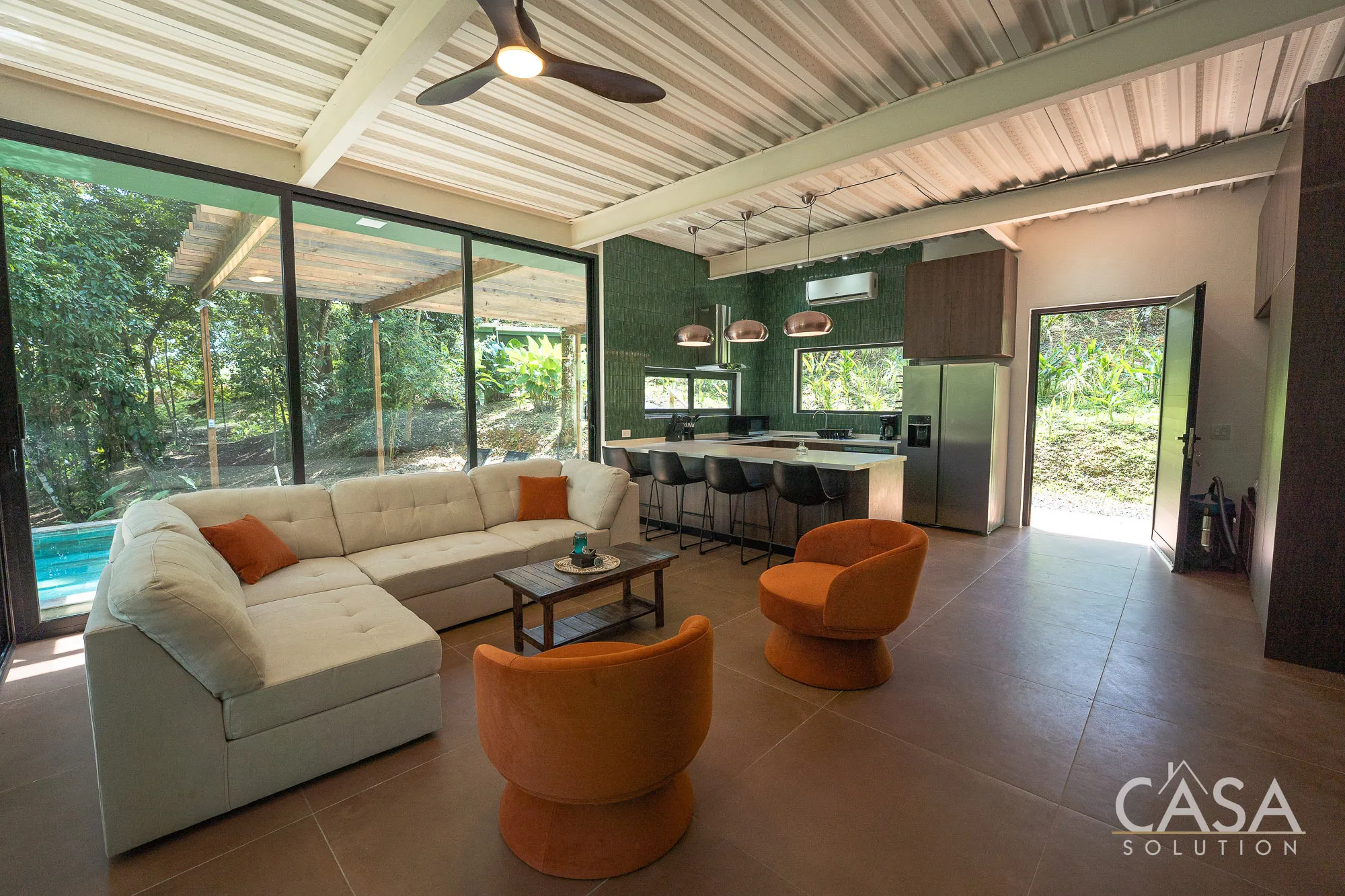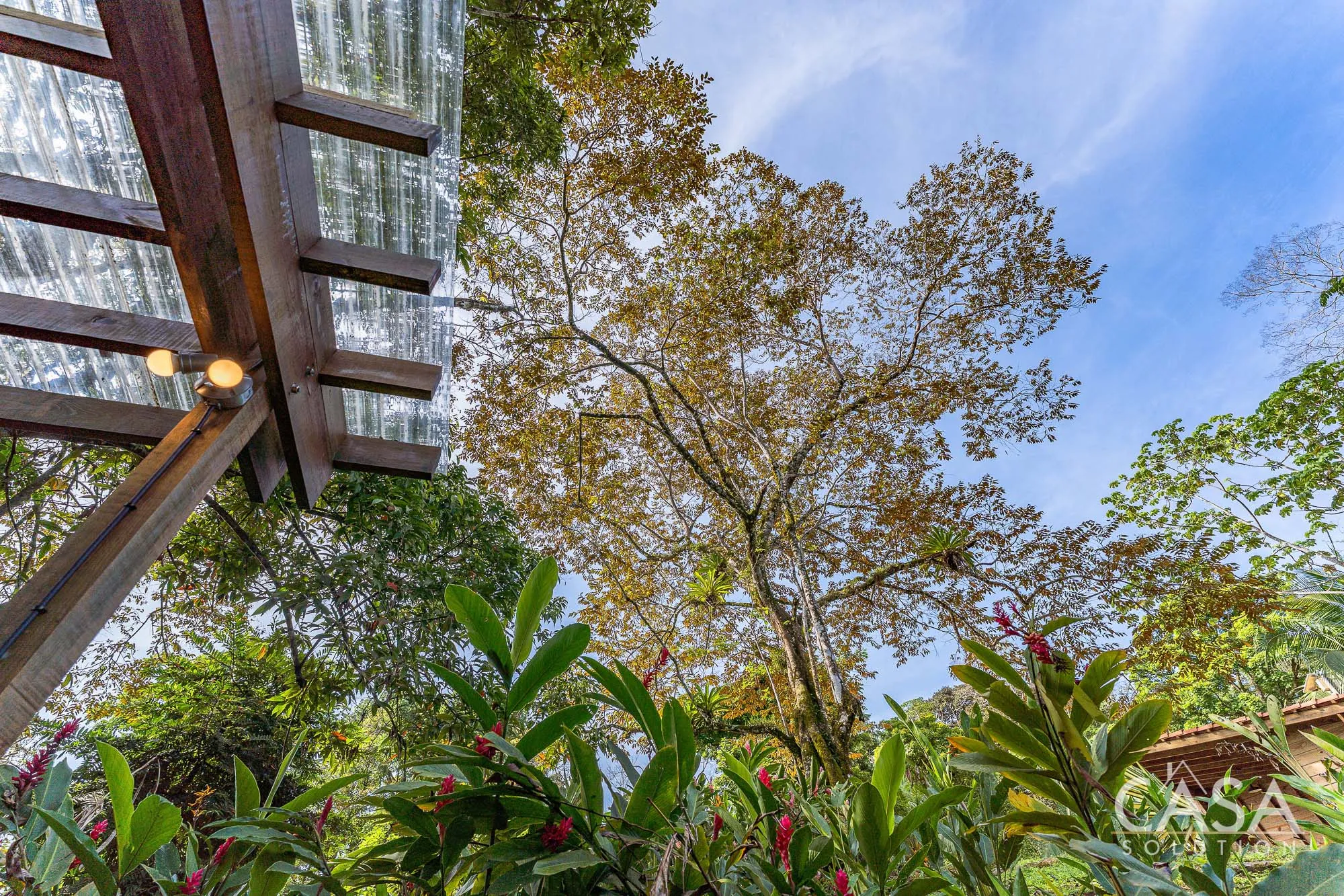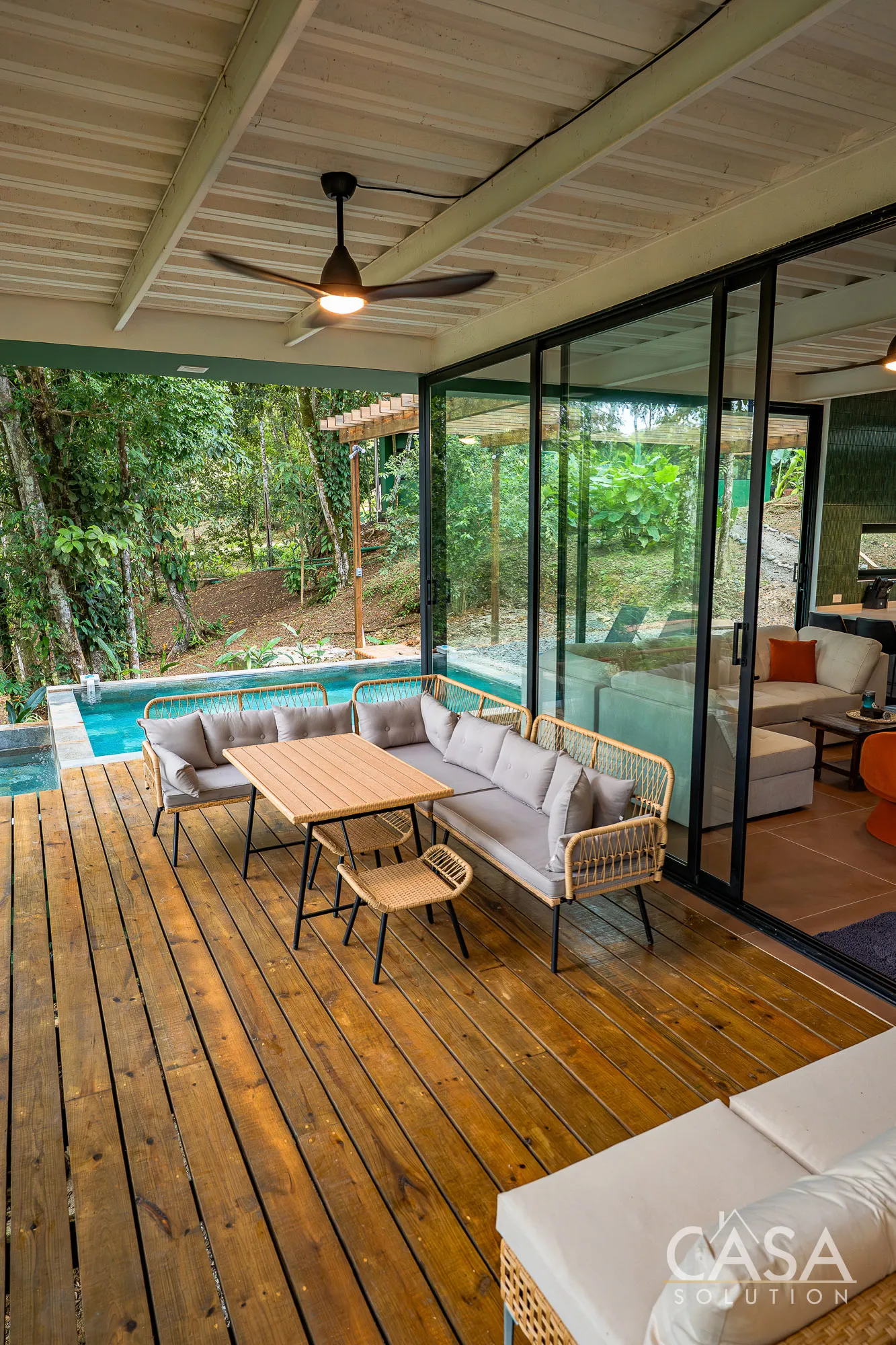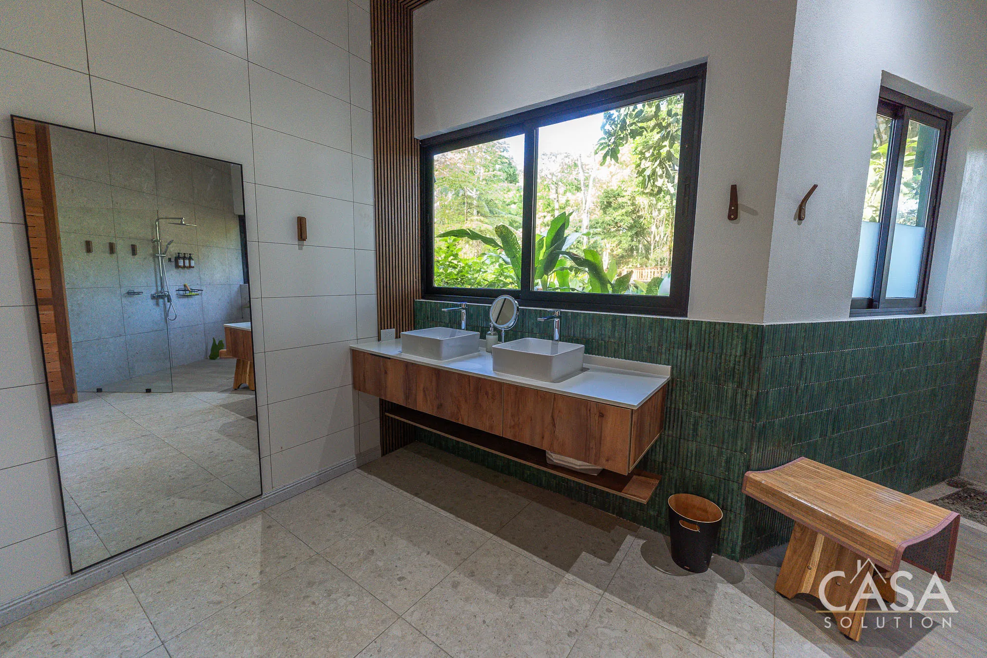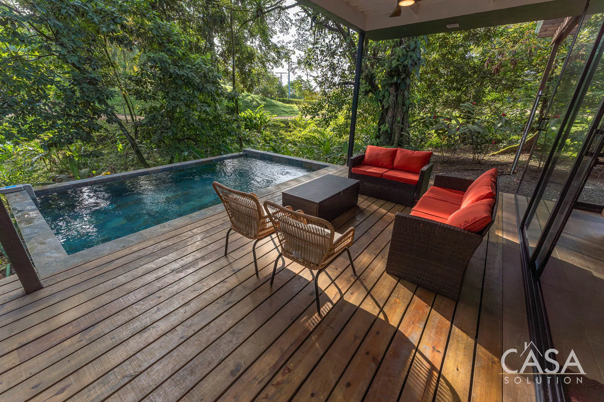 The layout integrates the living space with the exterior deck from the beginning. Covered terraces support year-round use, and private pools face the jungle rather than neighboring structures.