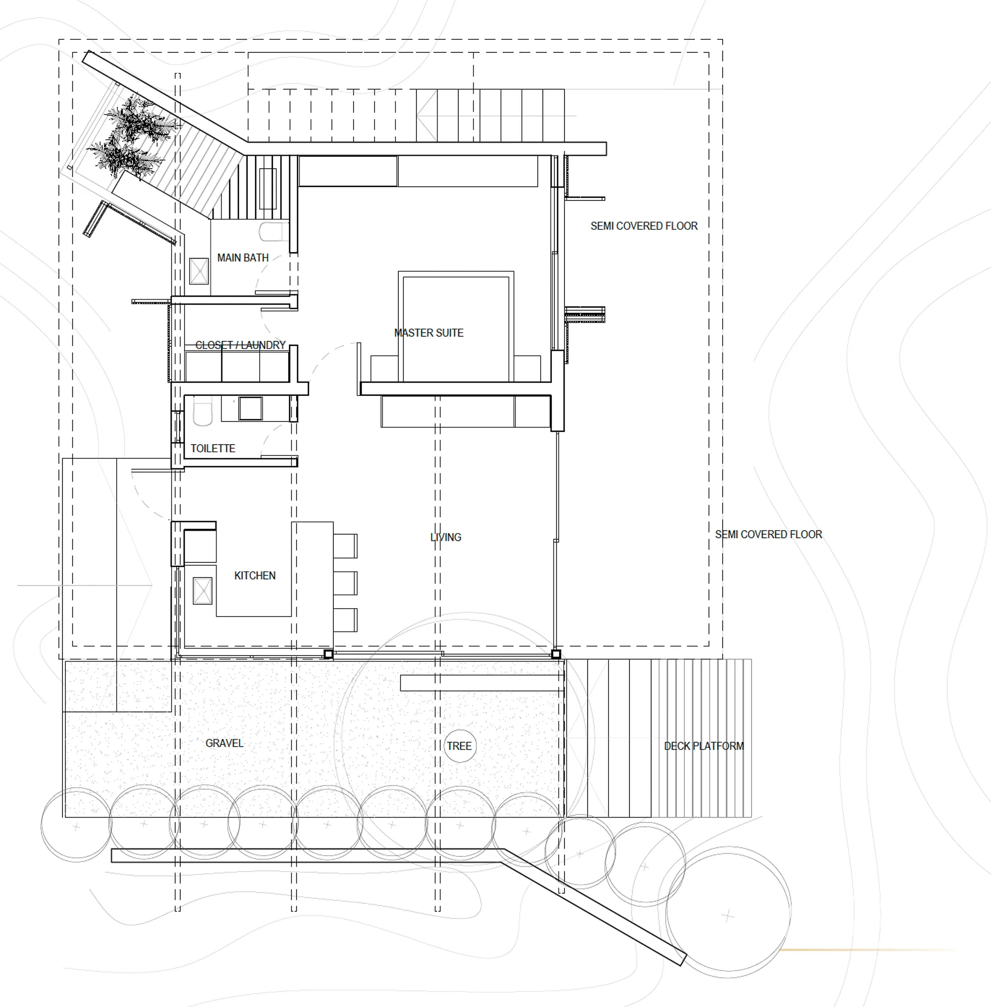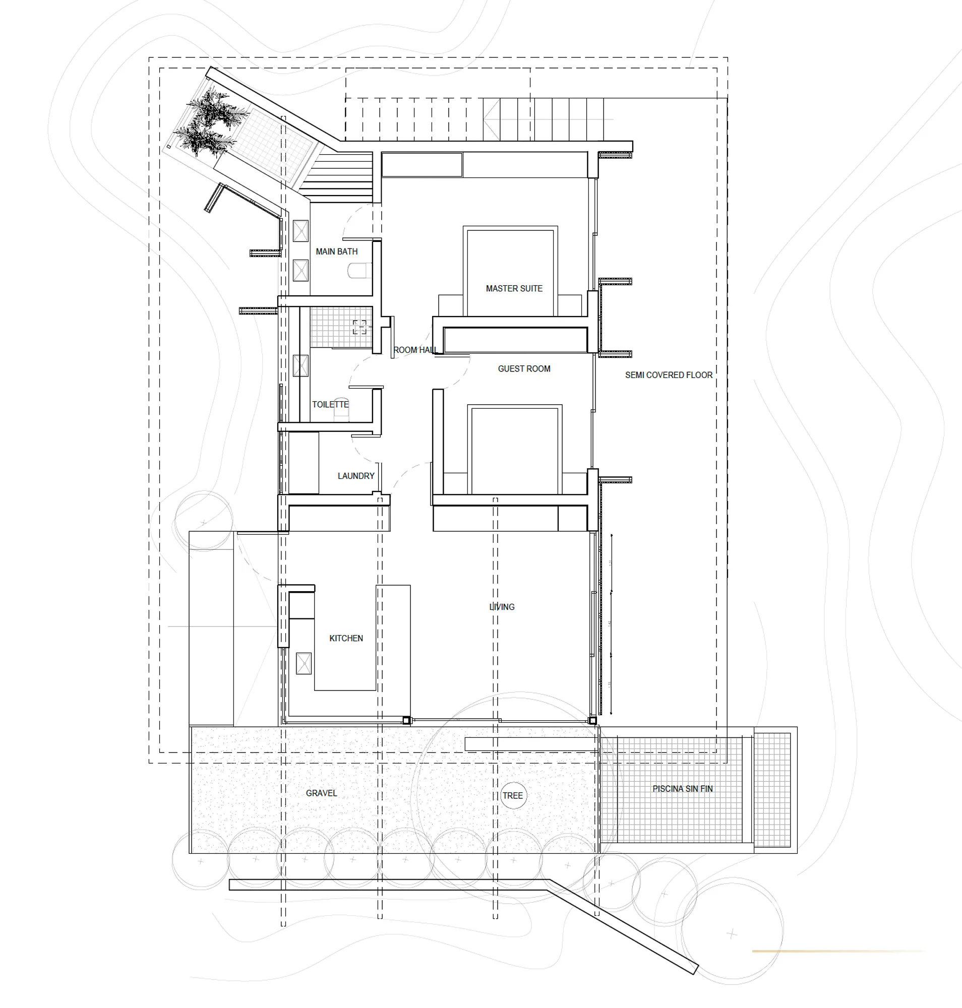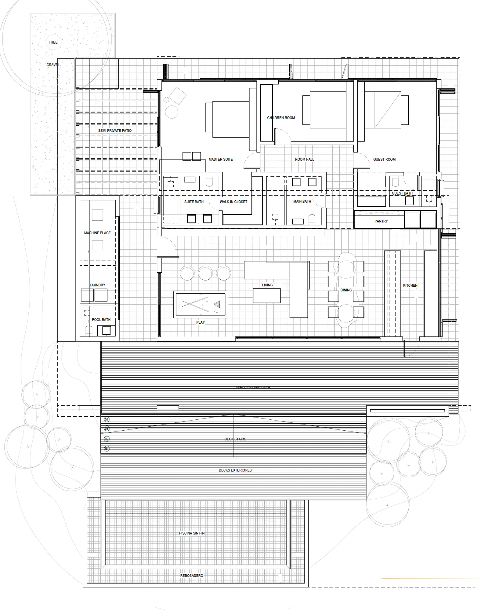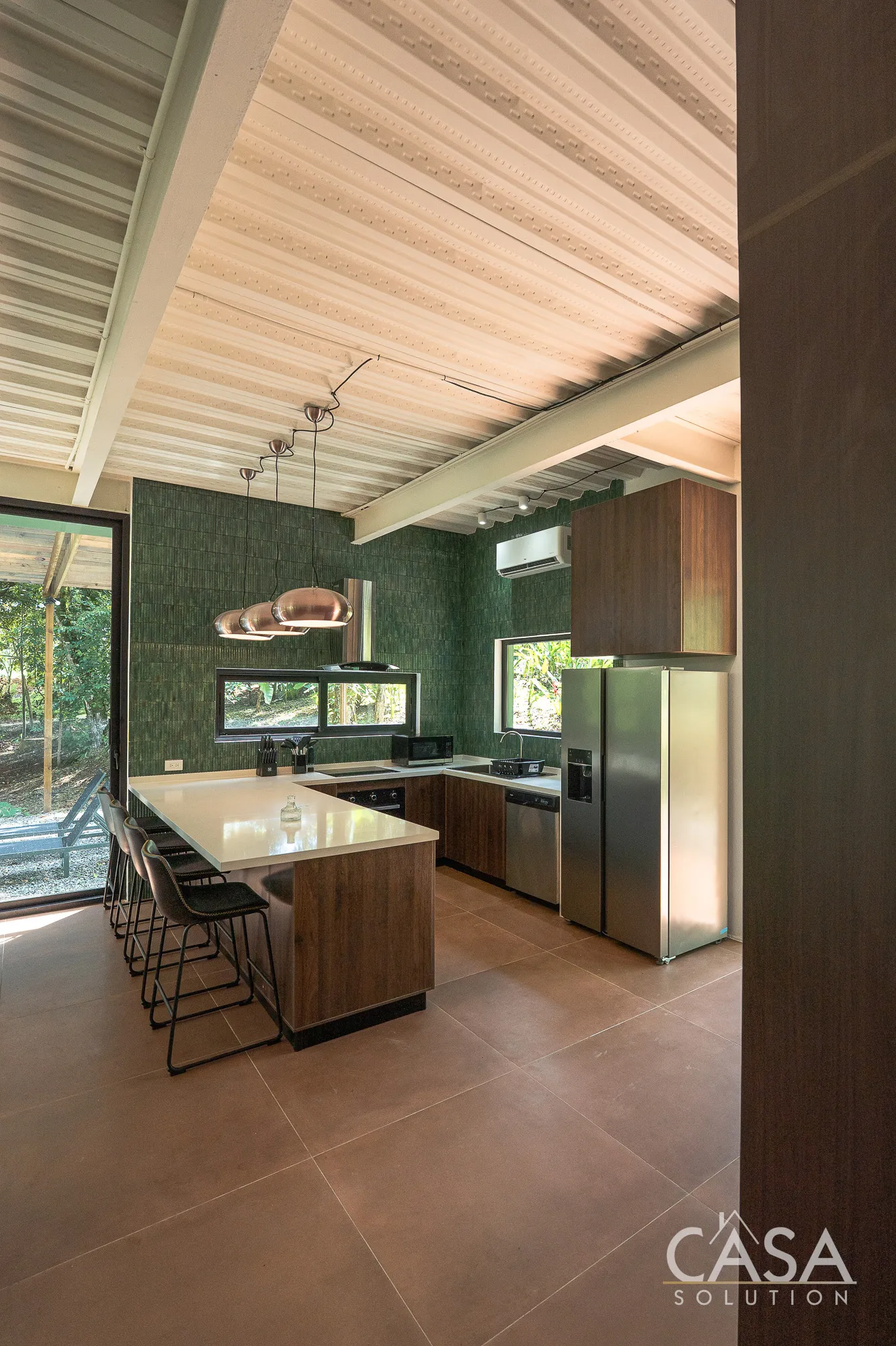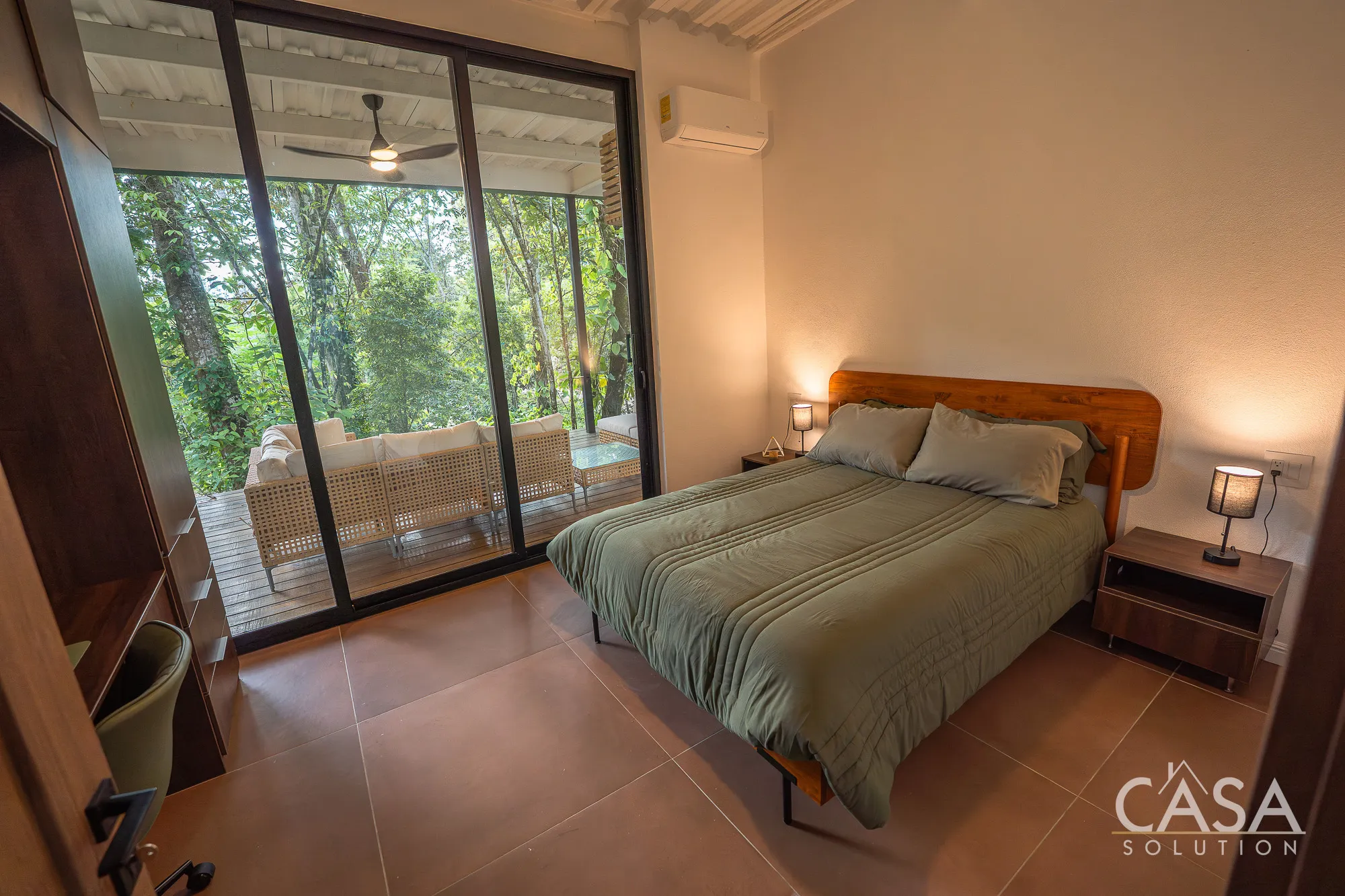 The layout integrates the living space with the exterior deck from the beginning. Covered terraces support year-round use, and private pools face the jungle rather than neighboring structures.