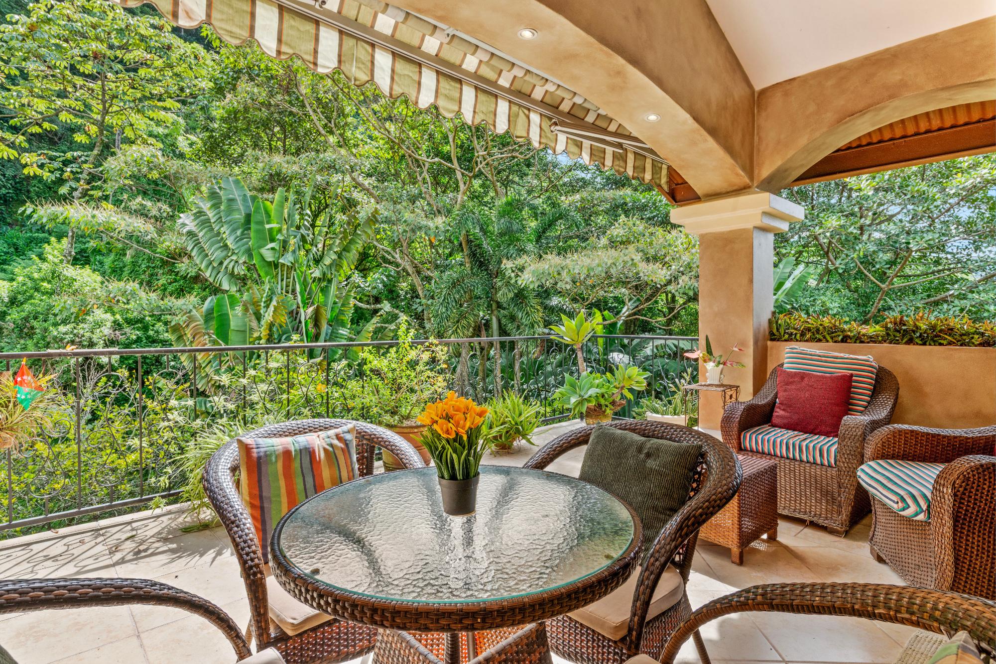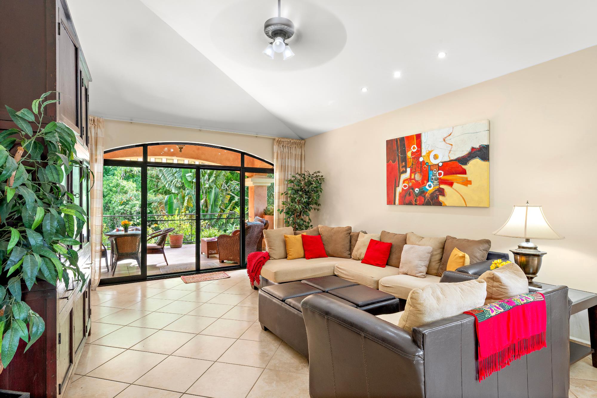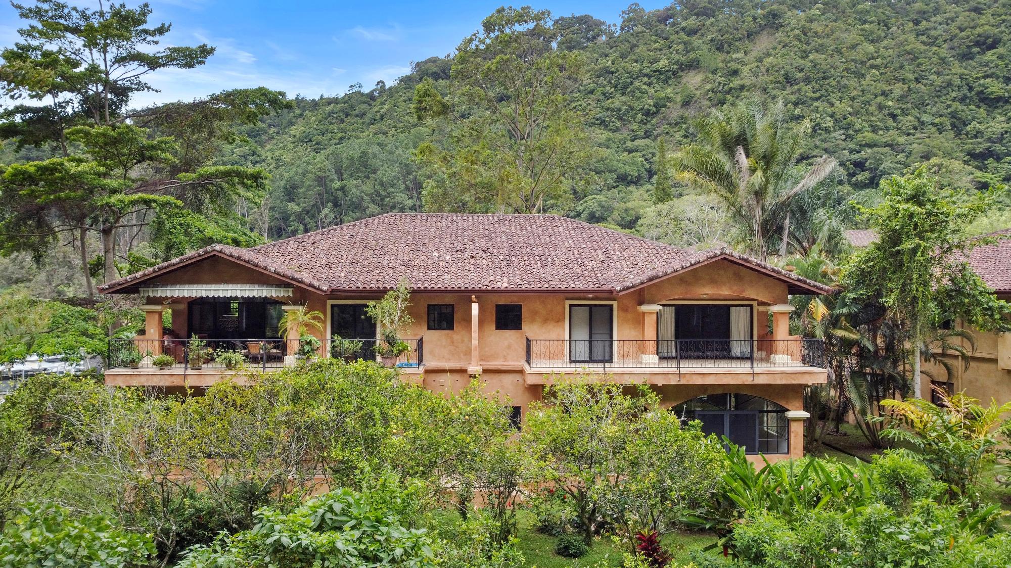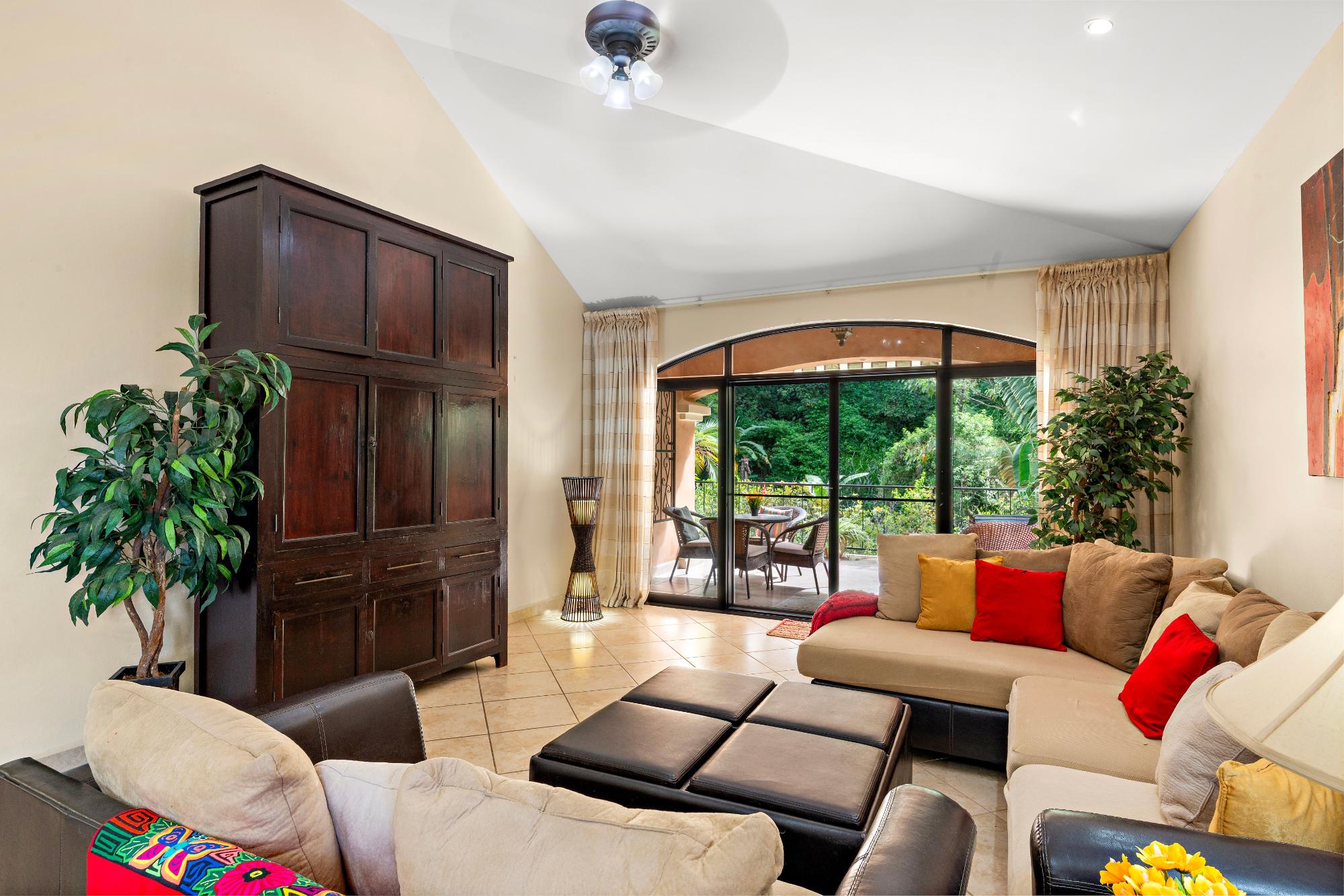 Welcome to a truly exceptional property—the only 3-bedroom condo currently available in the exclusive, gated community of Valle Escondido, located just a short walk from downtown Boquete. This upper-level corner unit offers a rare combination of privacy, space, natural beauty, and convenience that’s hard to find in Boquete’s competitive real estate market. From the moment you enter, you’re greeted by high, beamed ceilings and abundant natural light streaming through oversized windows. The open-concept design creates a warm and welcoming atmosphere, flowing effortlessly from the living area to the dining space and a large, well-appointed kitchen. With generous counter space, ample cabinetry, and a breakfast bar perfect for casual dining or entertaining, this kitchen is both functional and inviting. Just off the living room is a covered and private terrace, where you can relax to the calming sound of the nearby stream and enjoy views of the lush gardens. A retractable awning makes this outdoor space ideal for use year-round, whether you’re enjoying morning coffee, reading a book in the shade, or entertaining friends on a warm afternoon. The primary bedroom suite offers a spacious and peaceful retreat, featuring a private ensuite bathroom with a double vanity and custom wood cabinetry, as well as a large walk-in closet. Two additional bedrooms provide flexible space for guests, a home office, or a hobby room. The home also includes a generously sized laundry room, complete with a washer, dryer, and full-sized second refrigerator—perfect for overflow storage and entertaining.