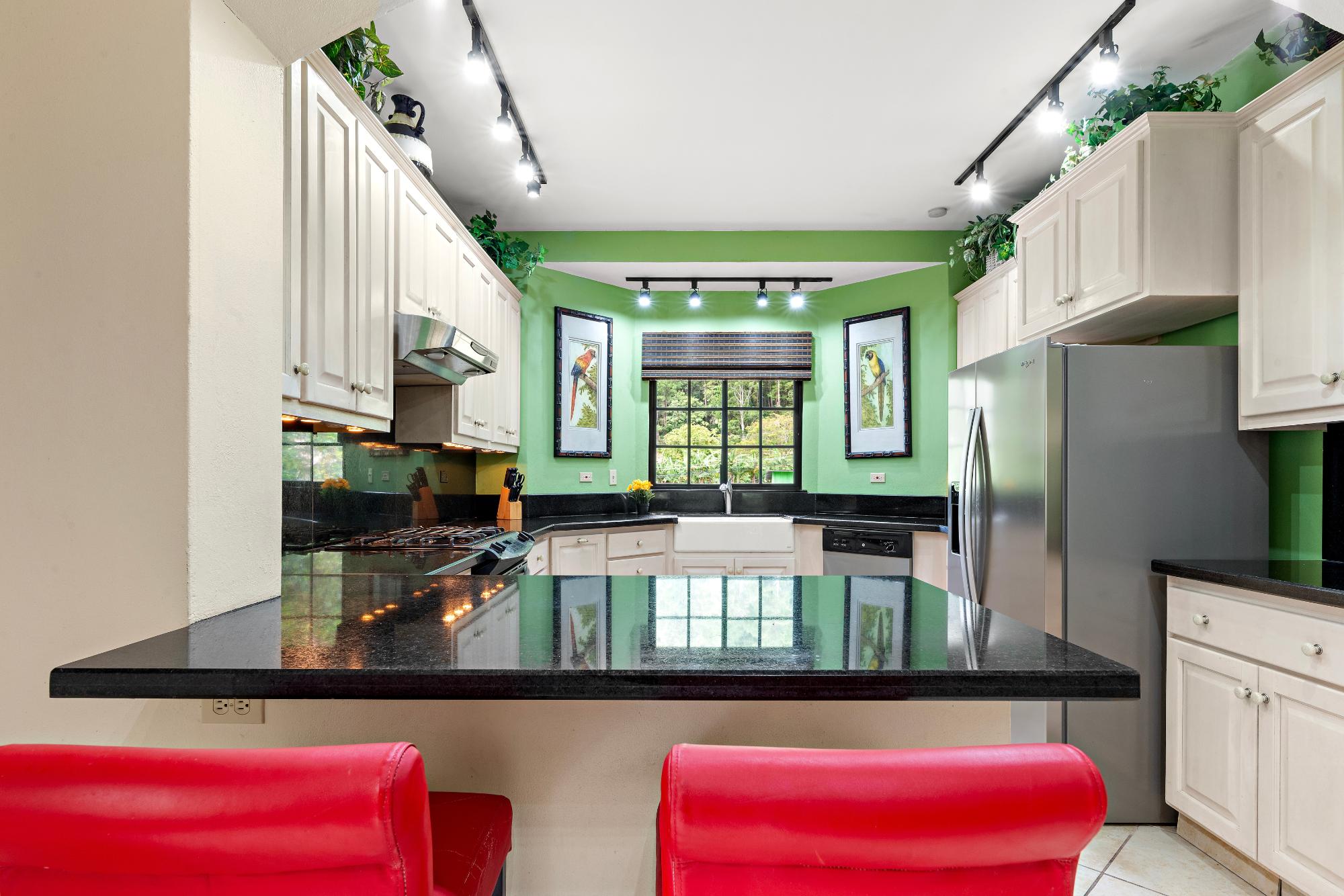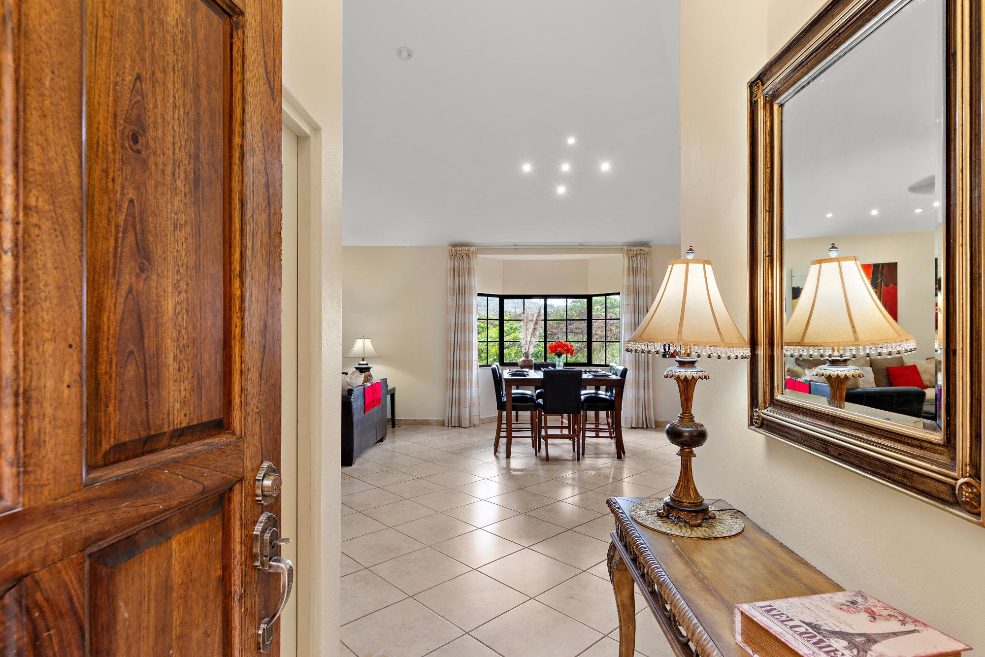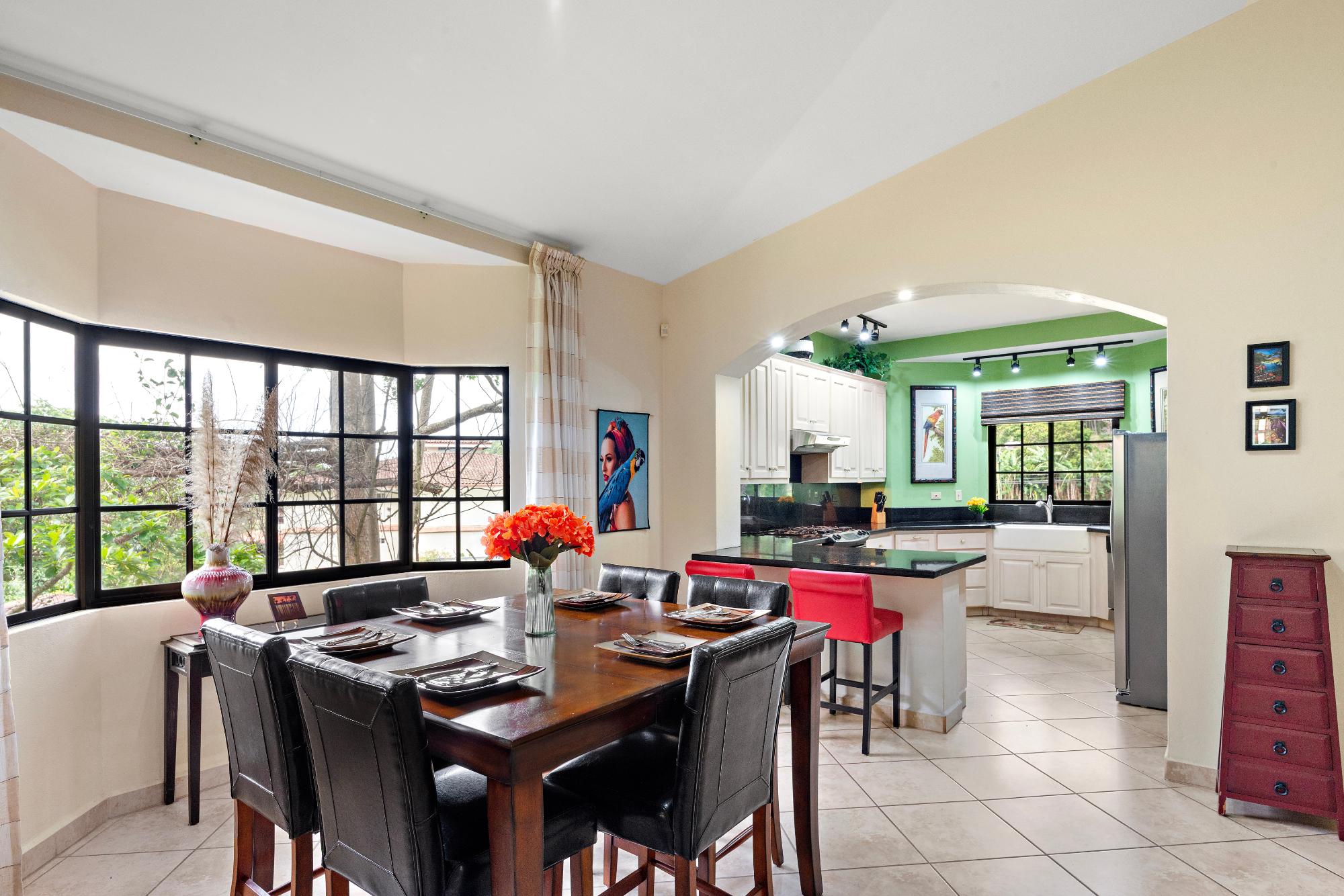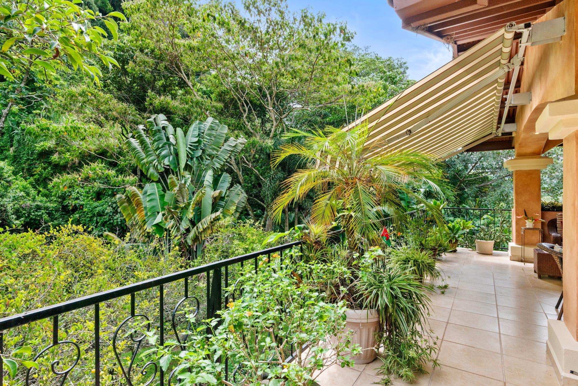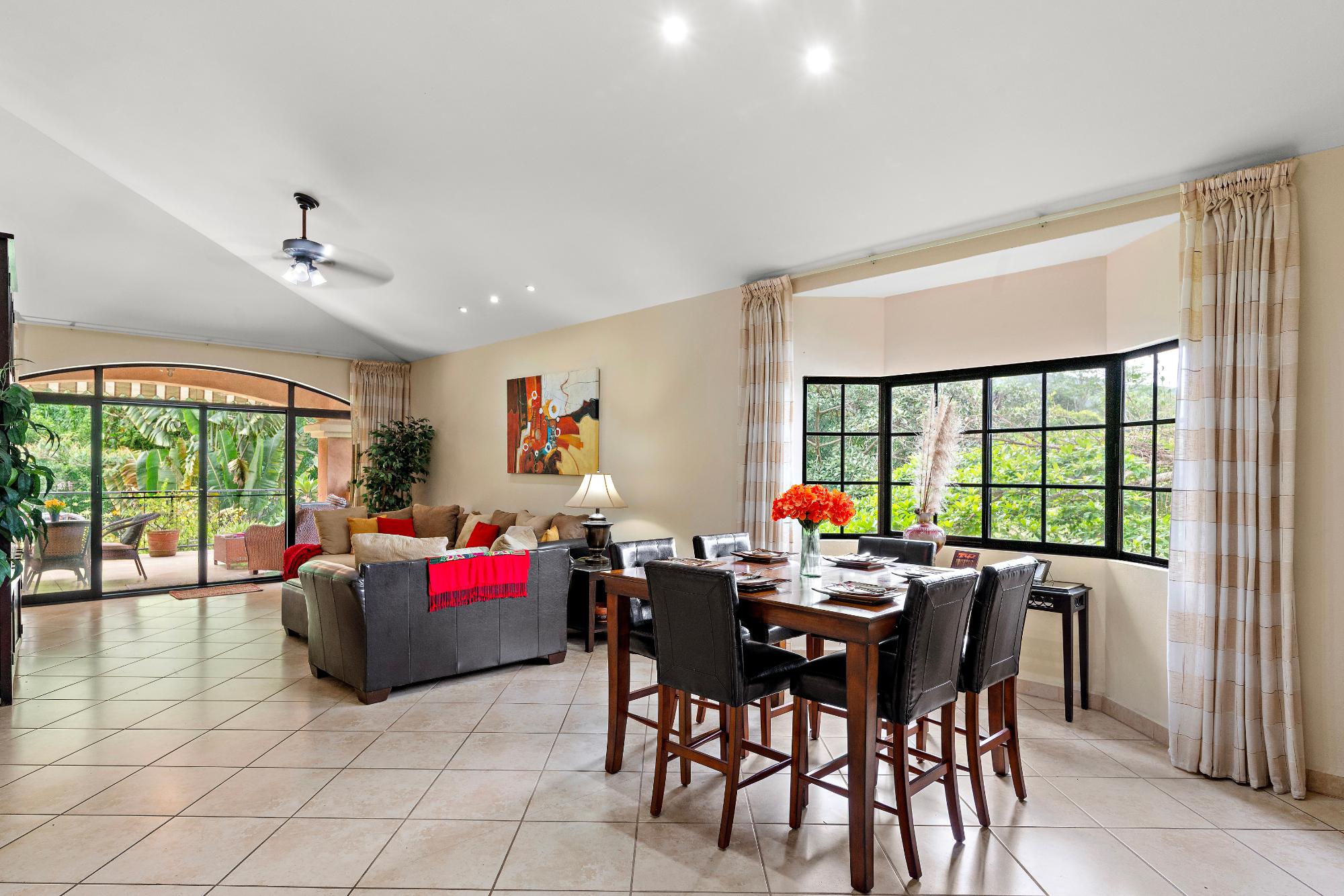 Welcome to a truly exceptional property—the only 3-bedroom condo currently available in the exclusive, gated community of Valle Escondido, located just a short walk from downtown Boquete. This upper-level corner unit offers a rare combination of privacy, space, natural beauty, and convenience that’s hard to find in Boquete’s competitive real estate market. From the moment you enter, you’re greeted by high, beamed ceilings and abundant natural light streaming through oversized windows. The open-concept design creates a warm and welcoming atmosphere, flowing effortlessly from the living area to the dining space and a large, well-appointed kitchen. With generous counter space, ample cabinetry, and a breakfast bar perfect for casual dining or entertaining, this kitchen is both functional and inviting. Just off the living room is a covered and private terrace, where you can relax to the calming sound of the nearby stream and enjoy views of the lush gardens. A retractable awning makes this outdoor space ideal for use year-round, whether you’re enjoying morning coffee, reading a book in the shade, or entertaining friends on a warm afternoon. The primary bedroom suite offers a spacious and peaceful retreat, featuring a private ensuite bathroom with a double vanity and custom wood cabinetry, as well as a large walk-in closet. Two additional bedrooms provide flexible space for guests, a home office, or a hobby room. The home also includes a generously sized laundry room, complete with a washer, dryer, and full-sized second refrigerator—perfect for overflow storage and entertaining.