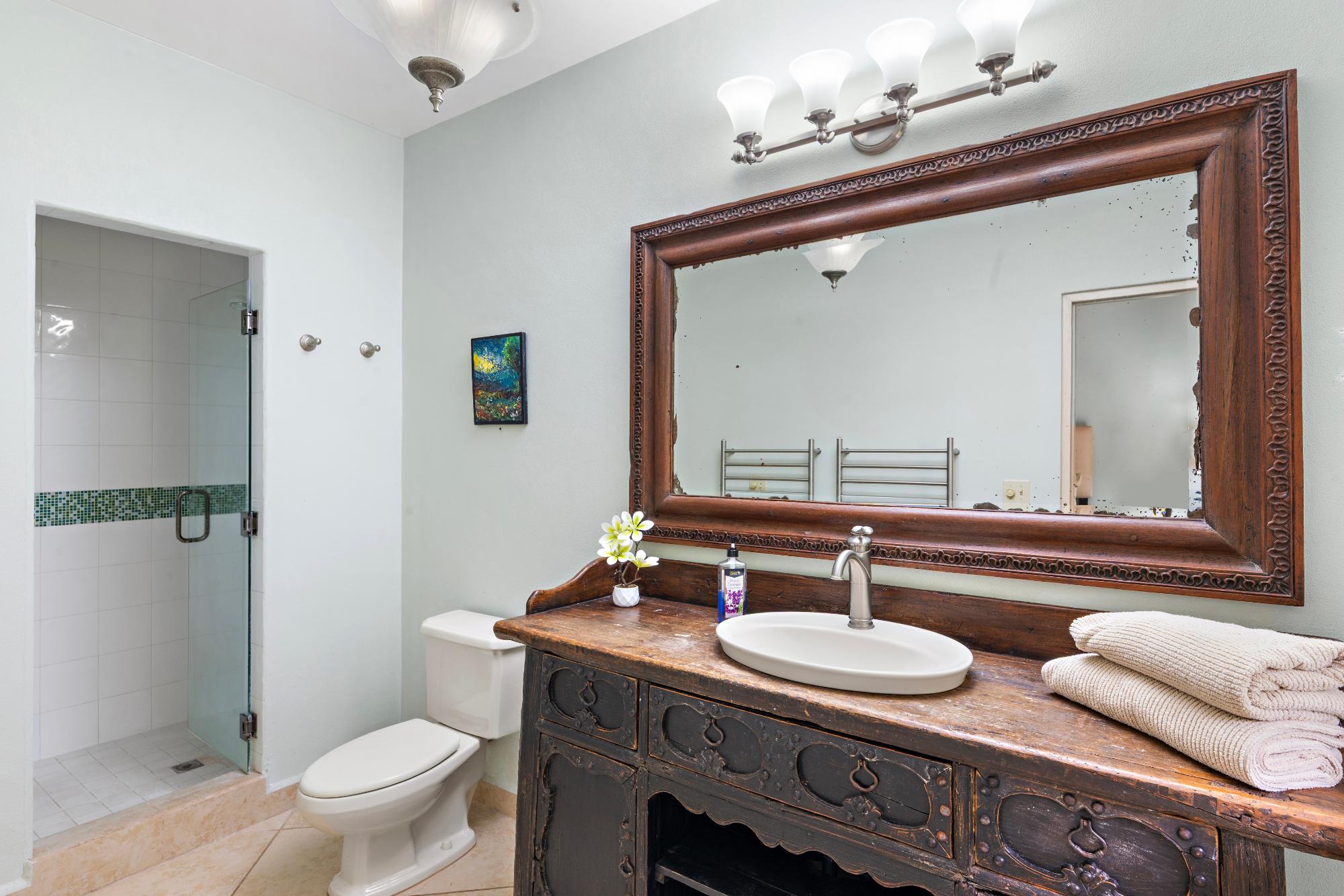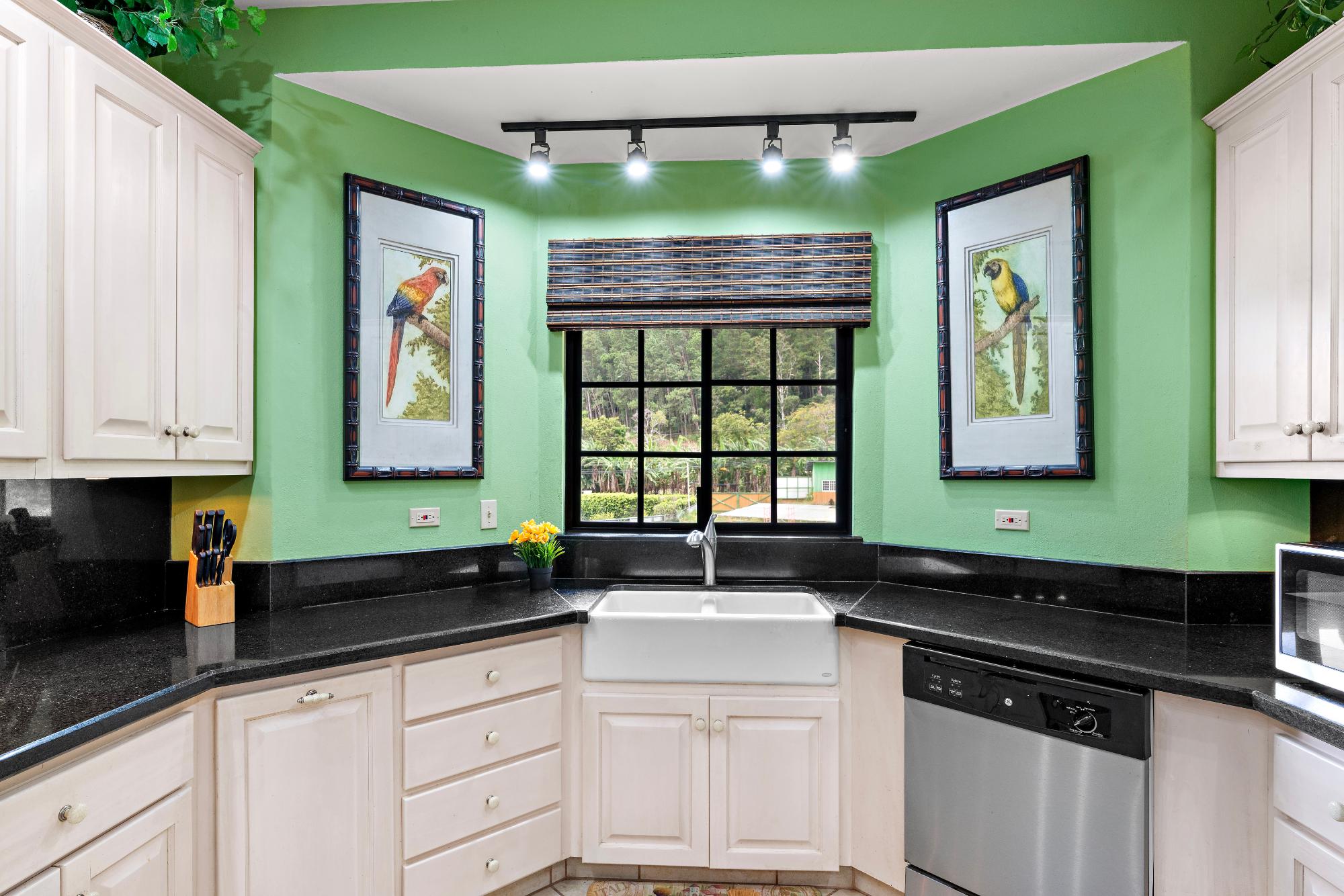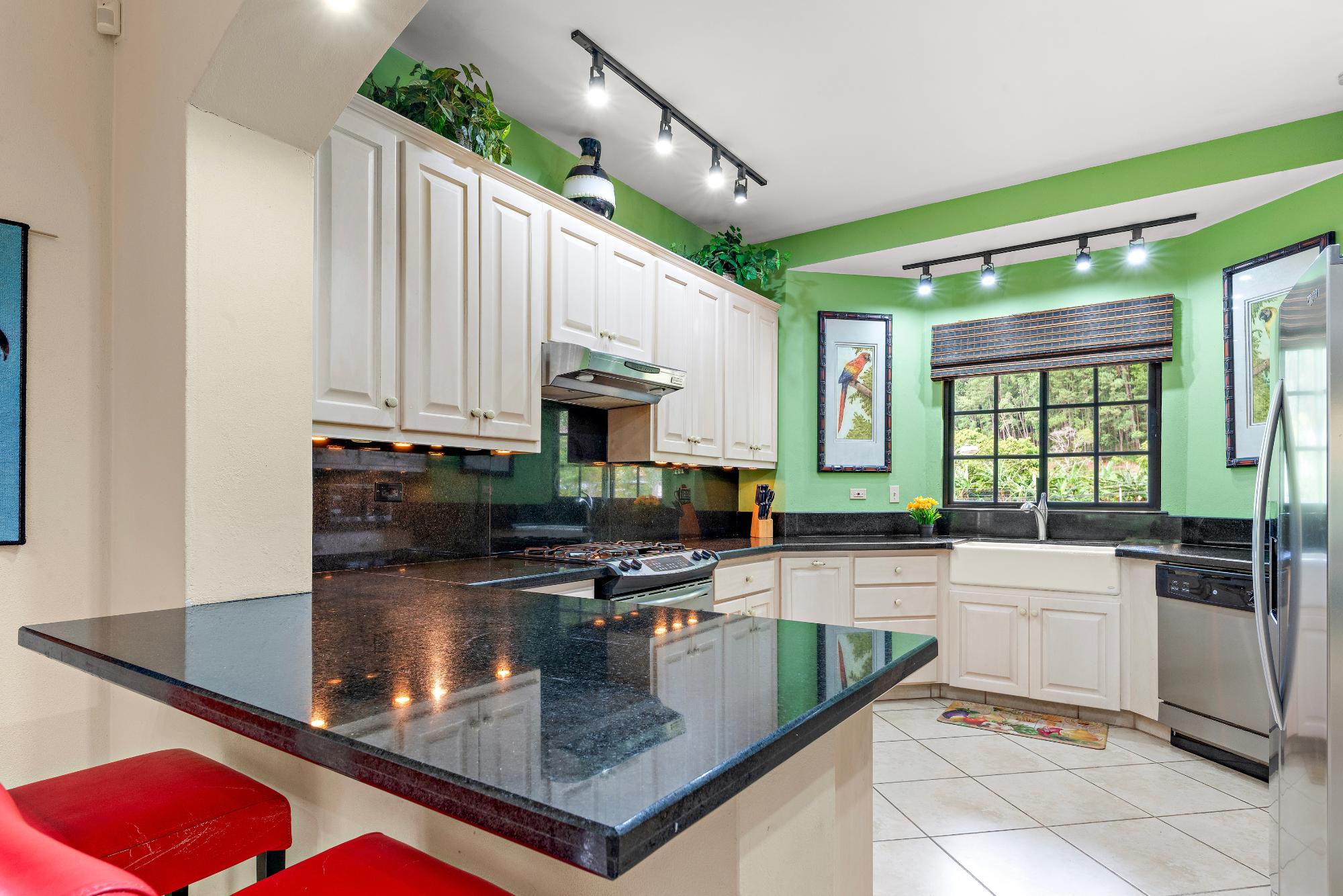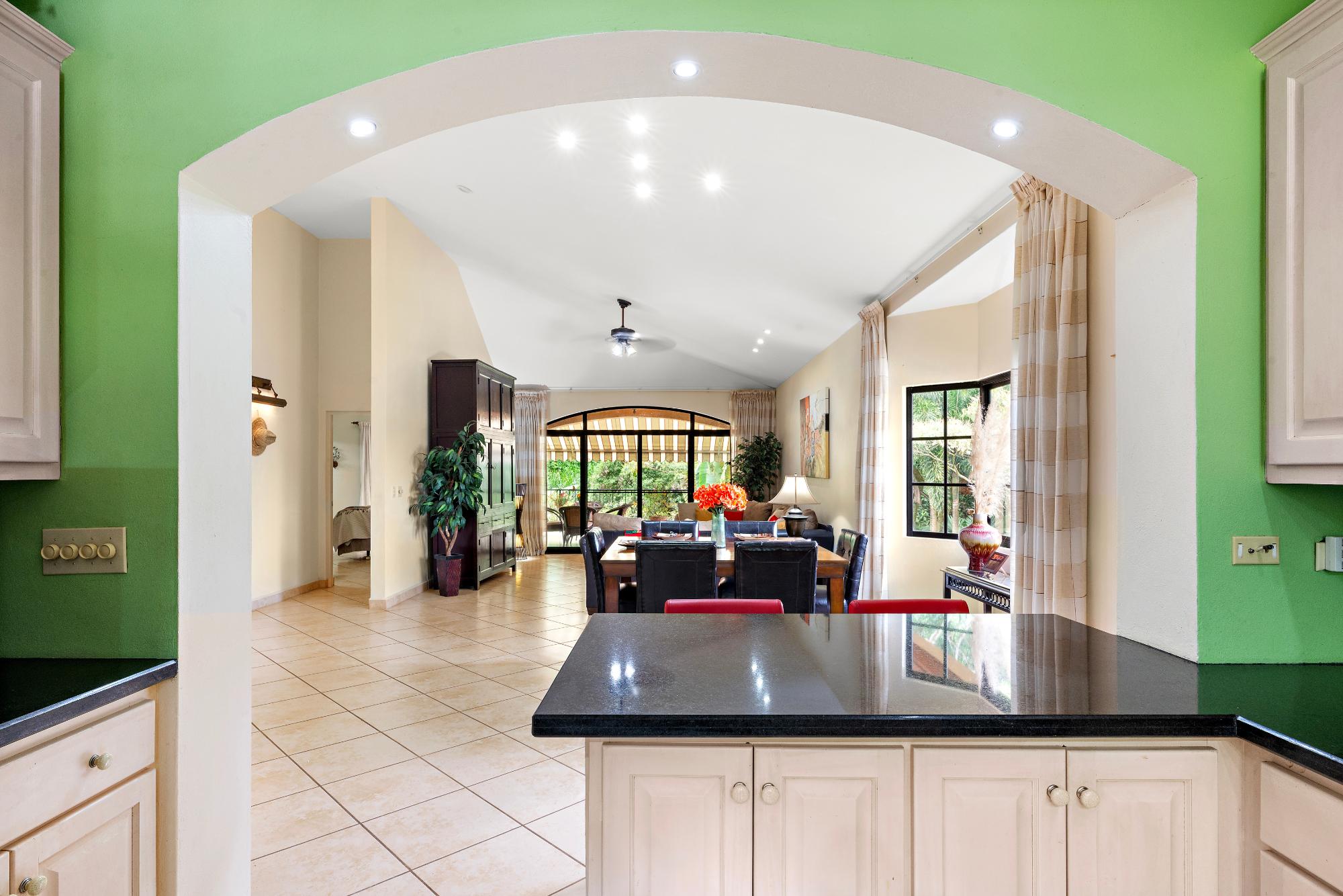 Welcome to a truly exceptional property—the only 3-bedroom condo currently available in the exclusive, gated community of Valle Escondido, located just a short walk from downtown Boquete. This upper-level corner unit offers a rare combination of privacy, space, natural beauty, and convenience that’s hard to find in Boquete’s competitive real estate market. From the moment you enter, you’re greeted by high, beamed ceilings and abundant natural light streaming through oversized windows. The open-concept design creates a warm and welcoming atmosphere, flowing effortlessly from the living area to the dining space and a large, well-appointed kitchen. With generous counter space, ample cabinetry, and a breakfast bar perfect for casual dining or entertaining, this kitchen is both functional and inviting. Just off the living room is a covered and private terrace, where you can relax to the calming sound of the nearby stream and enjoy views of the lush gardens. A retractable awning makes this outdoor space ideal for use year-round, whether you’re enjoying morning coffee, reading a book in the shade, or entertaining friends on a warm afternoon. The primary bedroom suite offers a spacious and peaceful retreat, featuring a private ensuite bathroom with a double vanity and custom wood cabinetry, as well as a large walk-in closet. Two additional bedrooms provide flexible space for guests, a home office, or a hobby room. The home also includes a generously sized laundry room, complete with a washer, dryer, and full-sized second refrigerator—perfect for overflow storage and entertaining.