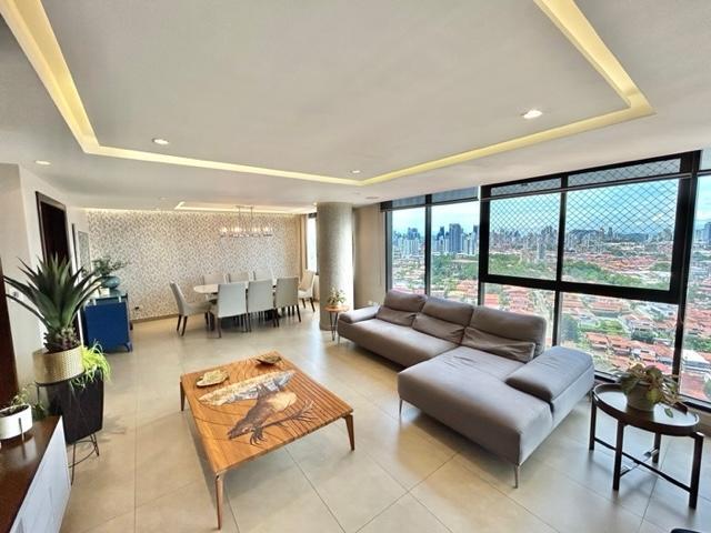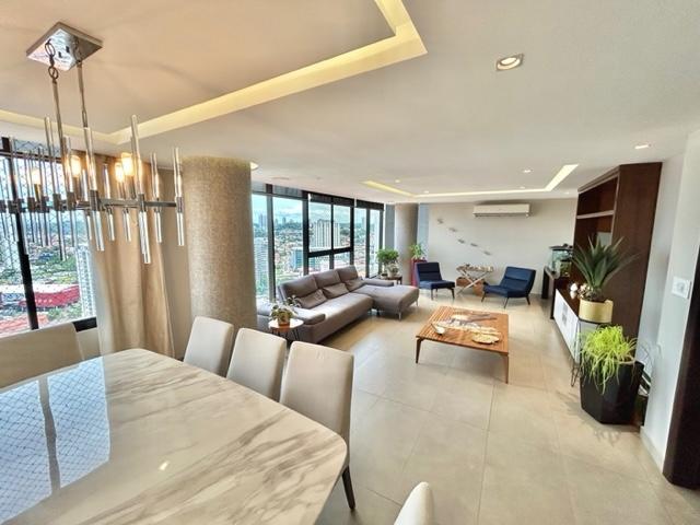 Enjoy living in one of the best buildings facing the city in Sky View! It has 183.5 m2 with 3 bedrooms (main with walking closet), 2.5 bathrooms, study, service room and bathroom, 3 parking spaces, remodeled with fine and modern finishes. Includes partial appliances such as stove and air. Social area has a covered pool, bbq area, events area, game room, 24/7 security, 2 water tanks, partial power plant. Maintenance 4326.63 which includes gas, annual tax of $1,068. Building located on a cul-de-sac for privacy and ideal tranquility
